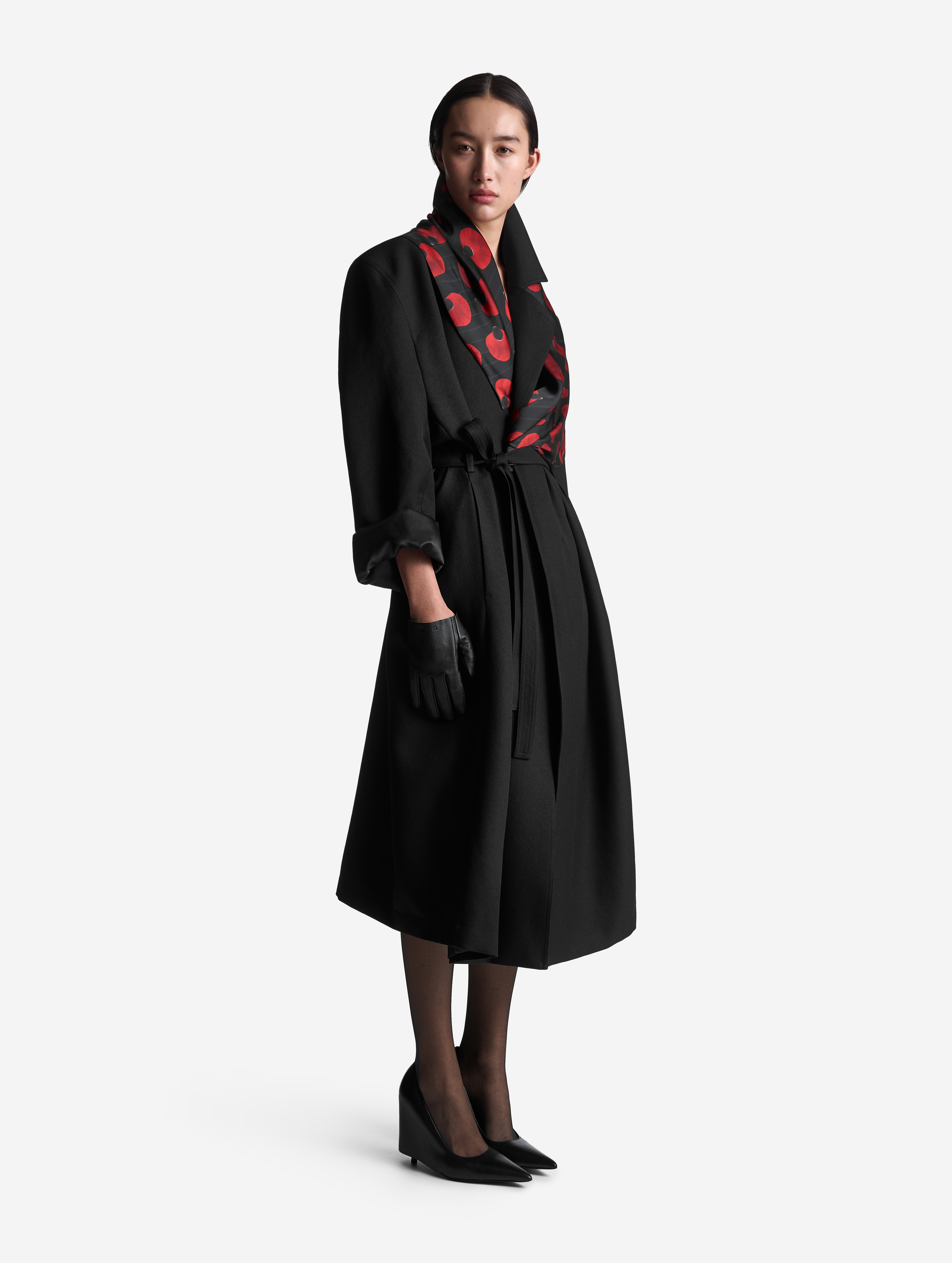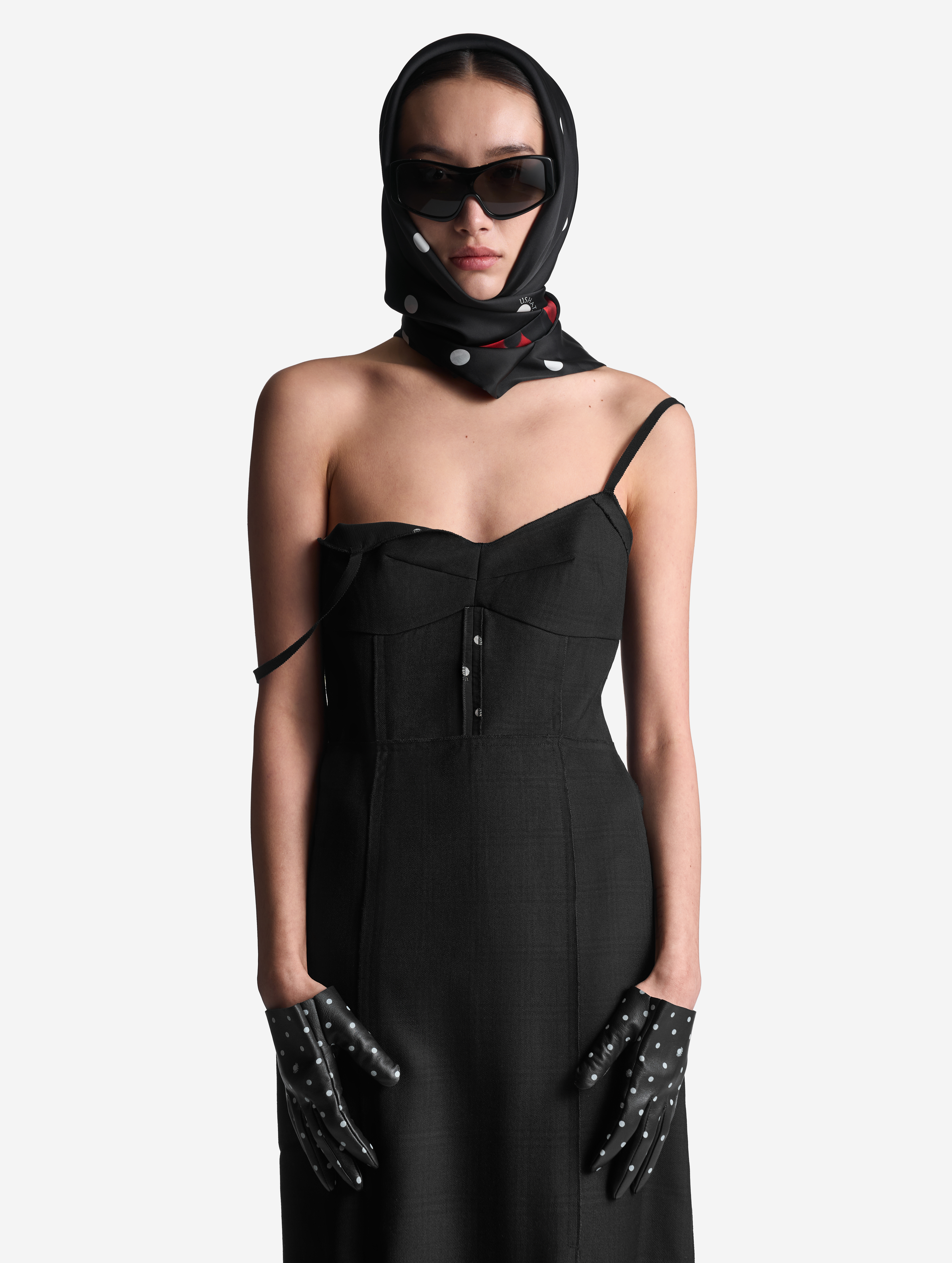 Этот двухсторонний платок выполнен из струящегося атласа. Его расцветка отражает главные цвета Garderobe SS26: черный, пыльно-розовый, коричневый и синий. Простая форма аксессуара подсказывает бесконечность его интерпретаций. Платок Ushatava тому доказательство. Его можно завязать как топ, юбку и платье-бандо. А еще — выйти за рамки гардероба и использовать в качестве пледа для пикника или элемента интерьера.