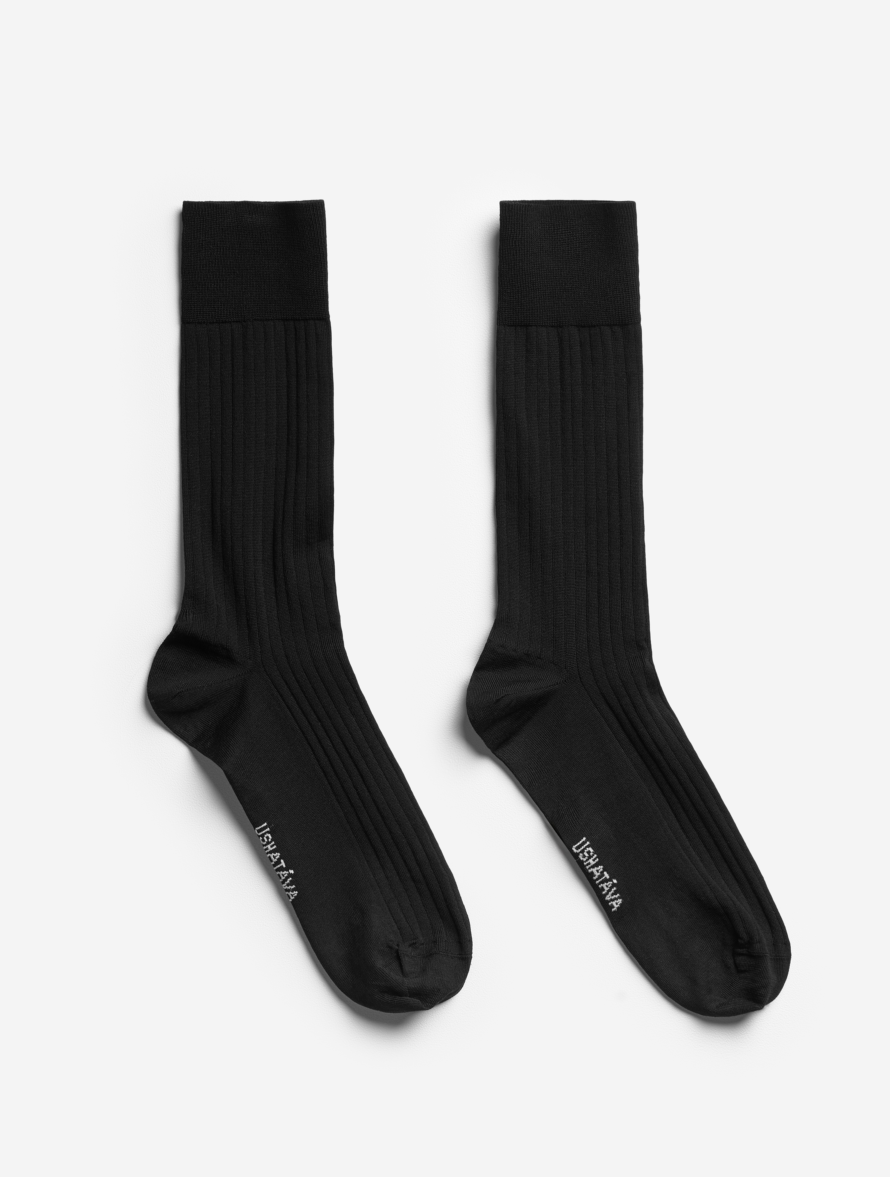 Классические тонкие носки. Произведены из итальянской пряжи, в составе которой 100% мерсеризованный хлопок. Однобортная резинка, обрамляющая голенище, эластична и не ощутима на ноге. Мысок и пятка выполнены более плотной вязкой, чтобы эти зоны не протирались со временем. В области стопы сделана небольшая контрастная вышивка Ushatava. В один комплект входят две пары носков одного цвета.