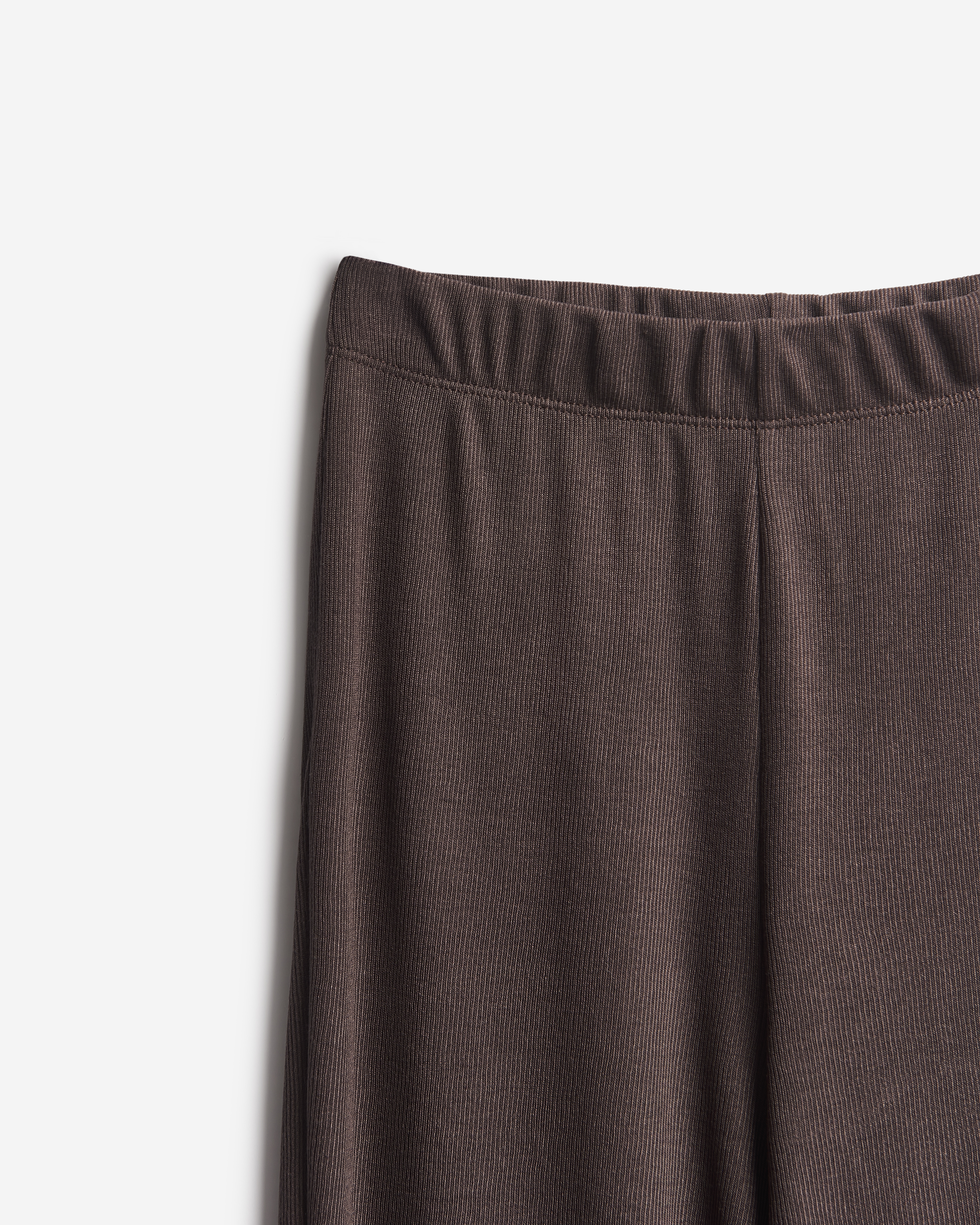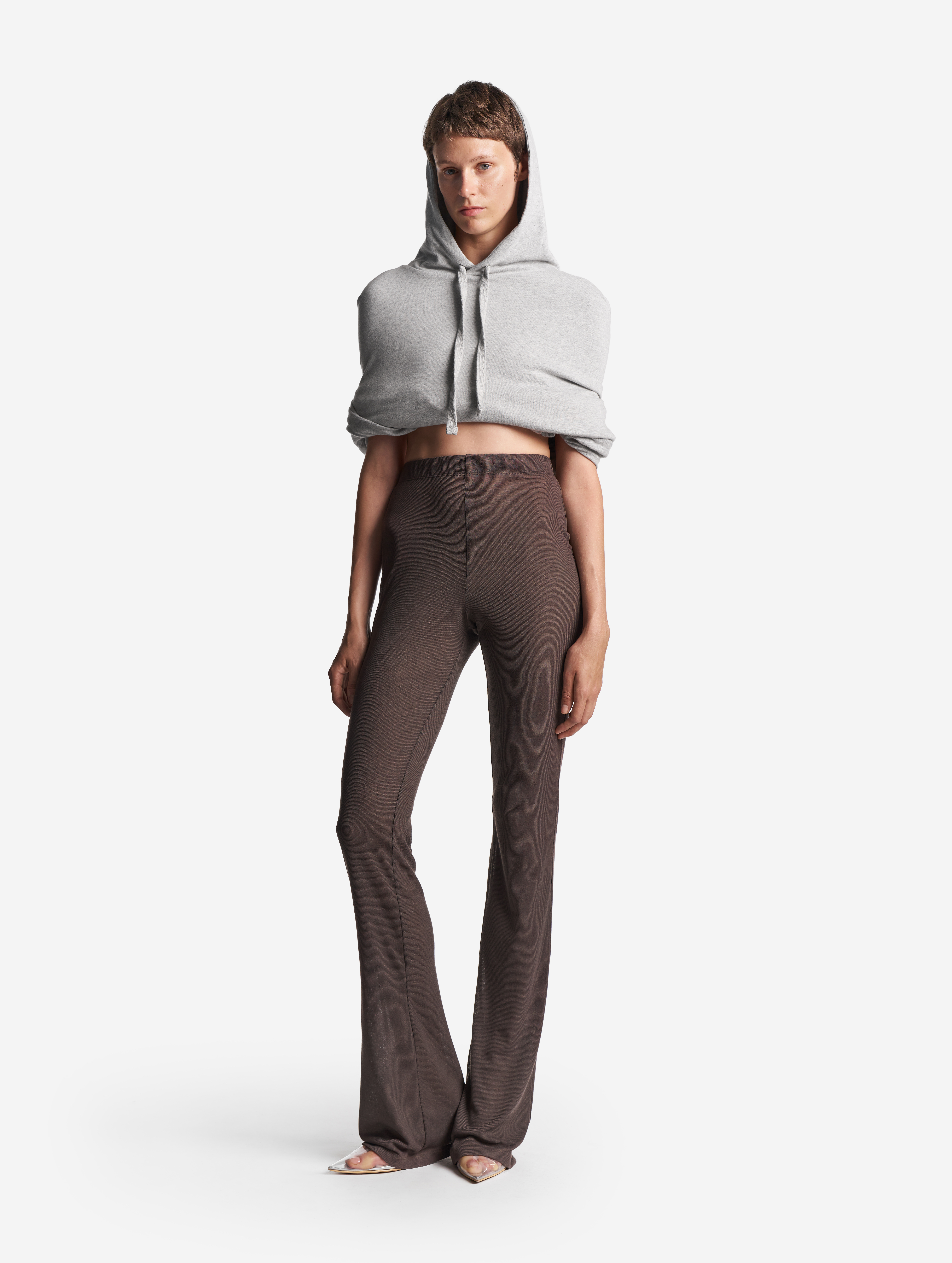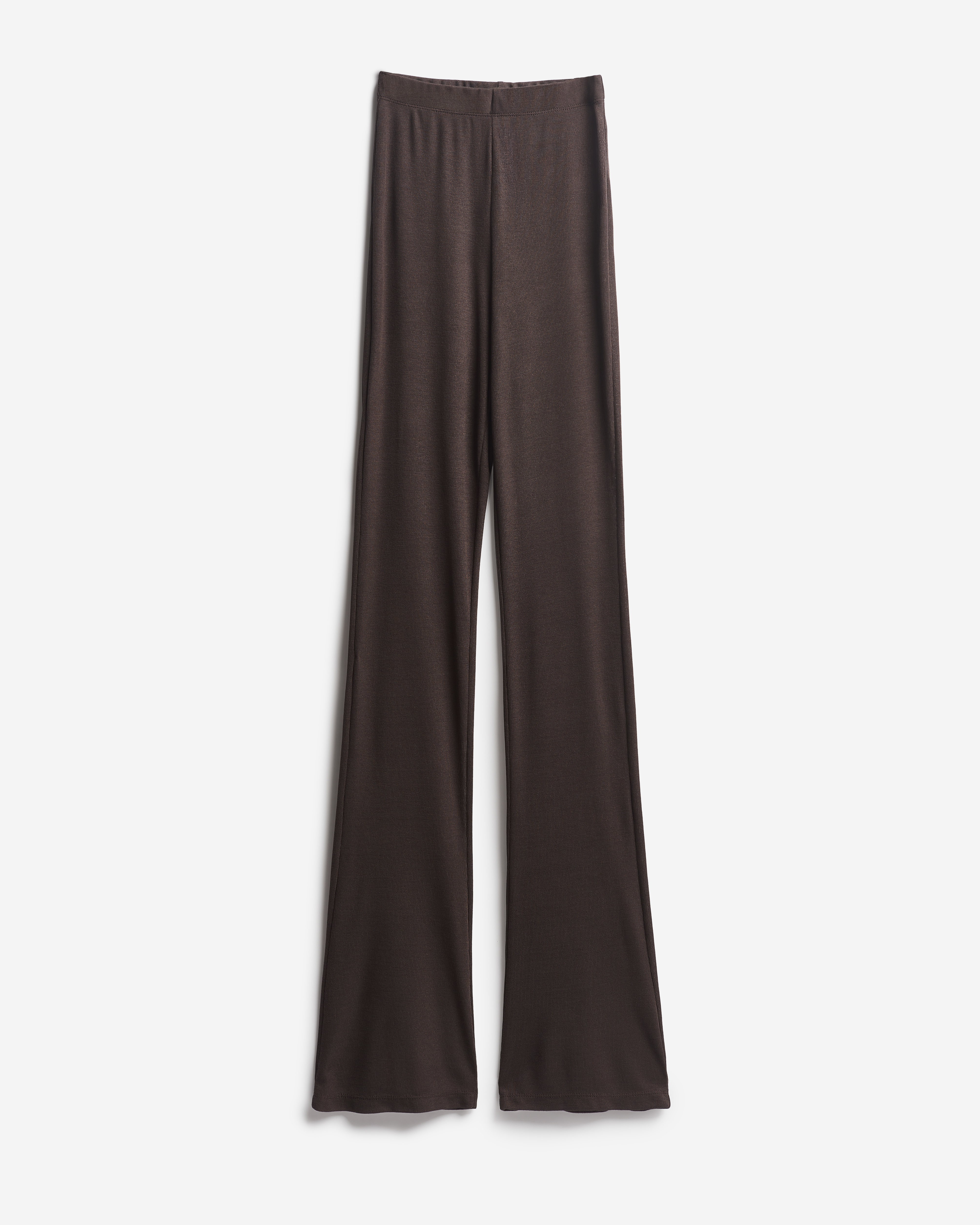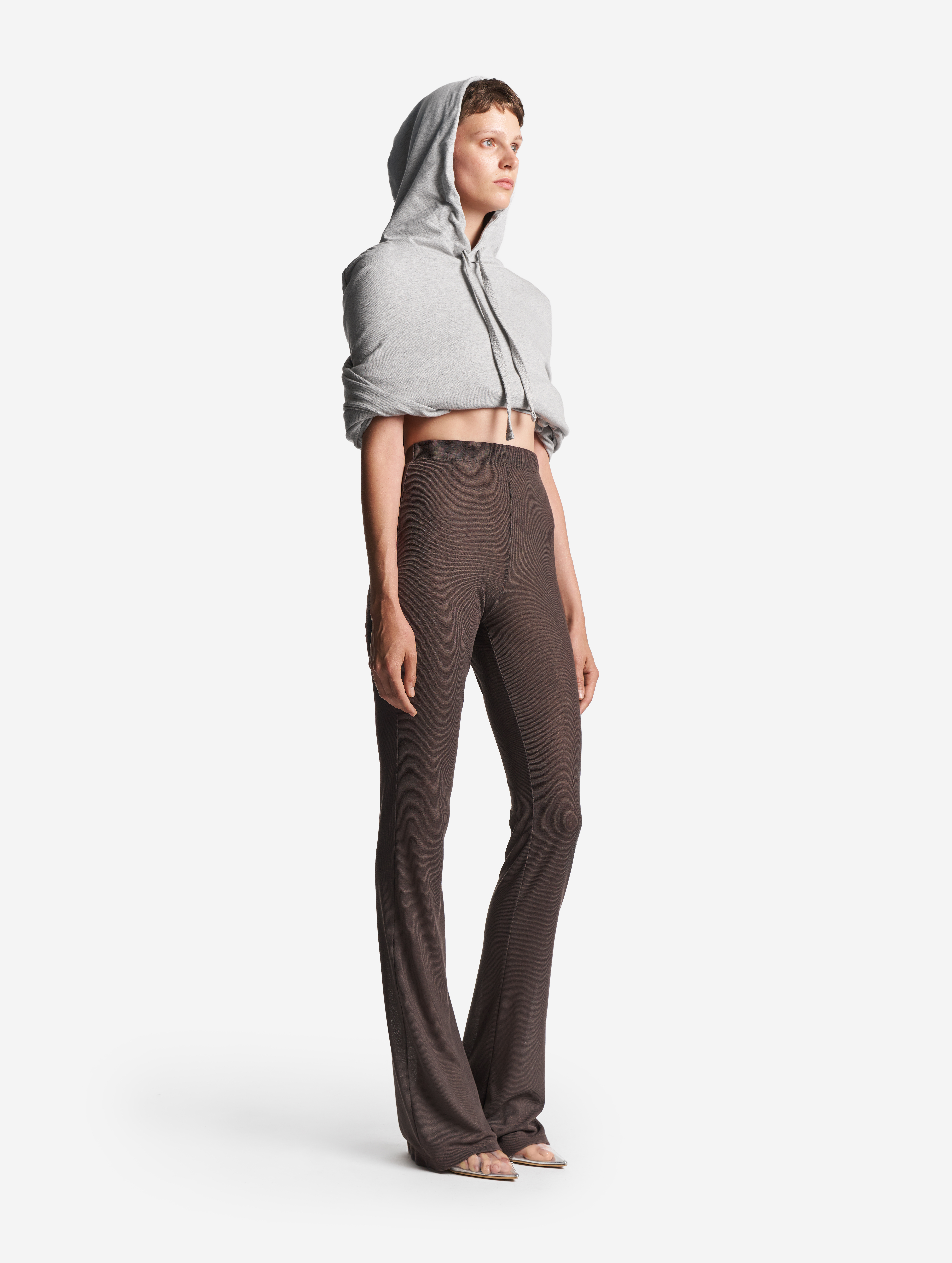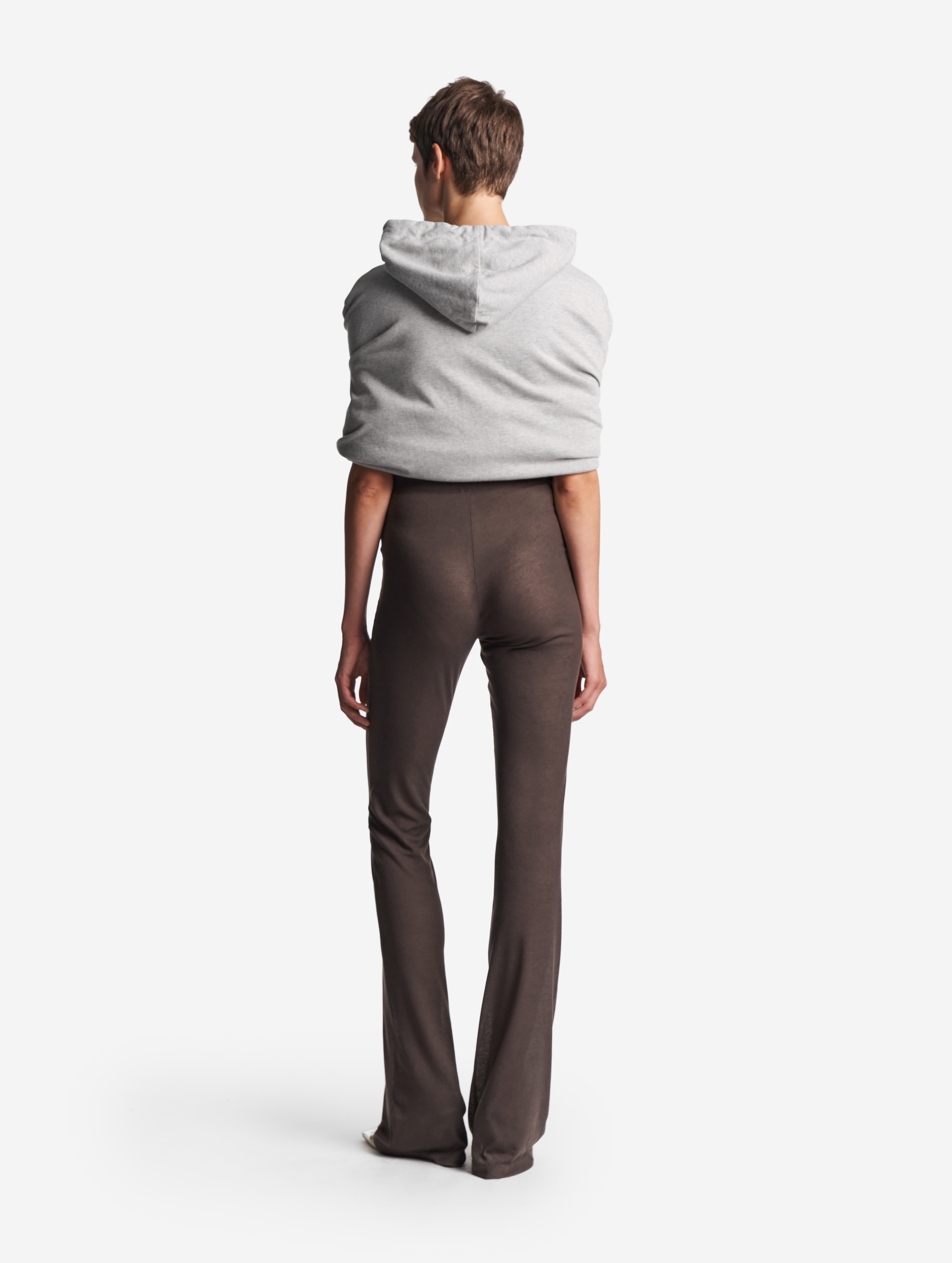 Для этой модели характерна высокая посадка и облегающий силуэт: леггинсы плотно обтягивают бедра и расходятся от колена книзу. У изделия пояс мягкой на резинке. Леггинсы выполнены из тонкого полупрозрачного трикотажа.