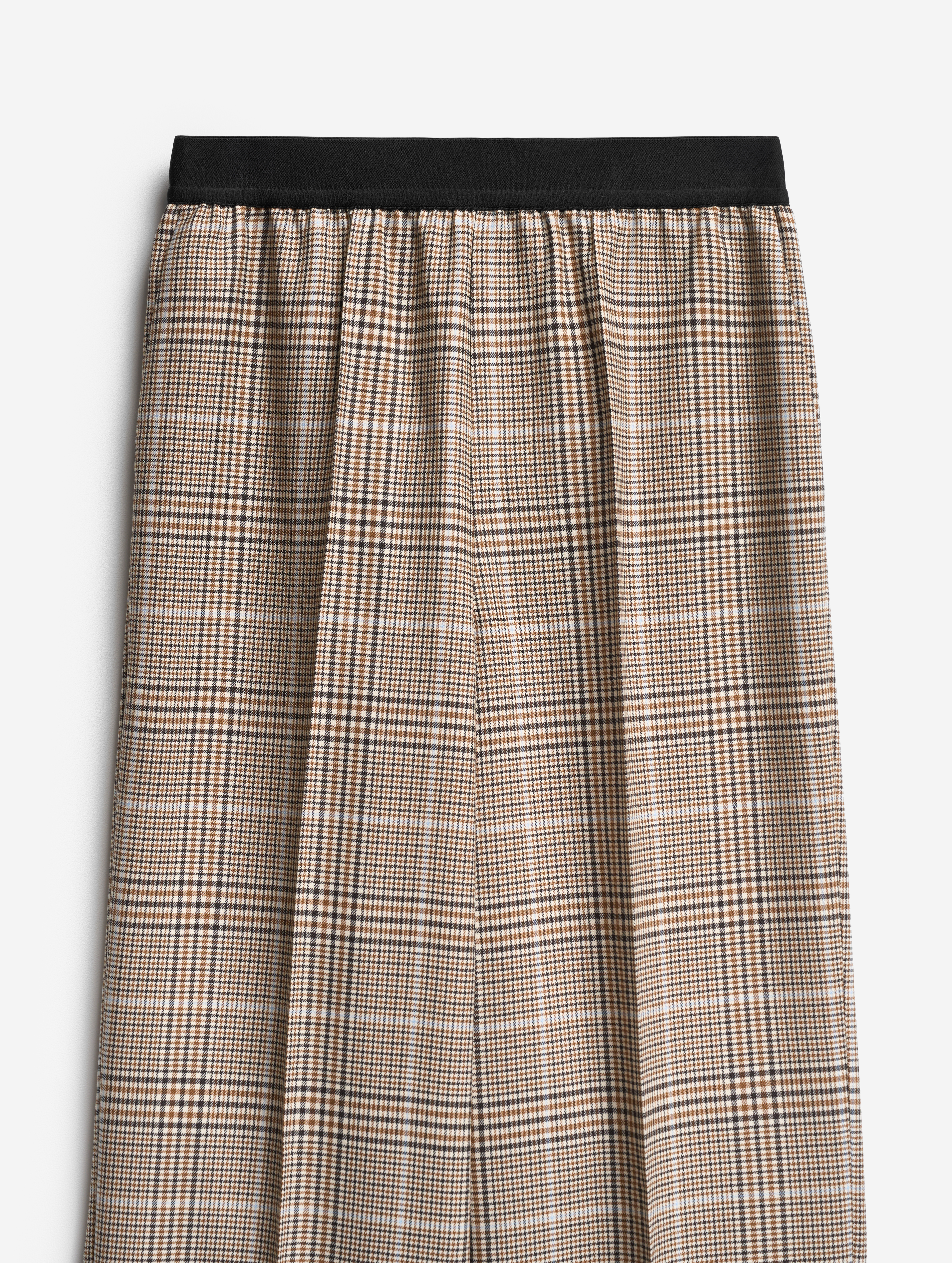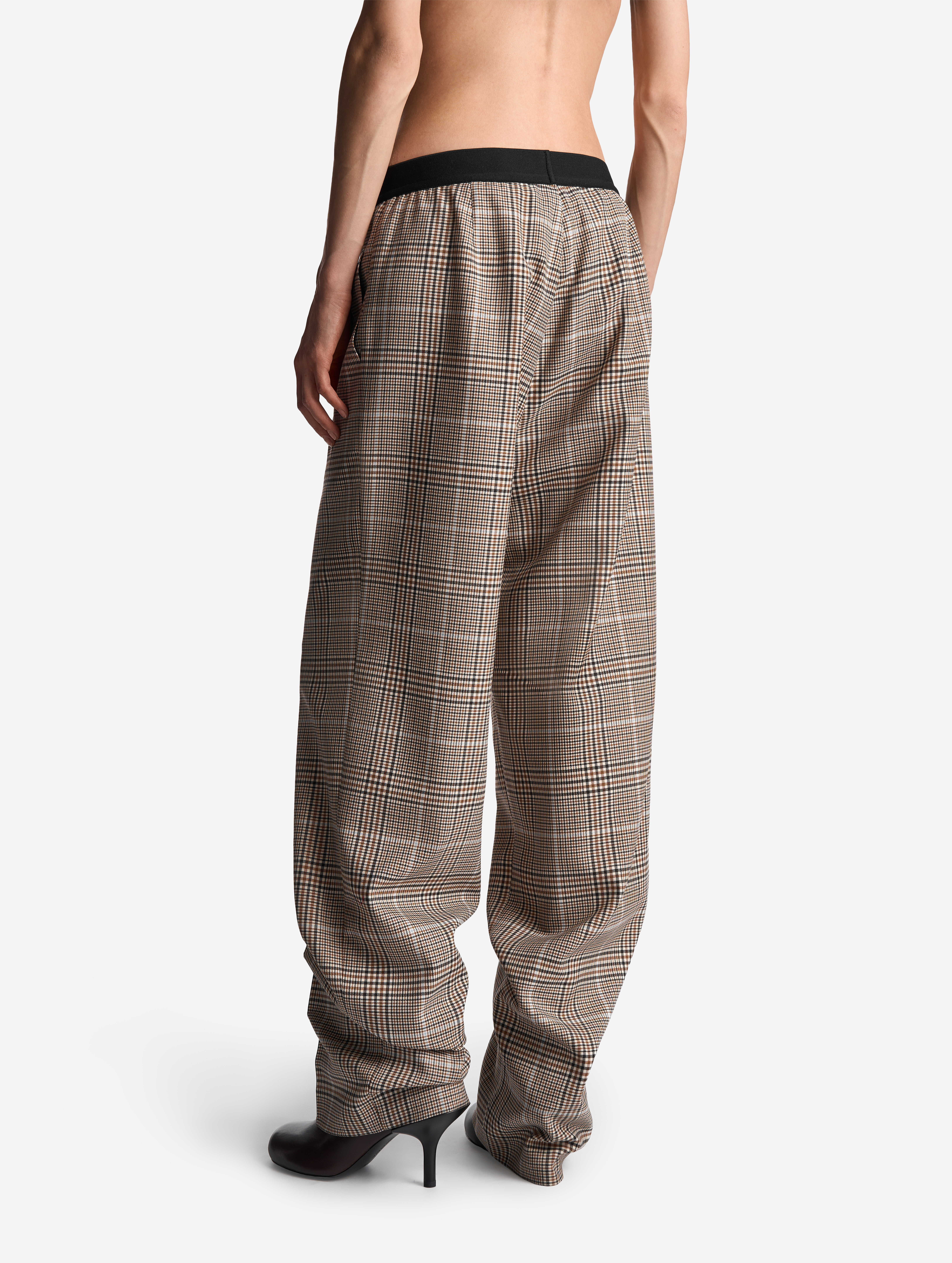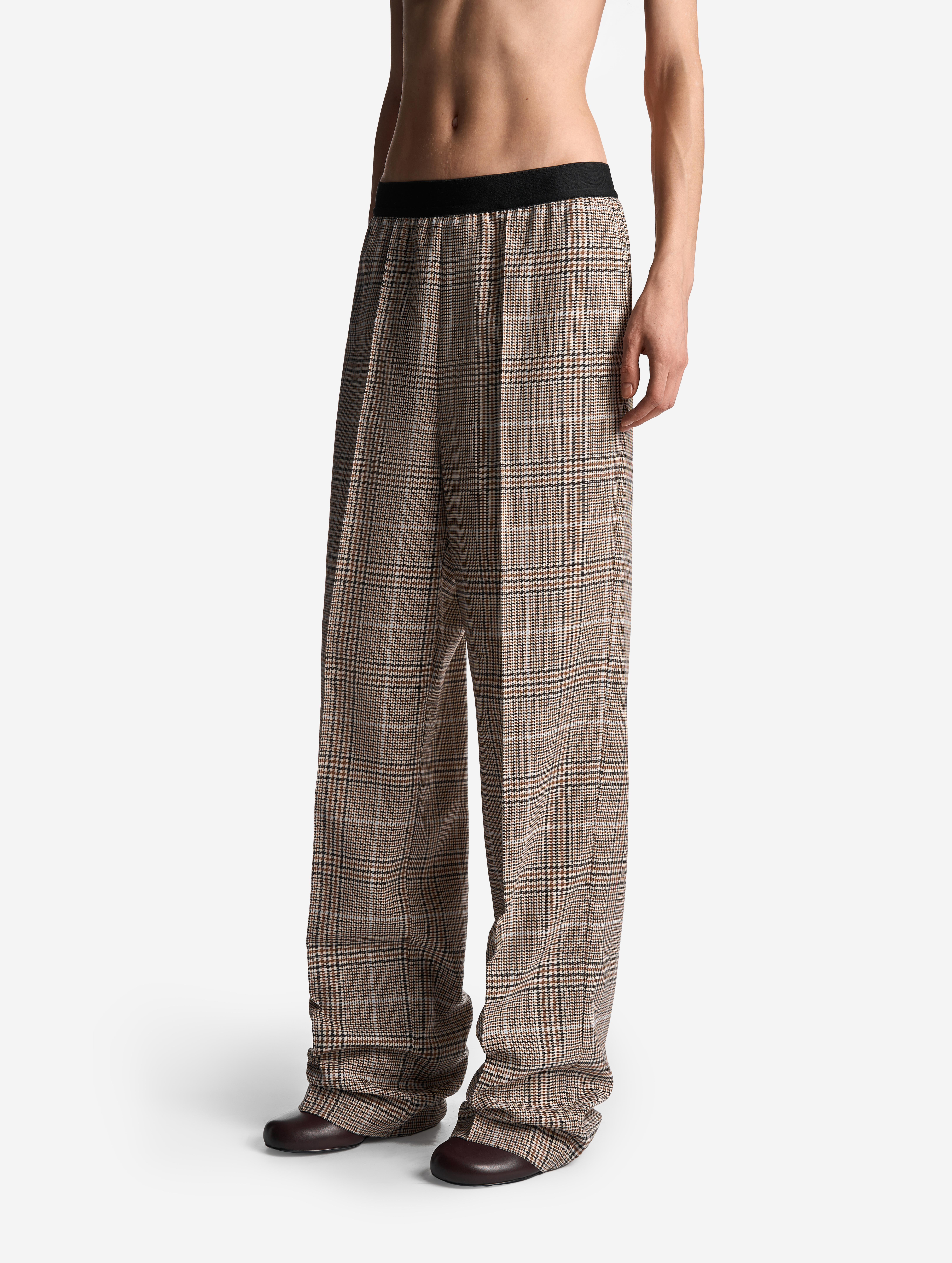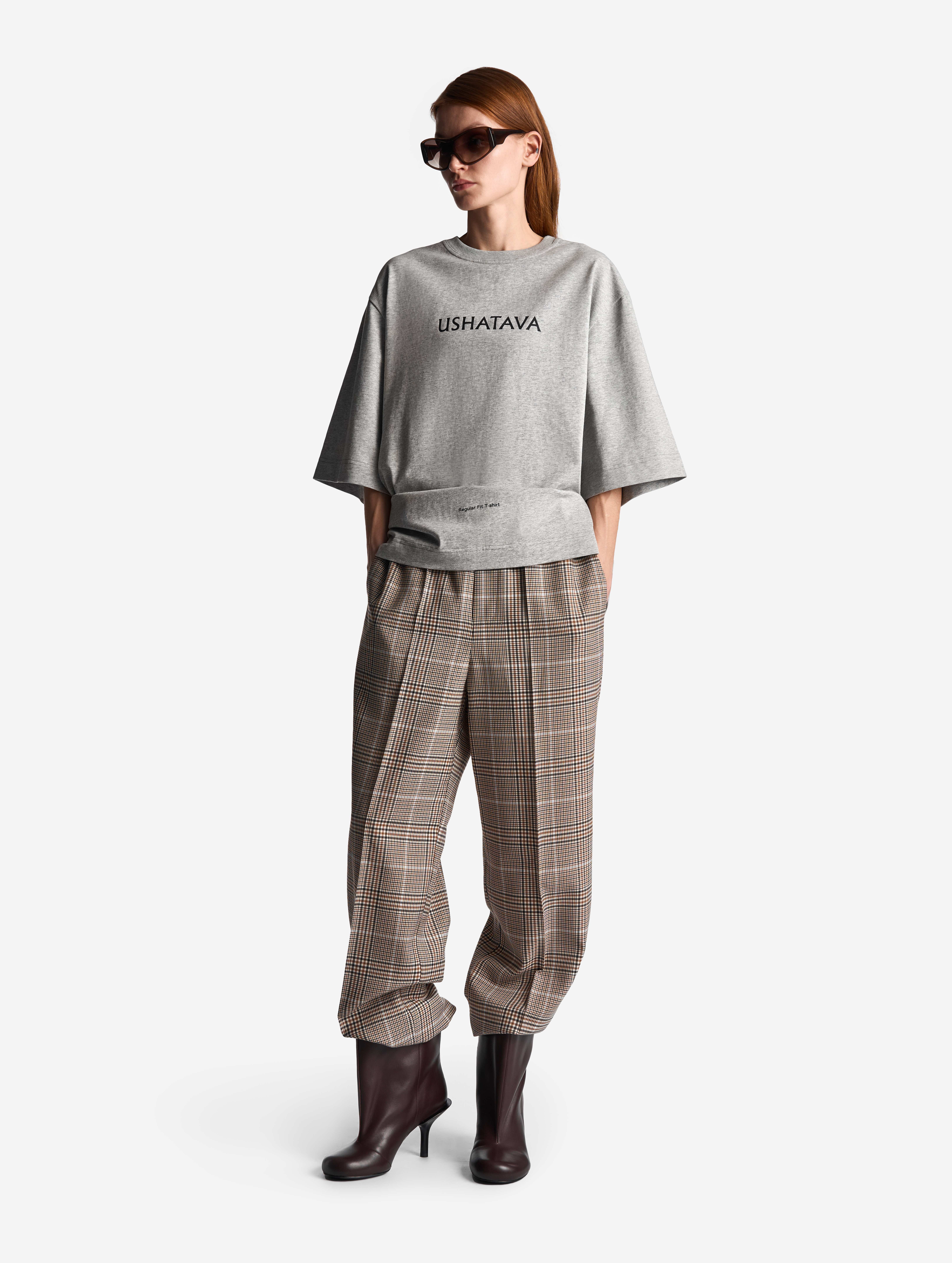 Эти брюки в точности повторяют модель, которая давно стала классикой Ushatava, — брюки на резинке. Они выполнены из гладкой костюмной ткани, в составе которой присутствует шерсть. Этот материал хорошо держит форму и не мнется. У изделия универсальная посадка, которая рассчитана и на женскую и на мужскую фигуру. Брюки слегка заужены книзу, спереди заутюжены стрелки. Верхний срез обработан широкой резинкой. Есть два боковых функциональных кармана.