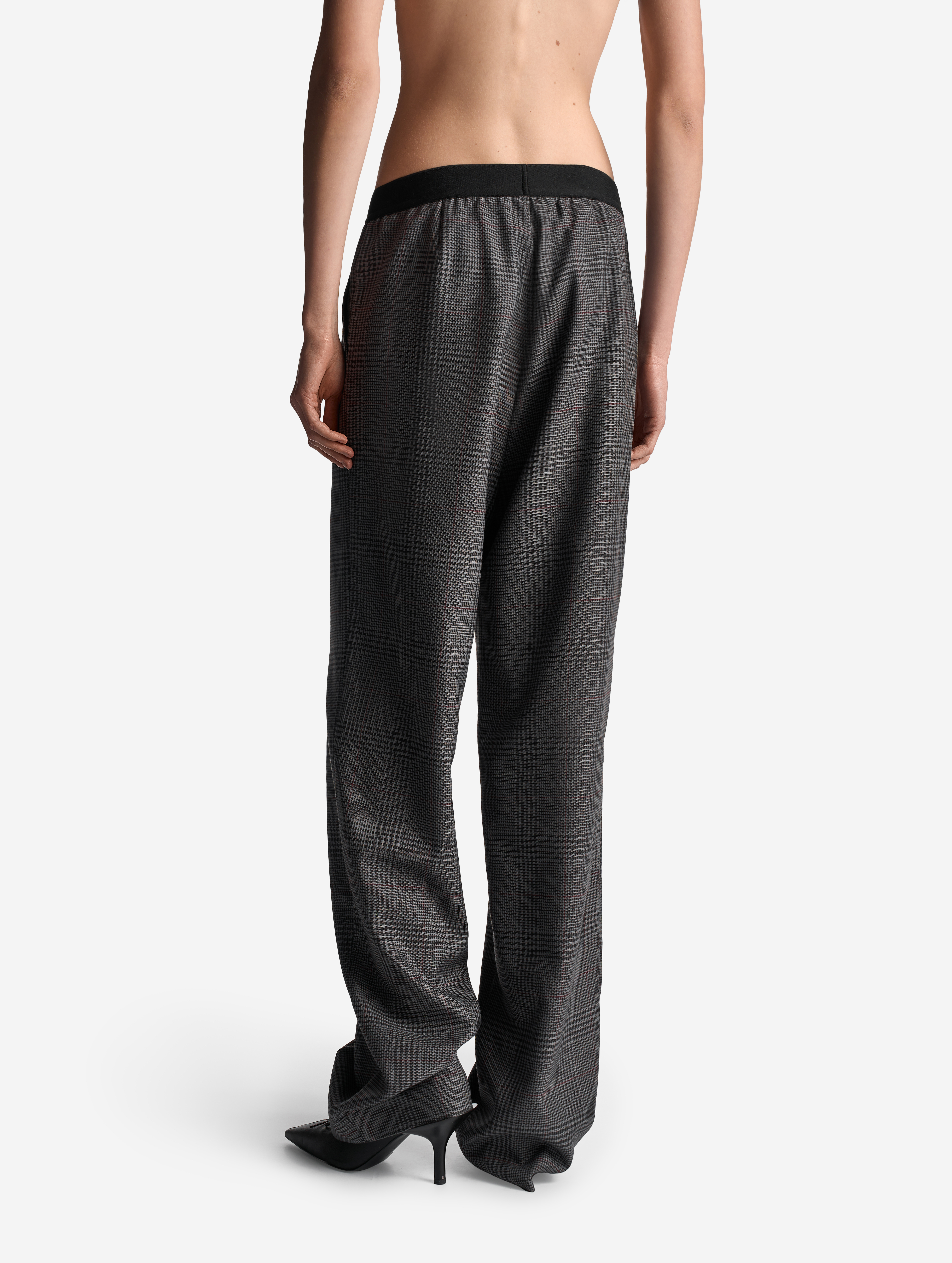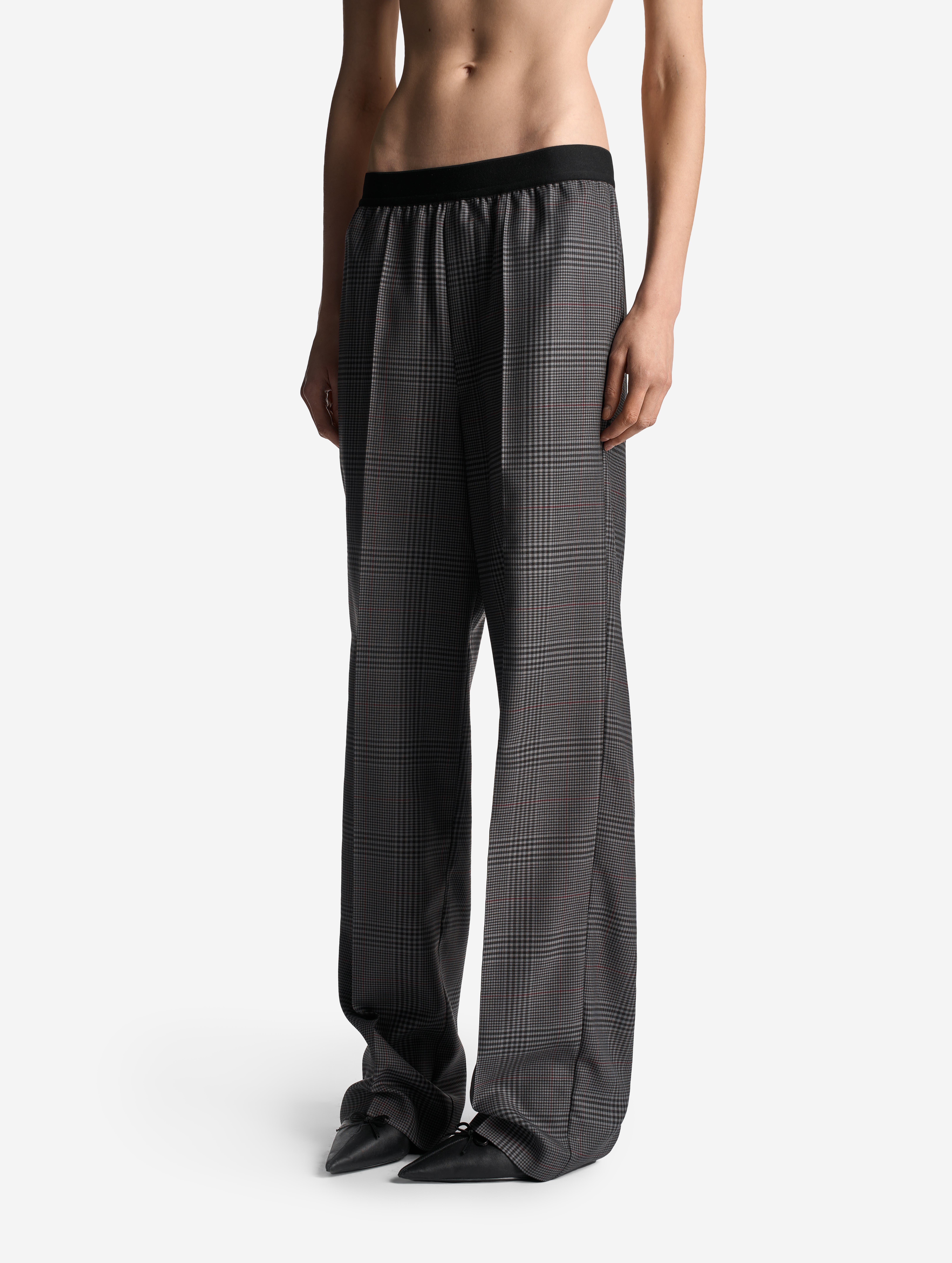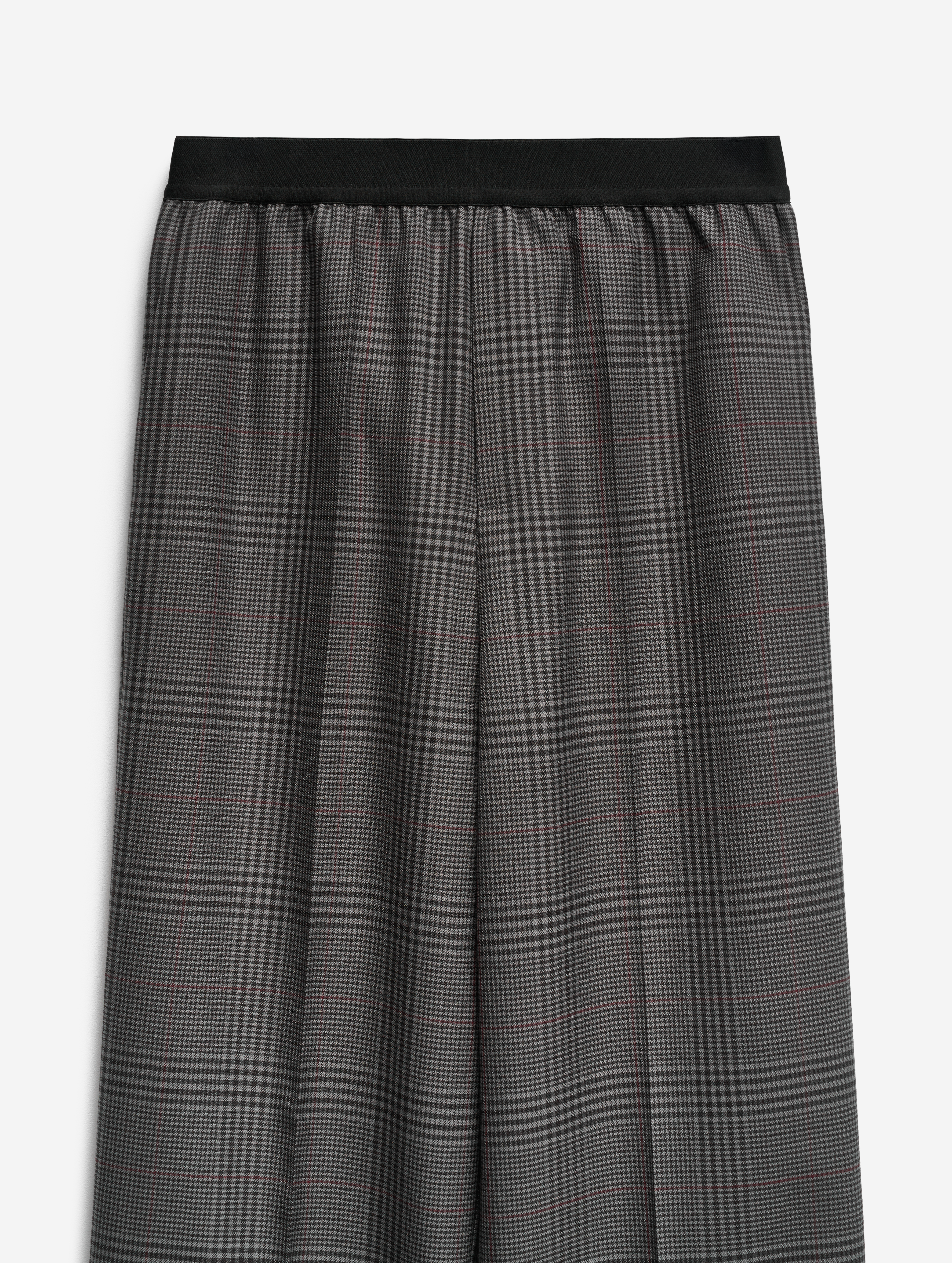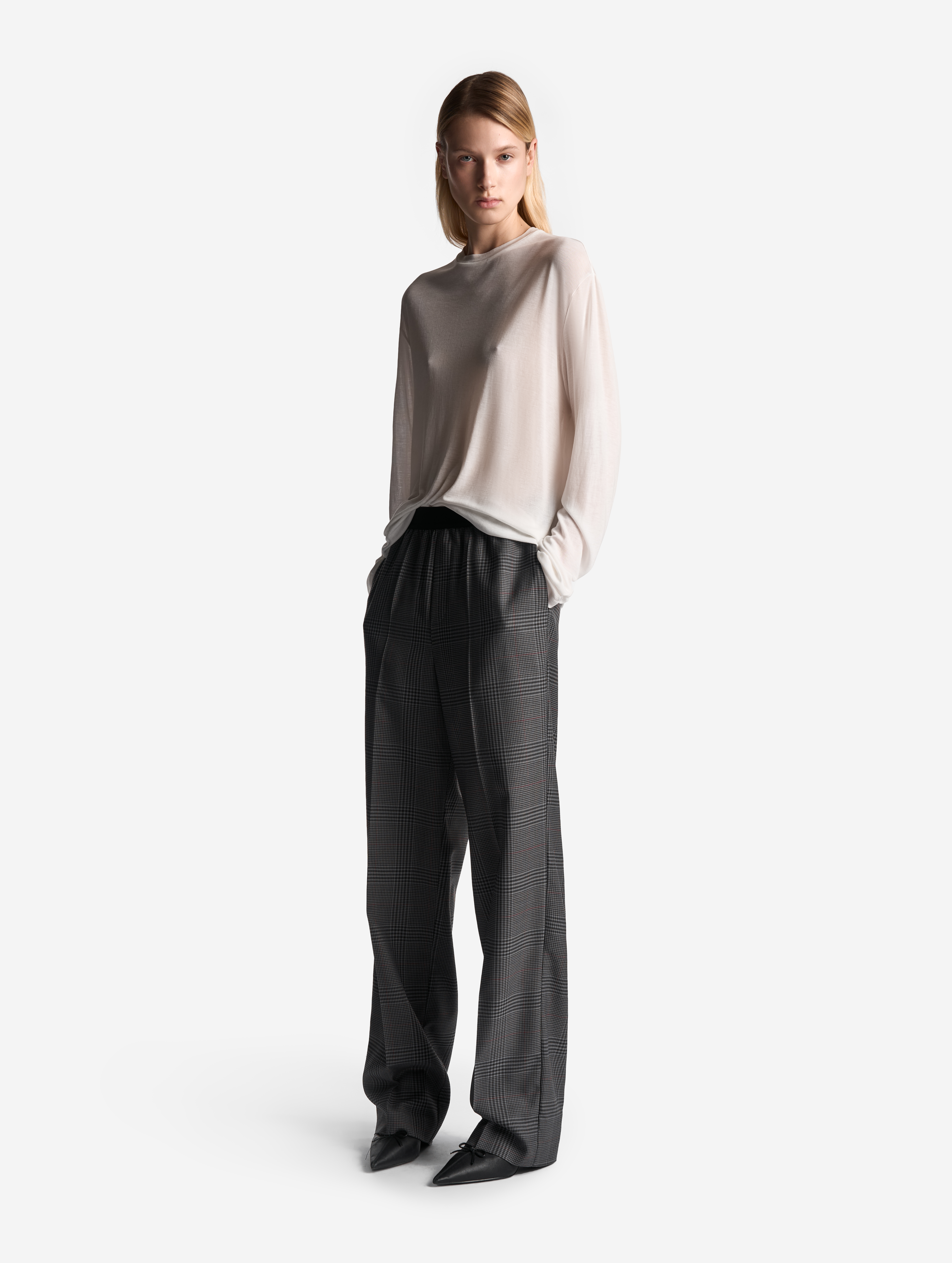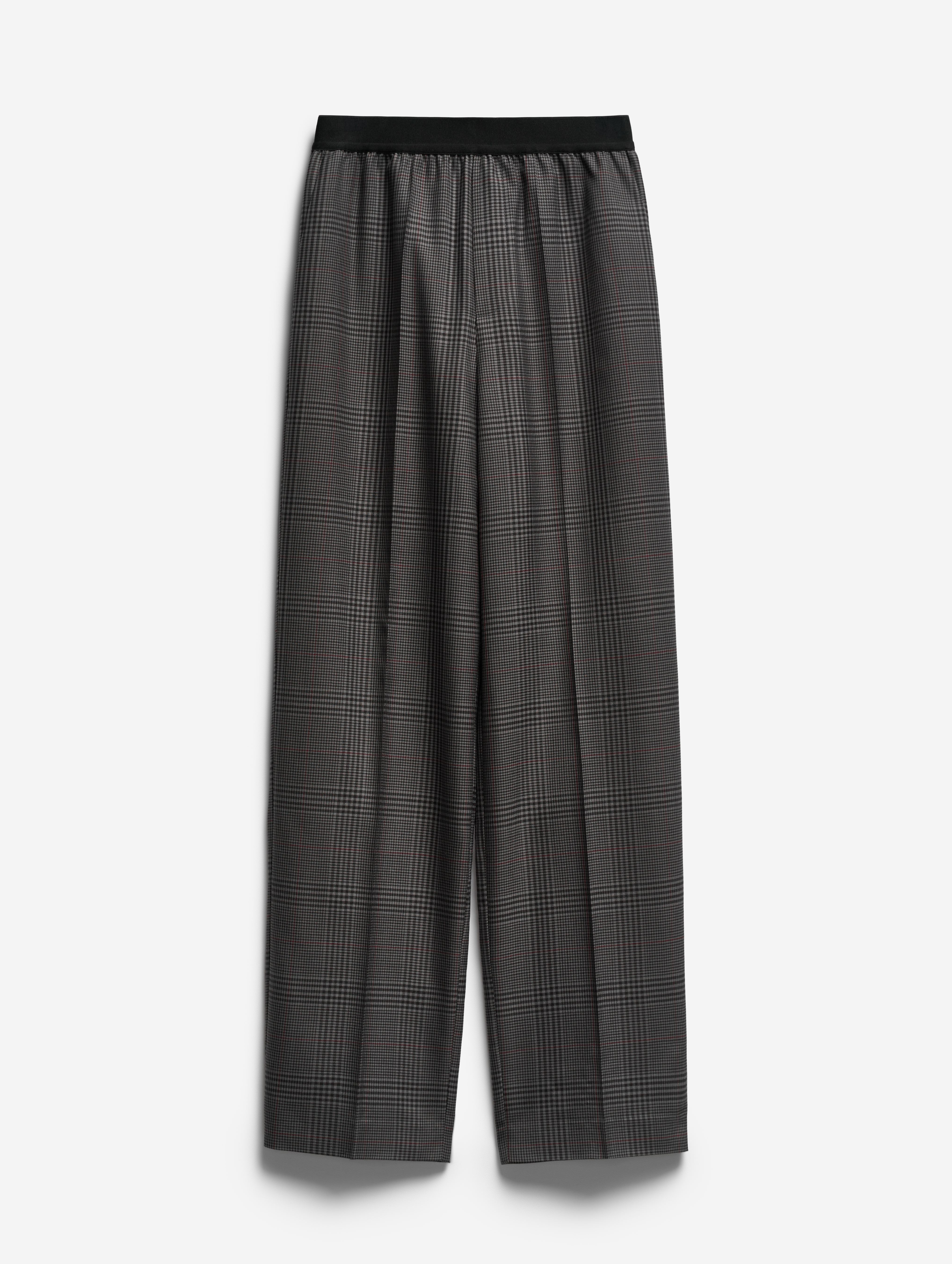 Эти брюки в точности повторяют модель, которая давно стала классикой Ushatava, — брюки на резинке. Они выполнены из гладкой костюмной ткани, в составе которой присутствует шерсть. Этот материал хорошо держит форму и не мнется. У изделия универсальная посадка, которая рассчитана и на женскую и на мужскую фигуру. Брюки слегка заужены книзу, спереди заутюжены стрелки. Верхний срез обработан широкой резинкой. Есть два боковых функциональных кармана.