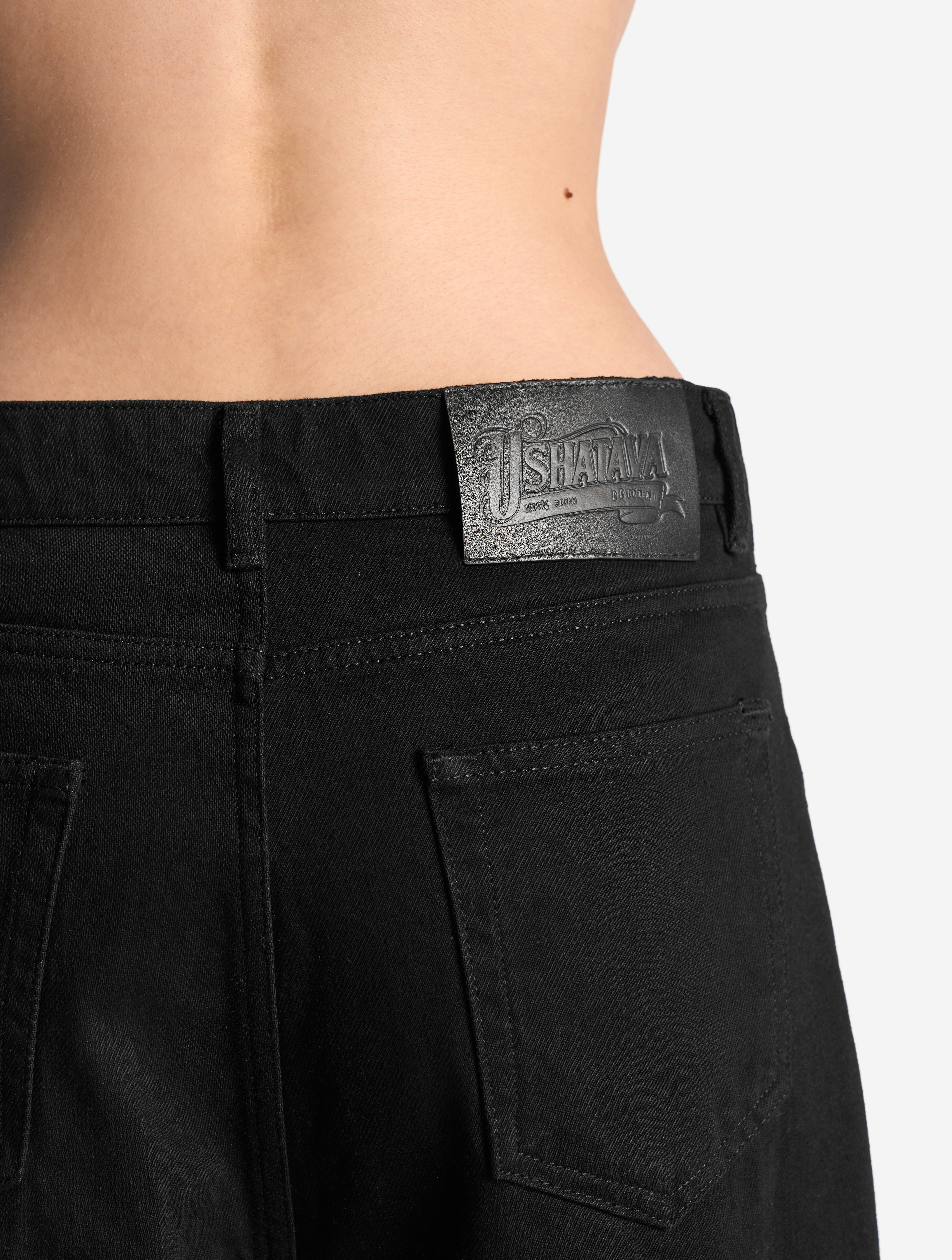 В дизайне этих джинсов воплощен еще один излюбленный прием модного Дома: ирония. Кожаная нашивка на поясе — пародия на винтажный патч, созданная при помощи искусственного интеллекта. Логотип Ushatava выполнен каллиграфическим шрифтом, но только внимательный обнаружит ошибки в написании: 1000% DDENIM.