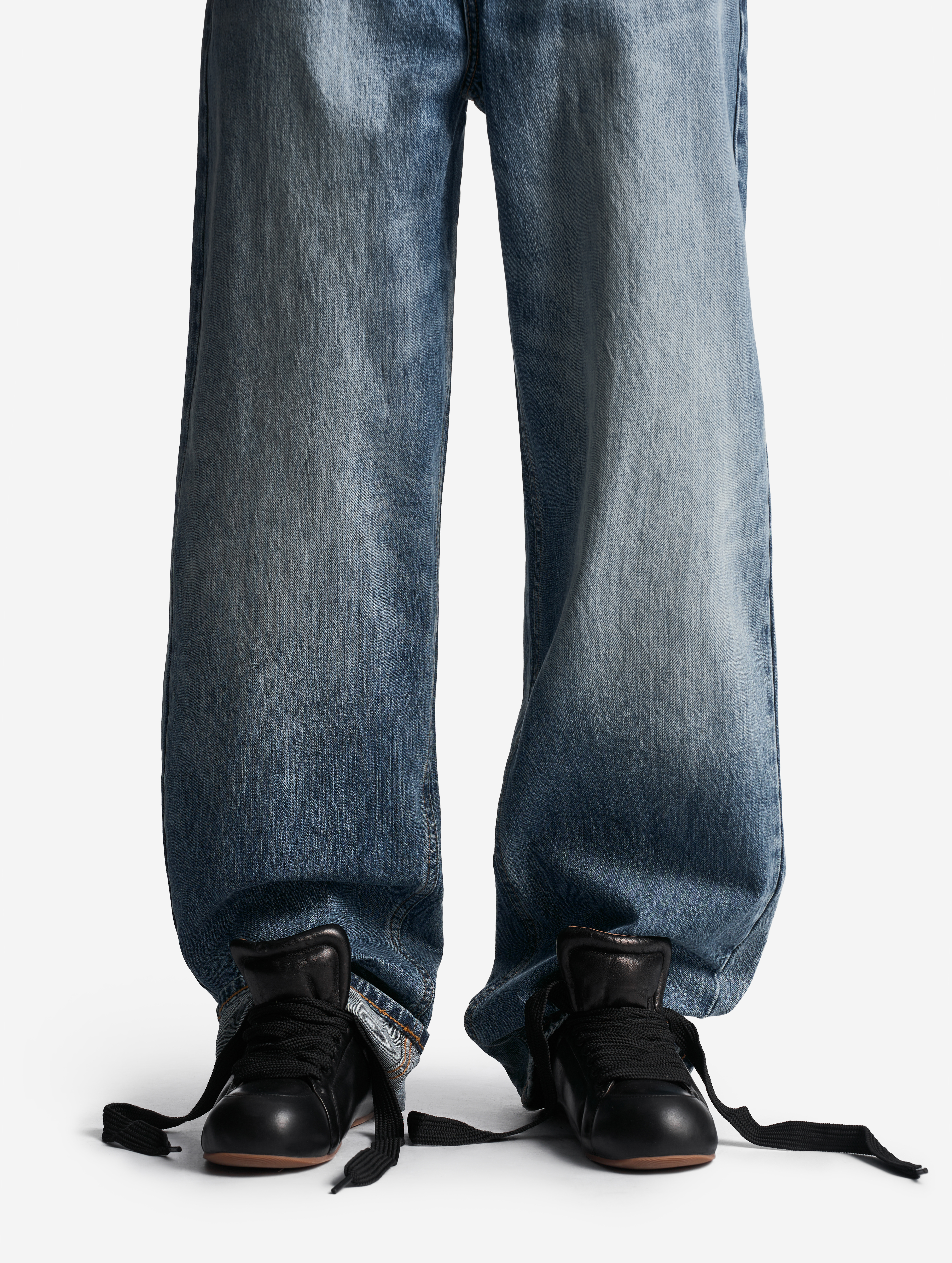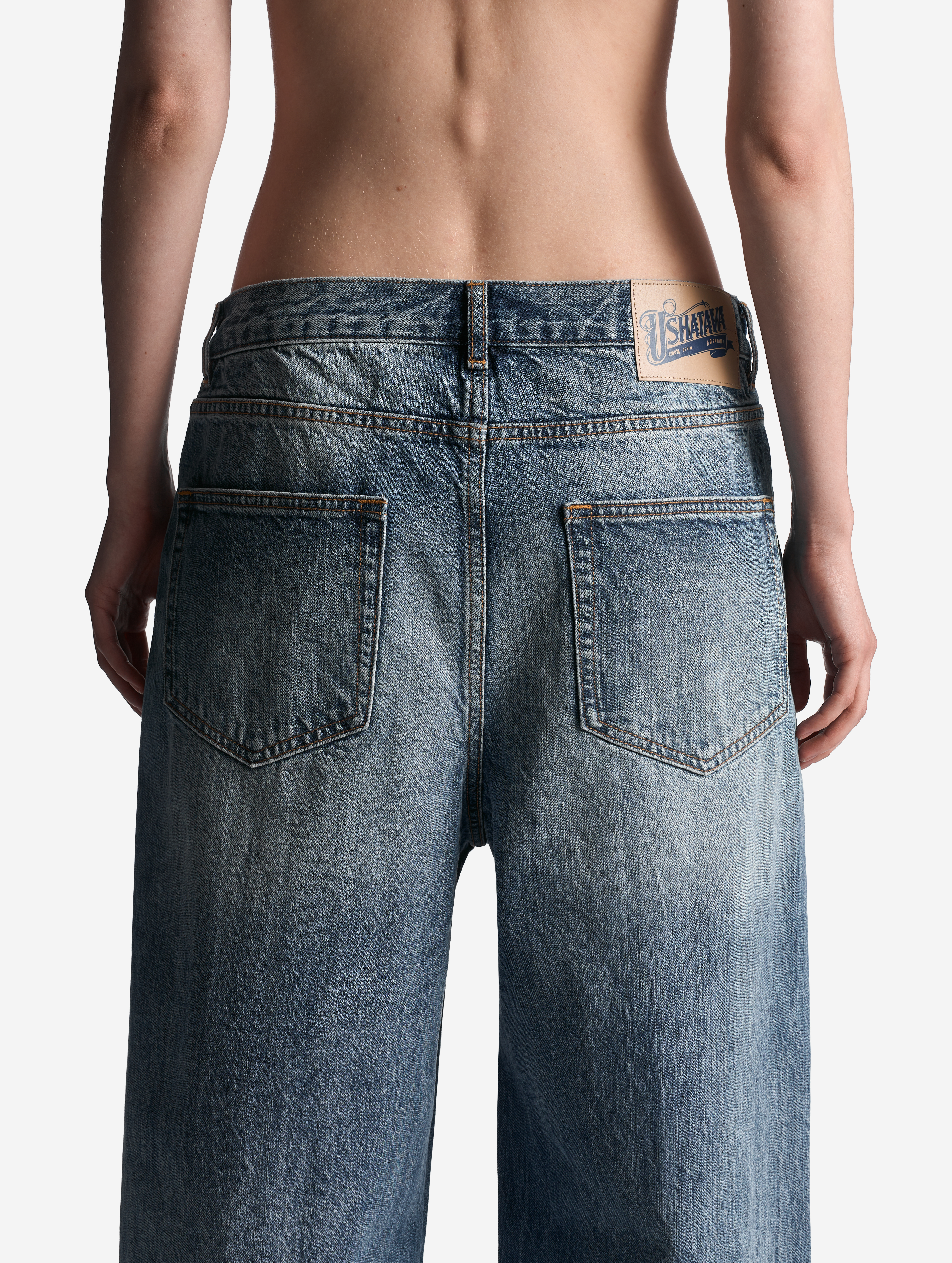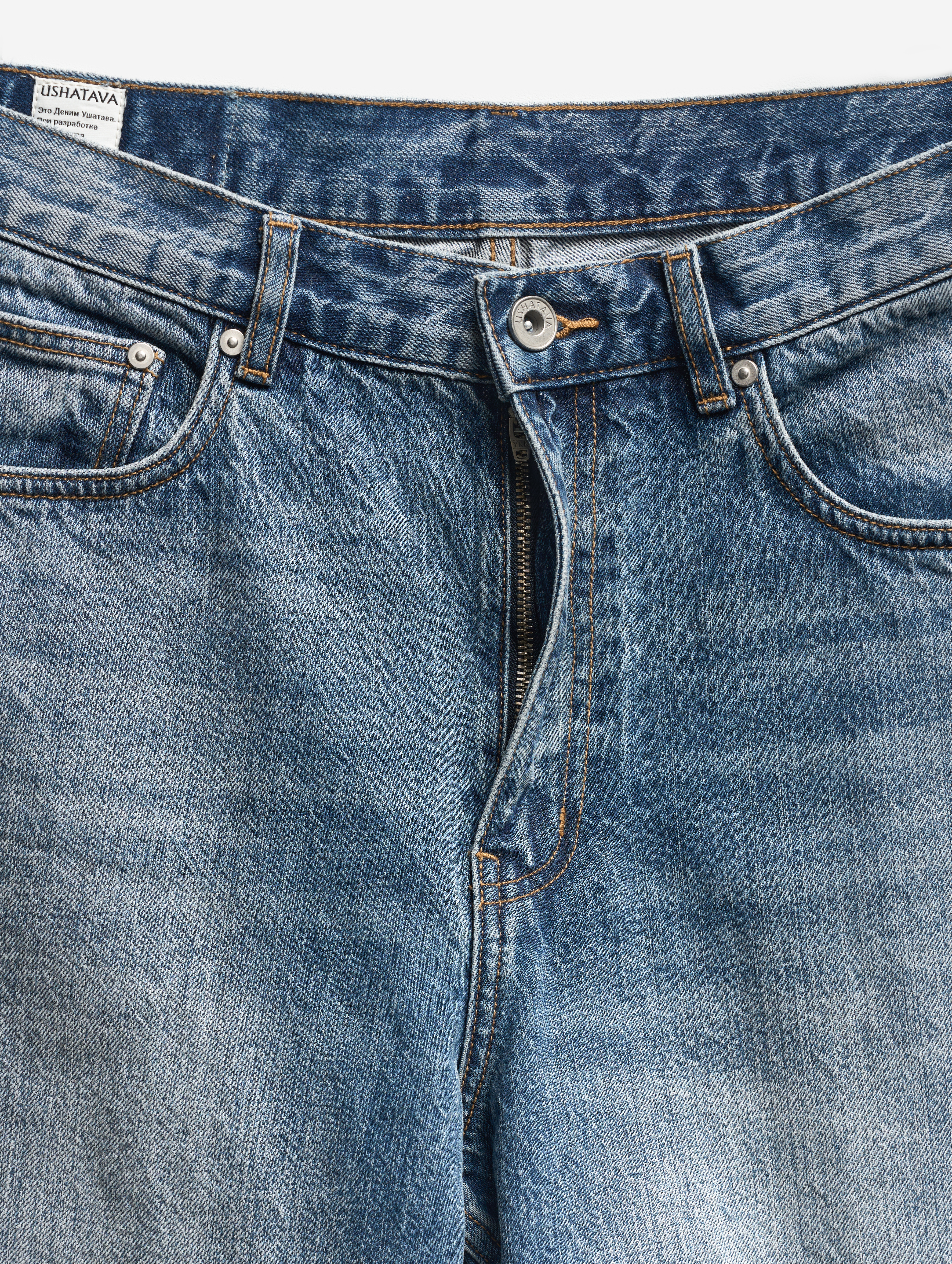 Relaxed Fit — новый силуэт в линейке денима Ushatava. У этой модели прямой крой и расслабленная средняя посадка. Поверхность джинсов покрыта потертостями, расположенными согласно анатомии владельца вещи. Есть два кармана и один маленький для зажигалки спереди, а также два кармана сзади. Джинсы маркируется только буквенной размерной сеткой и позиционируется нами как унисекс. Модель застегивается на молнию и металлическую джинсовую пуговицу. Есть шлевки для ремня.