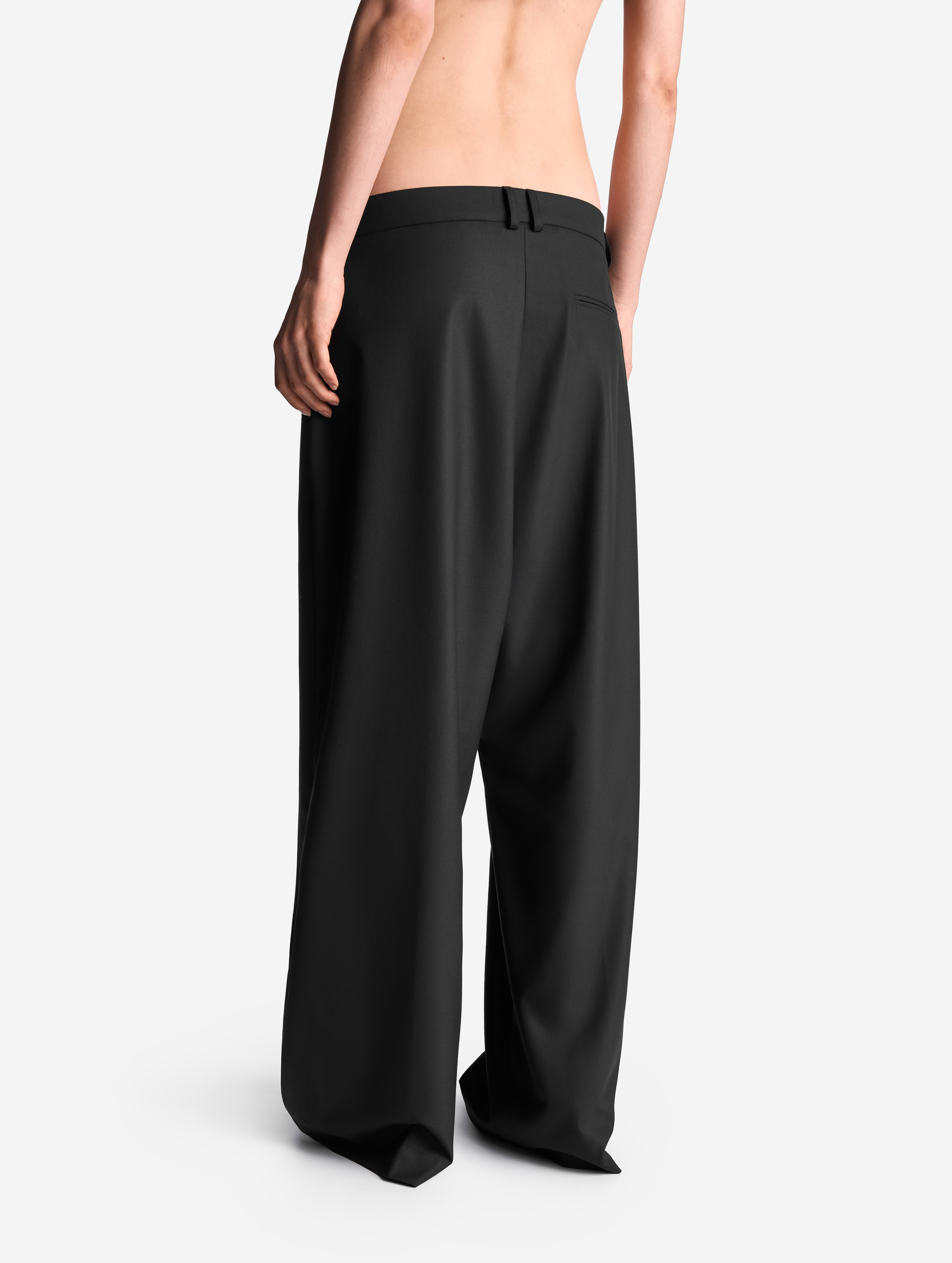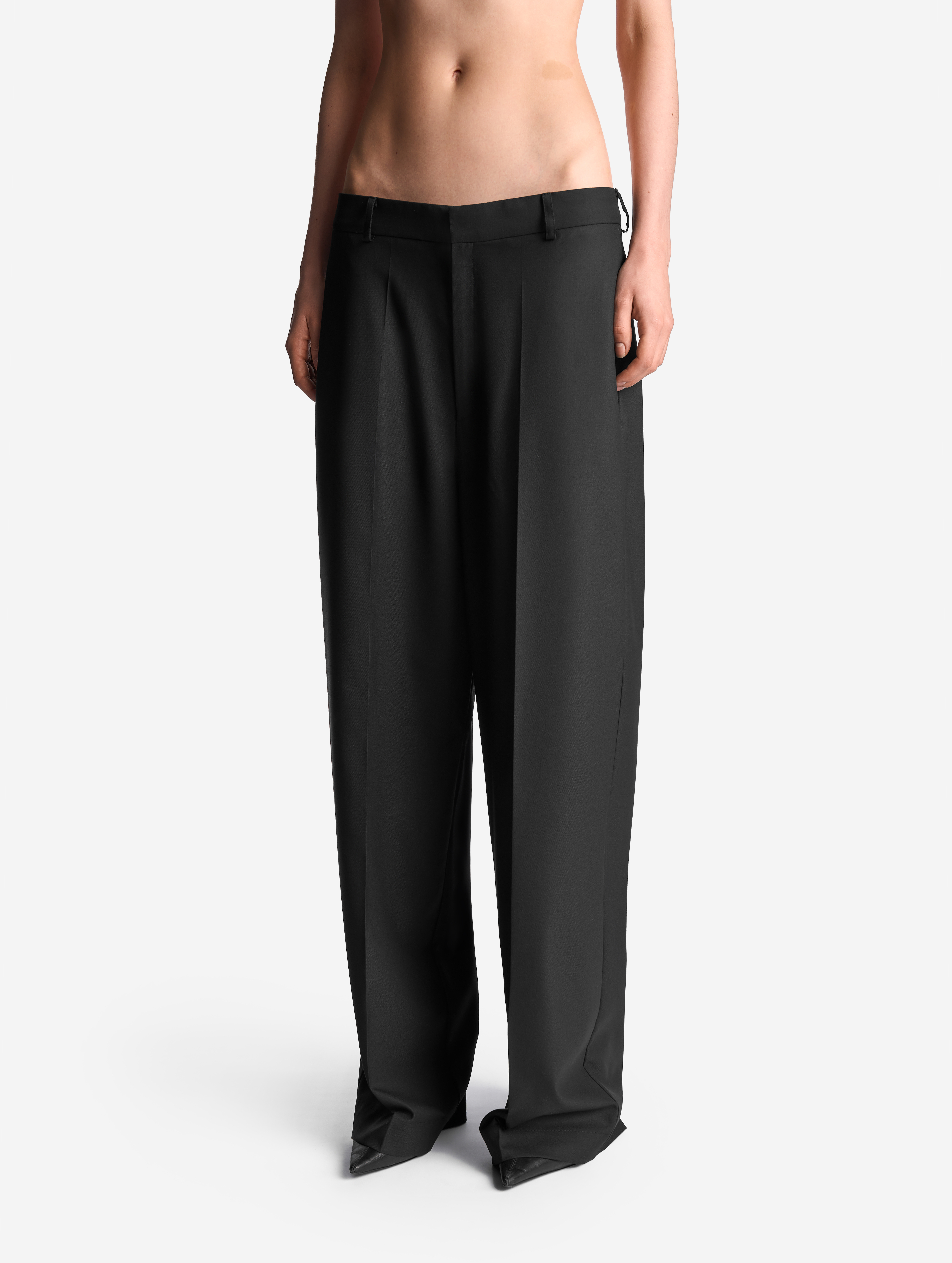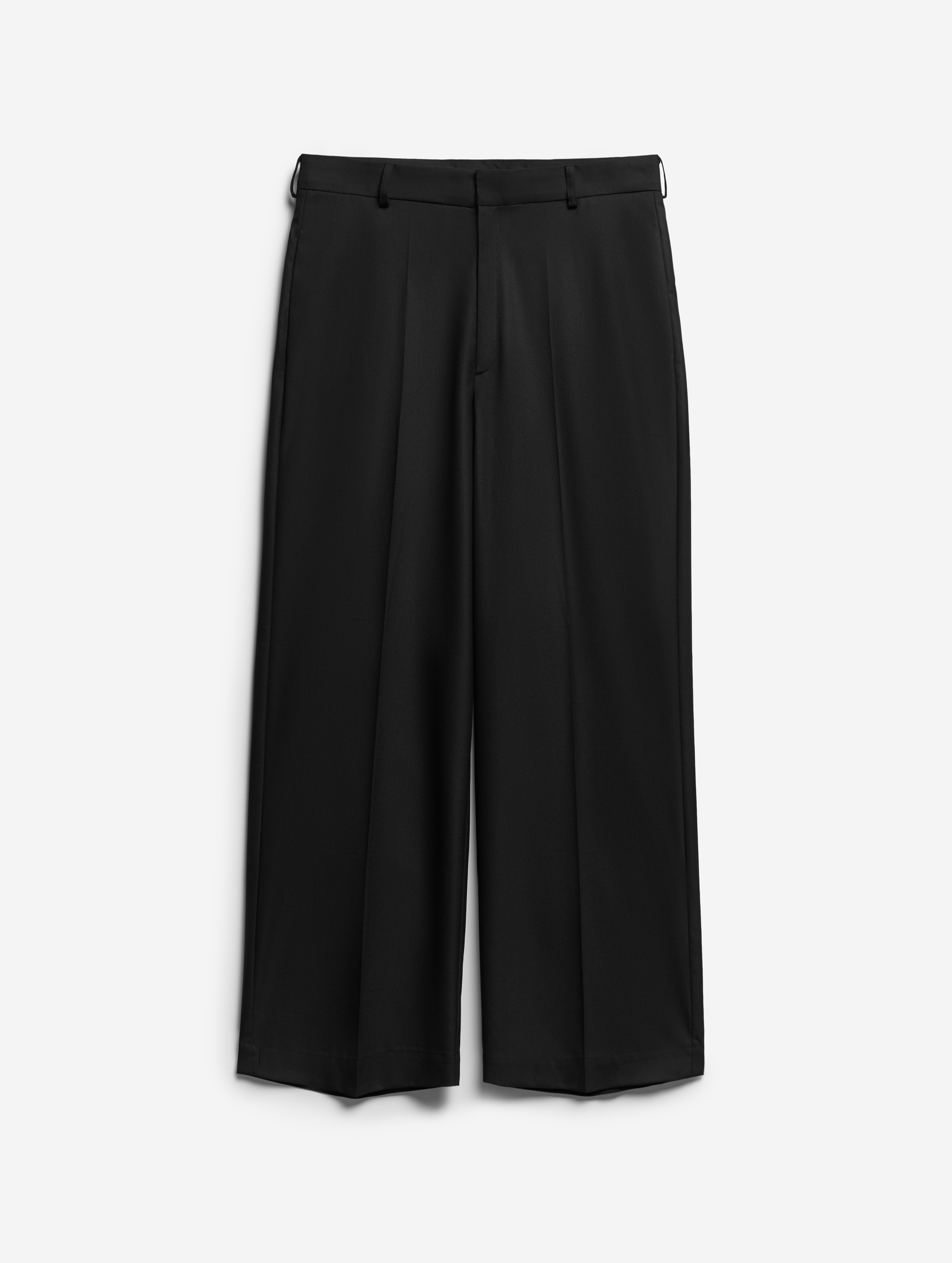 Строгие костюмные брюки. У них прямой крой, пояс на корсажной ленте со шлевками, неразглаживаемые стрелки спереди, застежка на молнию и крючок, два функциональных боковых кармана и один фальшивый сзади. Брюки выполнены из плотной костюмной ткани.