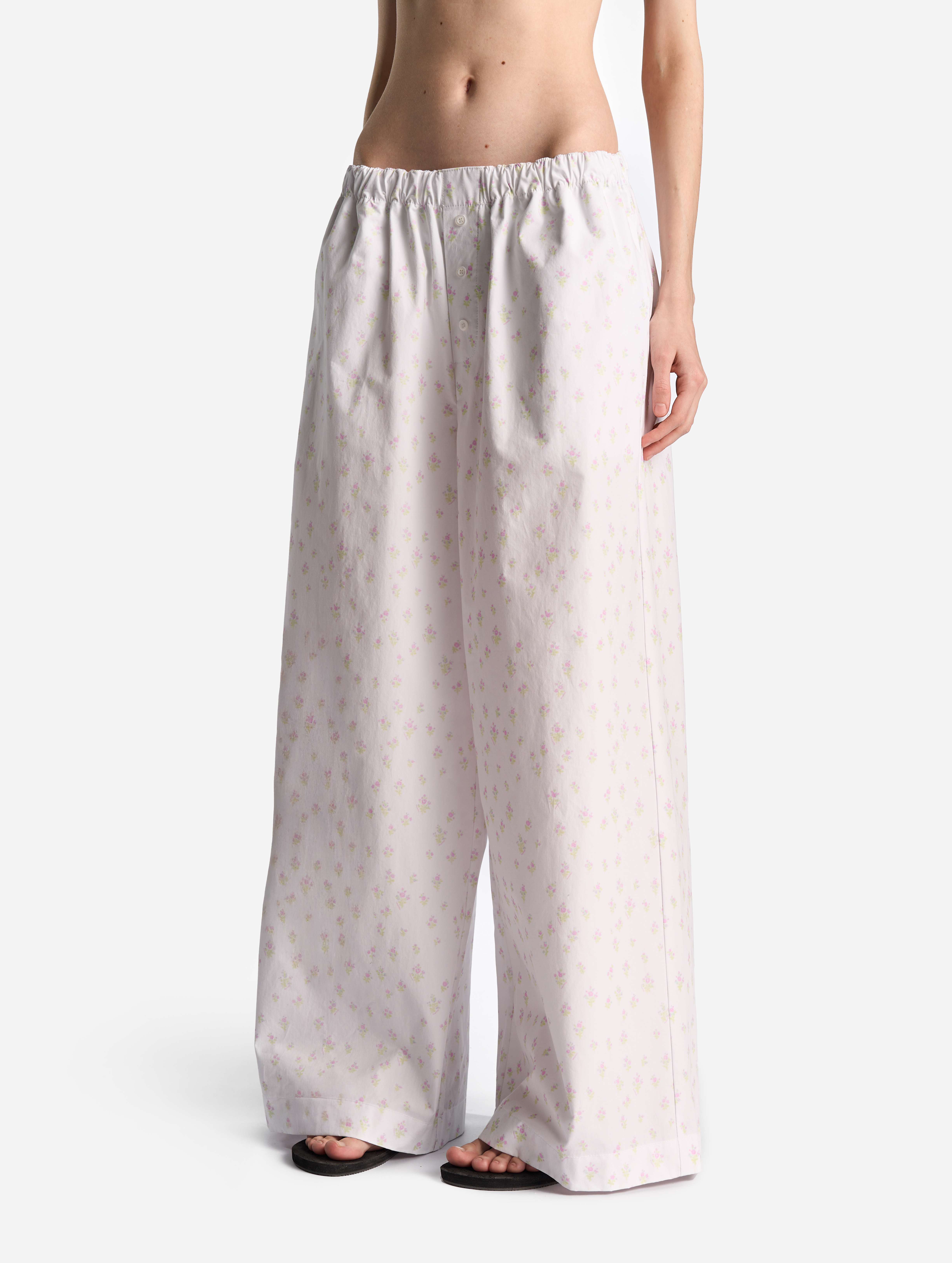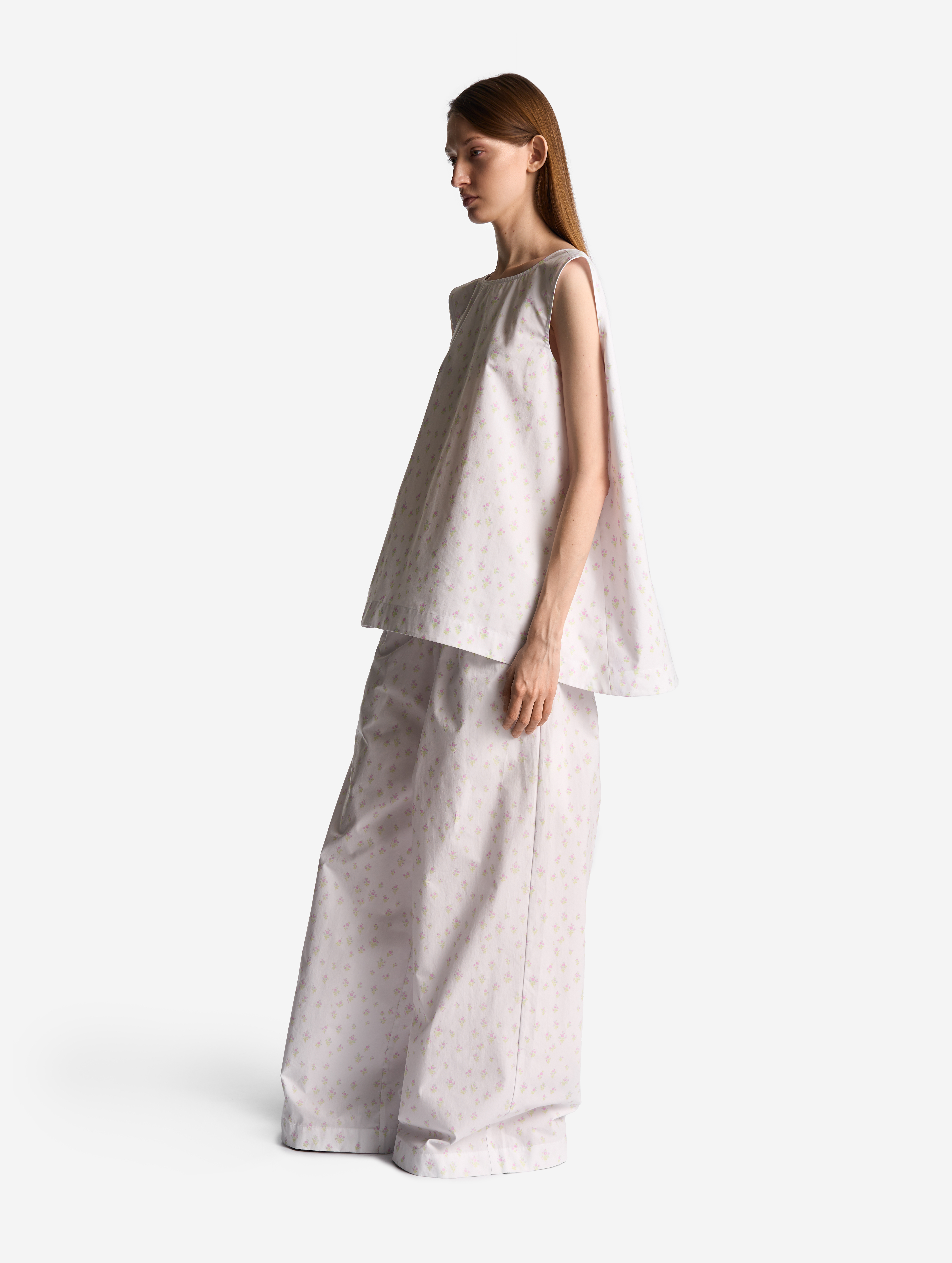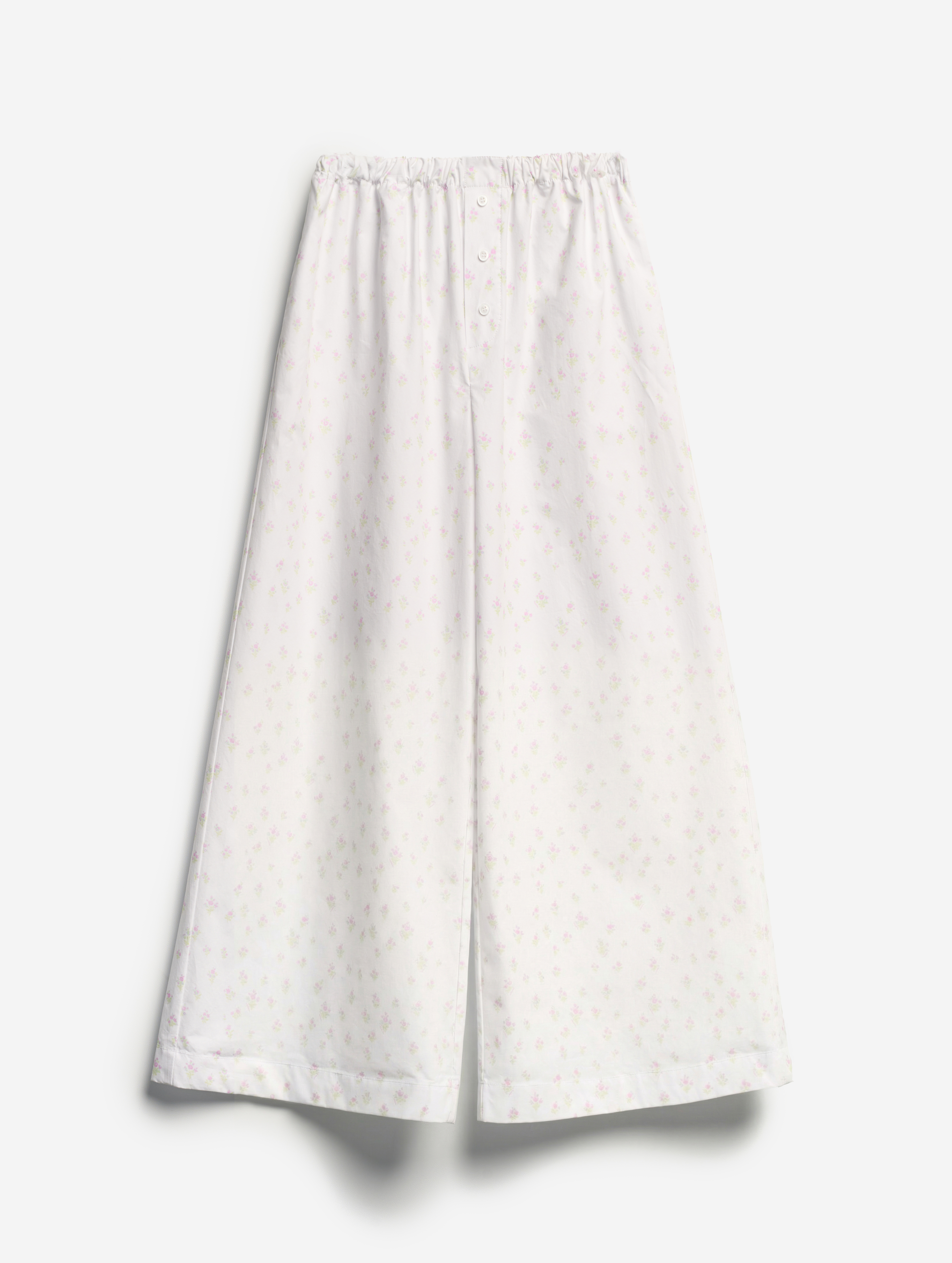 Широкие брюки на мягкой резинке. Мы позиционируем эту модель как агендерную — ее могут носить не только женщины, но и мужчины. Изделие выполнено из плотного формоустойчивого вареного хлопка. Его отличает мятая фактура, тактильно близкая к бумаге. Имитация гульфика с декоративными пуговицами отсылает к классическим мужским пижамным брюкам. В боковых швах есть два кармана.