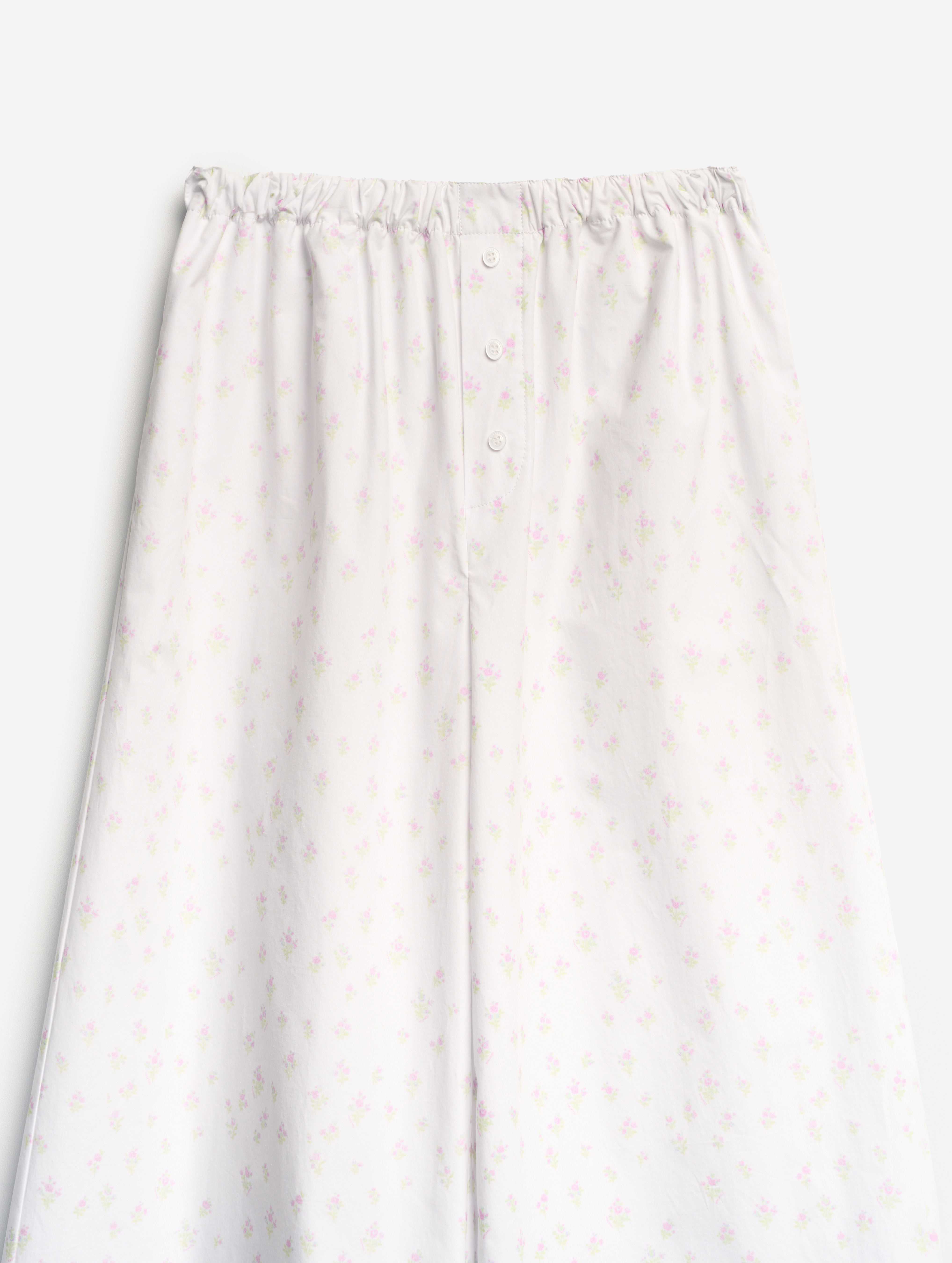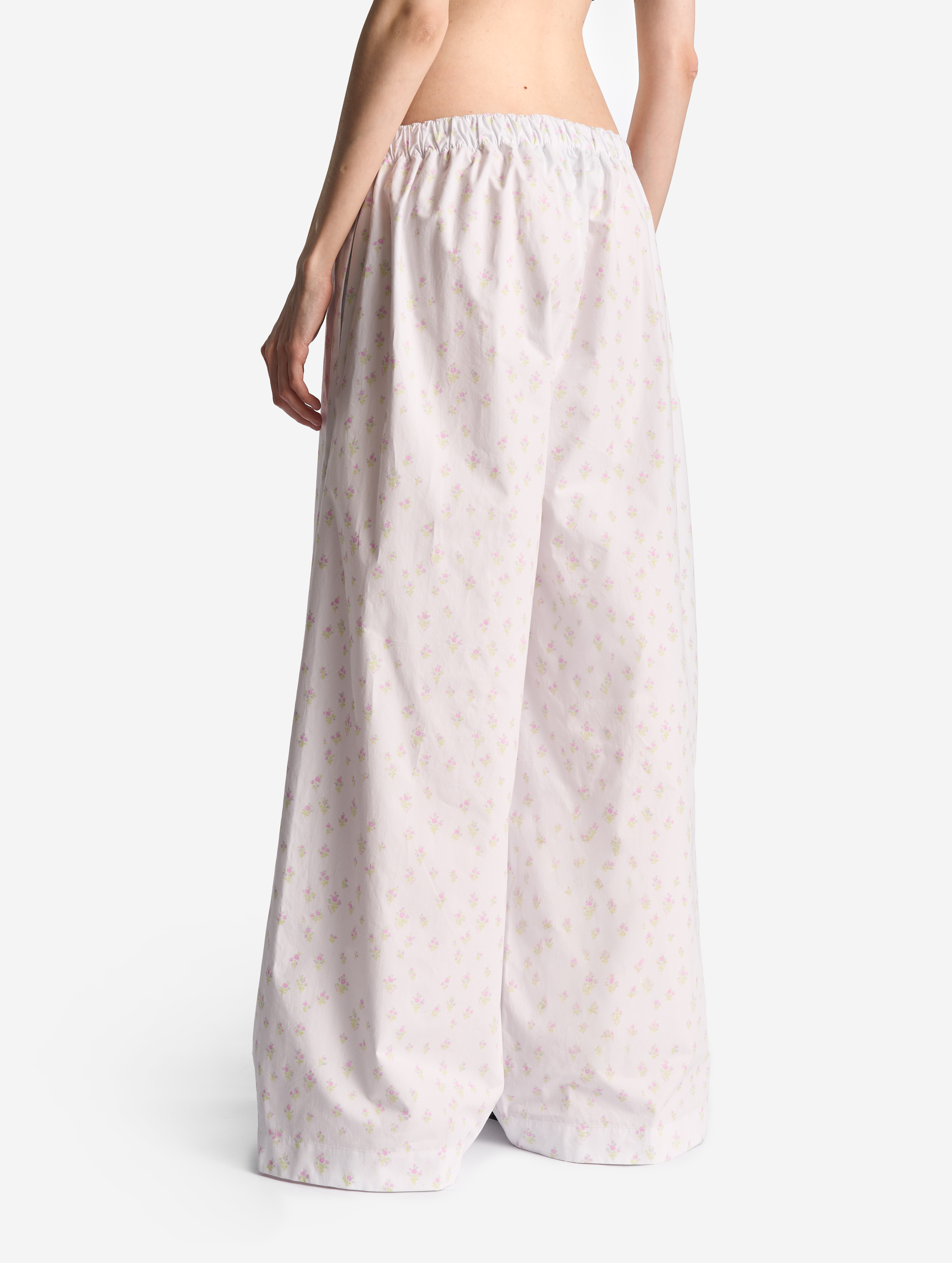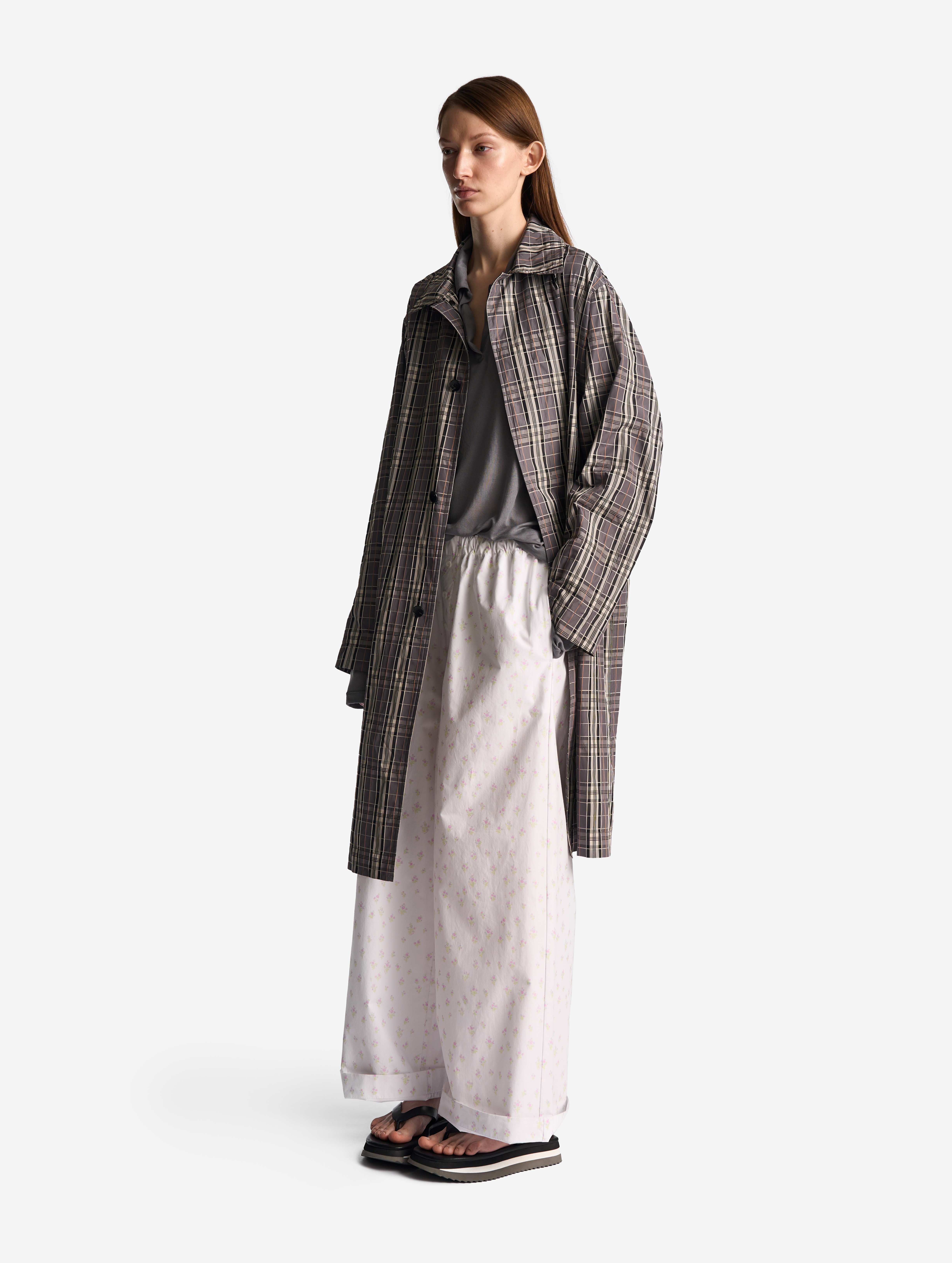 Широкие брюки на мягкой резинке. Мы позиционируем эту модель как агендерную — ее могут носить не только женщины, но и мужчины. Изделие выполнено из плотного формоустойчивого вареного хлопка. Его отличает мятая фактура, тактильно близкая к бумаге. Имитация гульфика с декоративными пуговицами отсылает к классическим мужским пижамным брюкам. В боковых швах есть два кармана.