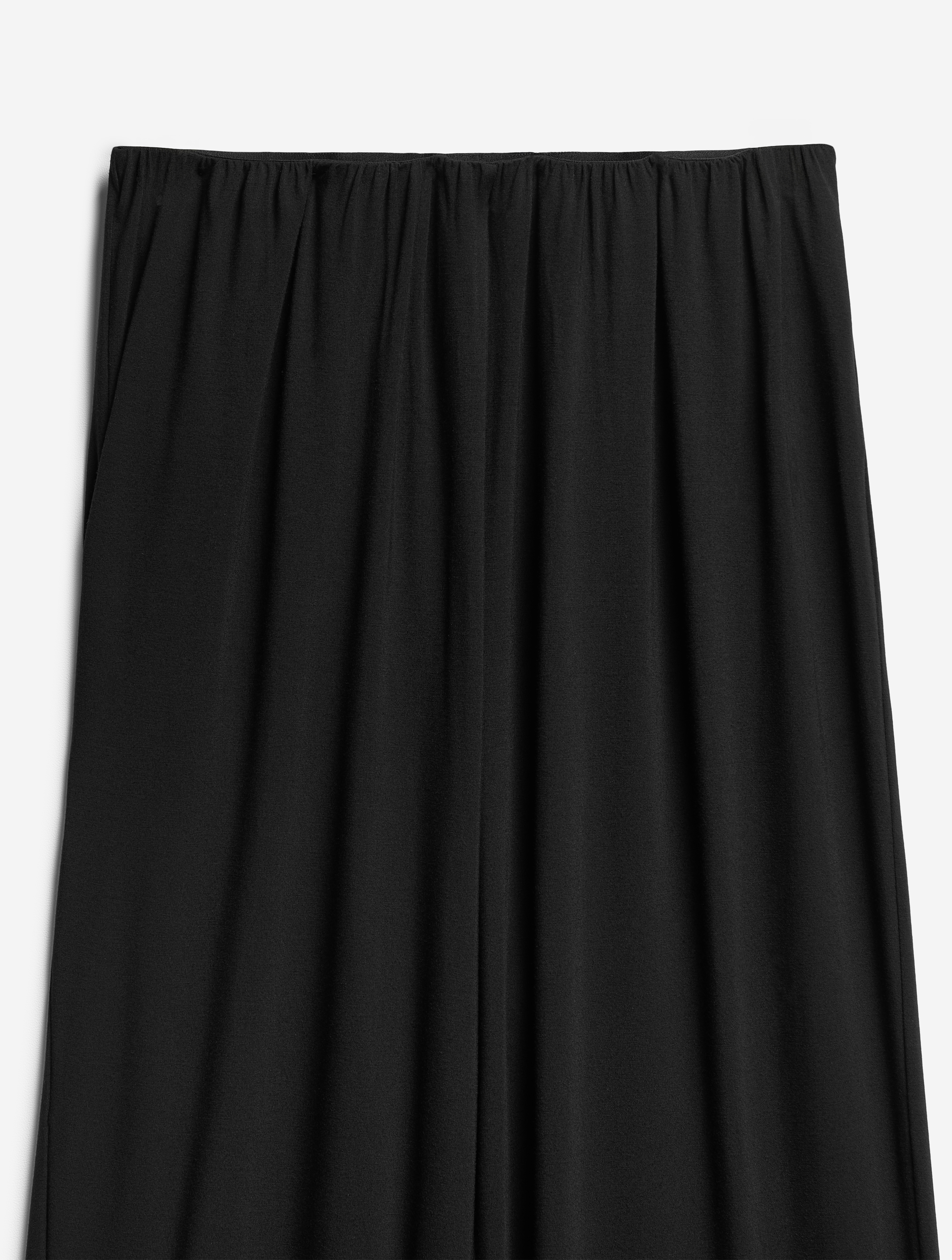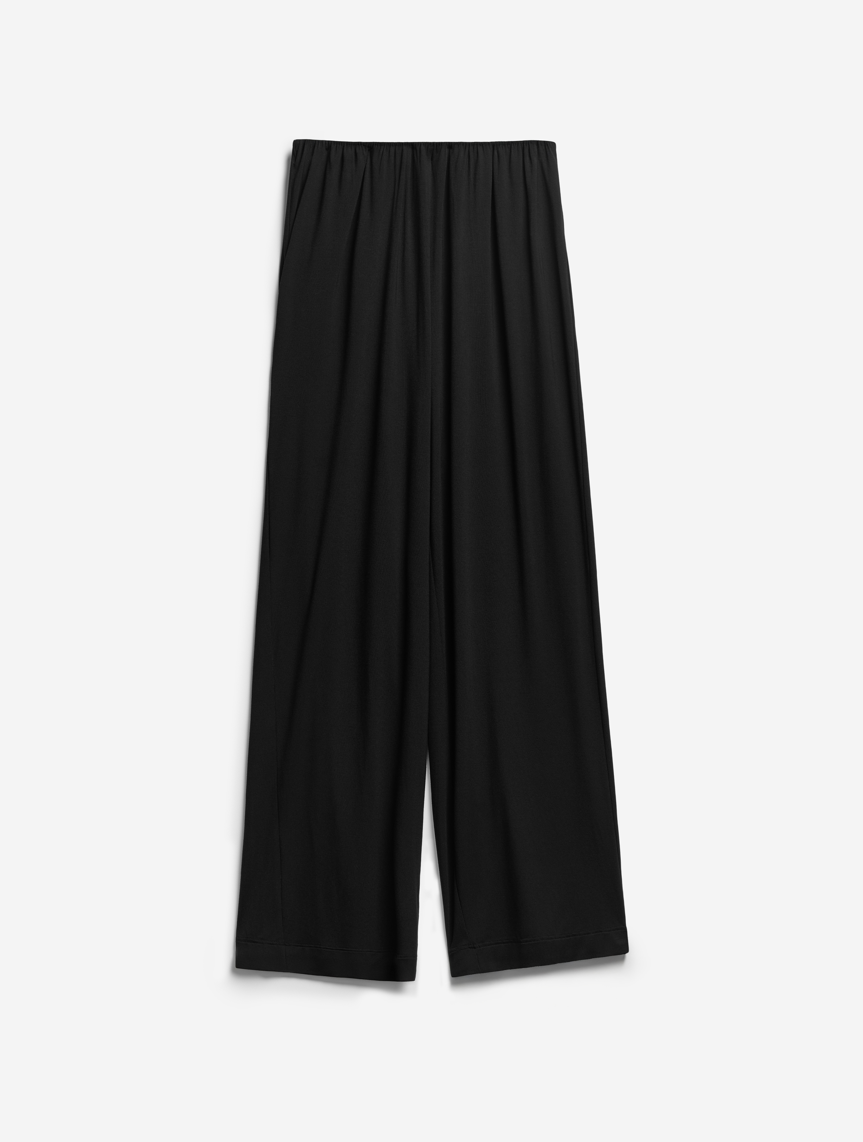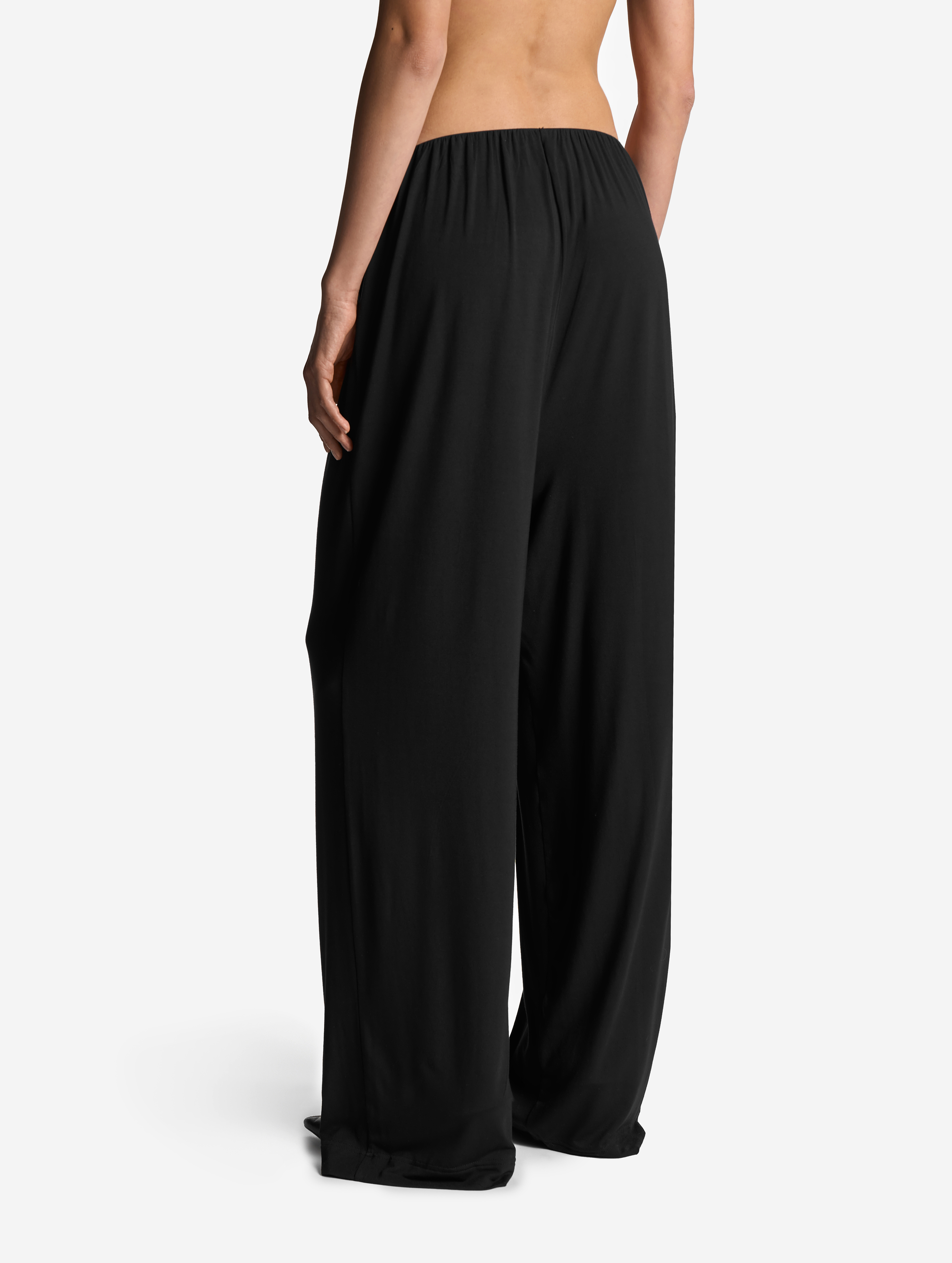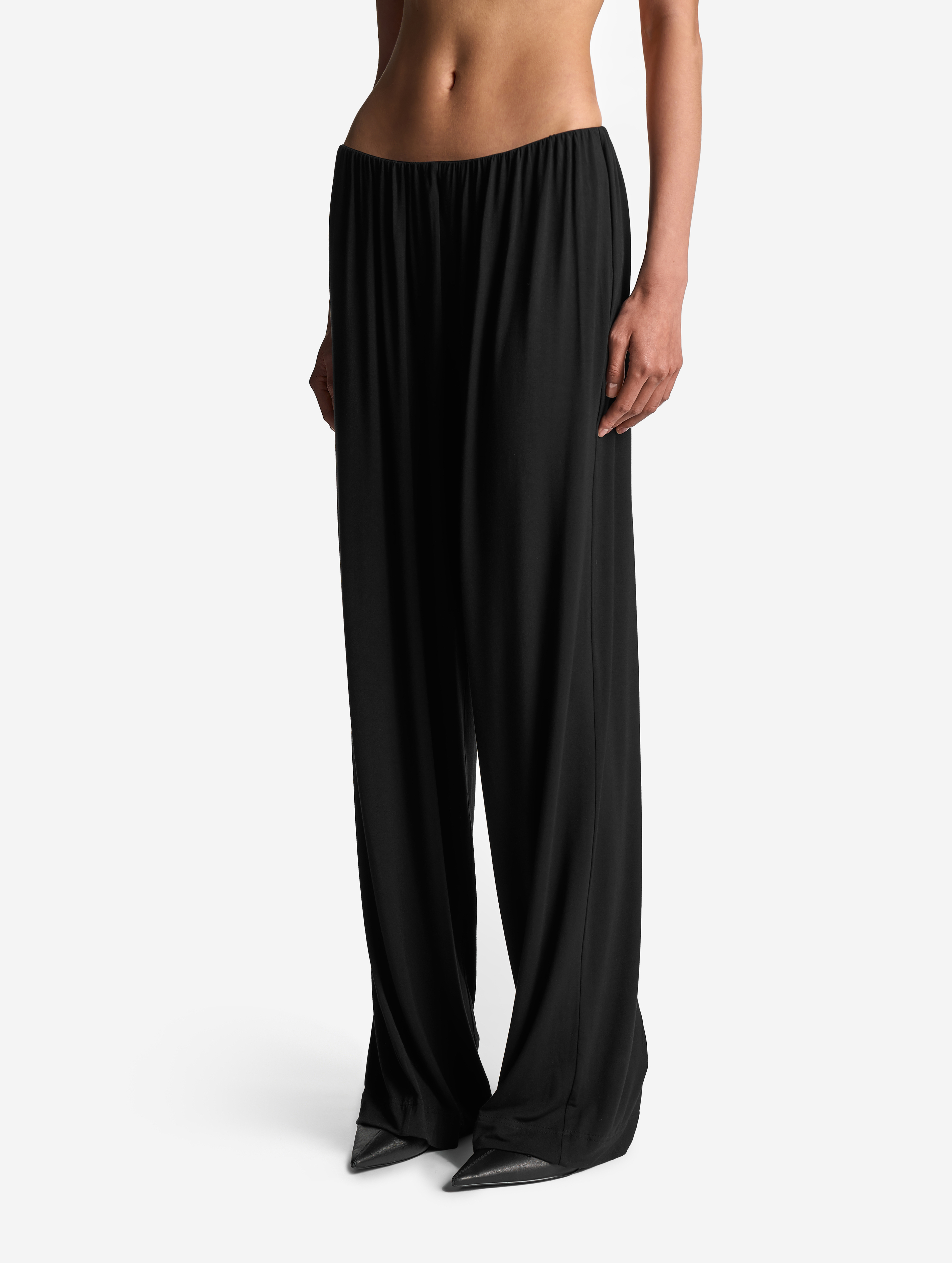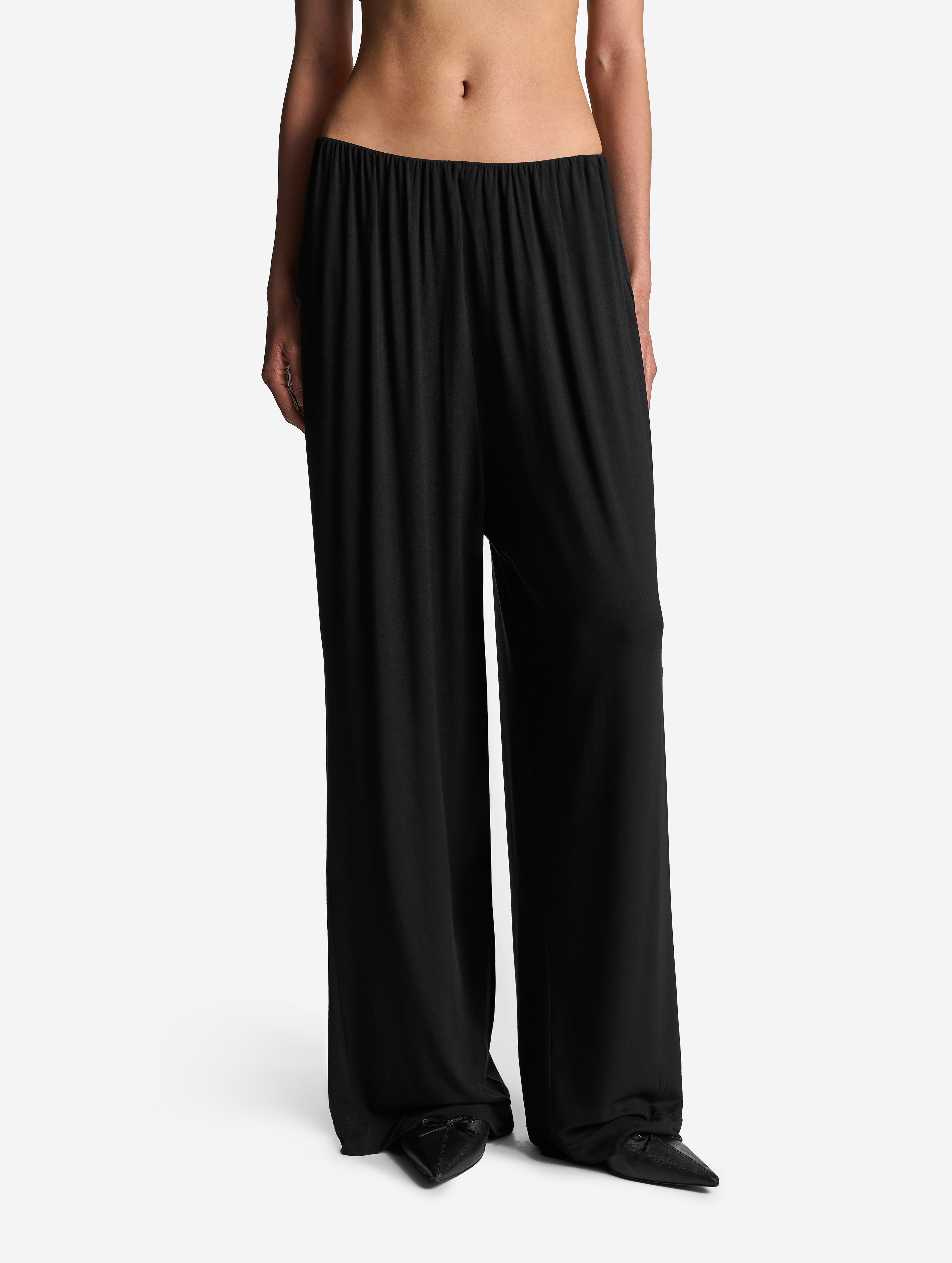 Прямые широкие брюки — классический силуэт модного Дома. У этих брюк свободная универсальная посадка: они рассчитаны как на женскую, так и на мужскую фигуру. Изделие выполнено из вискозного трикотажа: он мягкий, гладкий, приятен для тела, хорошо тянется и не мнется. Пояс на широкой эластичной резинке.