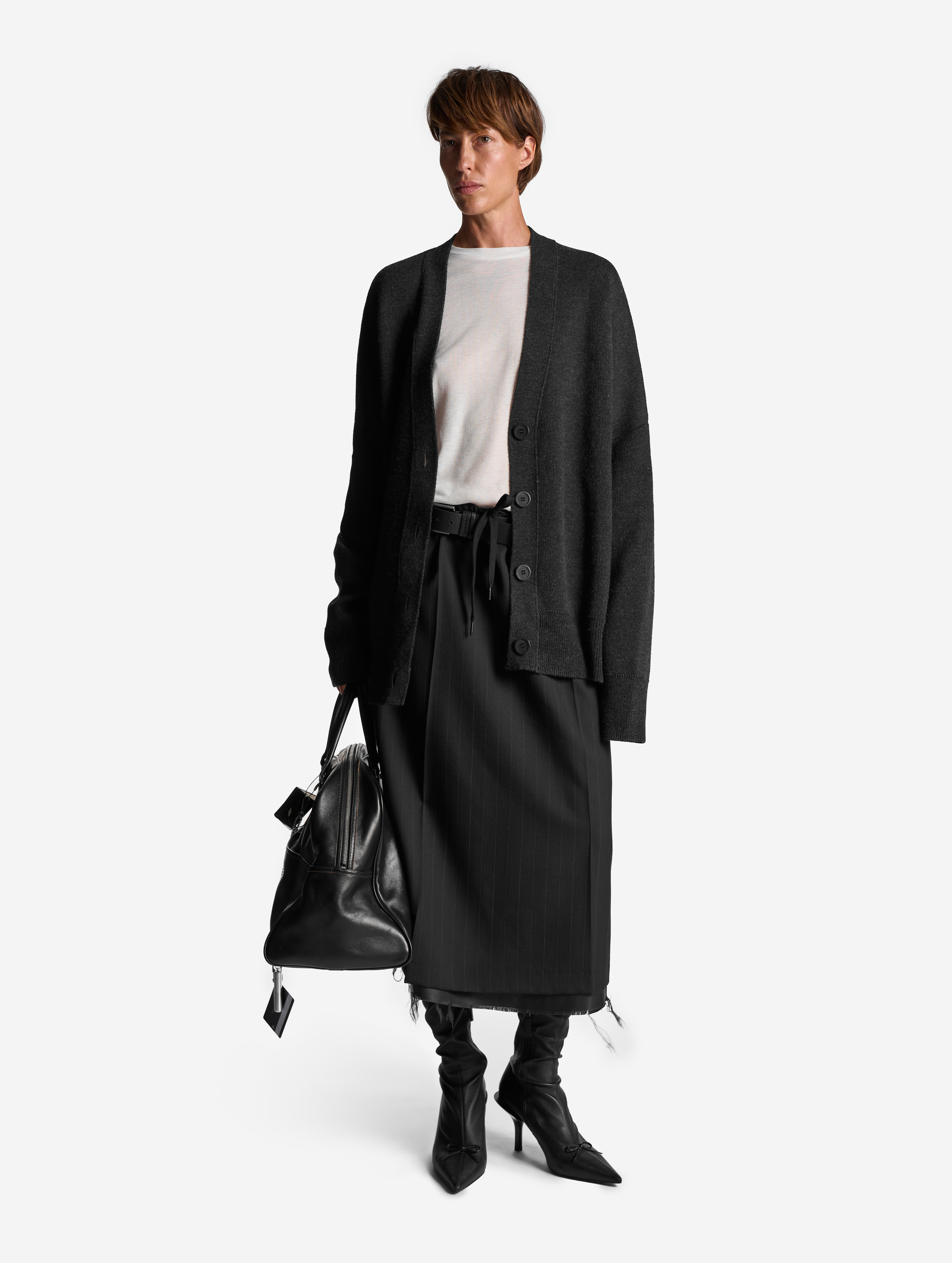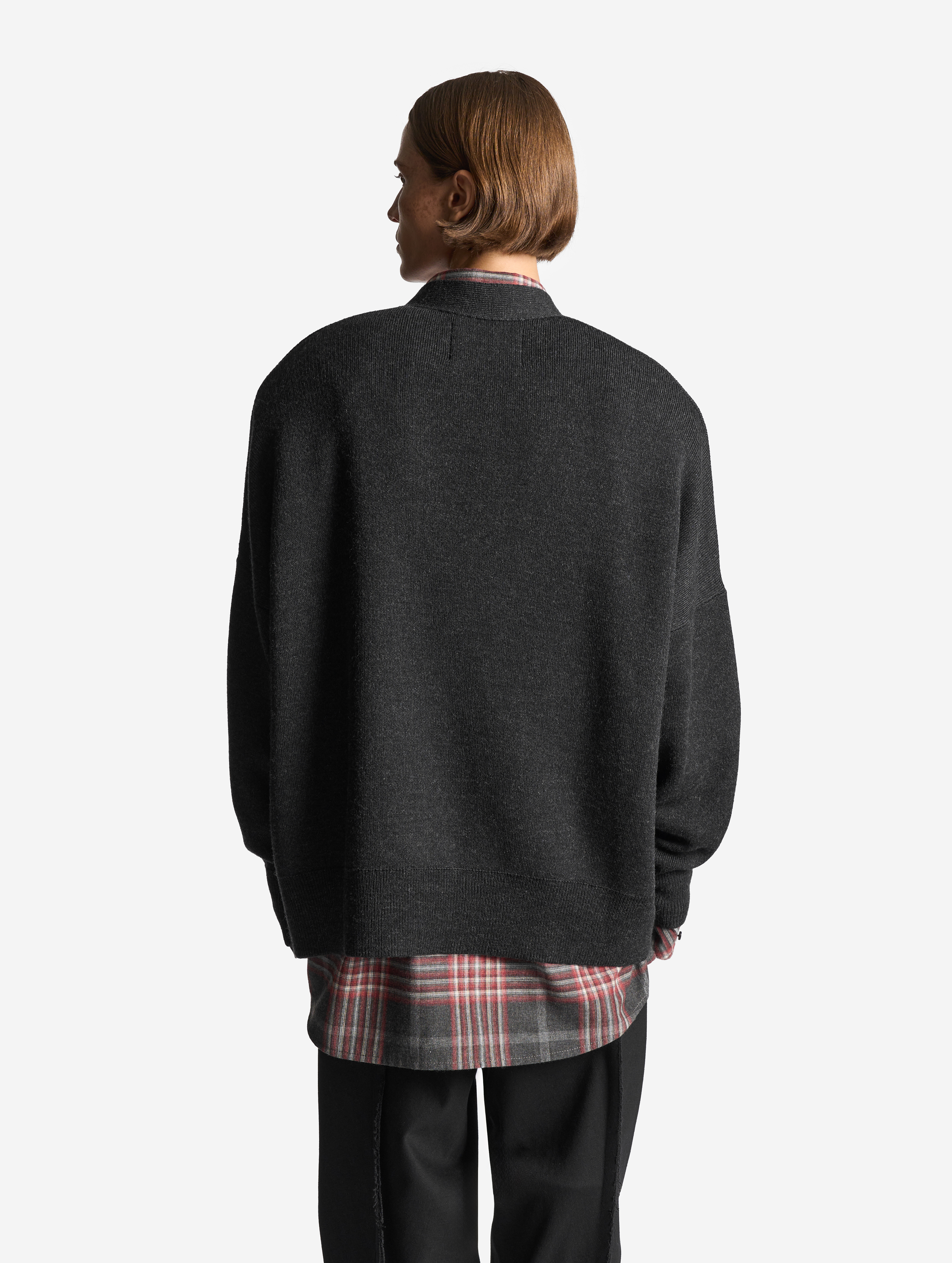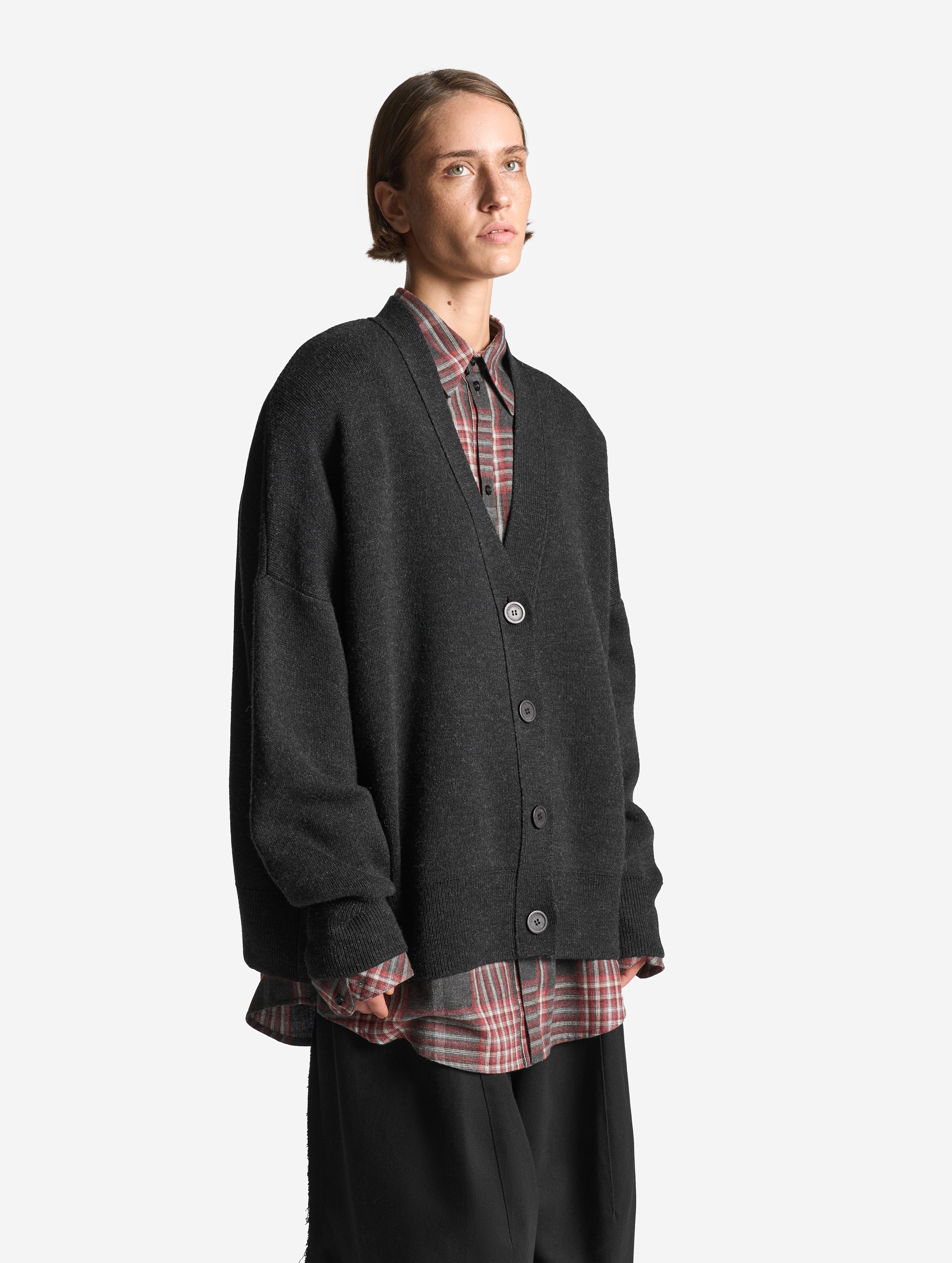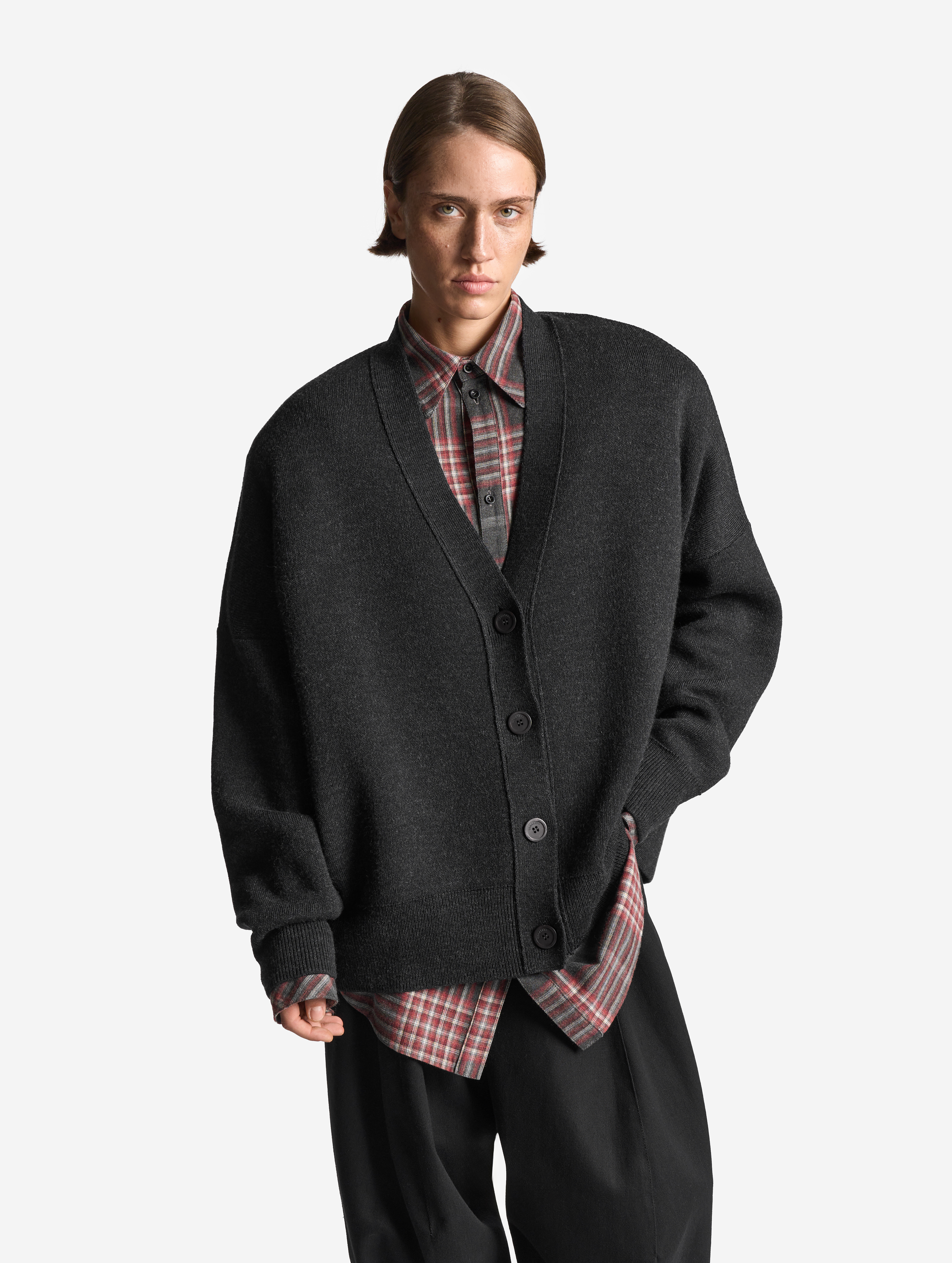 Вязаный кардиган удлиненного оверсайз-силуэта. Одинаково хорошо сидит на мужской и женской фигуре. Застегивается на роговые брендированные пуговицы. Благодаря наличию в составе акрила кардиган не пиллингуется и не деформируется со временем.