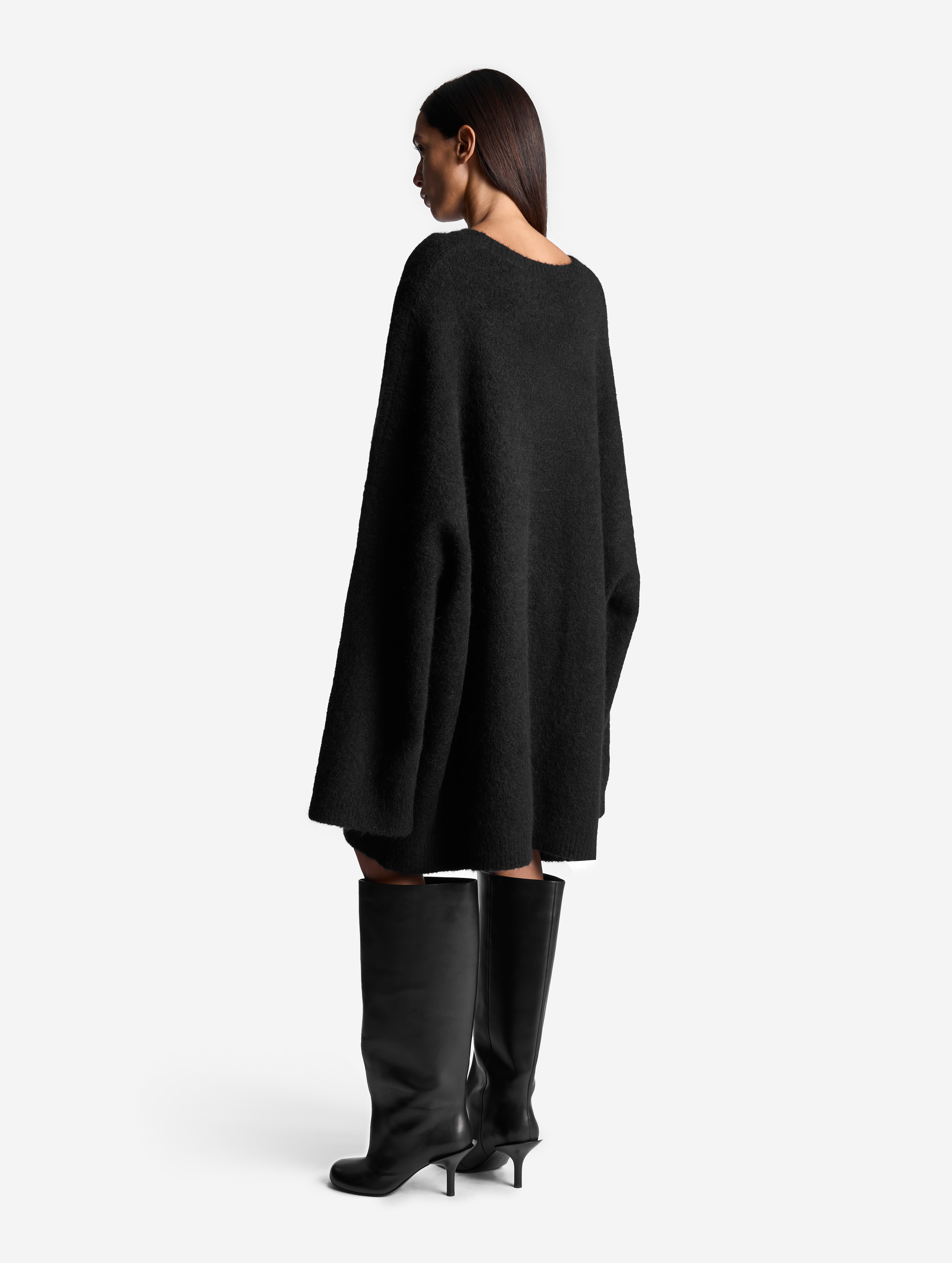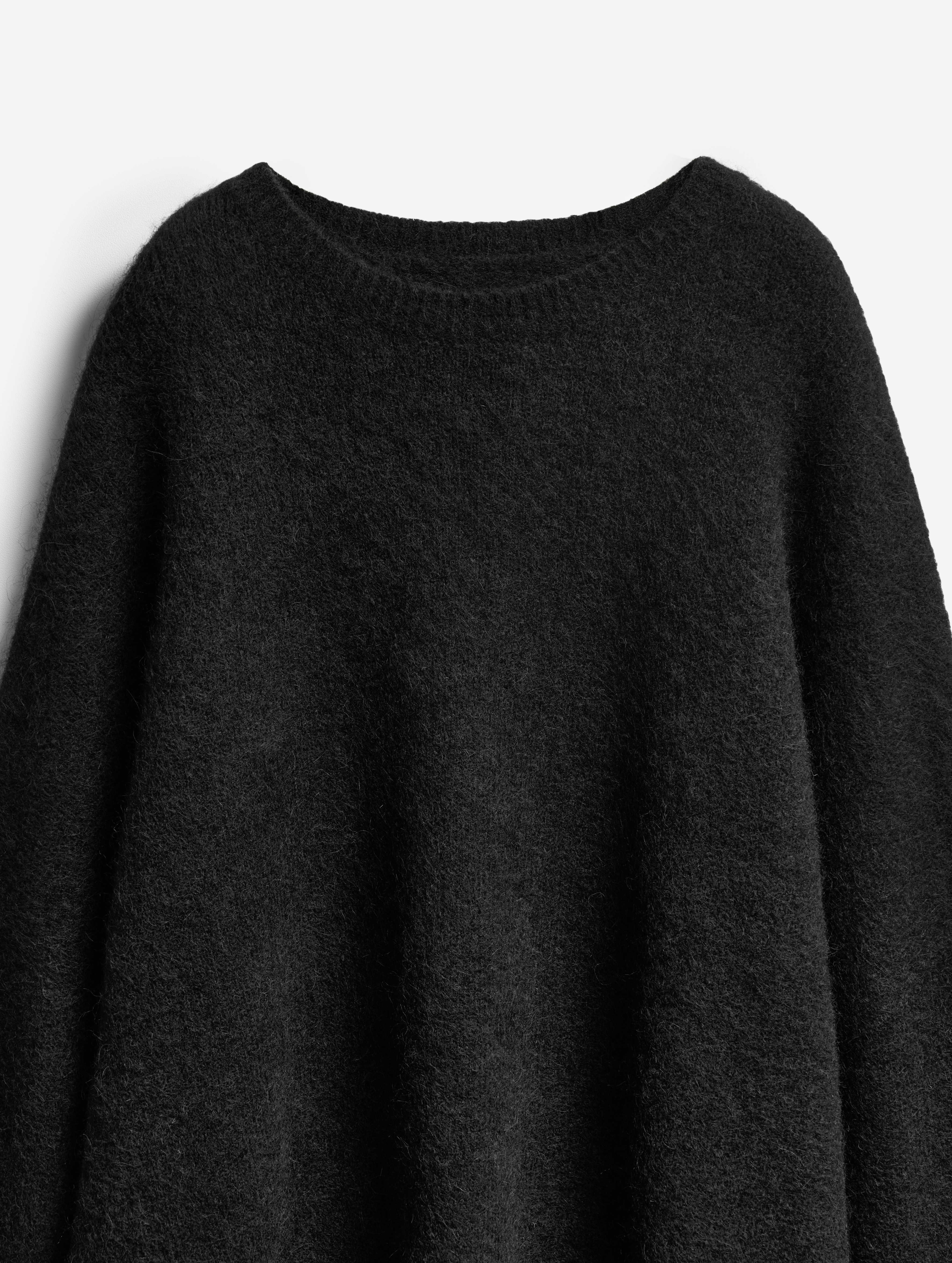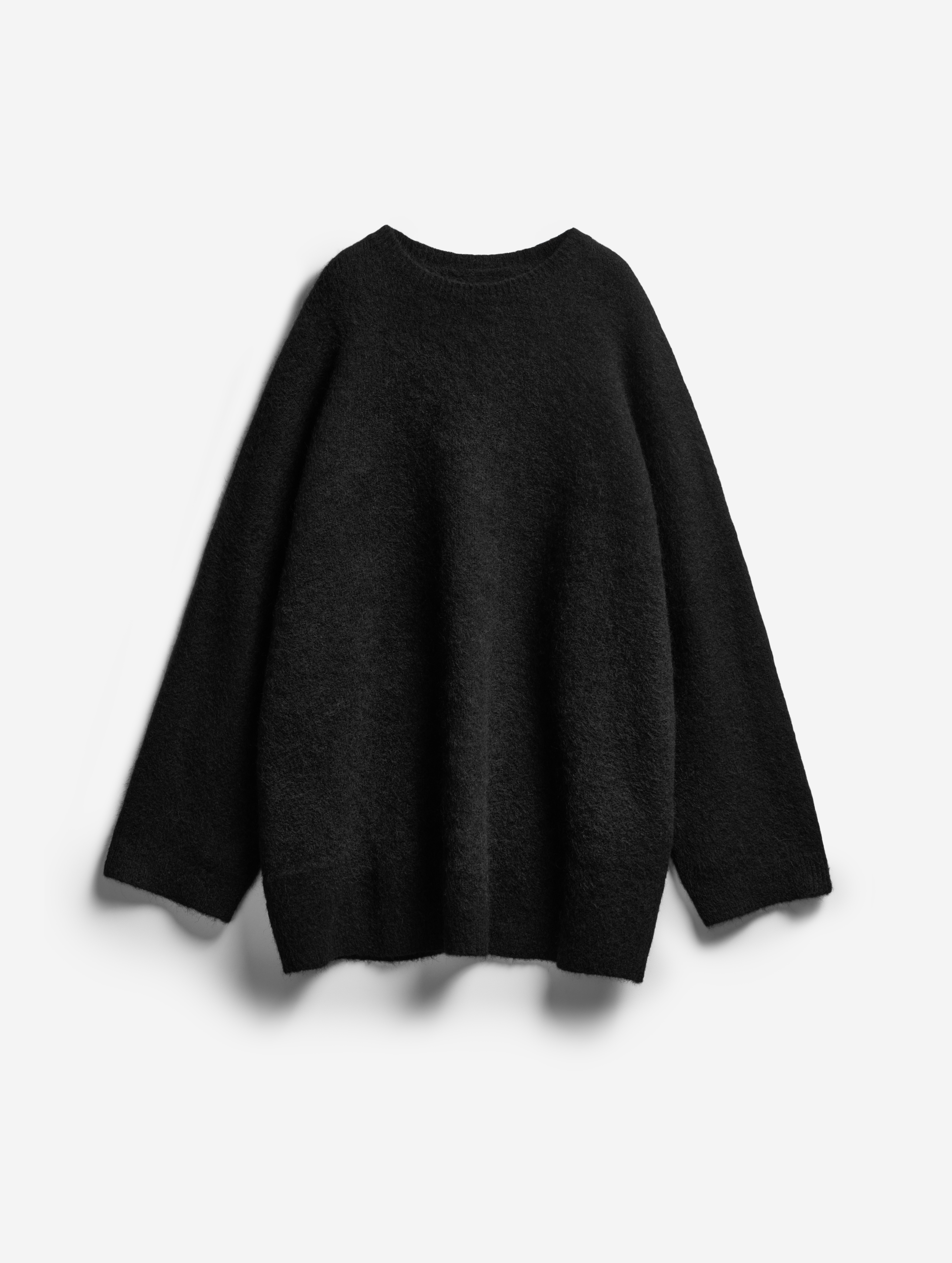 Облик этого изделия определяют гипертрофированные черты: вытянутые рукава и удлиненный оверсайз-силуэт (который позволяет носить свитер в том числе как платье). Внутри рукавов есть штрипки из резинки, они помогают зафиксировать рукав в присборенном виде, уменьшив его длину. У изделия смешанный состав: шерсть альпаки отвечает за сохранение тепла, а волокна нейлона делают полотно формоустойчивым и долговечным. Несмотря на объем, изделие получилось легким: после обработки специальными валиками вязаное полотно становится плотным и воздушным.