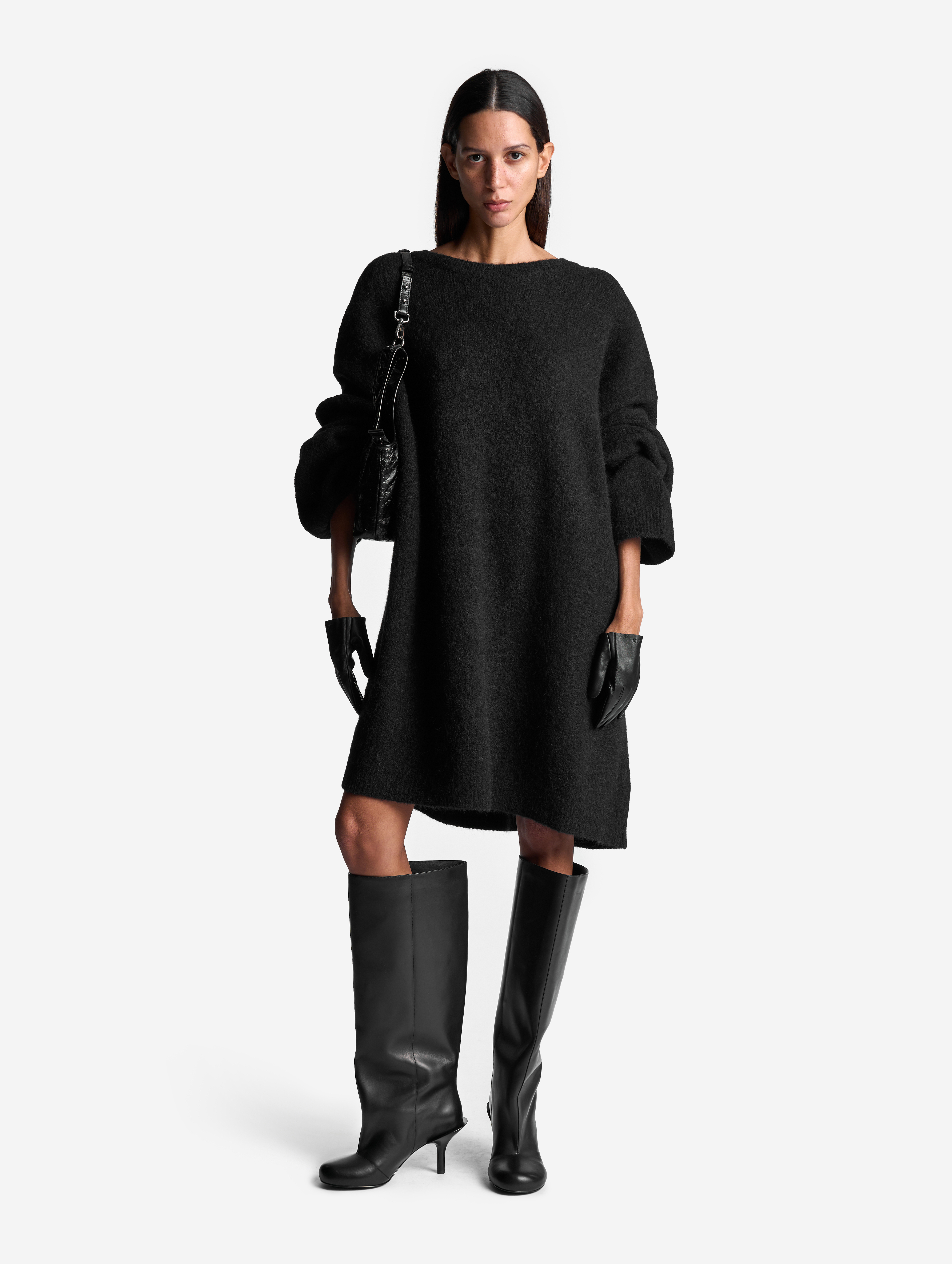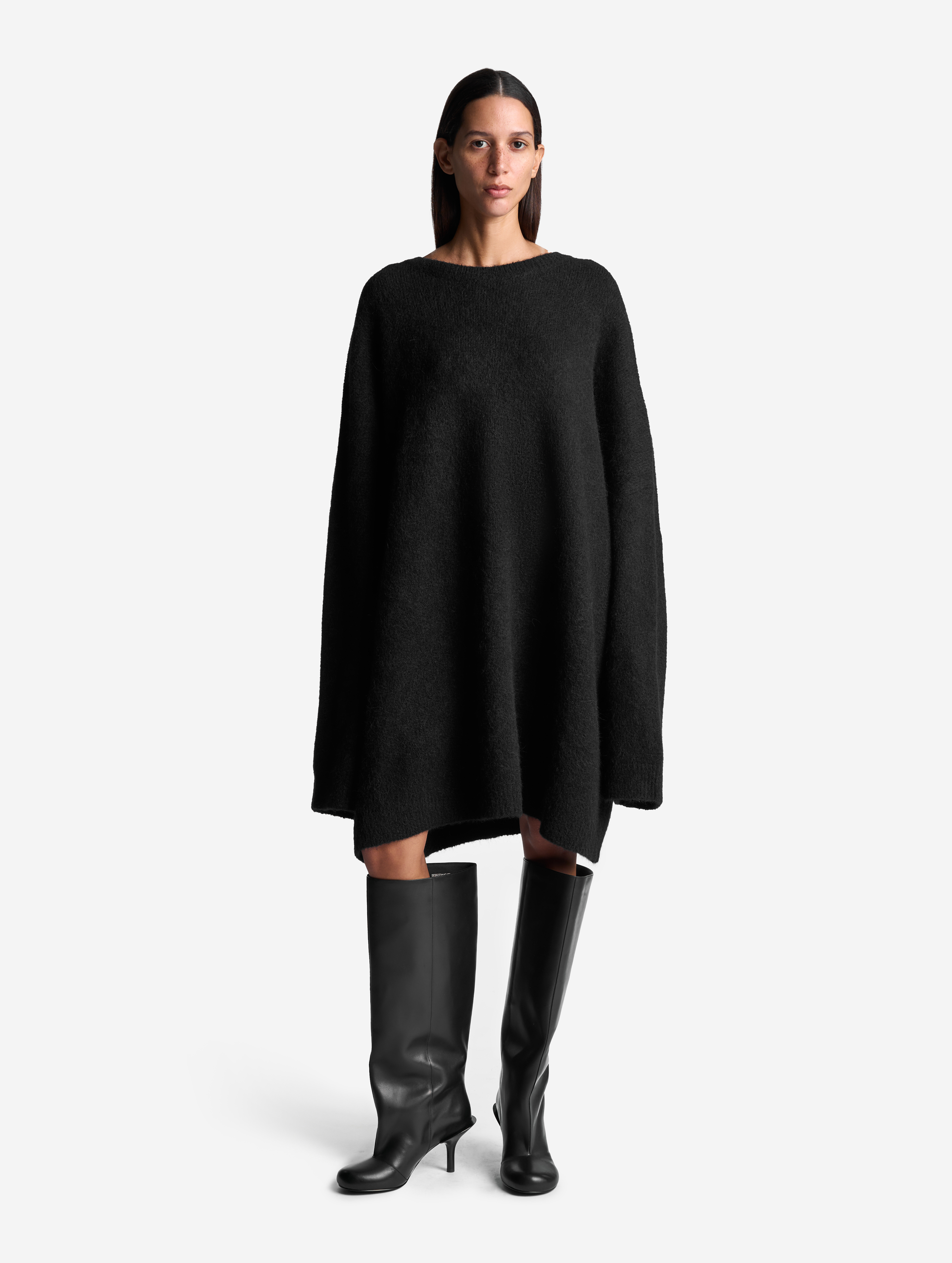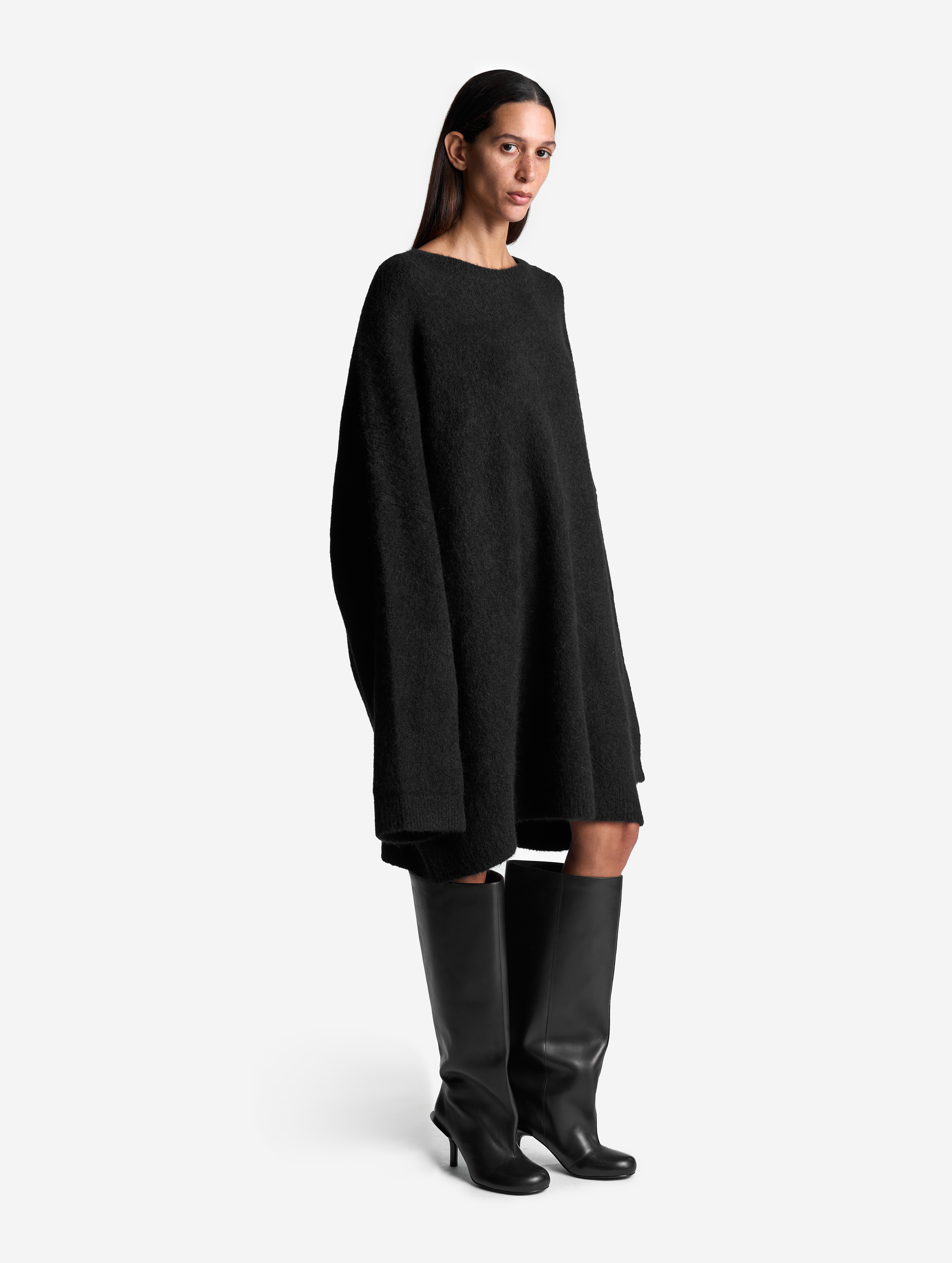 Облик этого изделия определяют гипертрофированные черты: вытянутые рукава и удлиненный оверсайз-силуэт (который позволяет носить свитер в том числе как платье). Внутри рукавов есть штрипки из резинки, они помогают зафиксировать рукав в присборенном виде, уменьшив его длину. У изделия смешанный состав: шерсть альпаки отвечает за сохранение тепла, а волокна нейлона делают полотно формоустойчивым и долговечным. Несмотря на объем, изделие получилось легким: после обработки специальными валиками вязаное полотно становится плотным и воздушным.