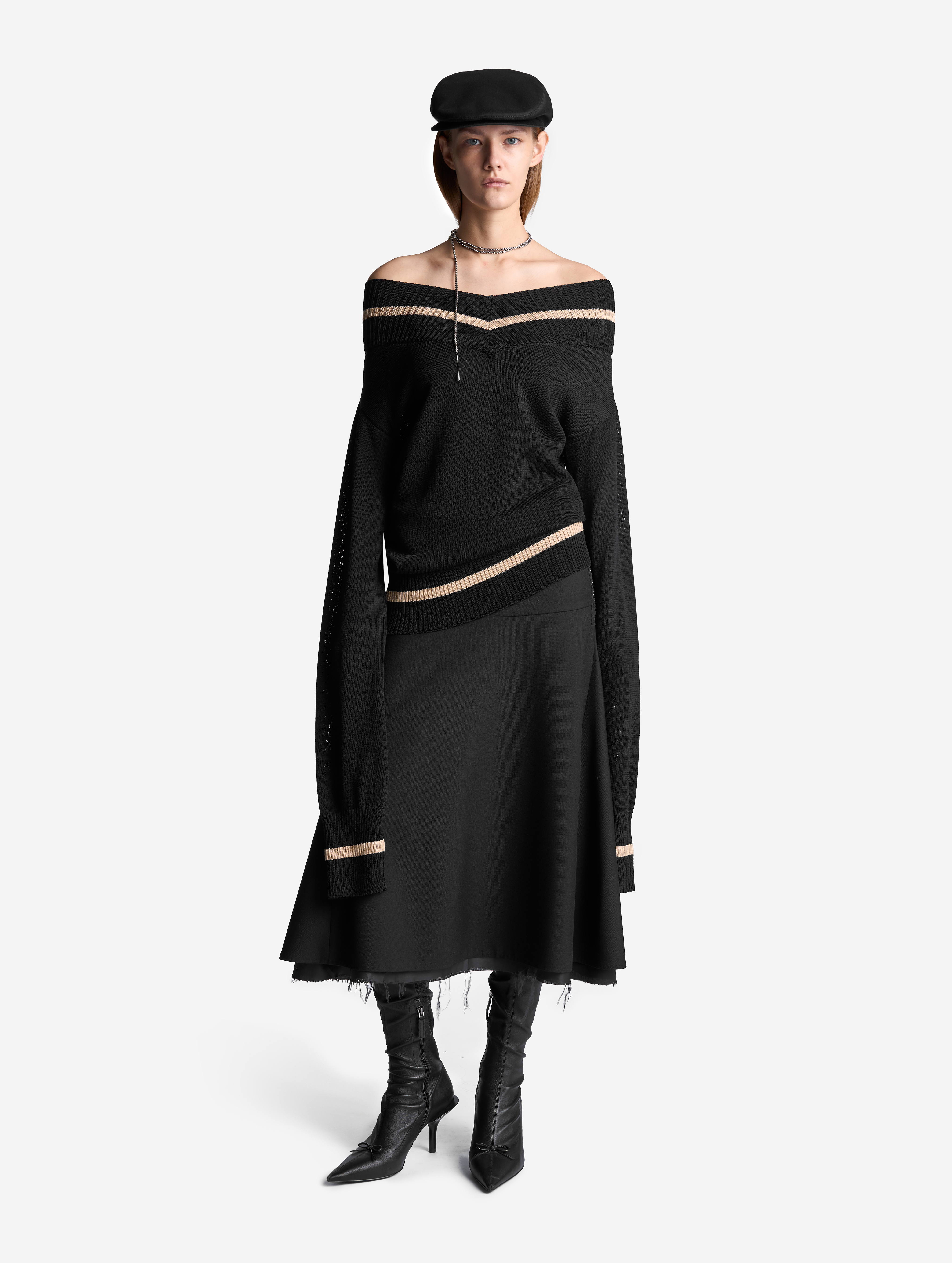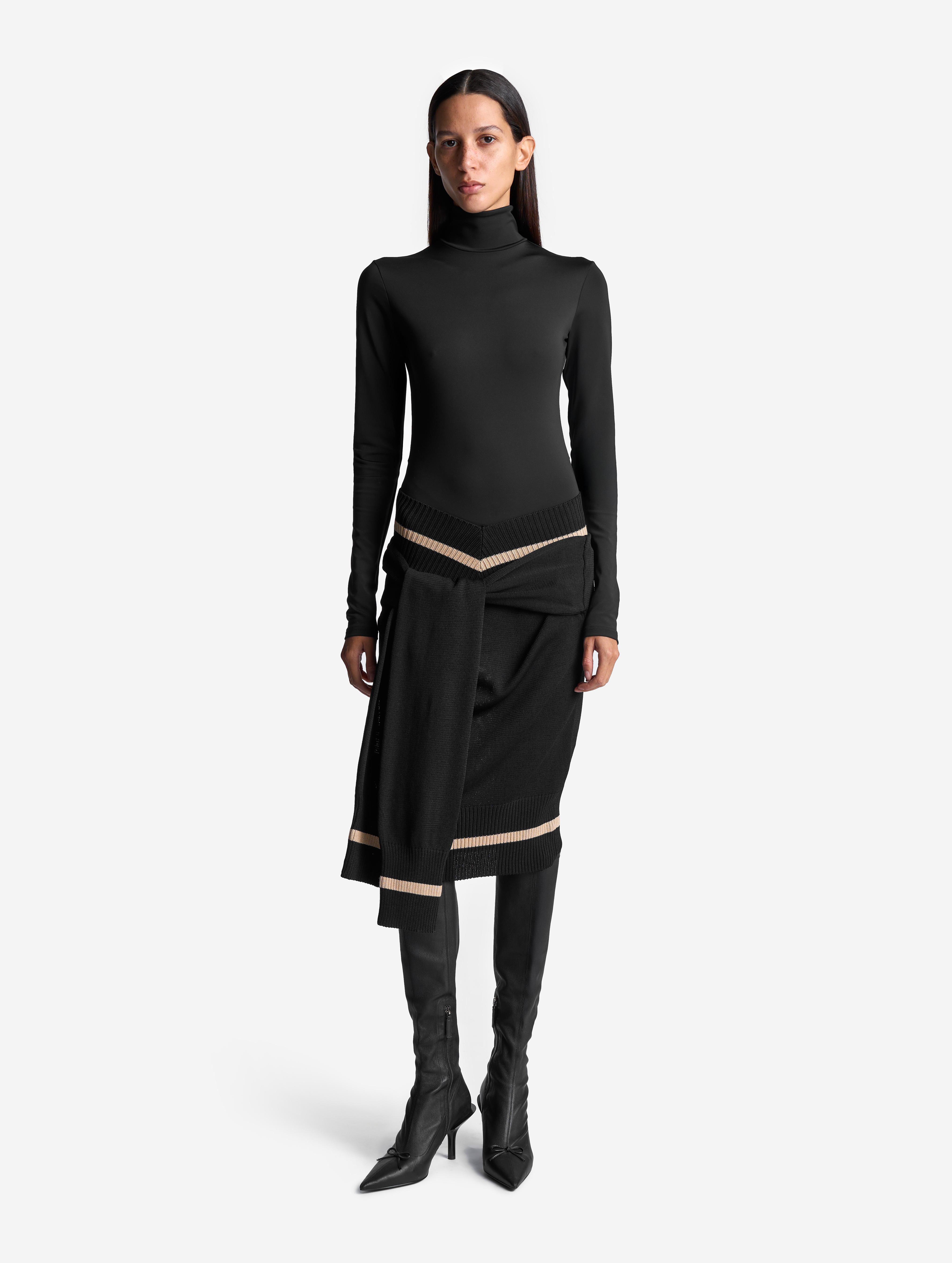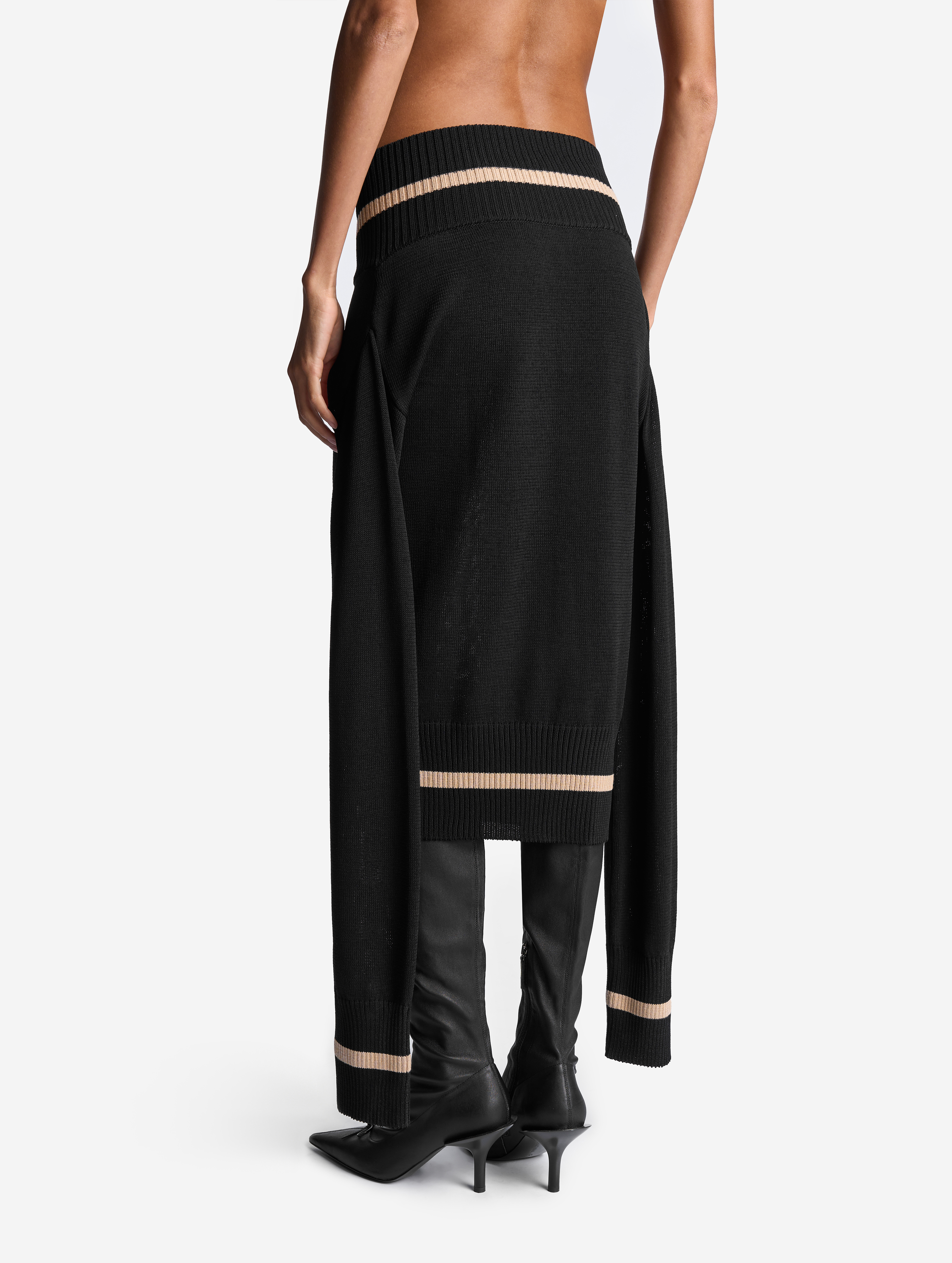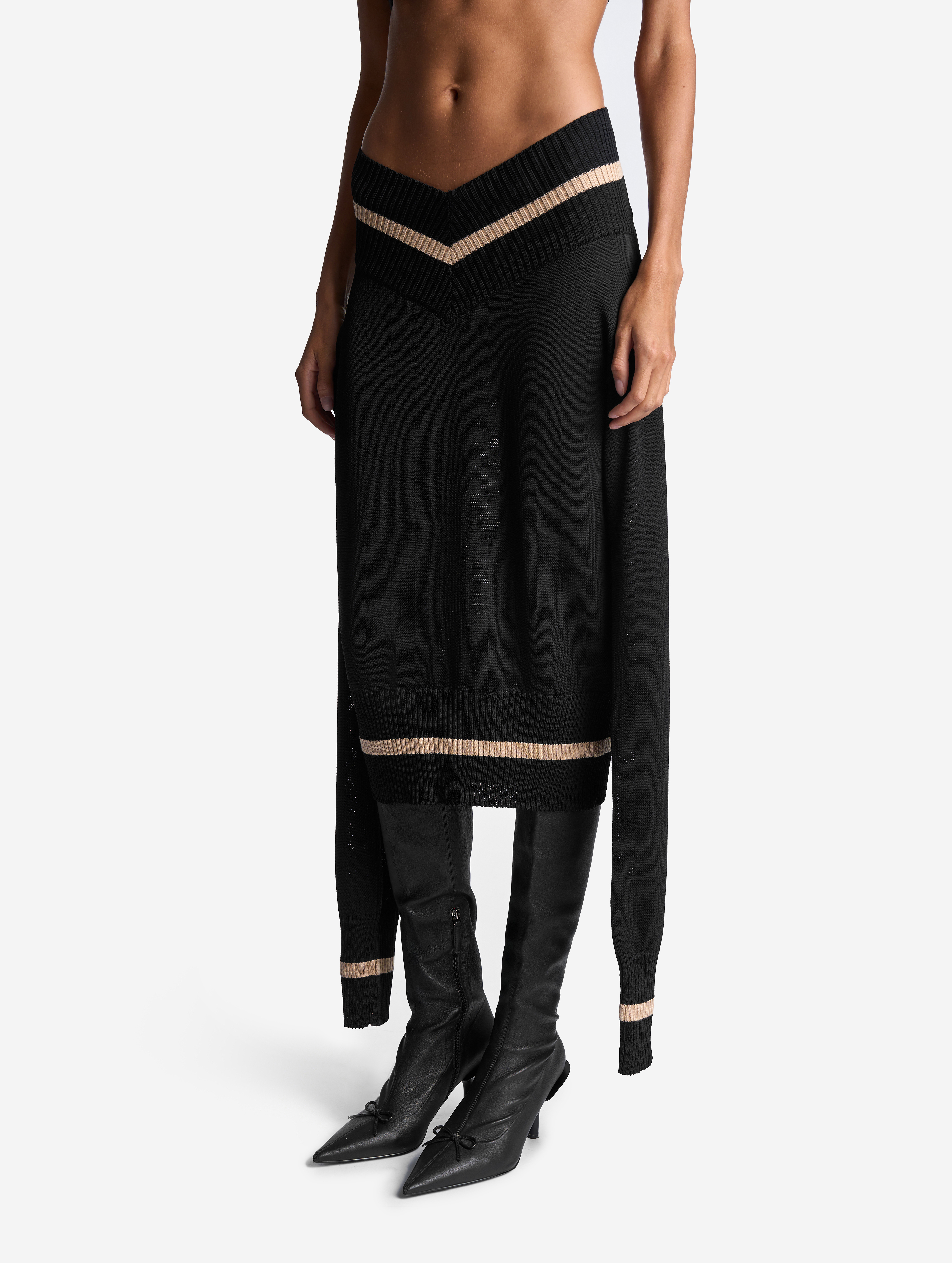 Это изделие мы задумывали как трансформер. С одной стороны, его можно носить как джемпер с V-образным вырезом, глубины которого хватает для того, чтобы обнажить плечи. Если спустить джемпер на бедра, получится прямая юбка с фигурным поясом. Освобожденные рукава можно оставить свободно свисать по бокам или завязать их на бедрах. Модель выполнена из эластичного вязаного трикотажа в рубчик. Это плотный и приятный для тела материал, который не будет пилинговаться и вытягиваться со временем.