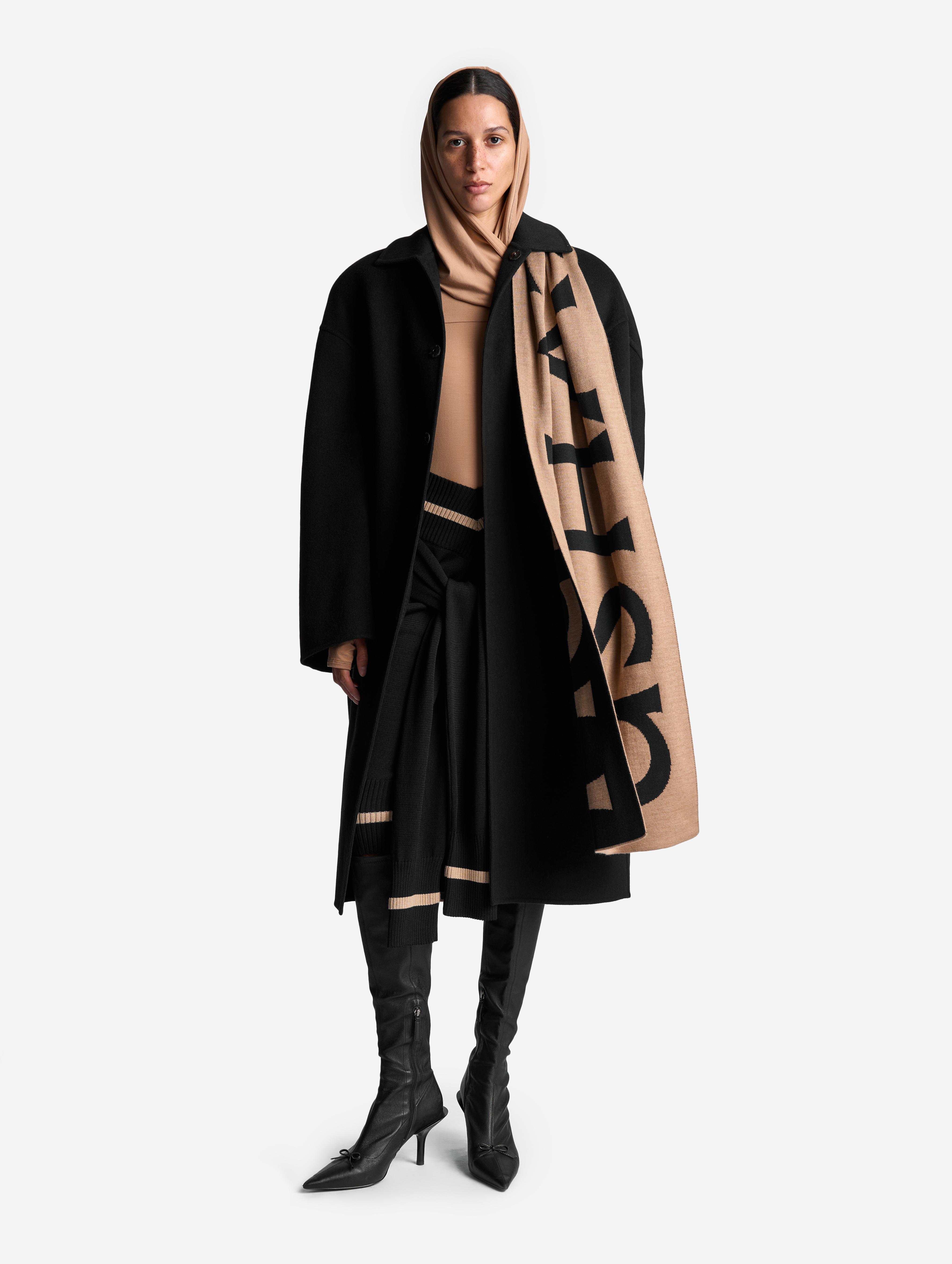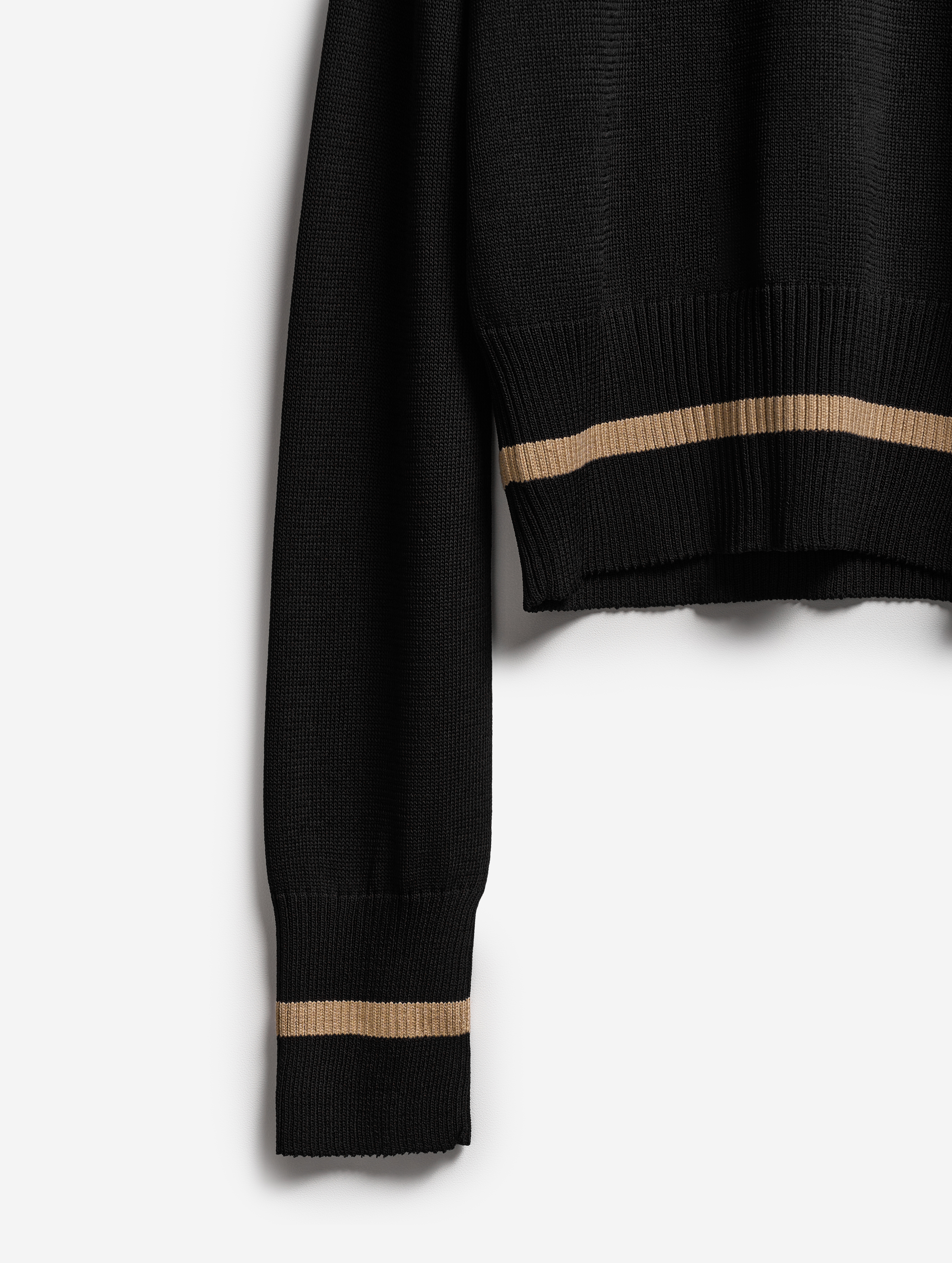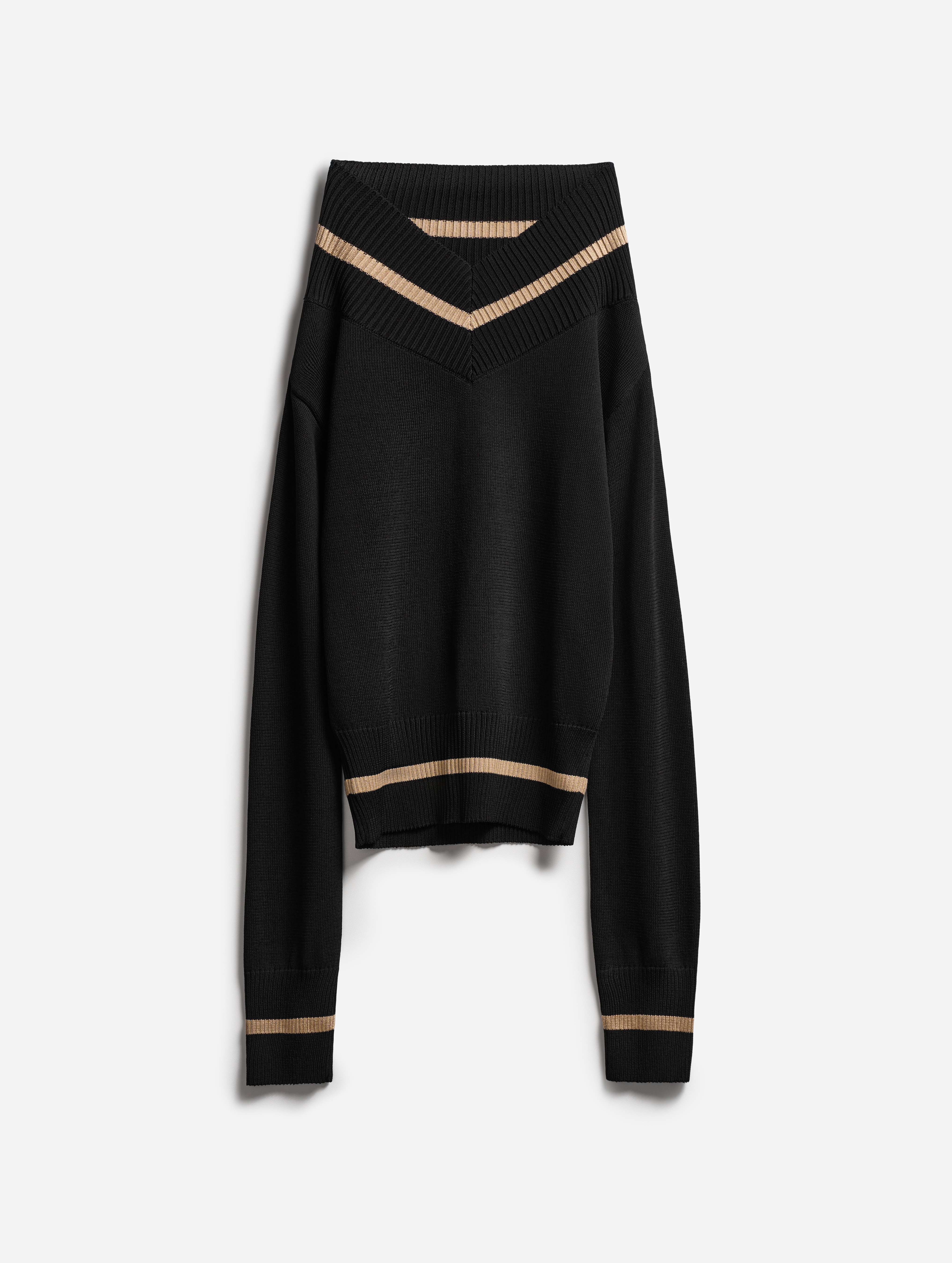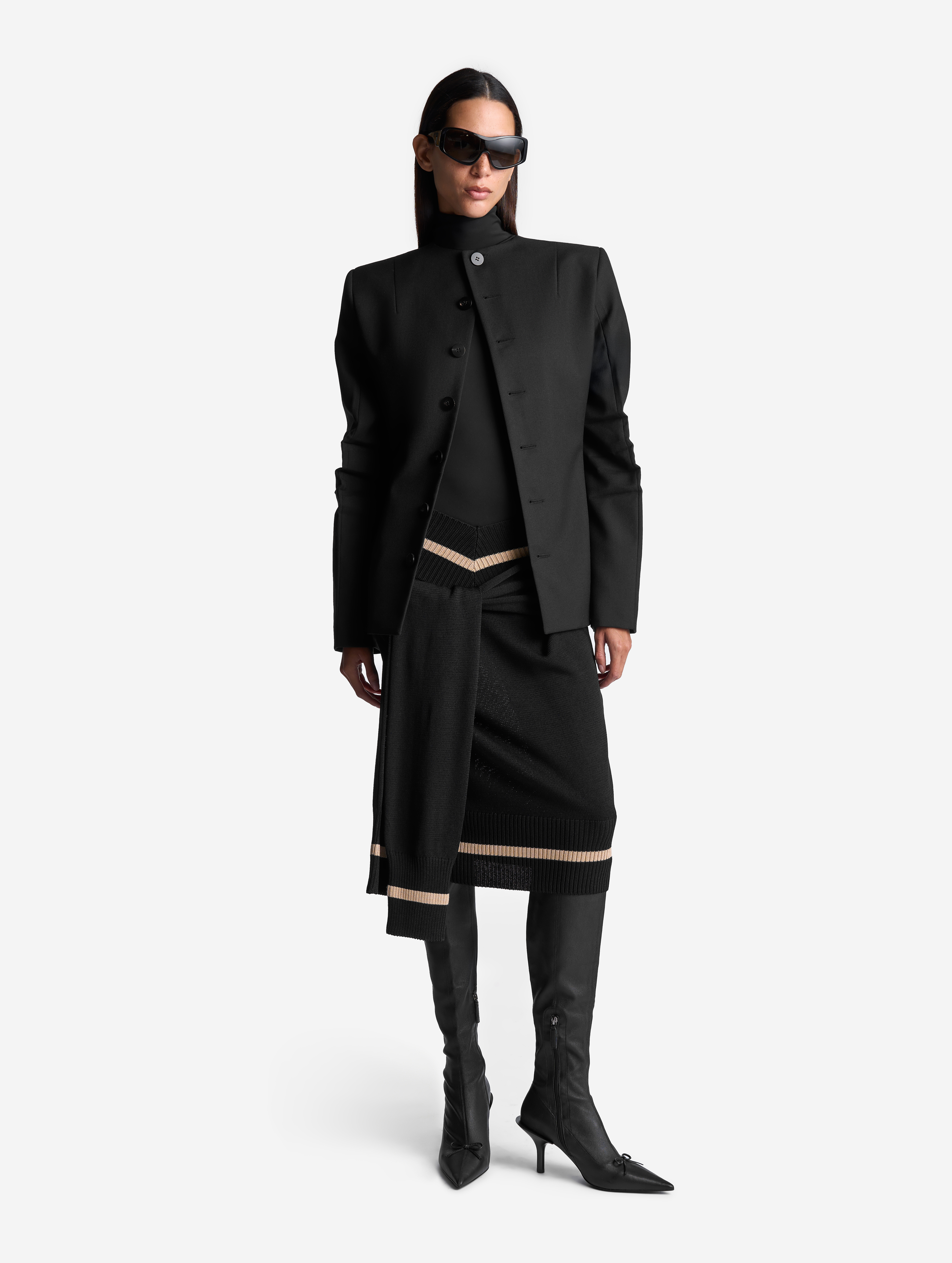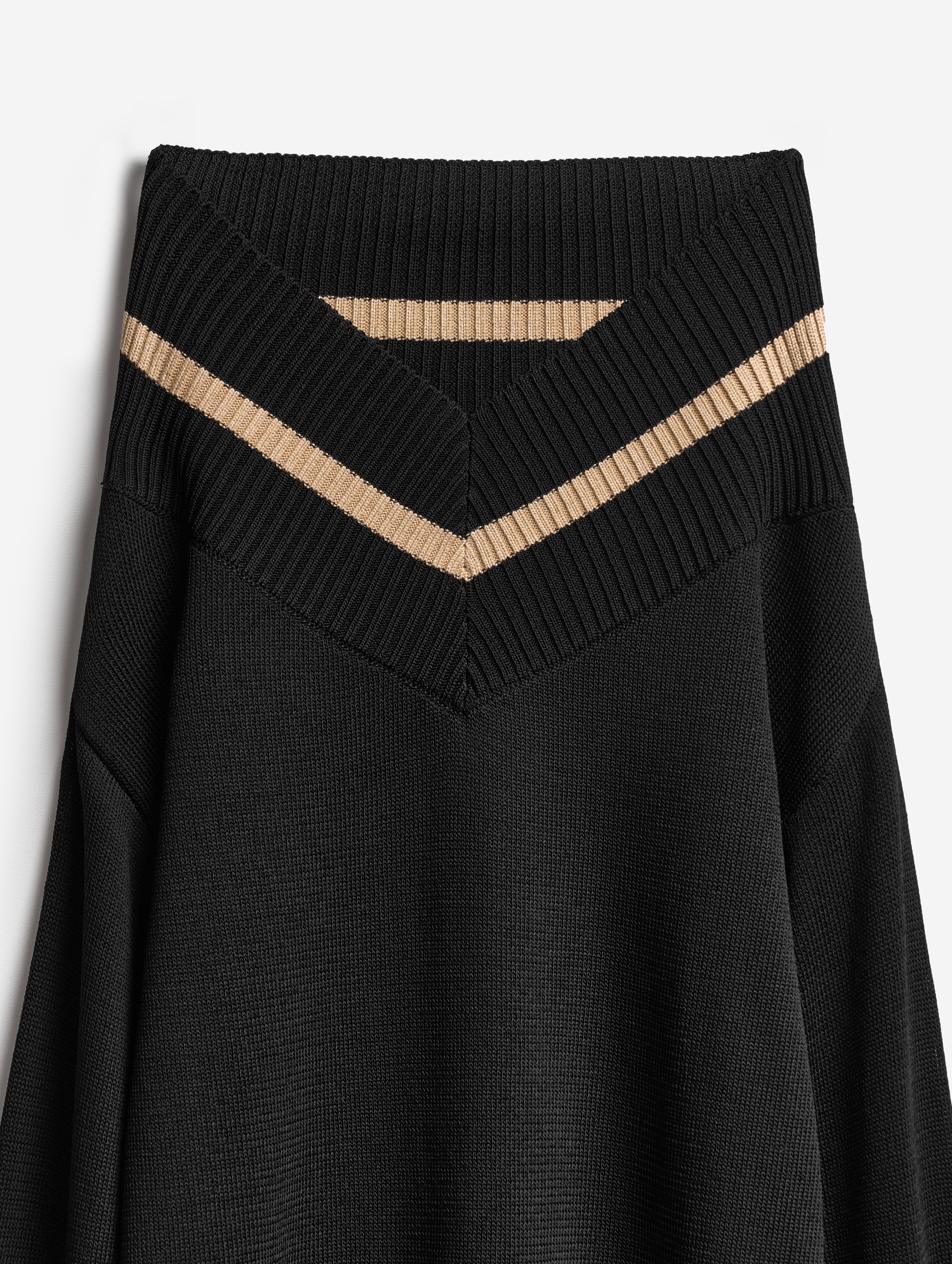 Это изделие мы задумывали как трансформер. С одной стороны, его можно носить как джемпер с V-образным вырезом, глубины которого хватает для того, чтобы обнажить плечи. Если спустить джемпер на бедра, получится прямая юбка с фигурным поясом. Освобожденные рукава можно оставить свободно свисать по бокам или завязать их на бедрах. Модель выполнена из эластичного вязаного трикотажа в рубчик. Это плотный и приятный для тела материал, который не будет пилинговаться и вытягиваться со временем.