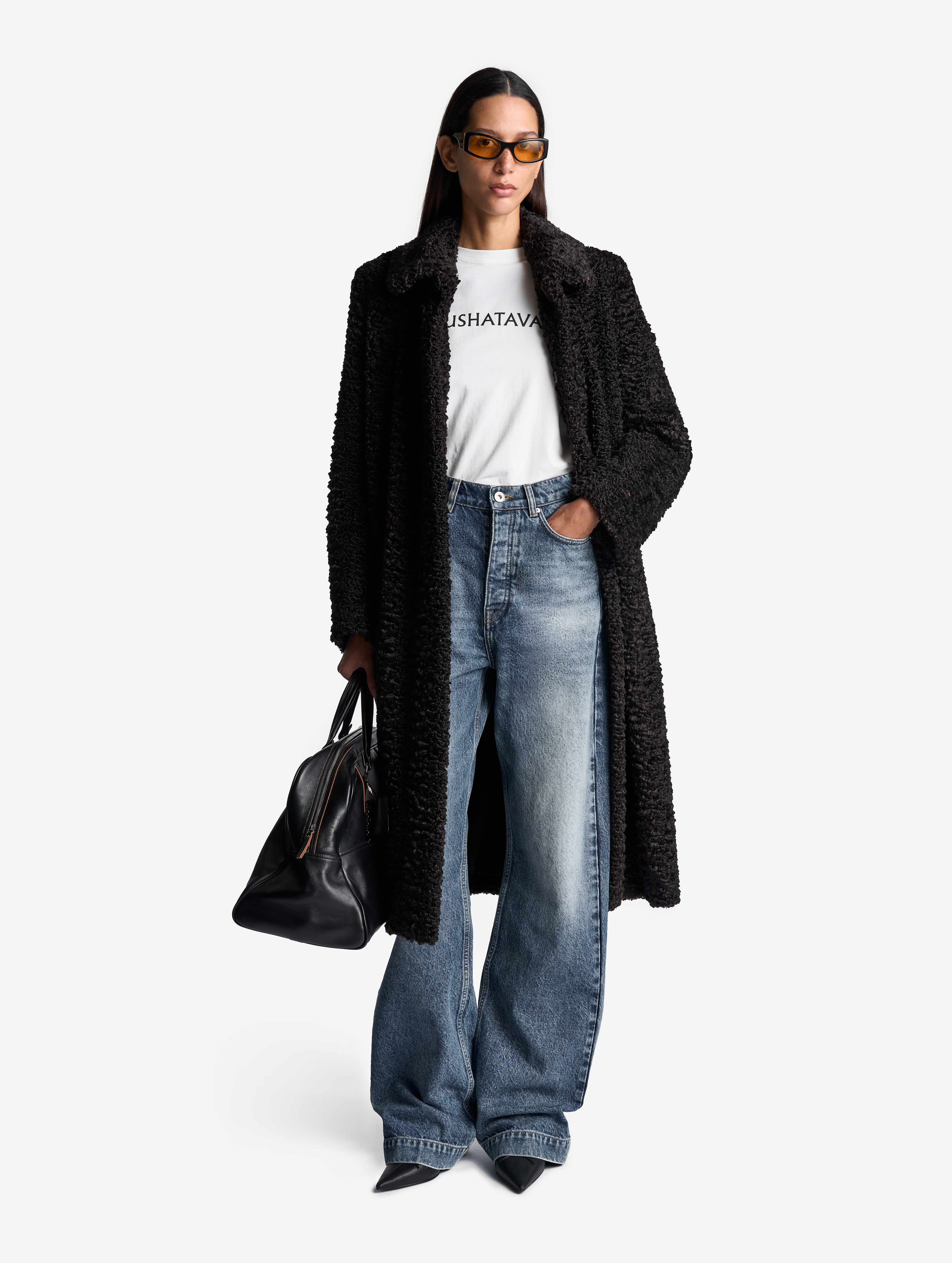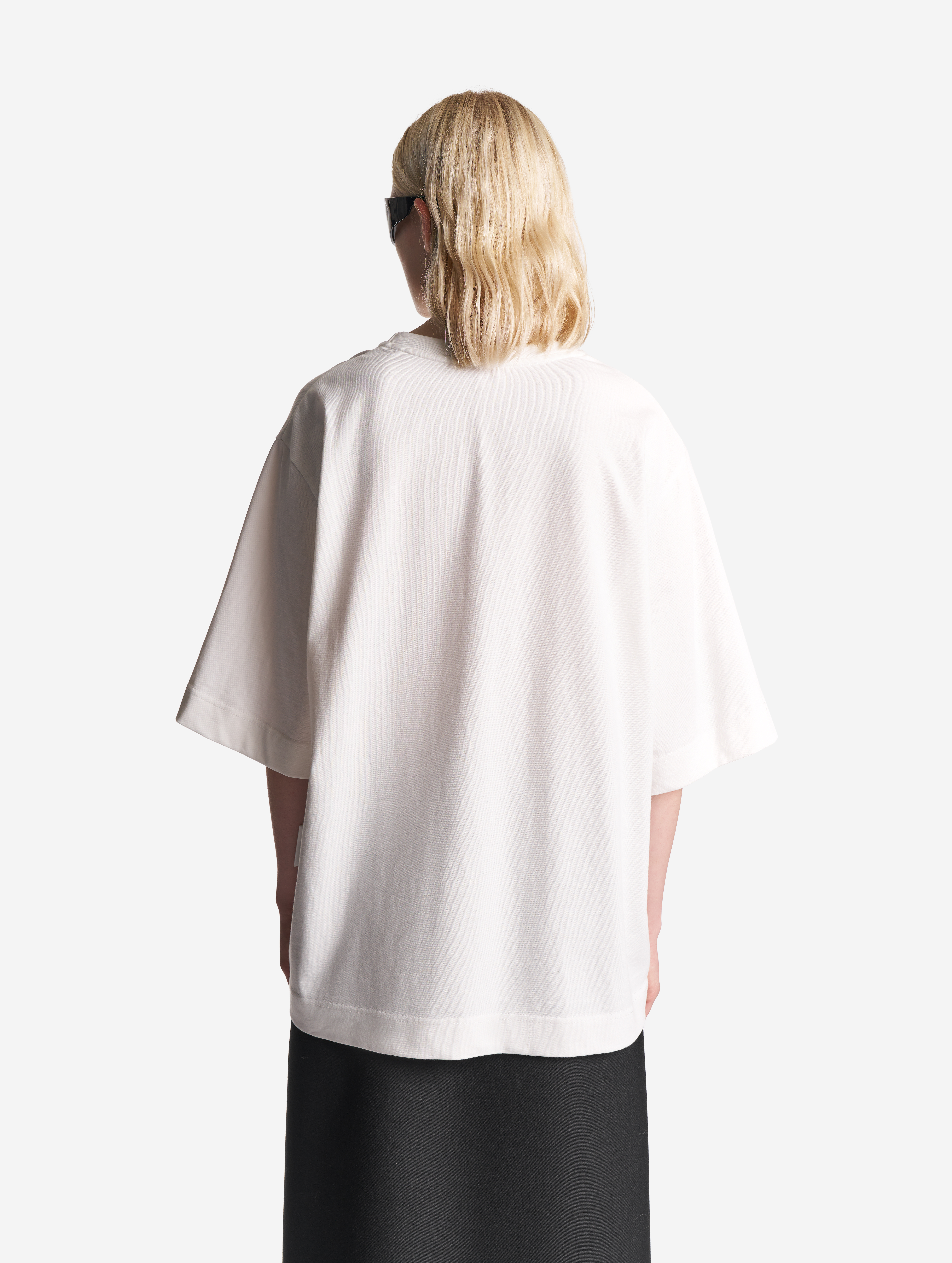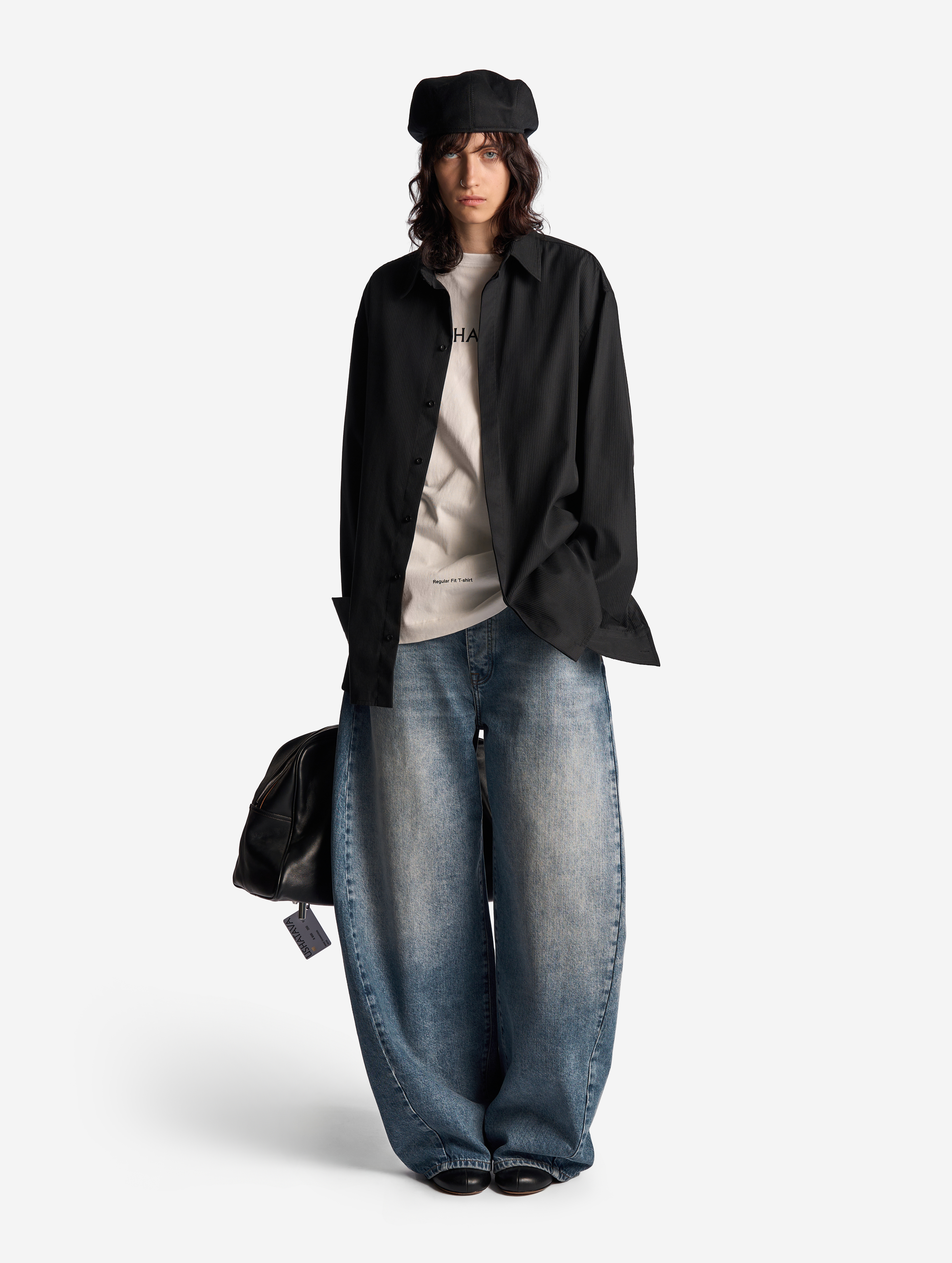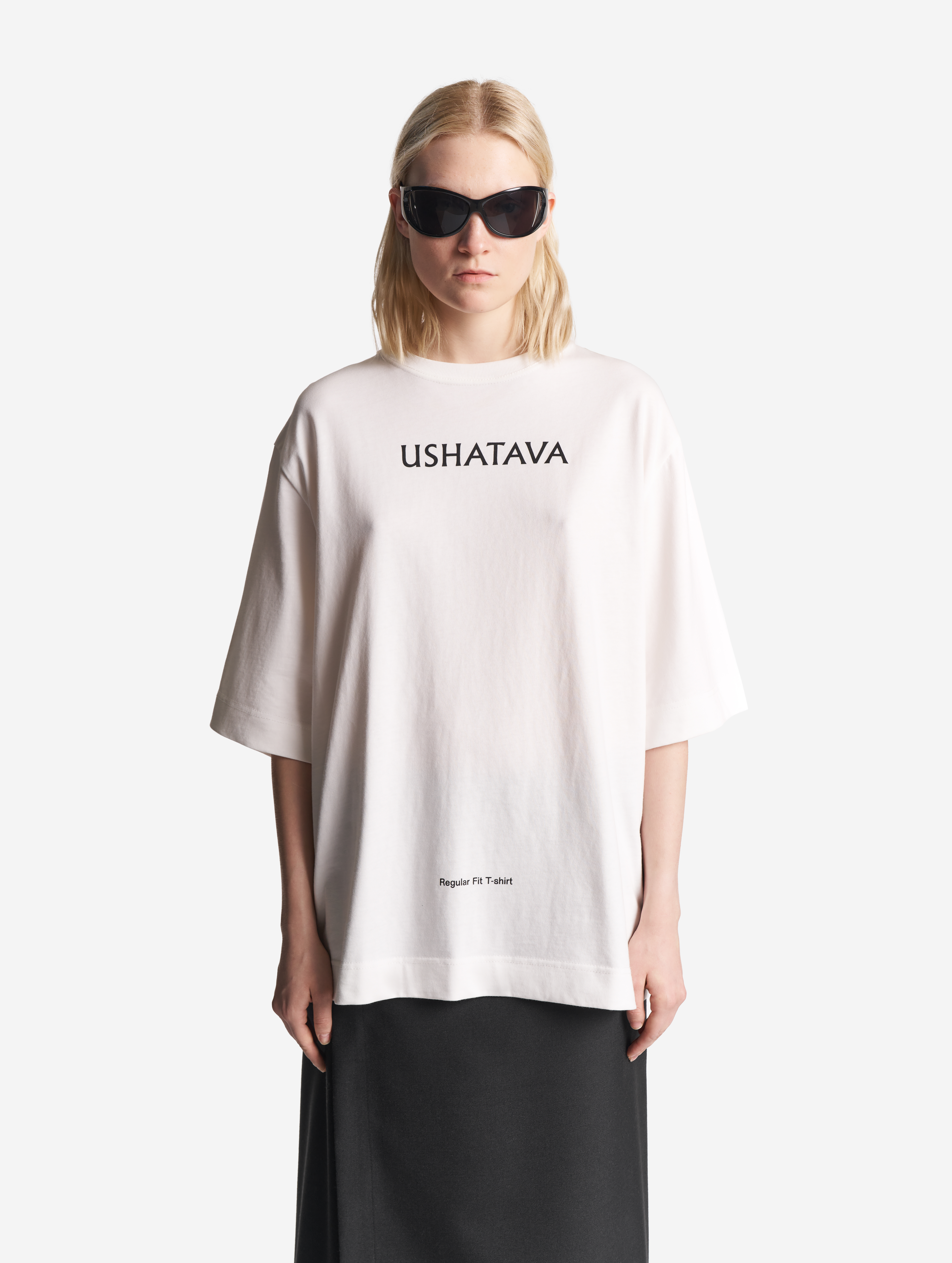 Как утверждает принт на поверхности изделия, Regular Fit T-shirt — это футболка умеренной посадки, один из ключевых силуэтов линии Garderobe. Местоположение принта выбрано с точным расчетом, что надпись останется видна из-под верхней одежды. Наименование вещи будет выступать за нижний край худи или пуловера. Еще один принт — с названием модного Дома — расположен на груди. У модели вытянутый силуэт и рукав средней длины. Футболка выполнена из плотного формоустойчивого трикотажа.