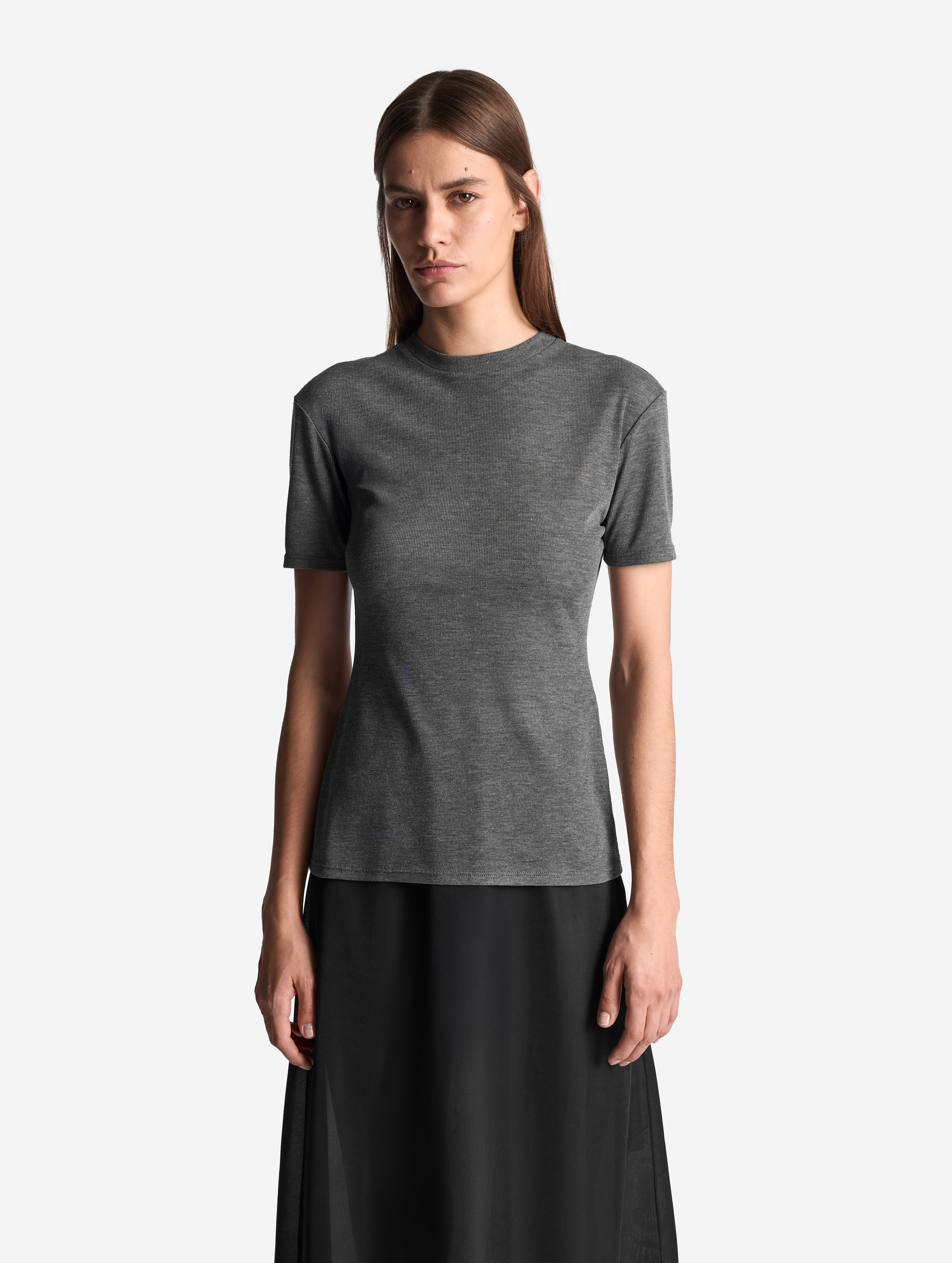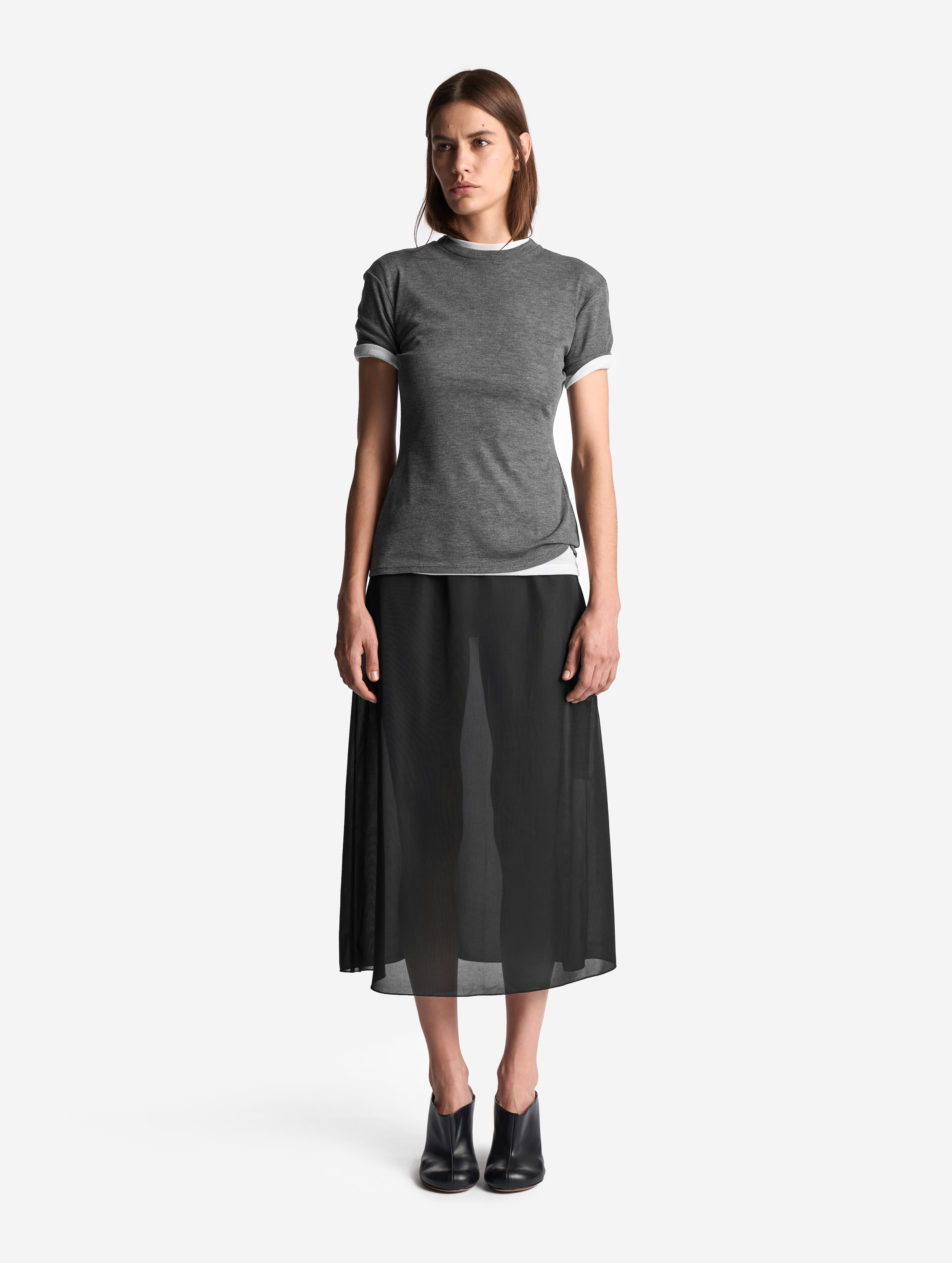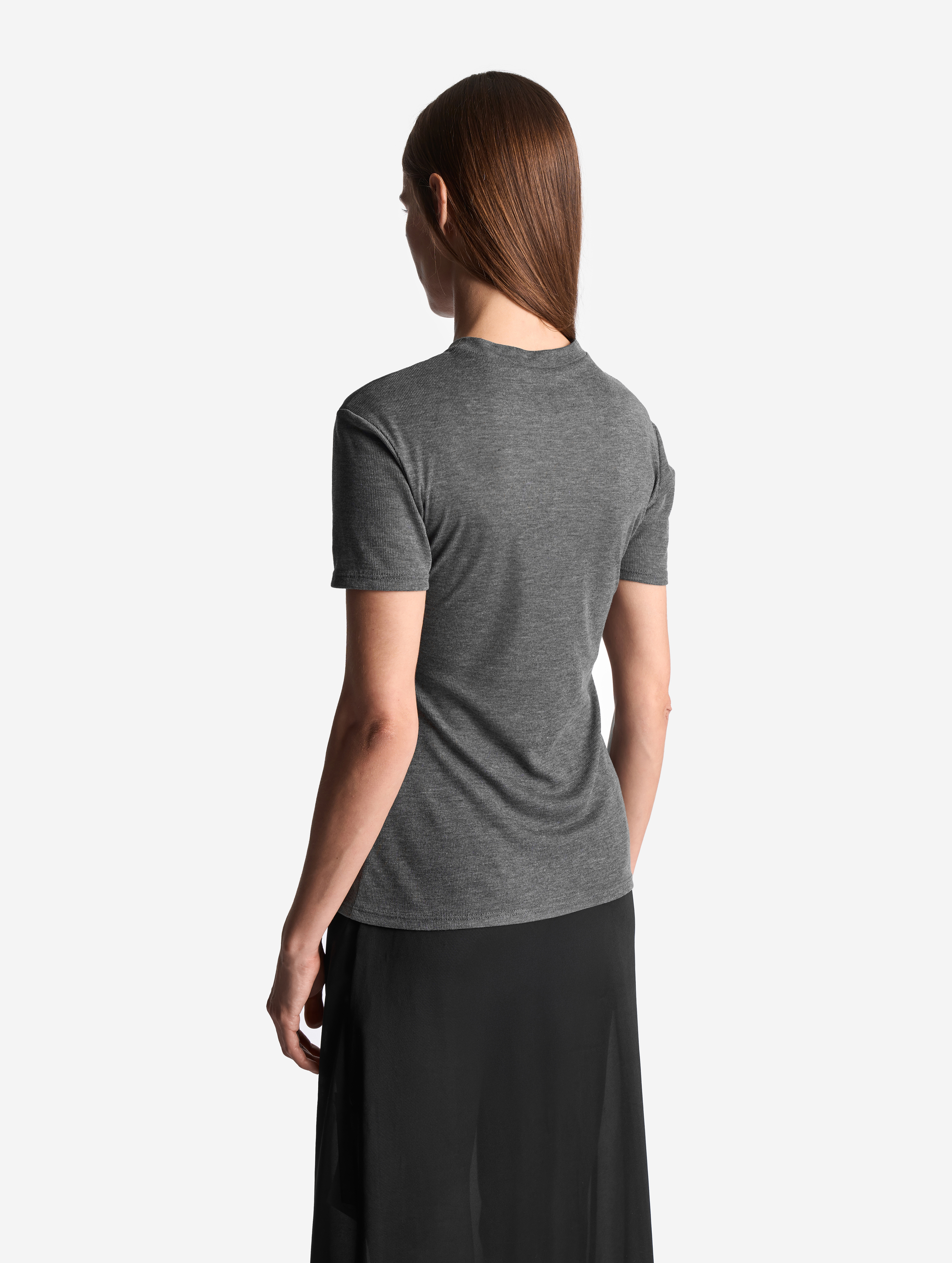 Футболка выполнена из тонкого полупрозрачного трикотажа. У нее вытянутый полуприлегающий силуэт, длина рукава не доходит до сгиба локтя. Изделие отличается плотной узкой горловиной, которая не растянется со временем. Самодостаточная вещь, в то же время способная выполнять функцию второго слоя.