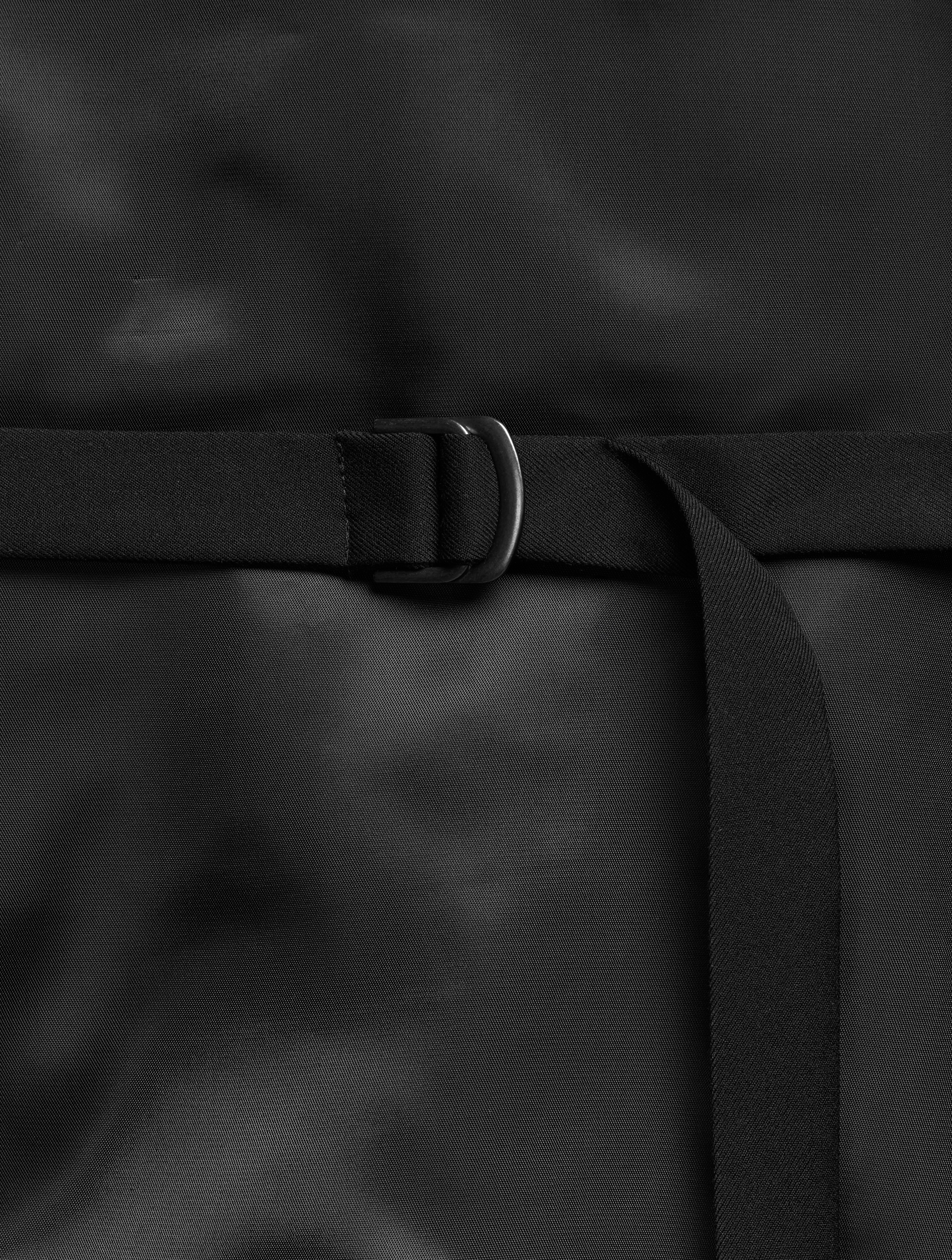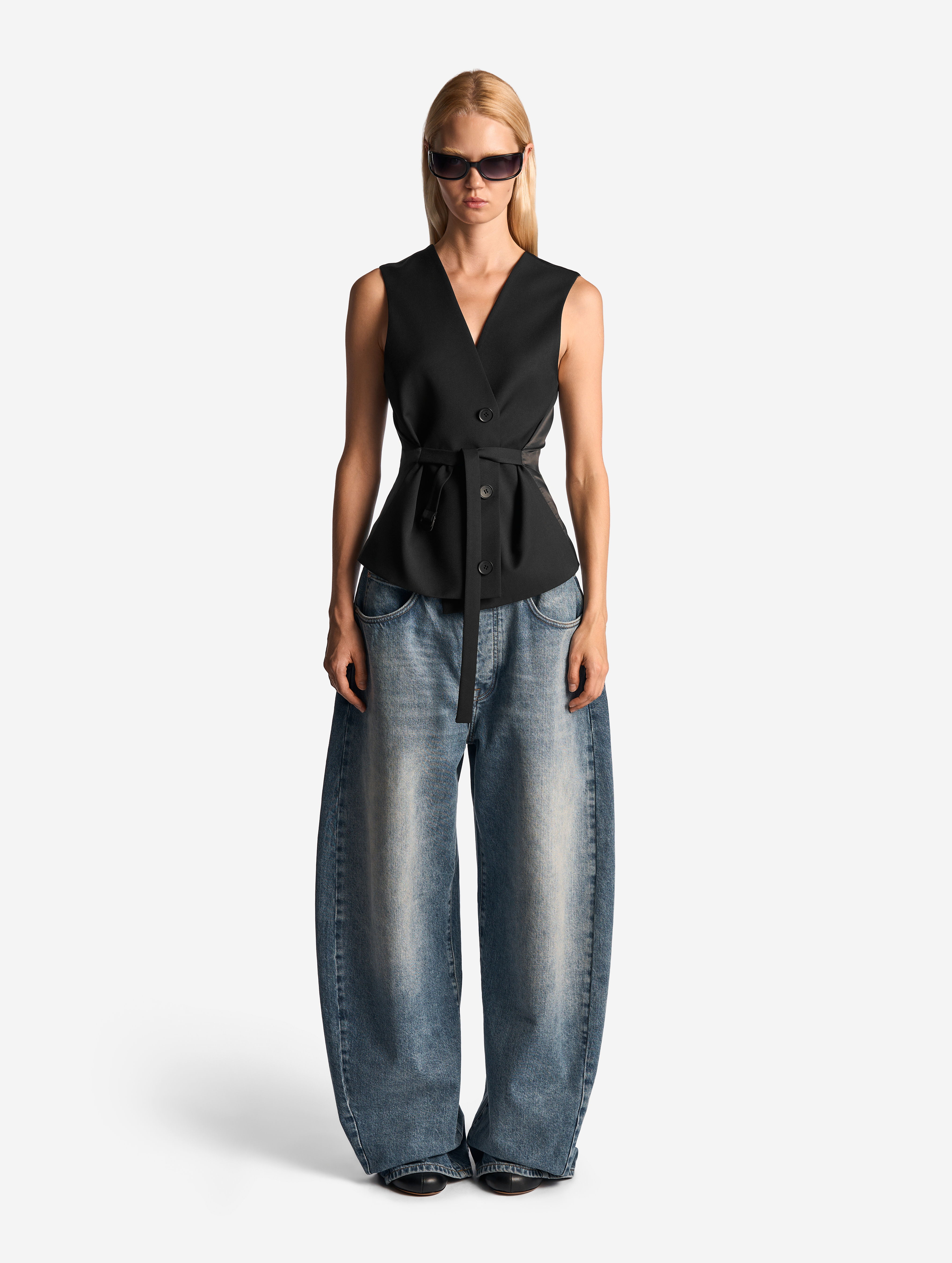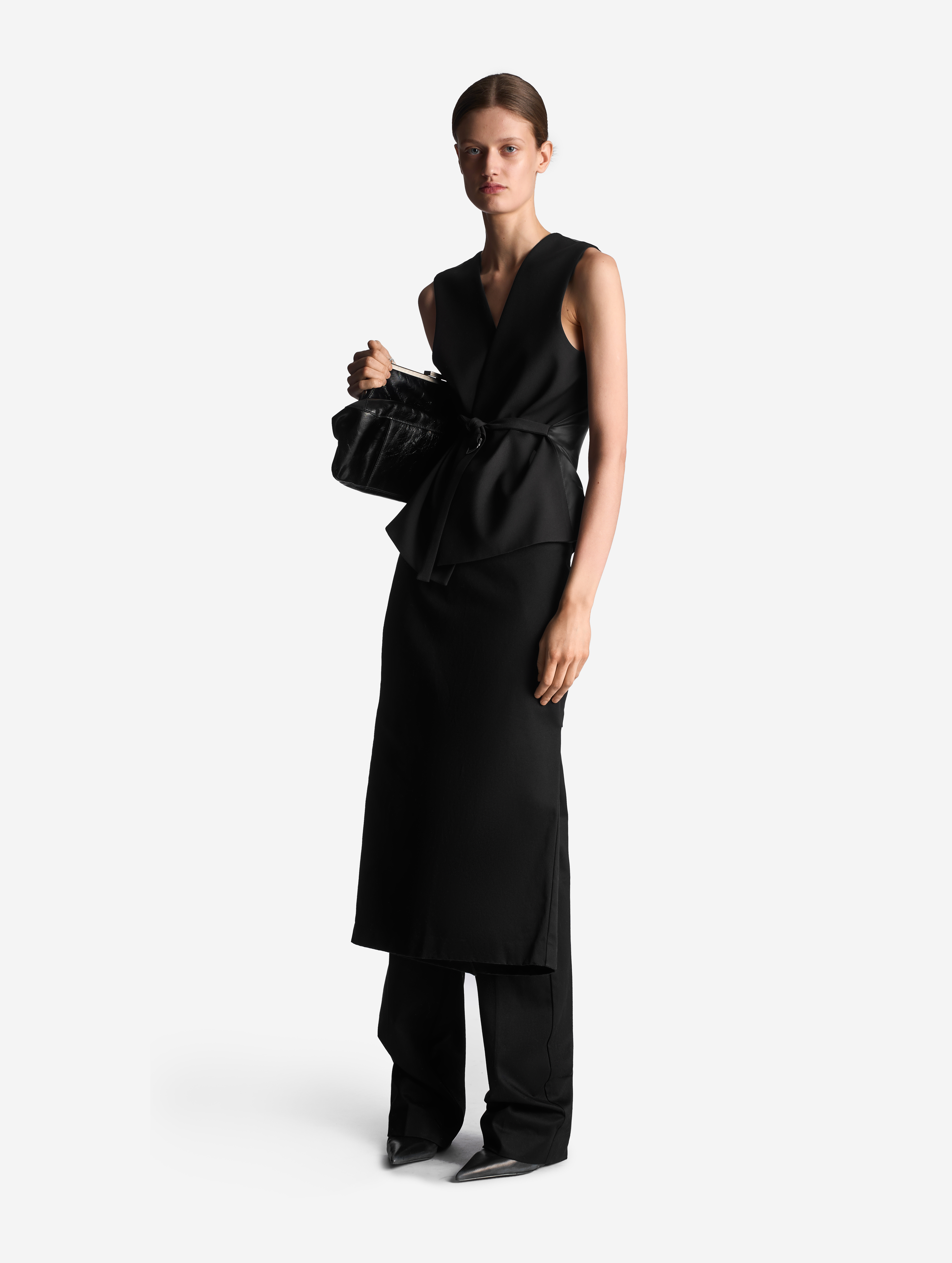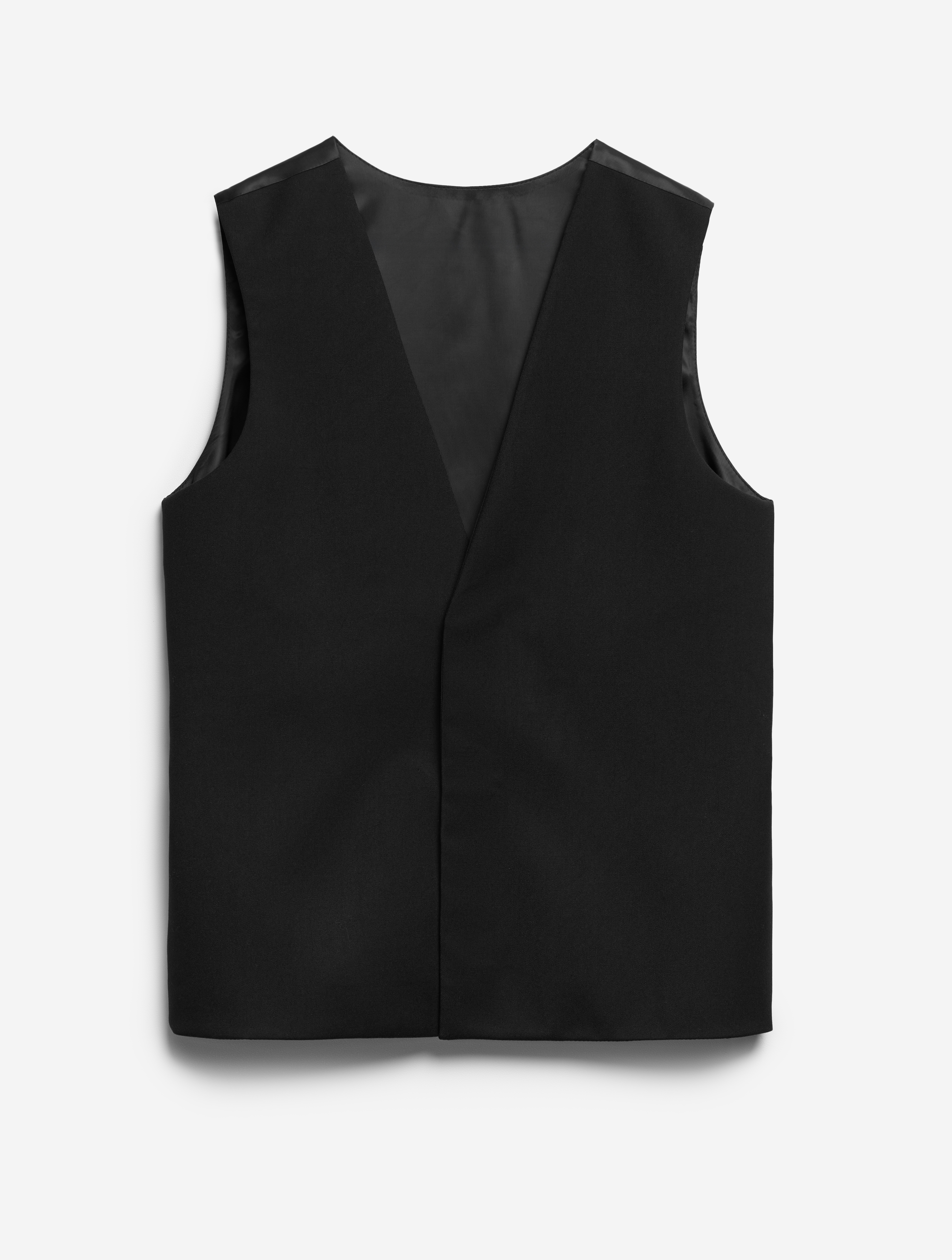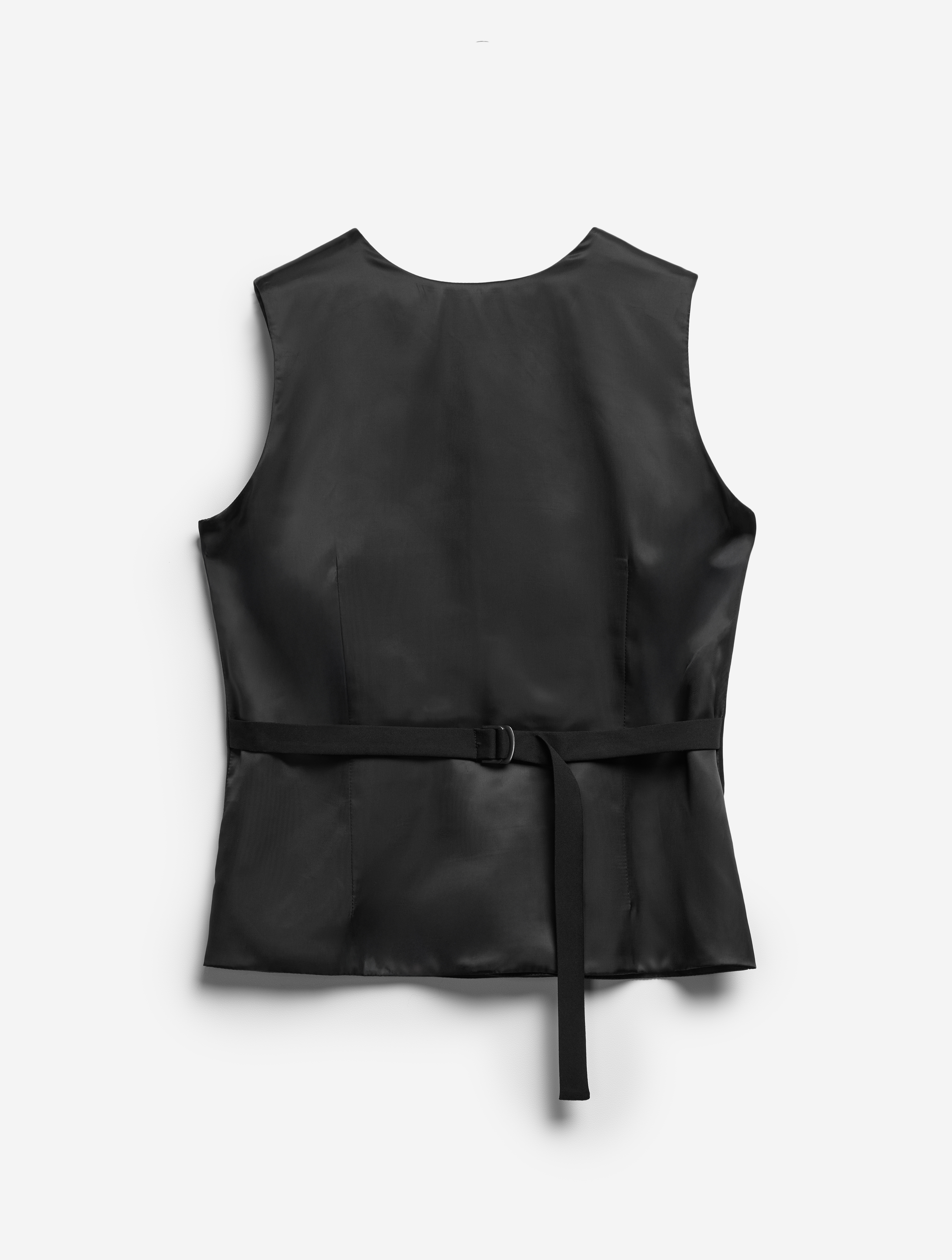 В работе над Garderobe FW25/26 мы задумались: каким может быть костюм-тройка Ushatava? Одна из его обязательных составляющих — костюмный жилет. Наша версия выполнена из материалов, характерных для традиционного прототипа: лицевая часть сшита из плотной костюмной ткани, а спинка — из подкладочной. Еще один элемент, отсылающий к классической одежде, — пояс-хлястик, который позволяет приталить силуэт при желании. В интерпретации модного Дома этот предмет гардероба можно носить по-разному: обычным способом или развернуть на 180°, поменяв перед и спинку местами.
