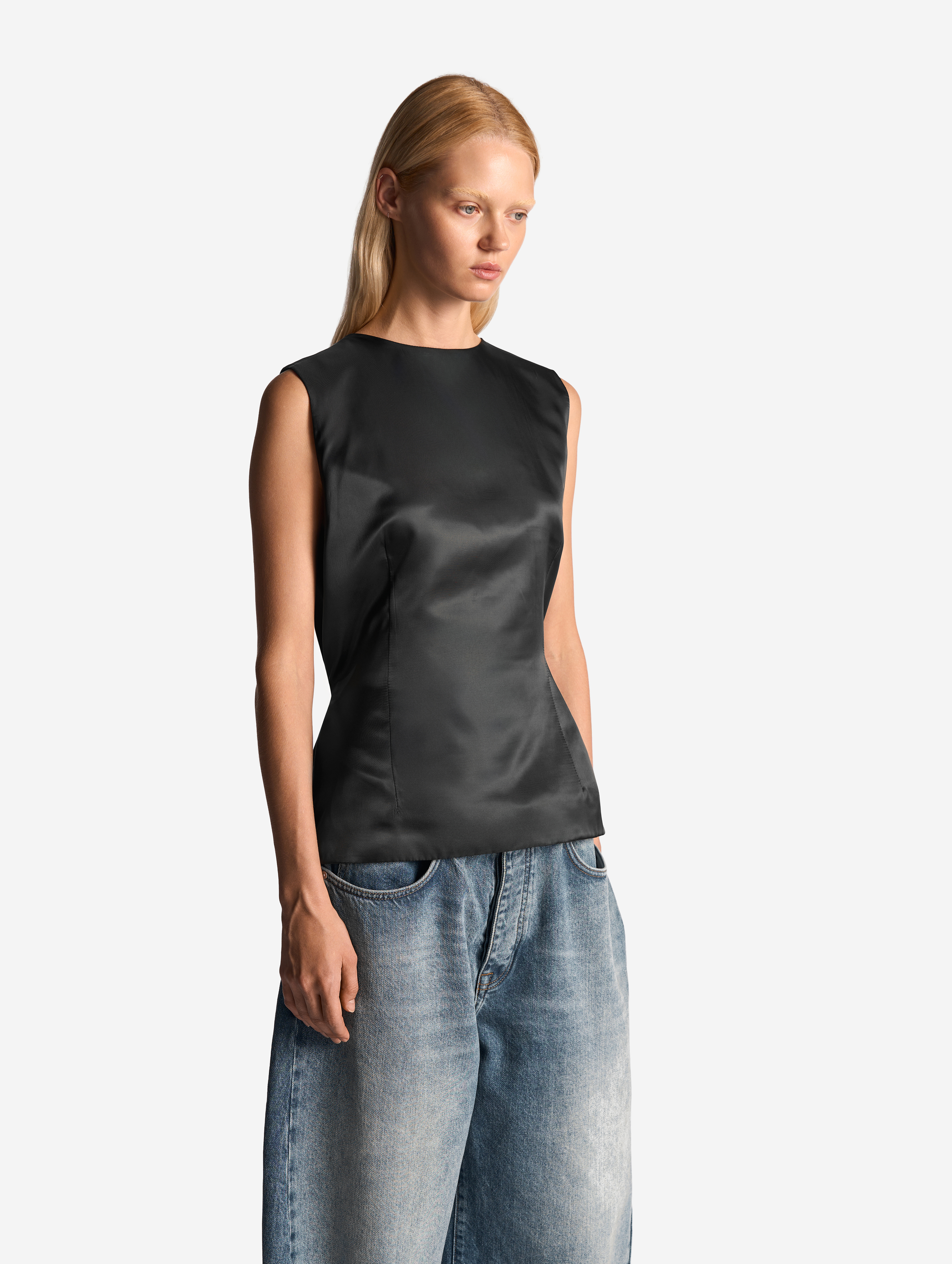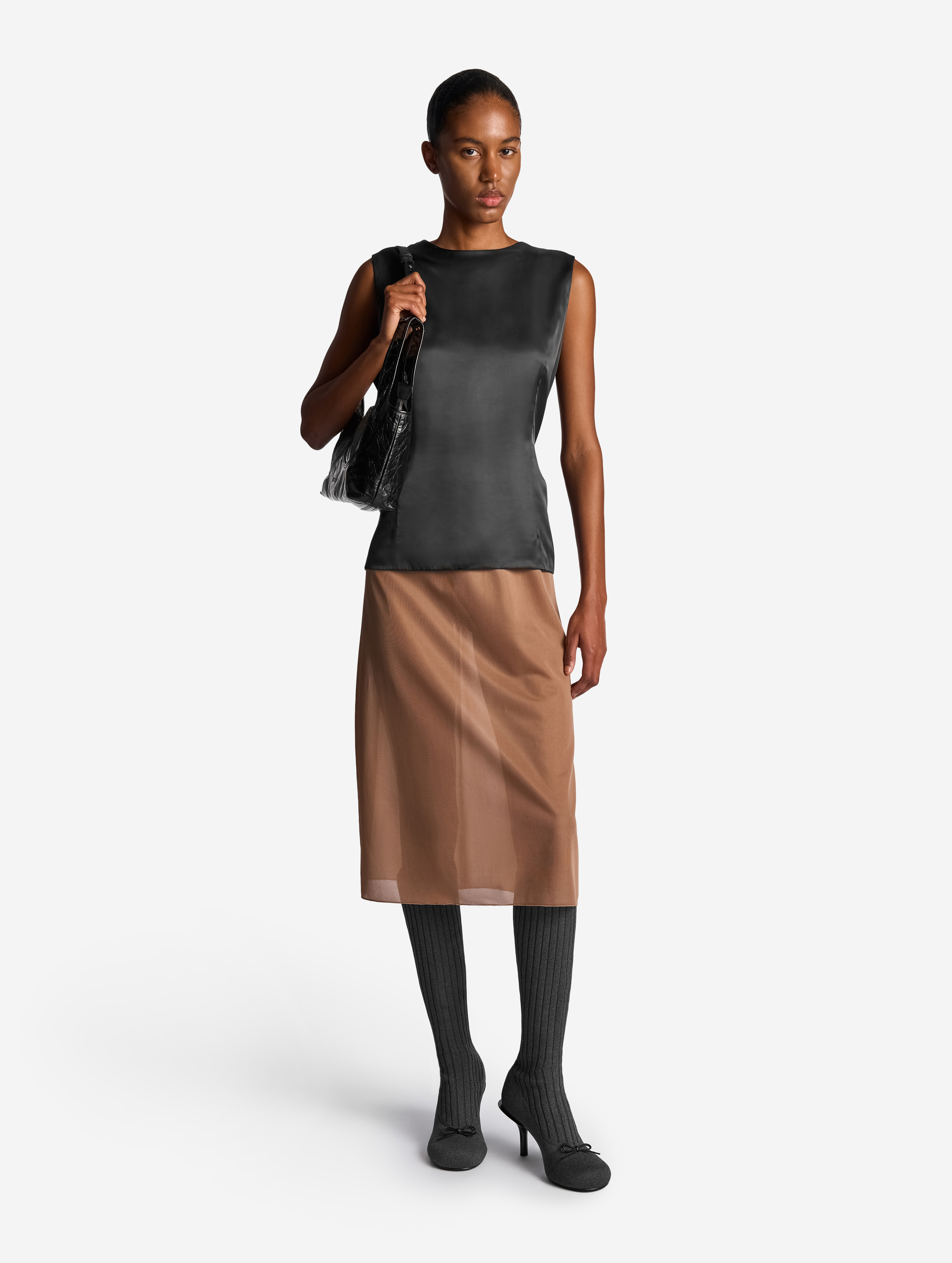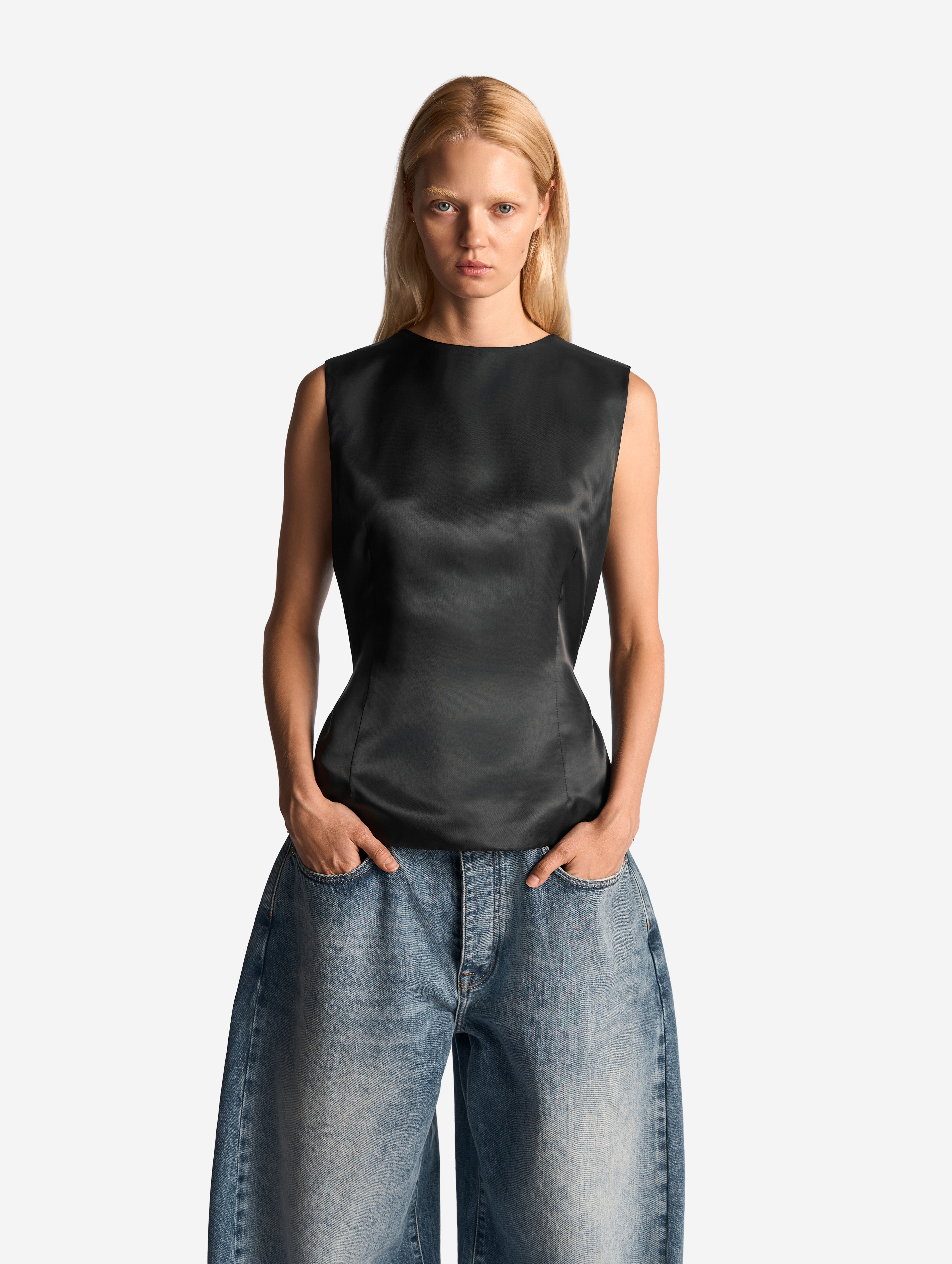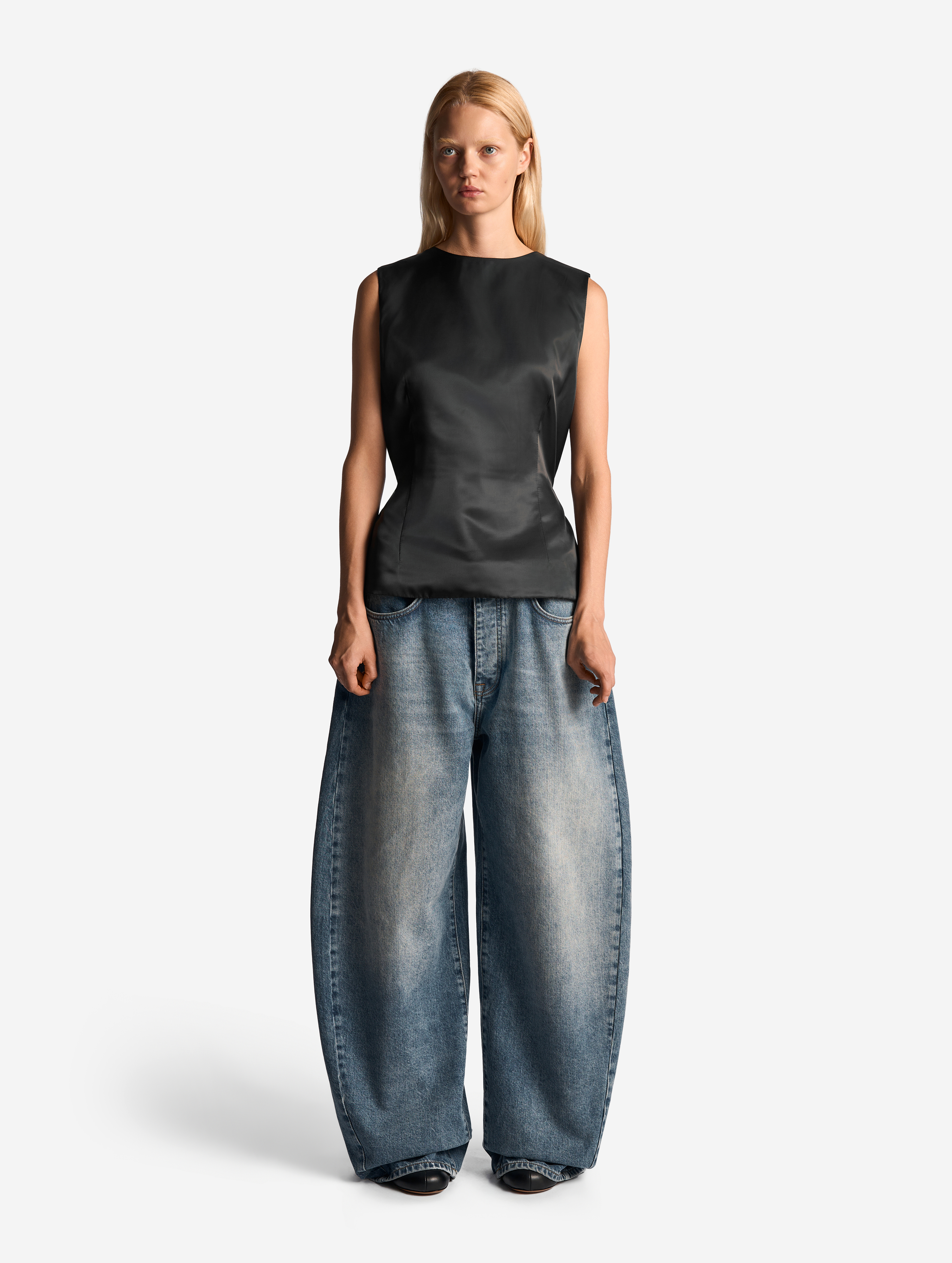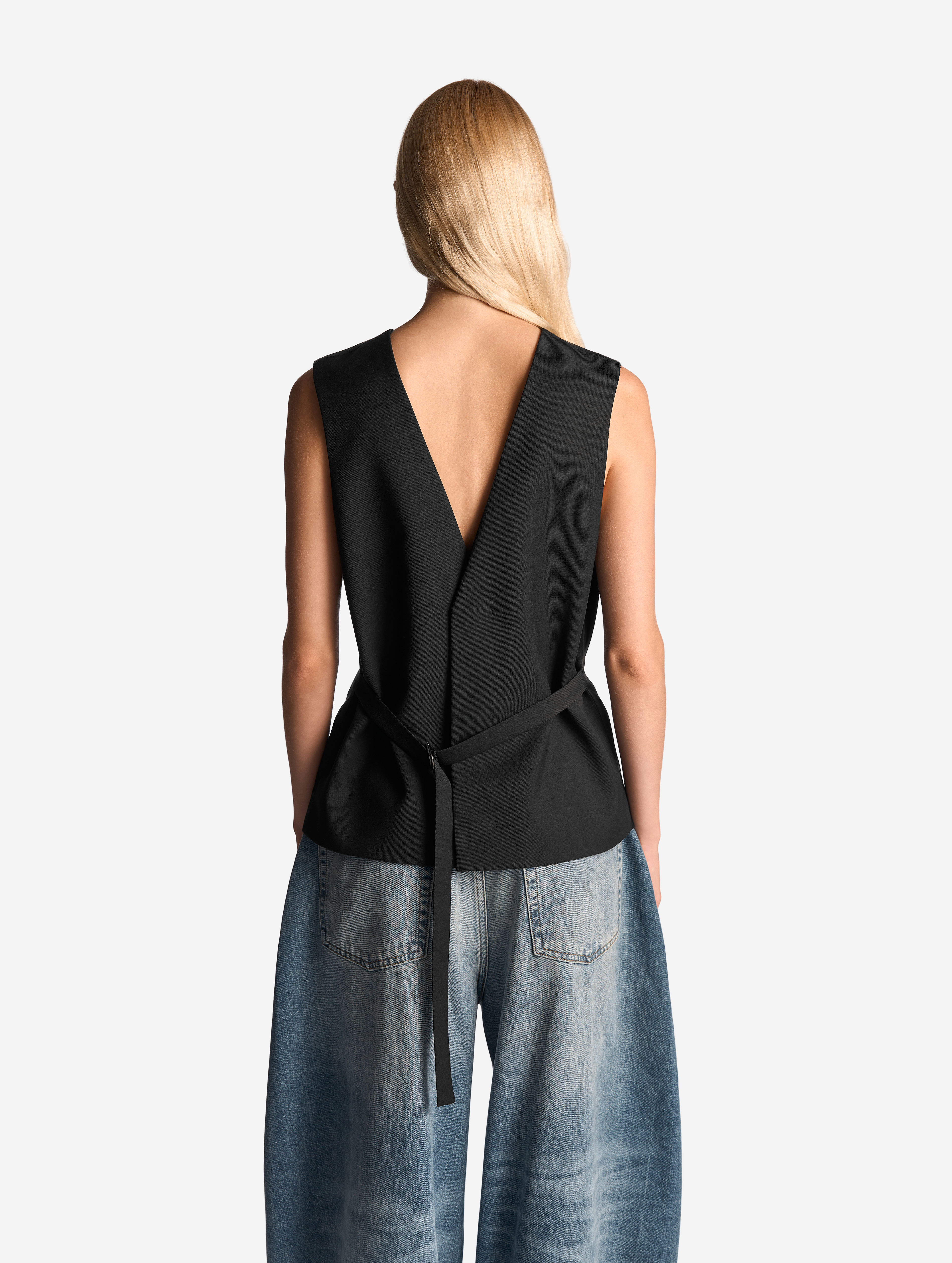 В работе над Garderobe FW25/26 мы задумались: каким может быть костюм-тройка Ushatava? Одна из его обязательных составляющих — костюмный жилет. Наша версия выполнена из материалов, характерных для традиционного прототипа: лицевая часть сшита из плотной костюмной ткани, а спинка — из подкладочной. Еще один элемент, отсылающий к классической одежде, — пояс-хлястик, который позволяет приталить силуэт при желании. В интерпретации модного Дома этот предмет гардероба можно носить по-разному: обычным способом или развернуть на 180°, поменяв перед и спинку местами.