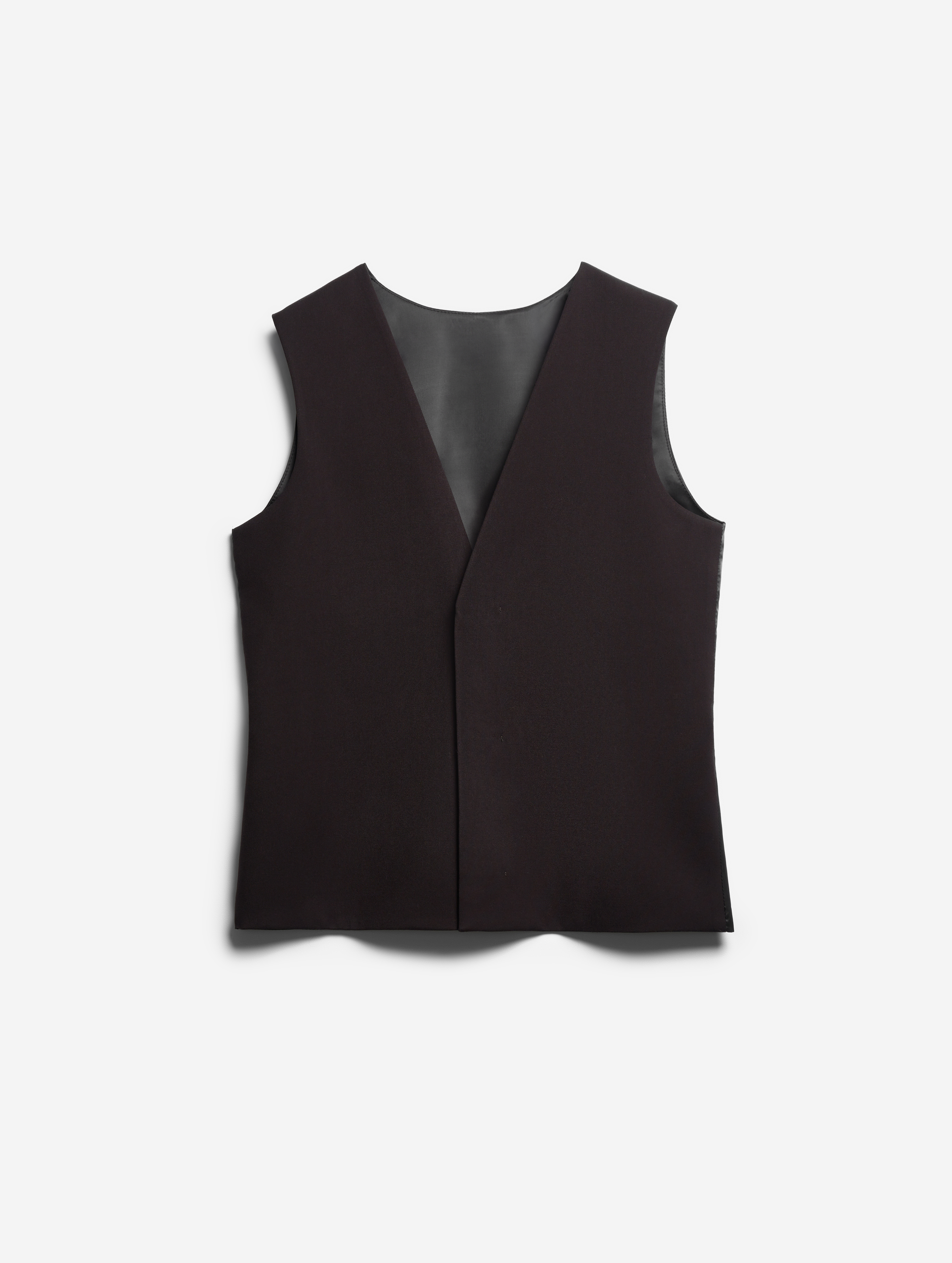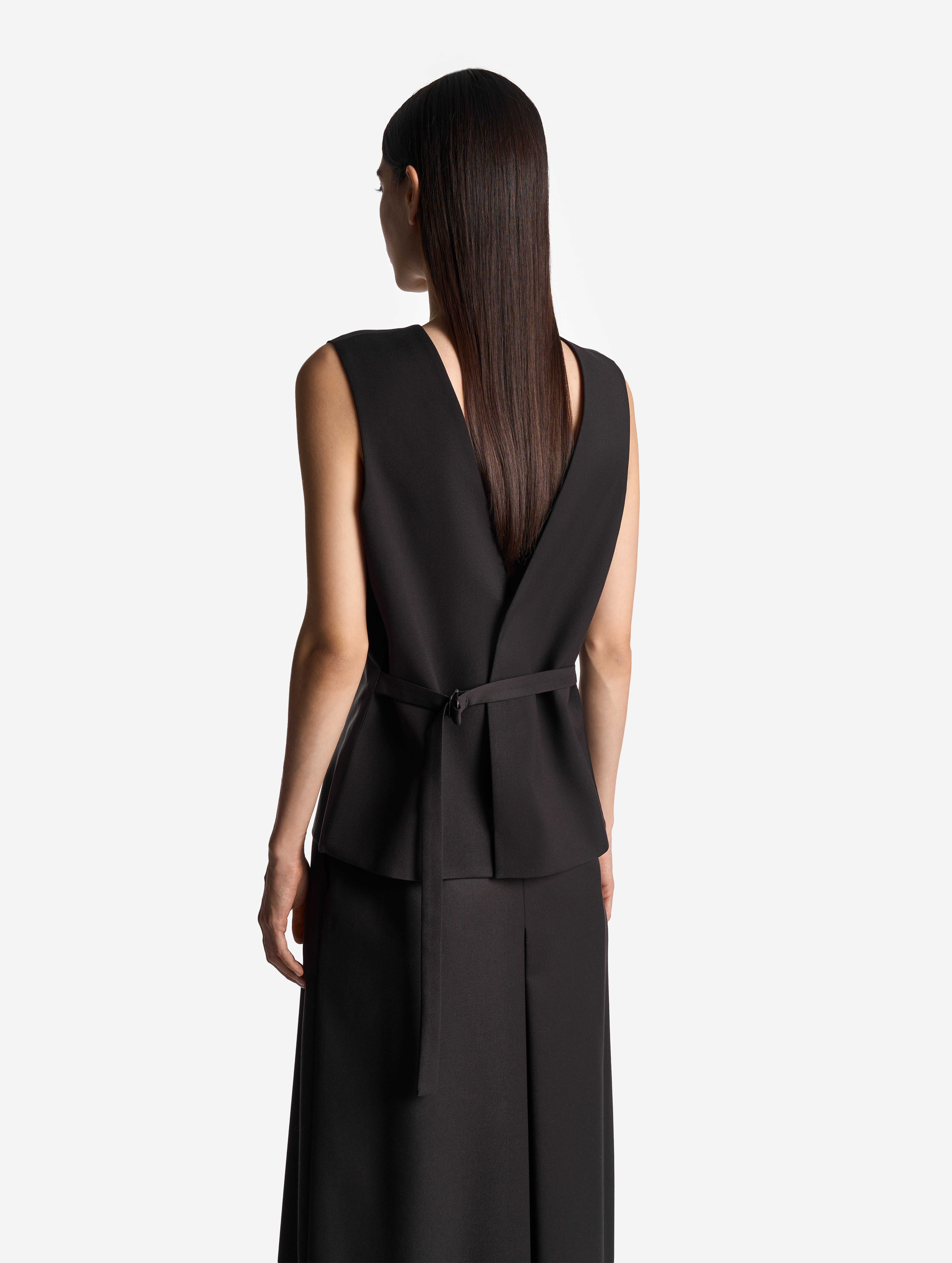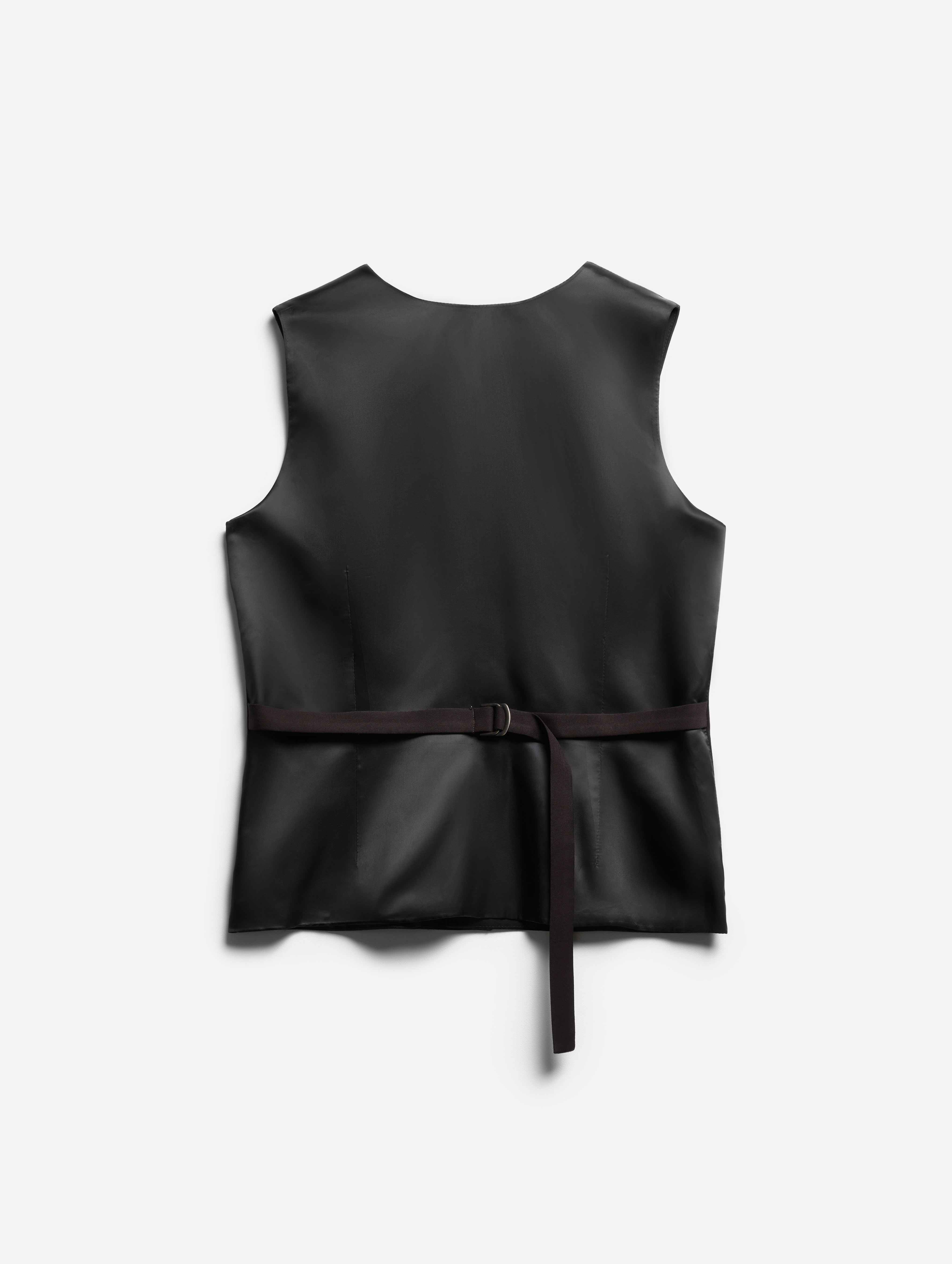 В работе над Garderobe FW25/26 мы задумались: каким может быть костюм-тройка Ushatava? Одна из его обязательных составляющих — костюмный жилет. Наша версия выполнена из материалов, характерных для традиционного прототипа: лицевая часть сшита из плотной костюмной ткани, а спинка — из подкладочной. Еще один элемент, отсылающий к классической одежде, — пояс-хлястик, который позволяет приталить силуэт при желании. В интерпретации модного Дома этот предмет гардероба можно носить по-разному: обычным способом или развернуть на 180°, поменяв перед и спинку местами.