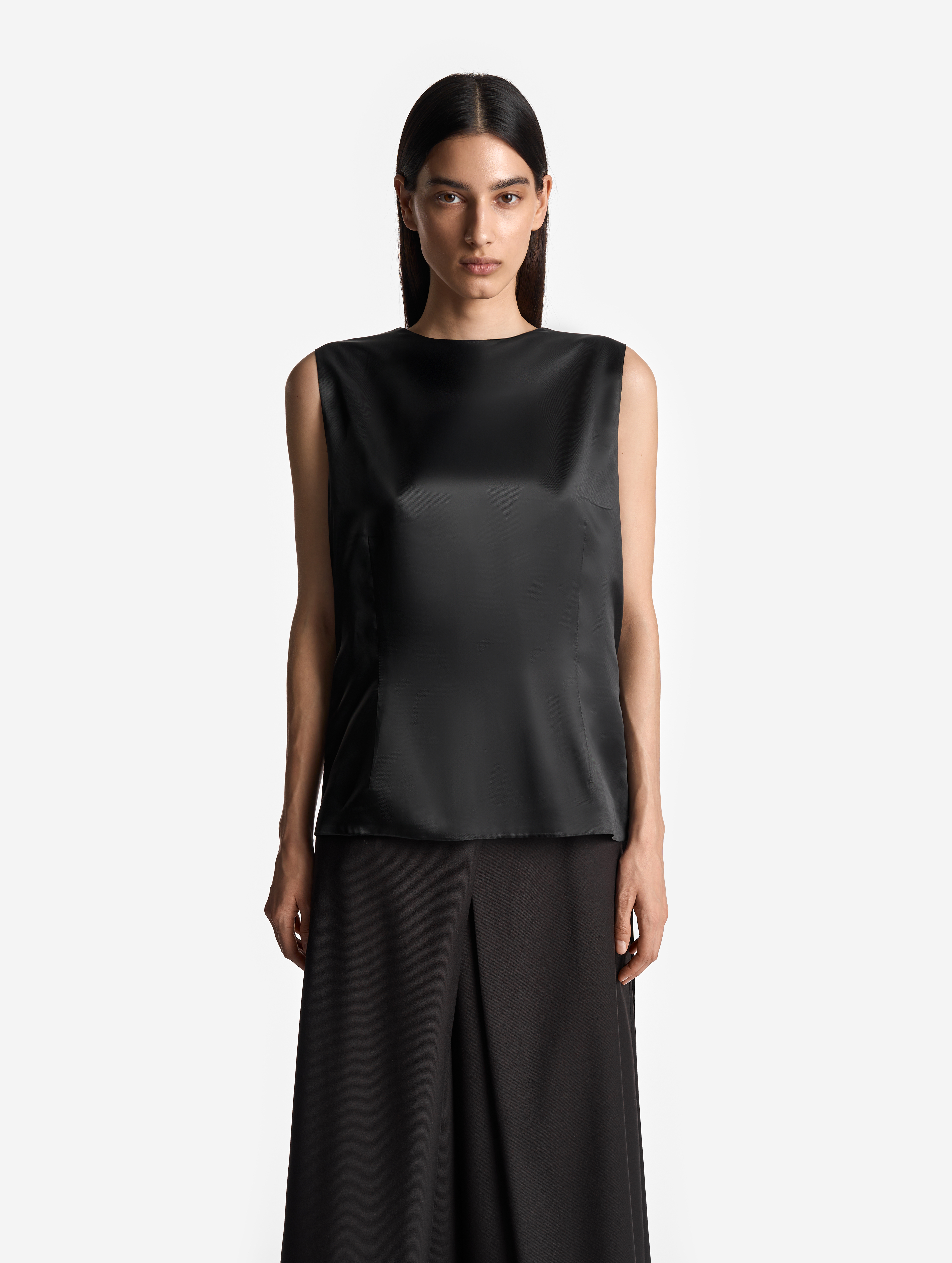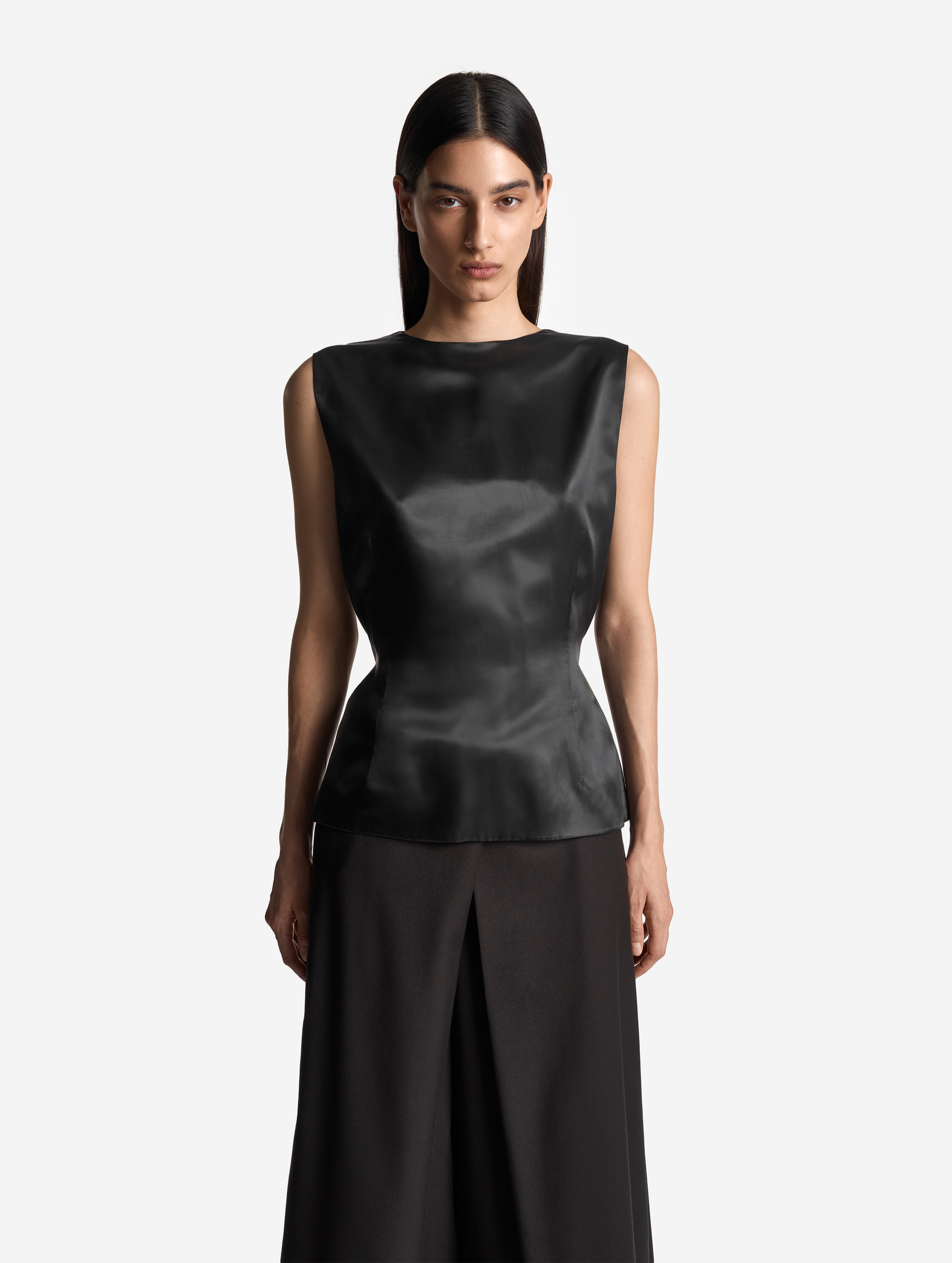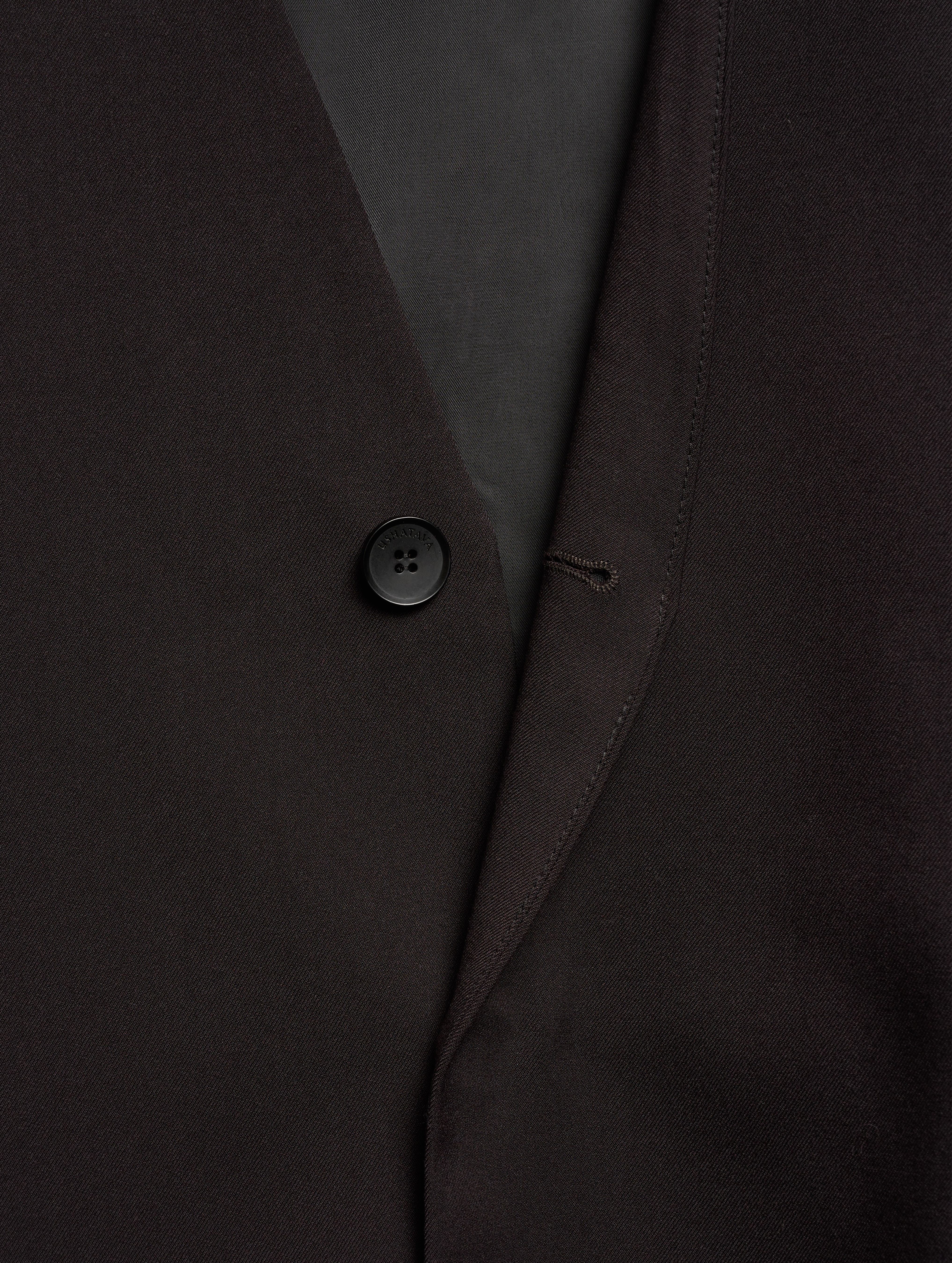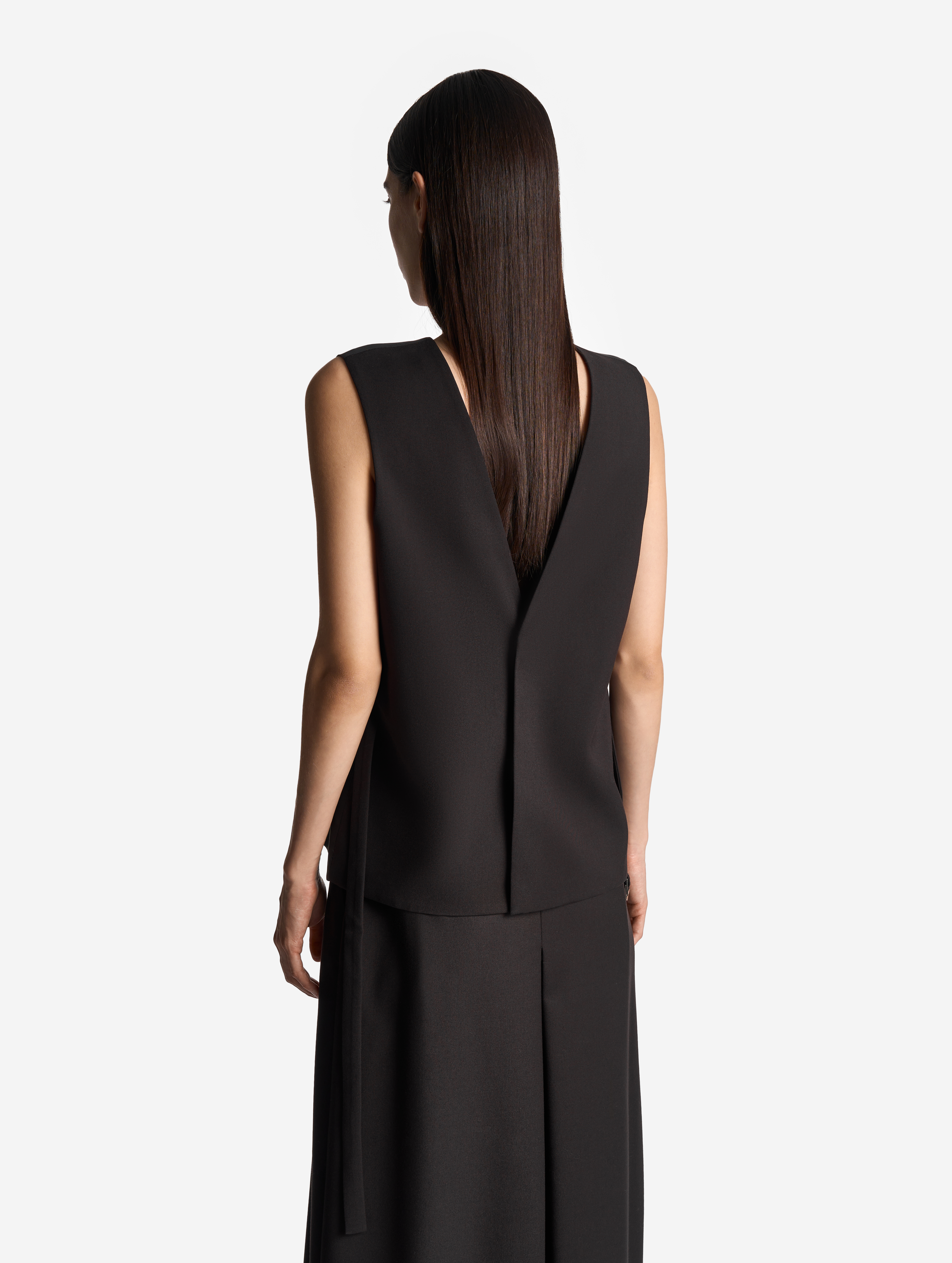 В работе над Garderobe FW25/26 мы задумались: каким может быть костюм-тройка Ushatava? Одна из его обязательных составляющих — костюмный жилет. Наша версия выполнена из материалов, характерных для традиционного прототипа: лицевая часть сшита из плотной костюмной ткани, а спинка — из подкладочной. Еще один элемент, отсылающий к классической одежде, — пояс-хлястик, который позволяет приталить силуэт при желании. В интерпретации модного Дома этот предмет гардероба можно носить по-разному: обычным способом или развернуть на 180°, поменяв перед и спинку местами.