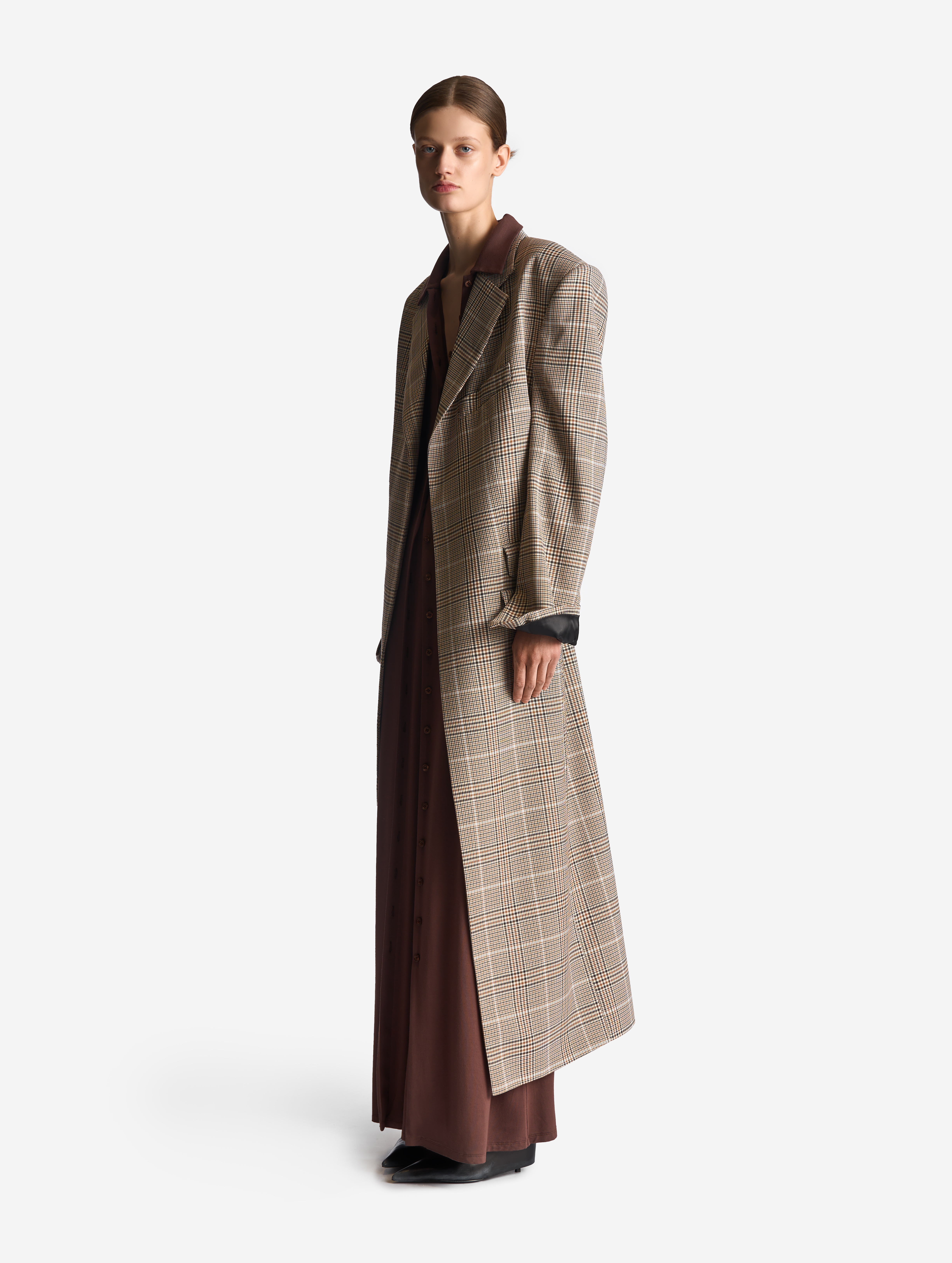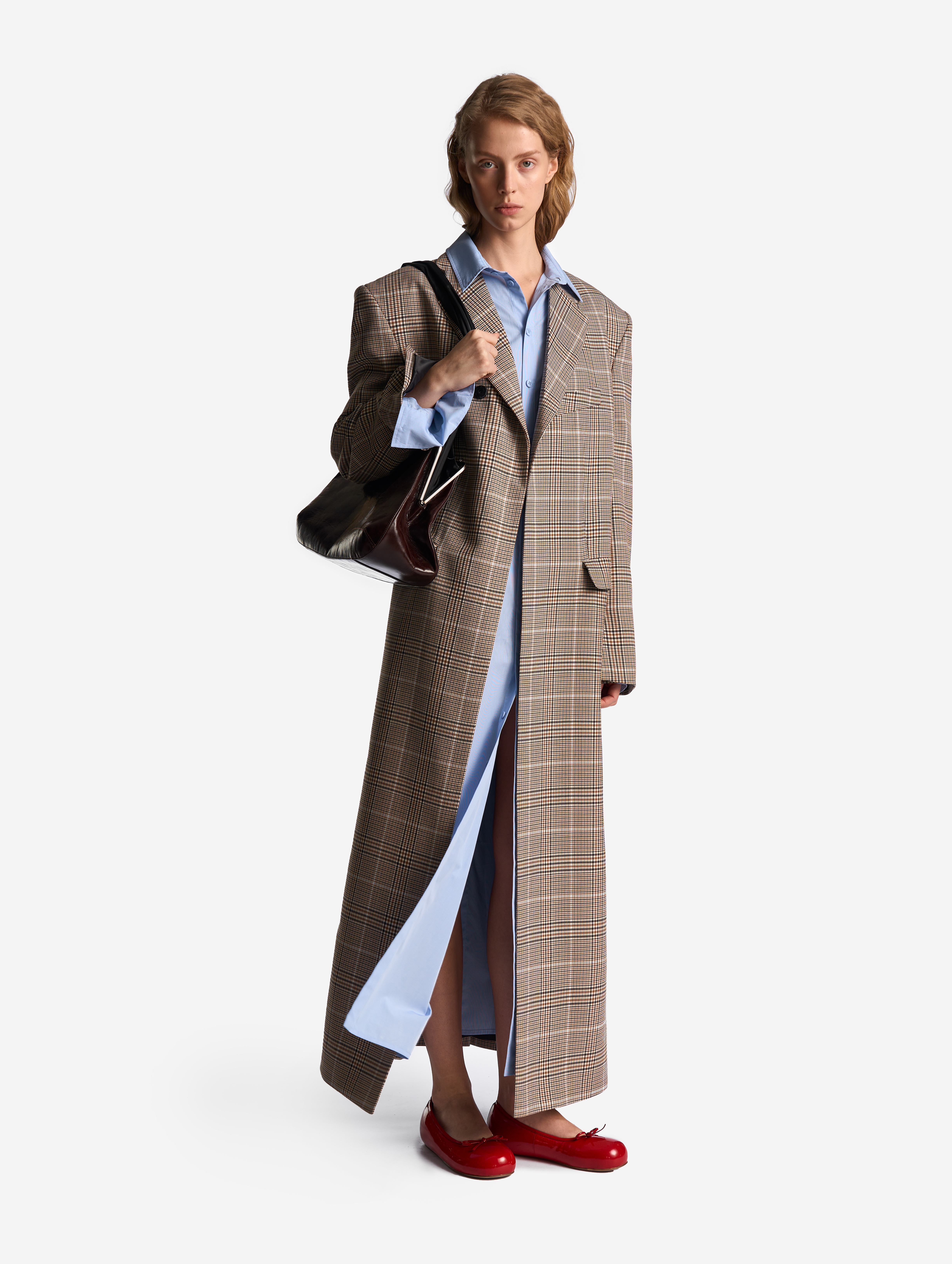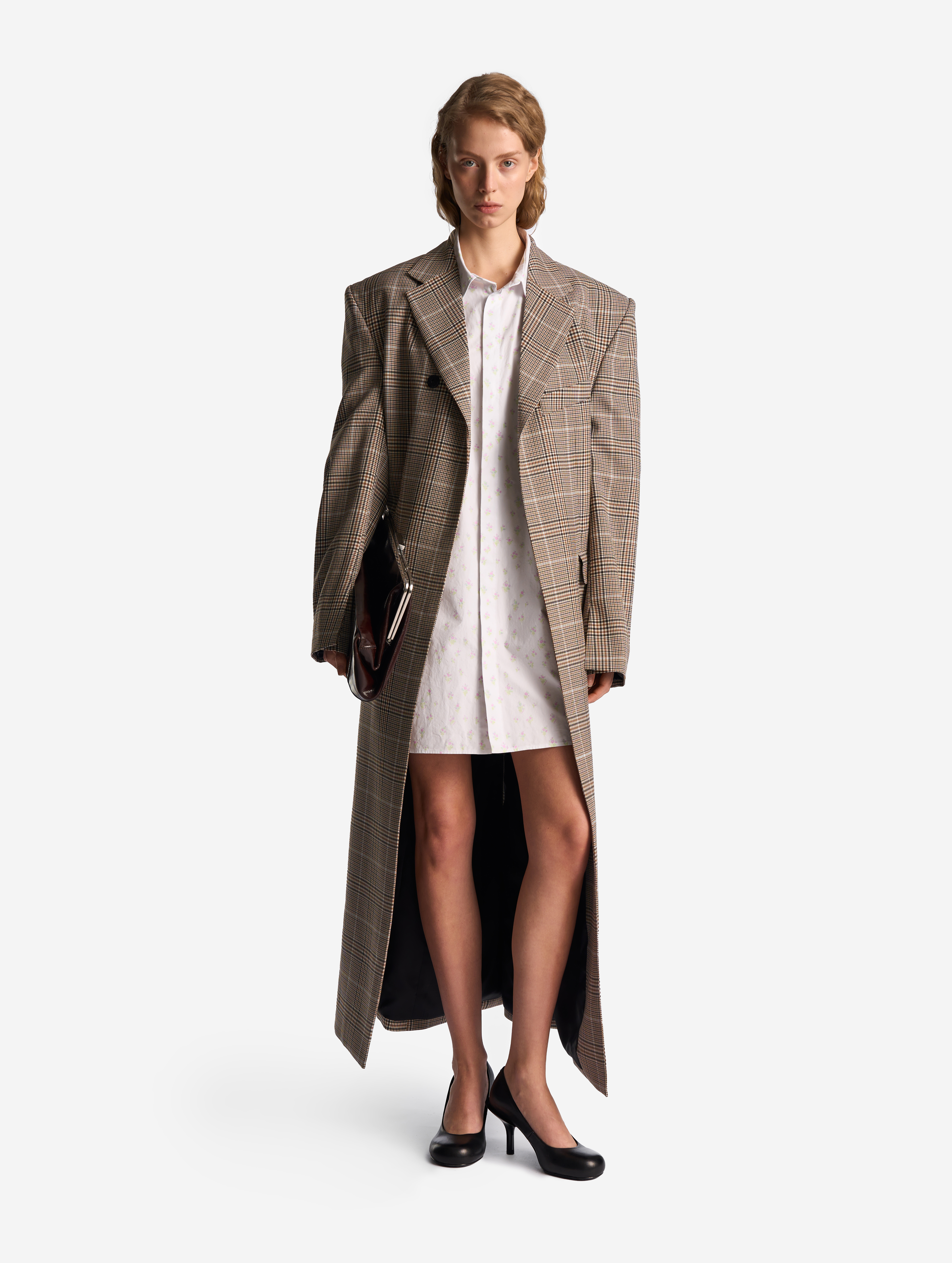 У пальто объемные, выдающиеся плечи. В области груди изделие продублировано несколькими типами прокладок на основе конского волоса, поэтому изделие будет долгие годы сохранять свою форму. У модели два боковых кармана и один нагрудный. Внутри тоже есть карман — на петле и пуговице. Модель застегивается на обтянутую сатином кнопку, которая намерено смещена от центра для создания эффекта запаха. Пальто выполнено из гладкой костюмной ткани, в составе которой присутствует шерсть. Этот материал хорошо держит форму и не мнется.