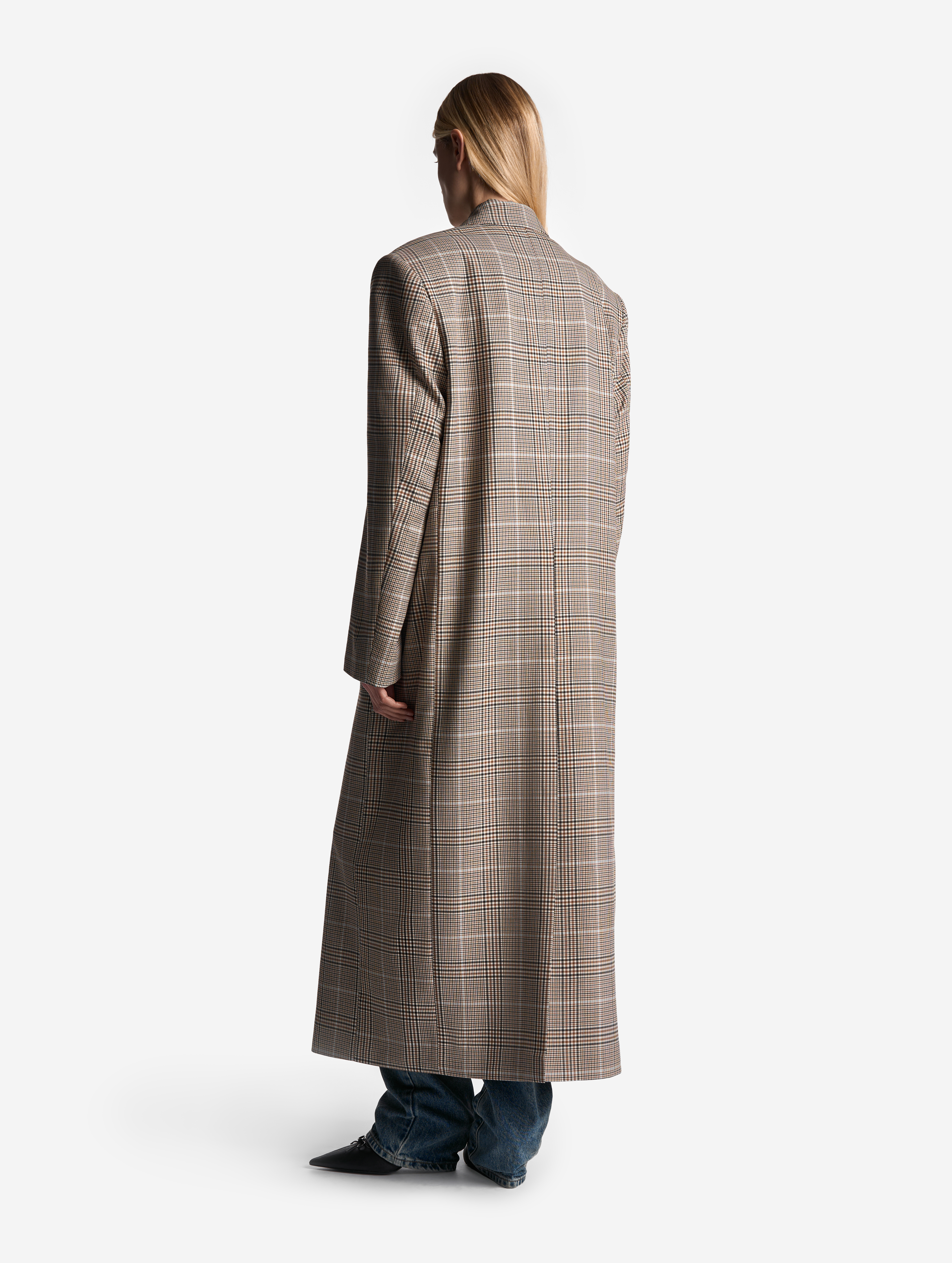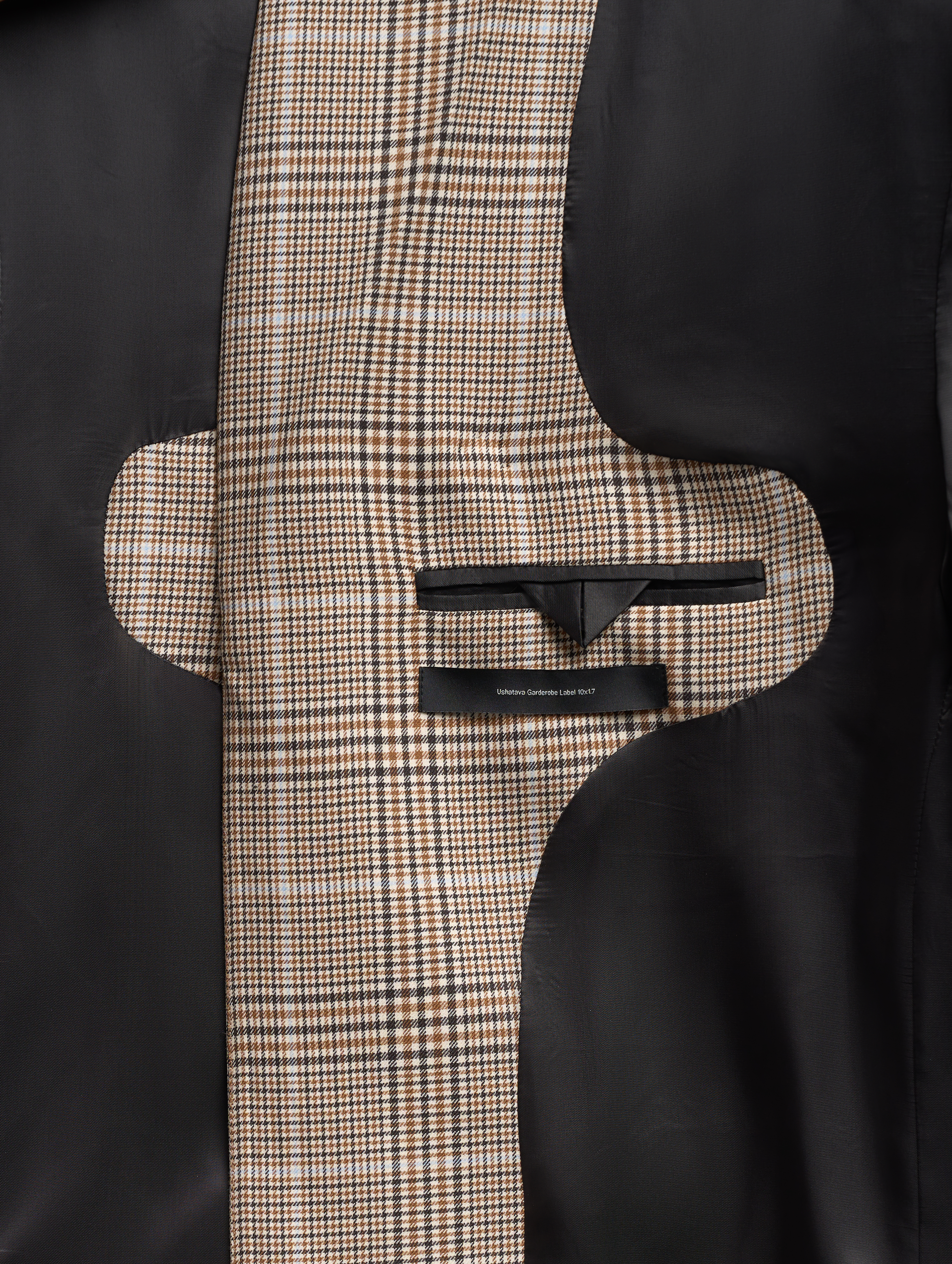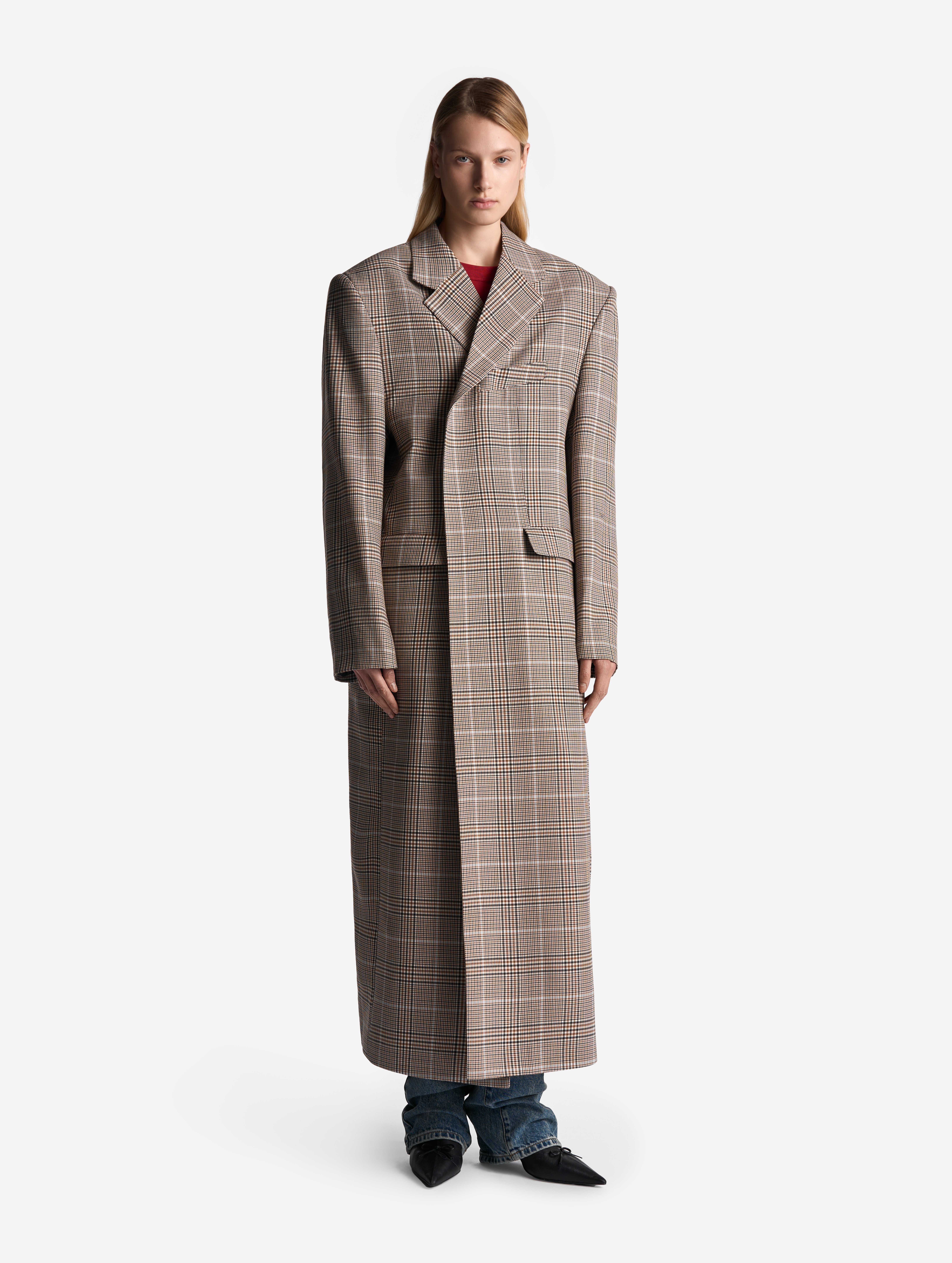 У пальто объемные, выдающиеся плечи. В области груди изделие продублировано несколькими типами прокладок на основе конского волоса, поэтому изделие будет долгие годы сохранять свою форму. У модели два боковых кармана и один нагрудный. Внутри тоже есть карман — на петле и пуговице. Модель застегивается на обтянутую сатином кнопку, которая намерено смещена от центра для создания эффекта запаха. Пальто выполнено из гладкой костюмной ткани, в составе которой присутствует шерсть. Этот материал хорошо держит форму и не мнется.
