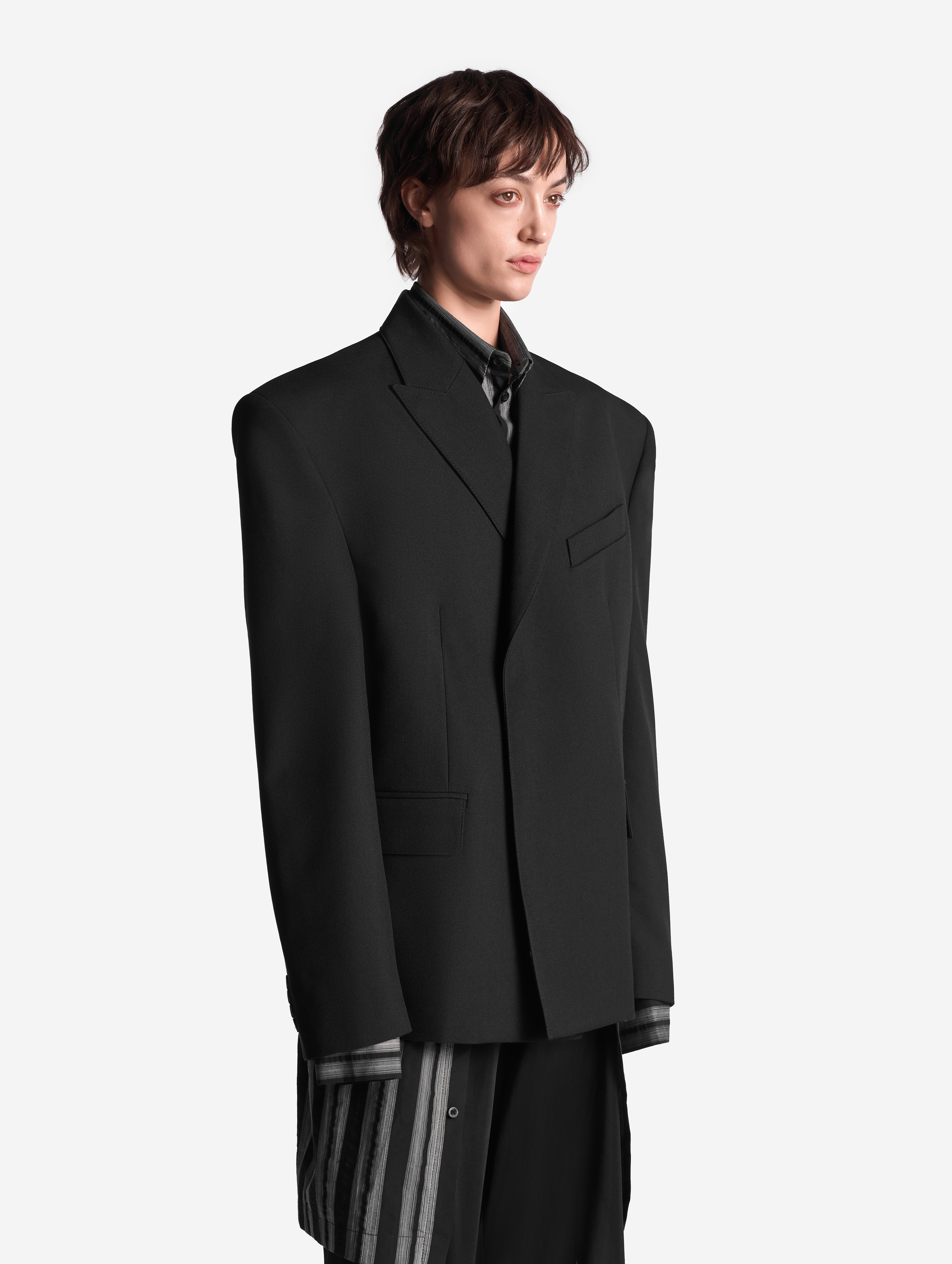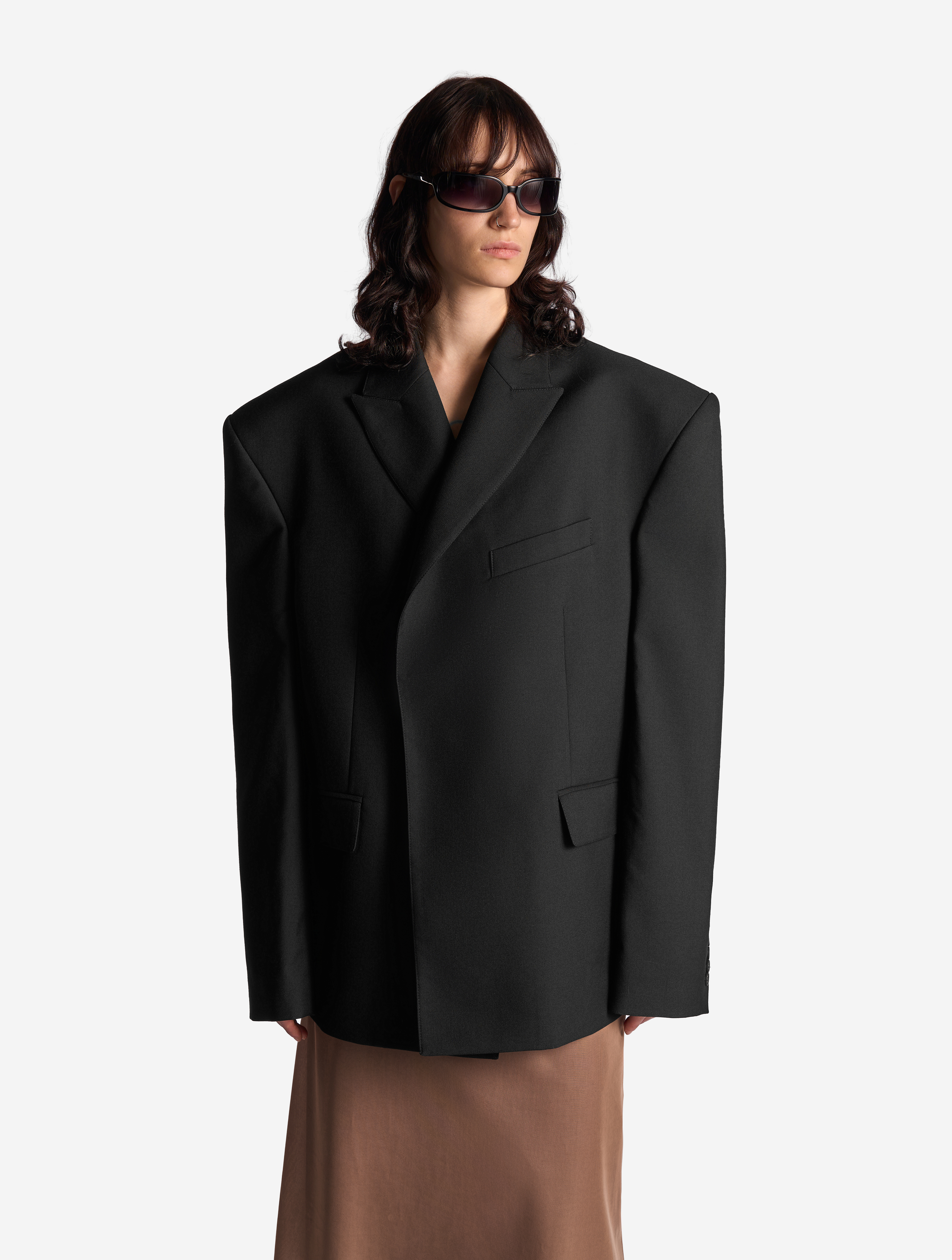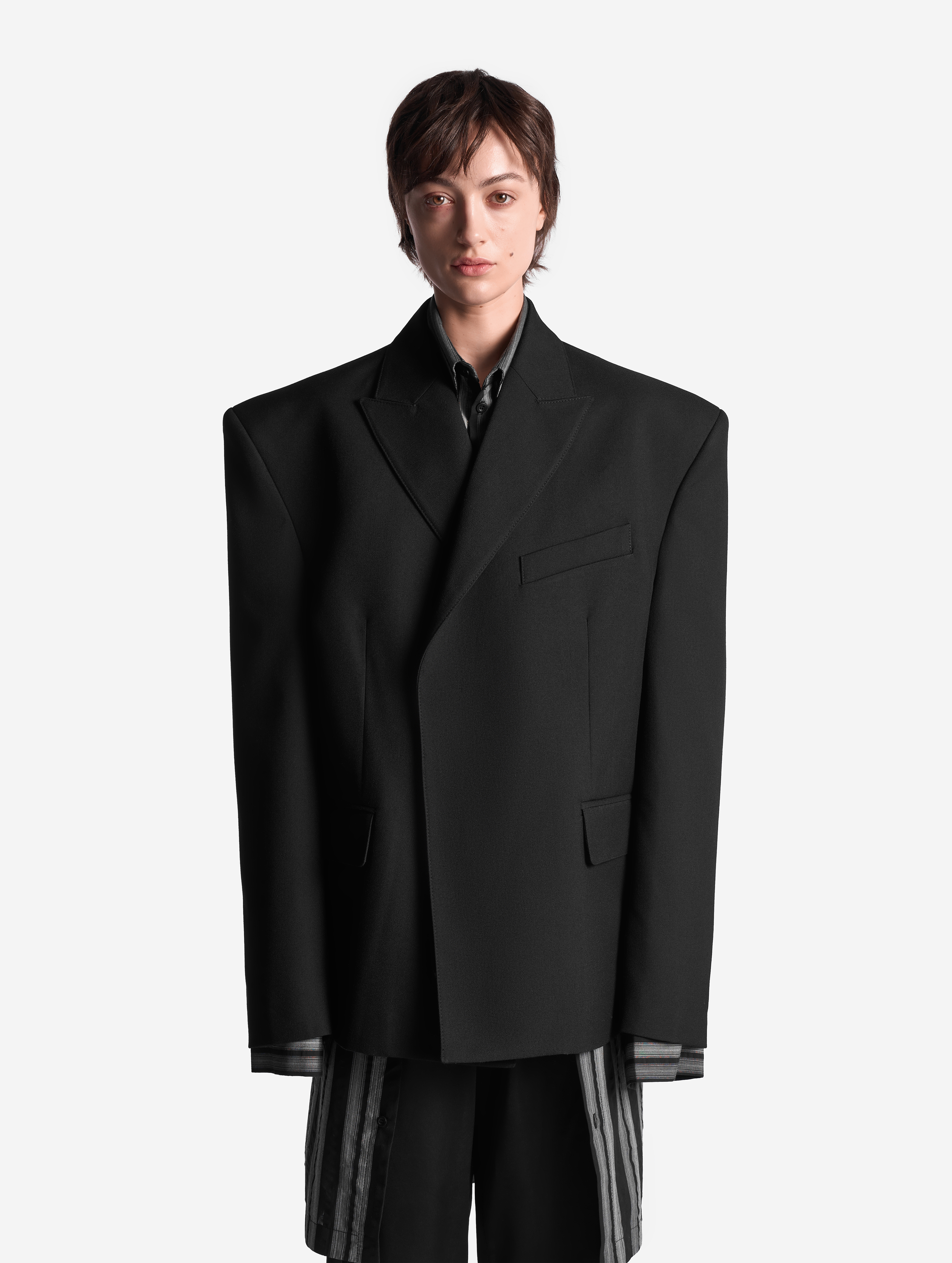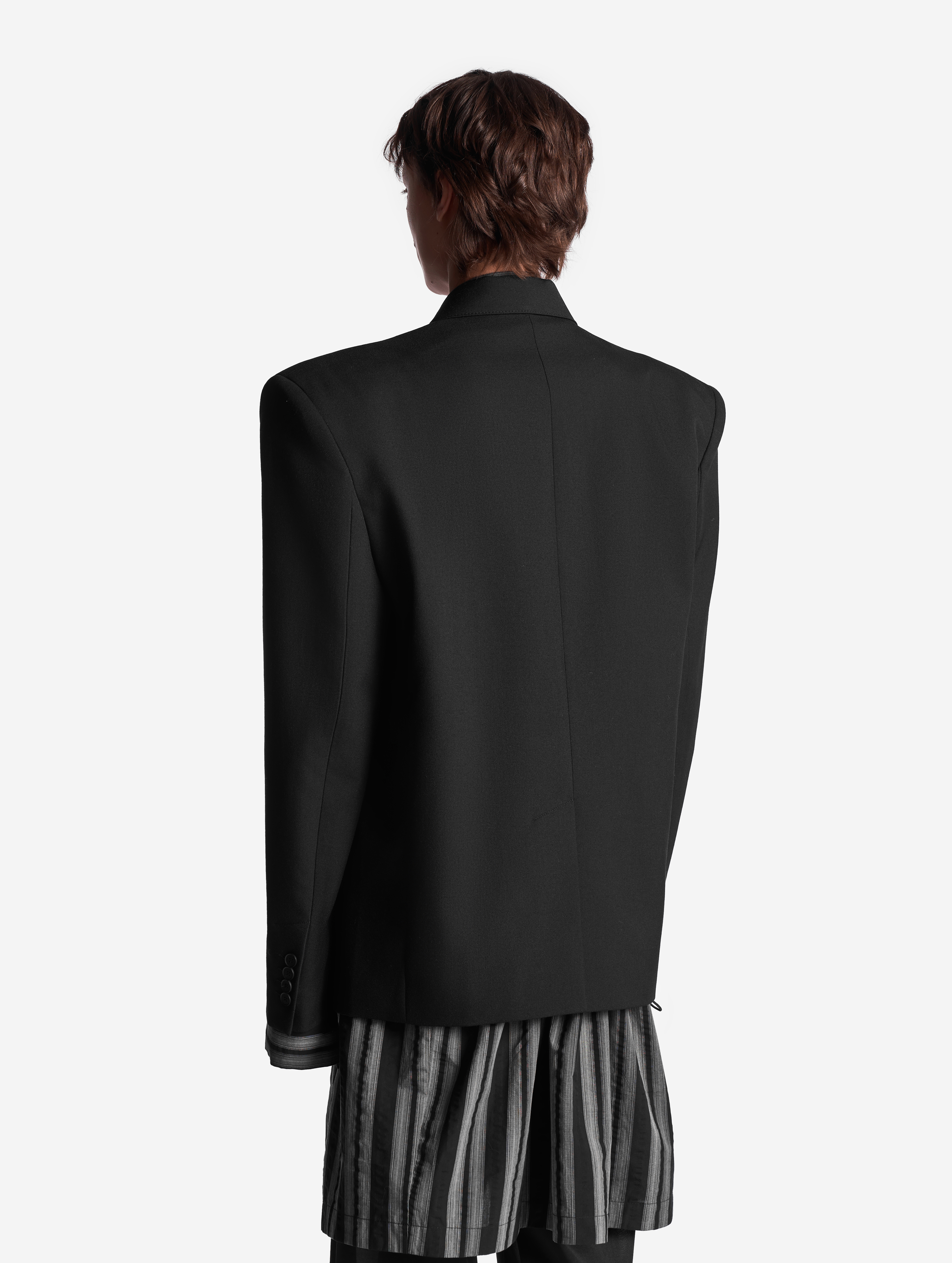 В ходе экспериментов над формой пиджака его плечи были разведены в стороны настолько сильно, что в какой-то момент потеряли привычные очертания. Так появился дизайн-прием Dropped Shoulders: с английского словосочетание переводится как «упавшие плечи». Пиджак застегивается на пуговицы и внутри обработан подкладом. Есть два функциональных боковых кармана и один нагрудный, который по канонам портновского мастерства застрочен.