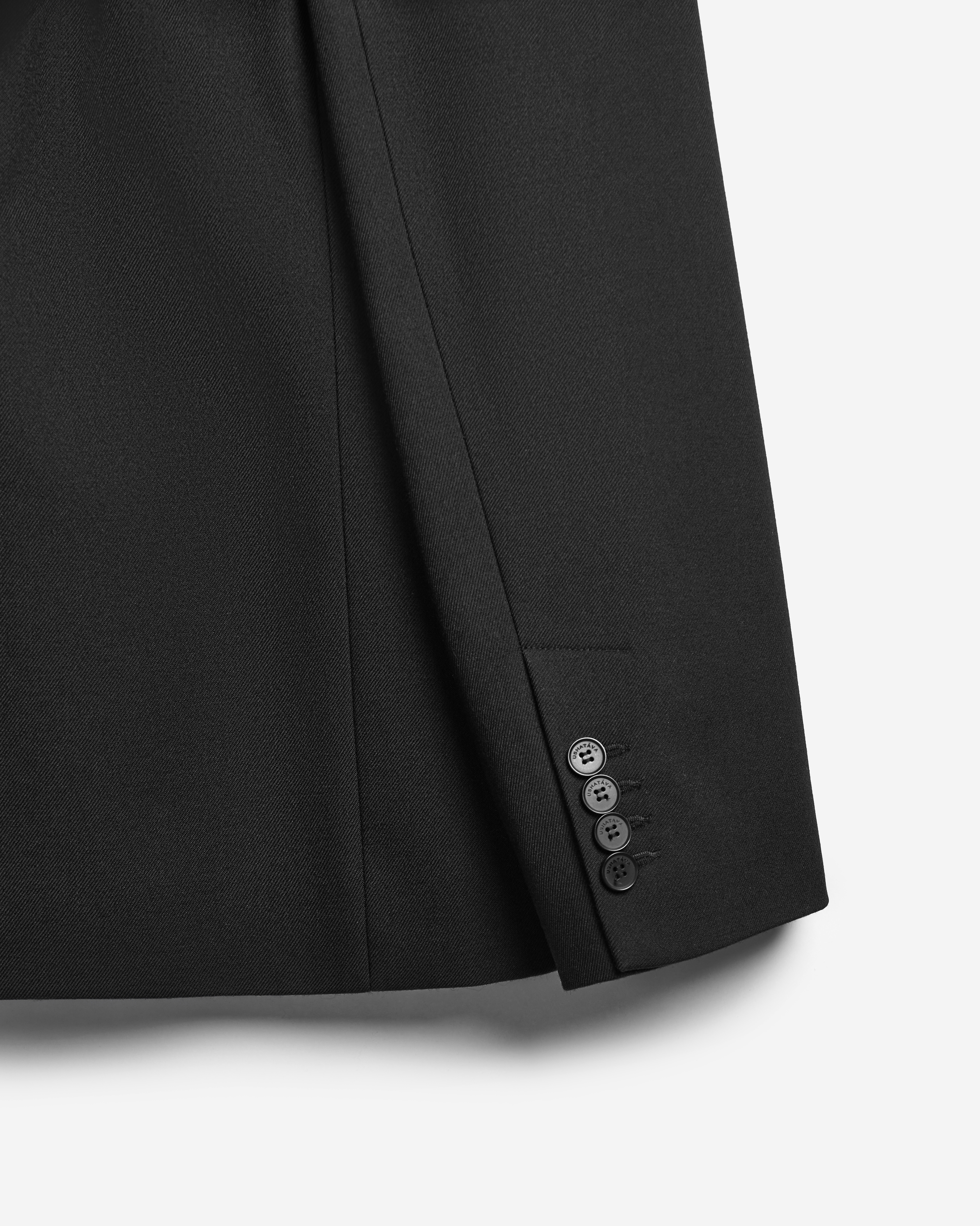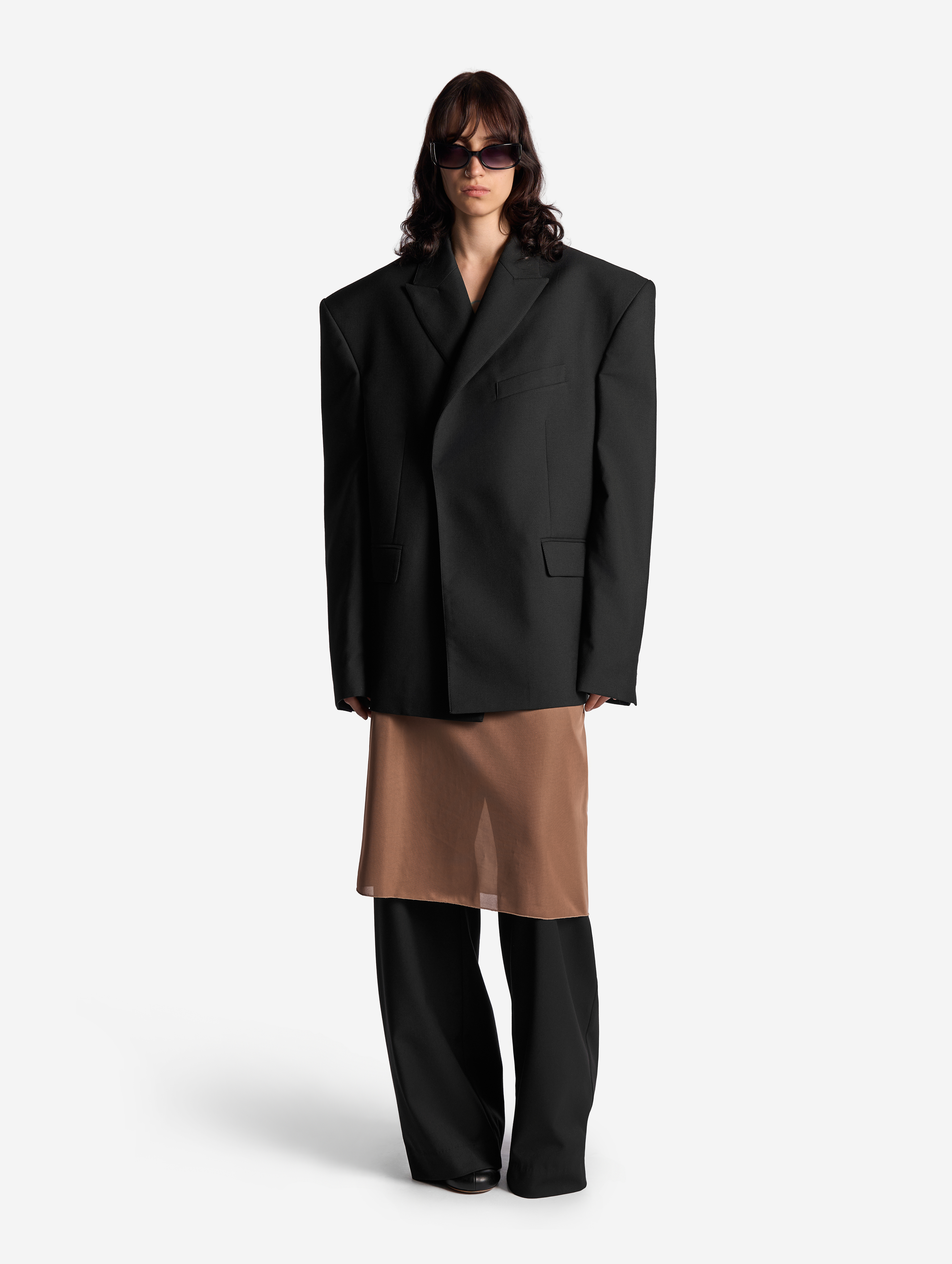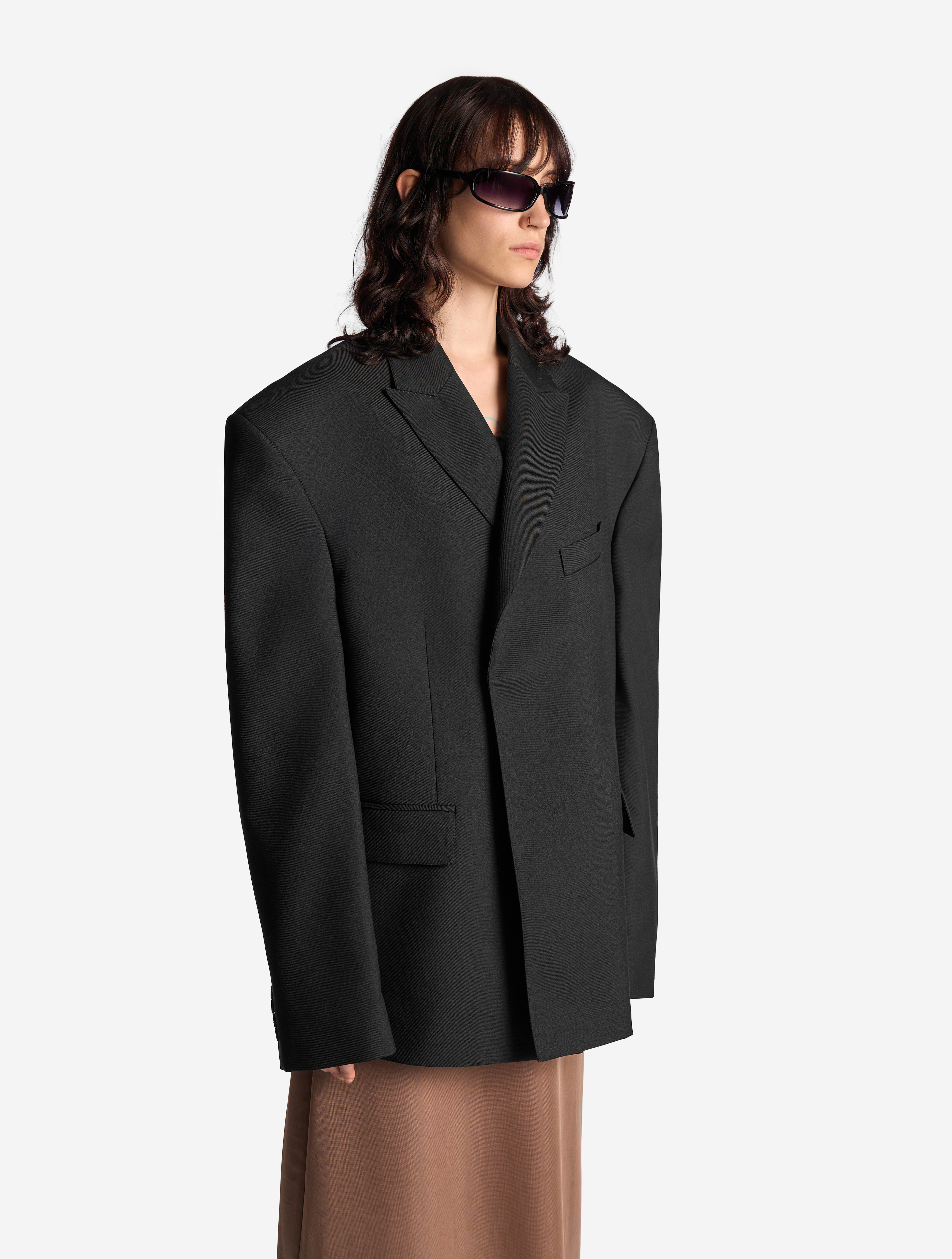 В ходе экспериментов над формой пиджака его плечи были разведены в стороны настолько сильно, что в какой-то момент потеряли привычные очертания. Так появился дизайн-прием Dropped Shoulders: с английского словосочетание переводится как «упавшие плечи». Пиджак застегивается на пуговицы и внутри обработан подкладом. Есть два функциональных боковых кармана и один нагрудный, который по канонам портновского мастерства застрочен.