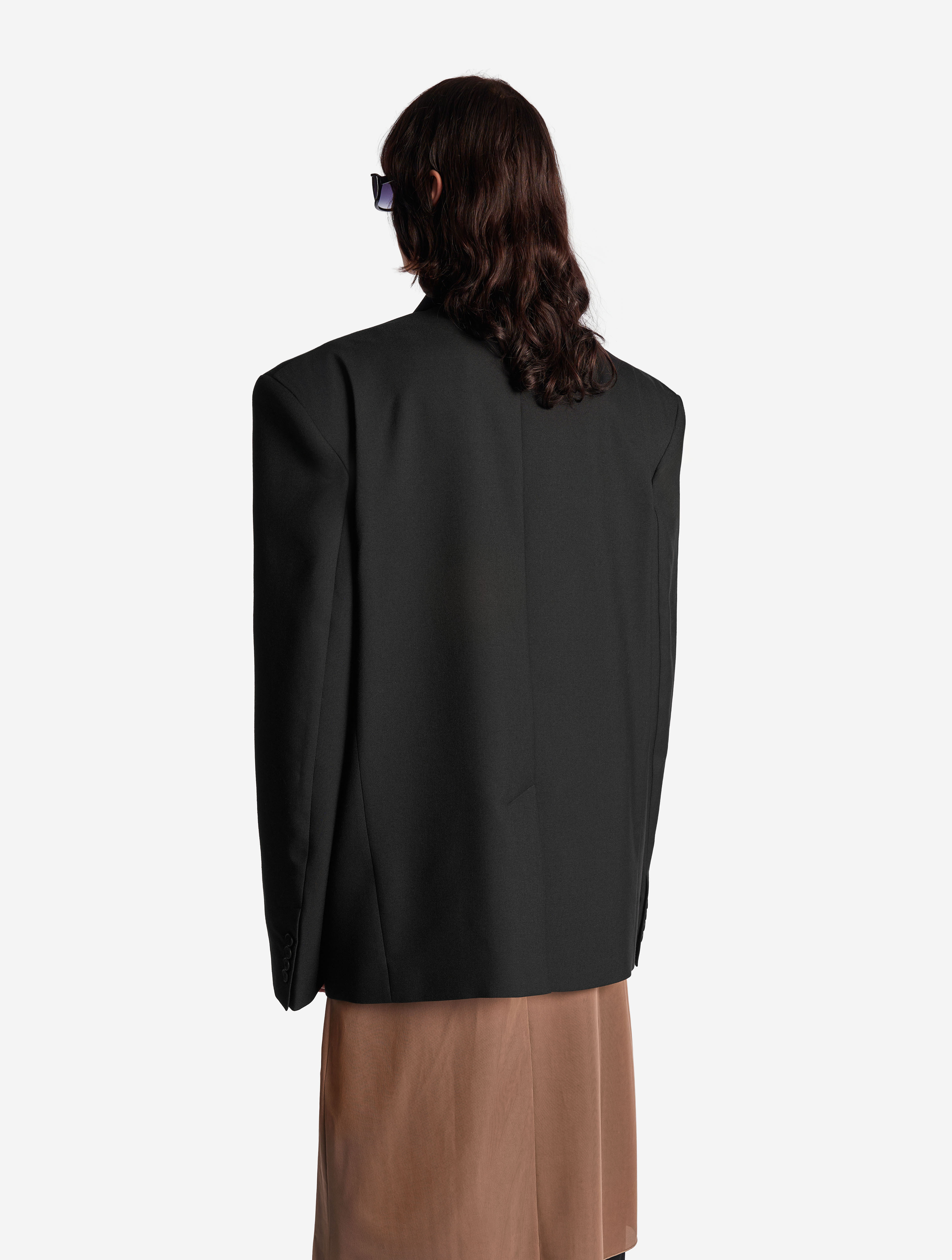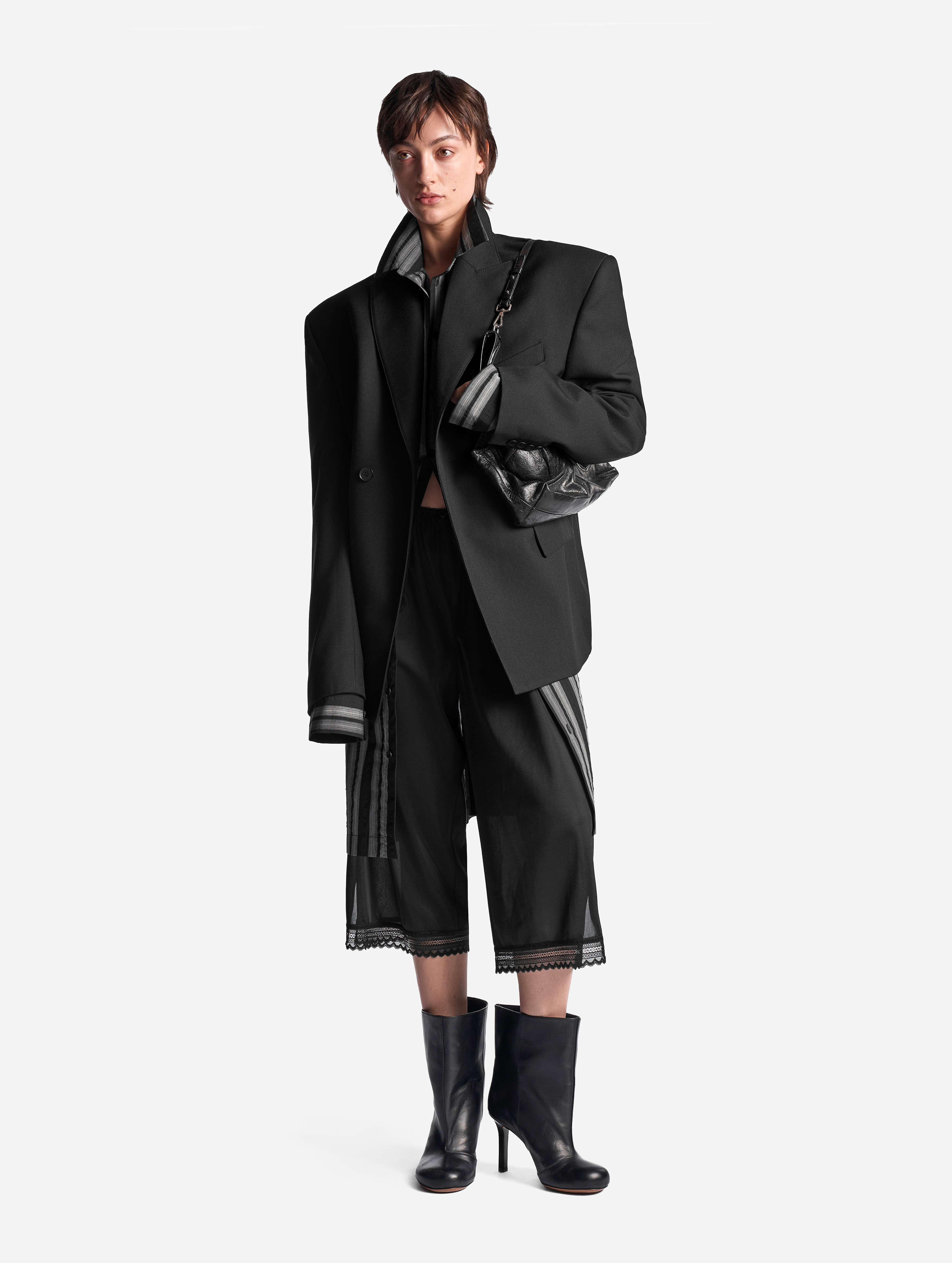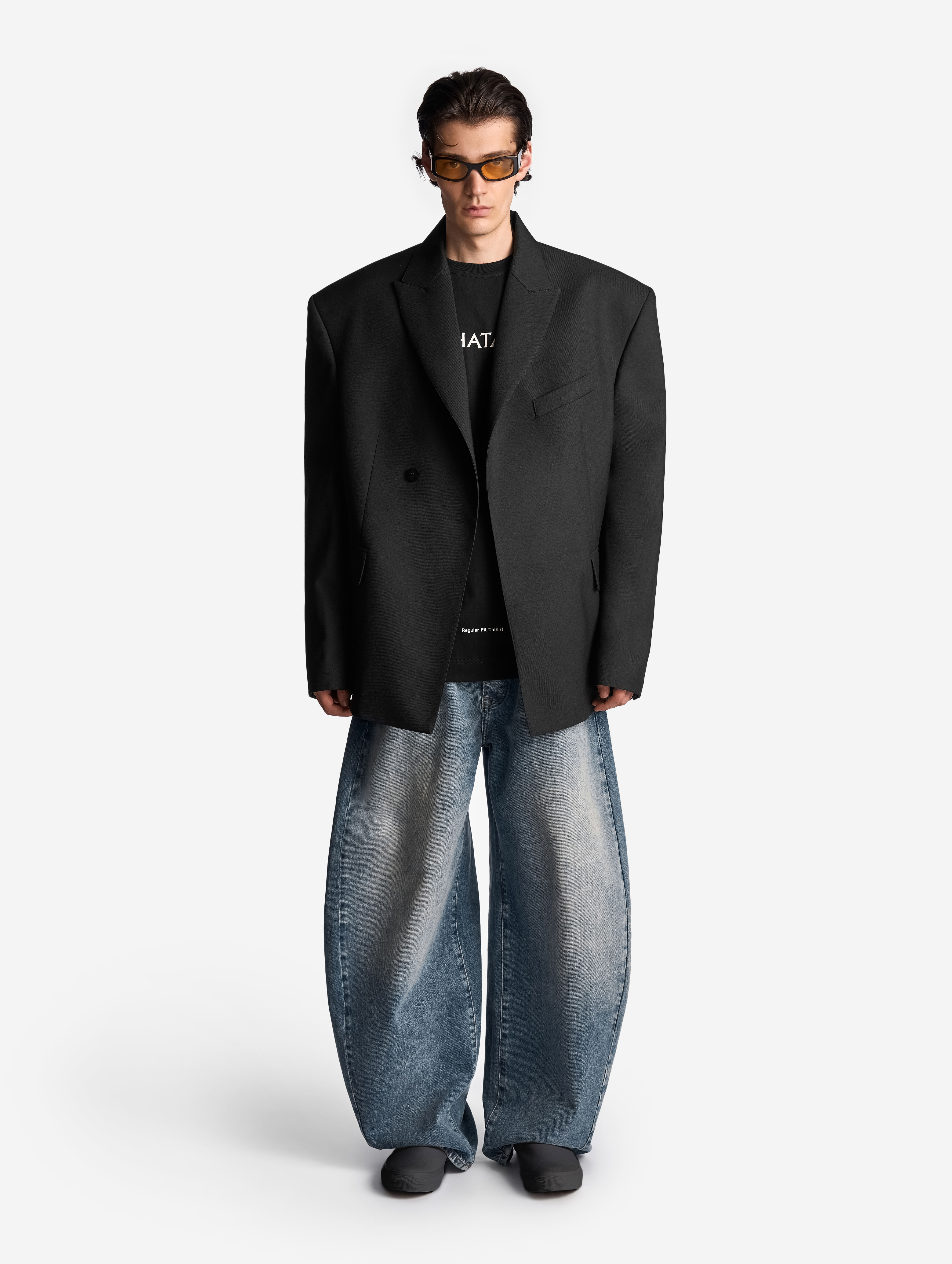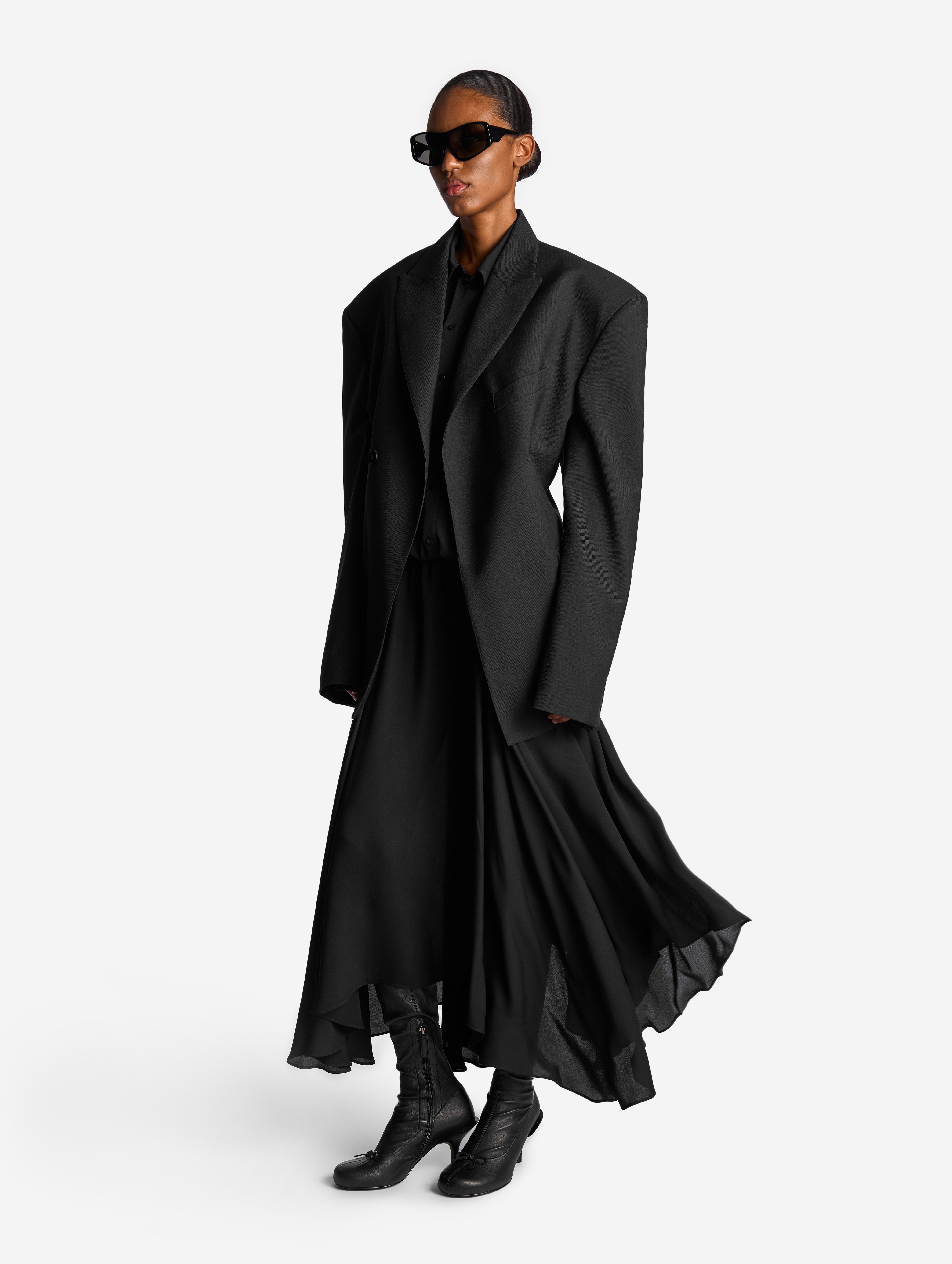 В ходе экспериментов над формой пиджака его плечи были разведены в стороны настолько сильно, что в какой-то момент потеряли привычные очертания. Так появился дизайн-прием Dropped Shoulders: с английского словосочетание переводится как «упавшие плечи». Пиджак застегивается на пуговицы и внутри обработан подкладом. Есть два функциональных боковых кармана и один нагрудный, который по канонам портновского мастерства застрочен.
