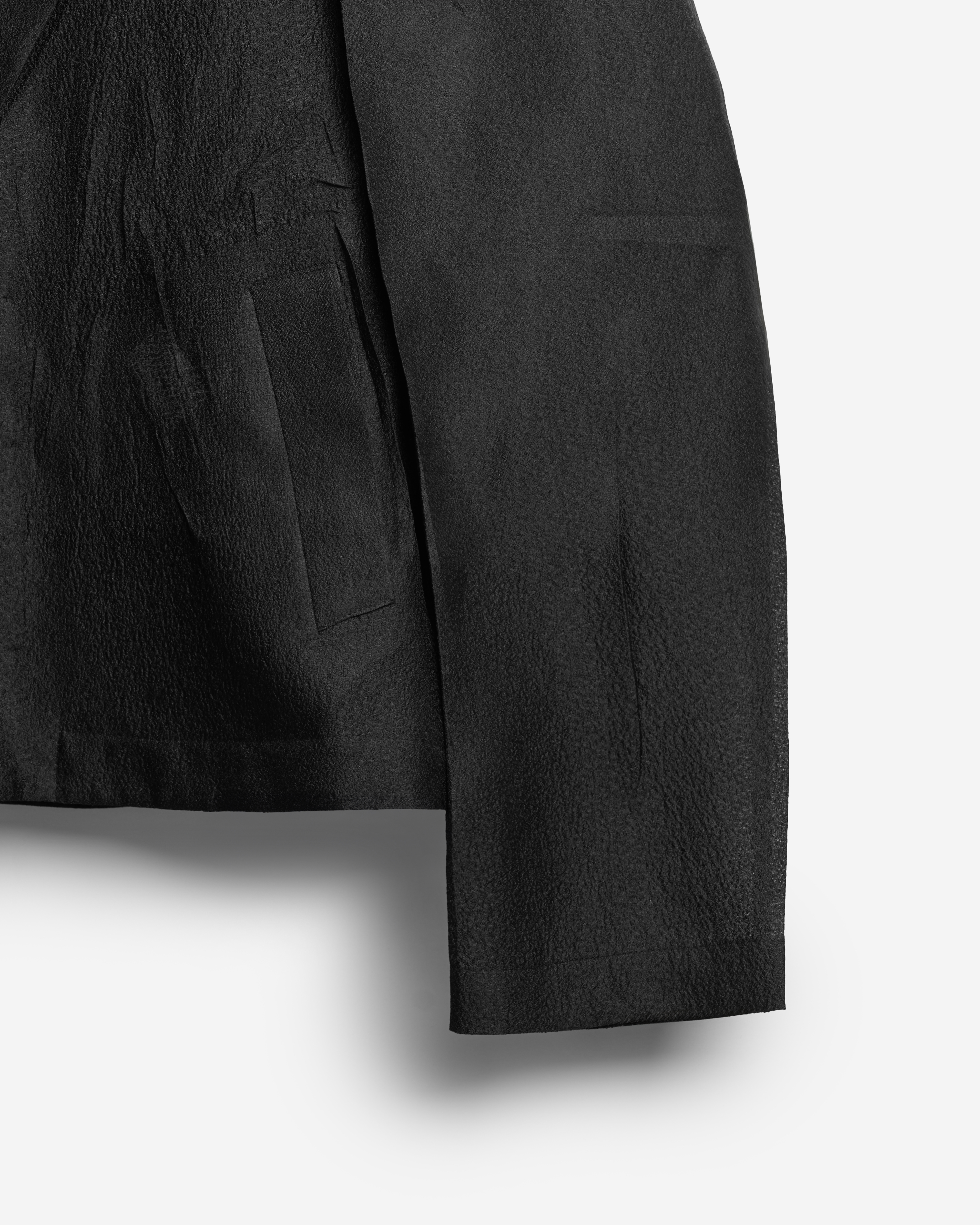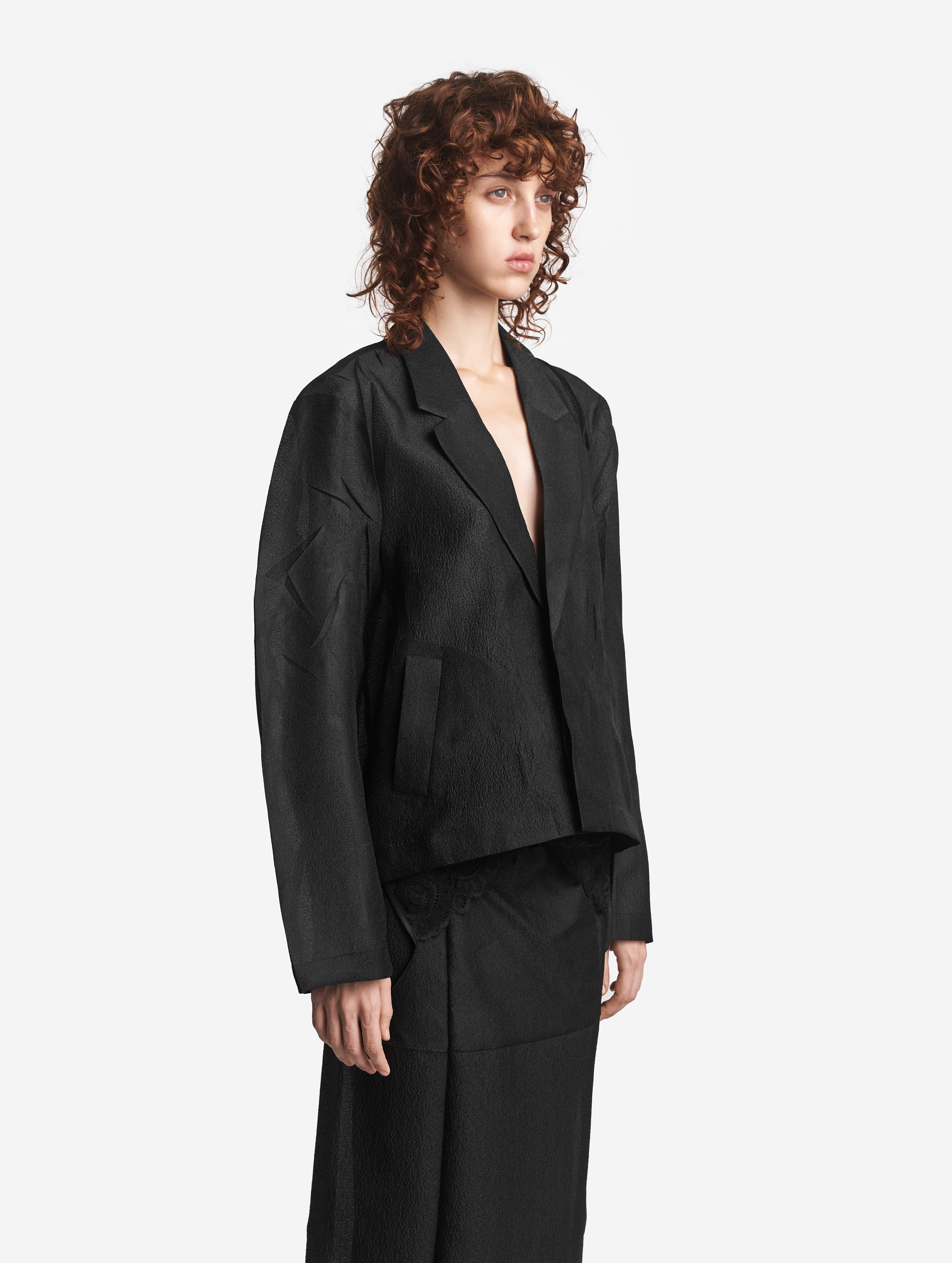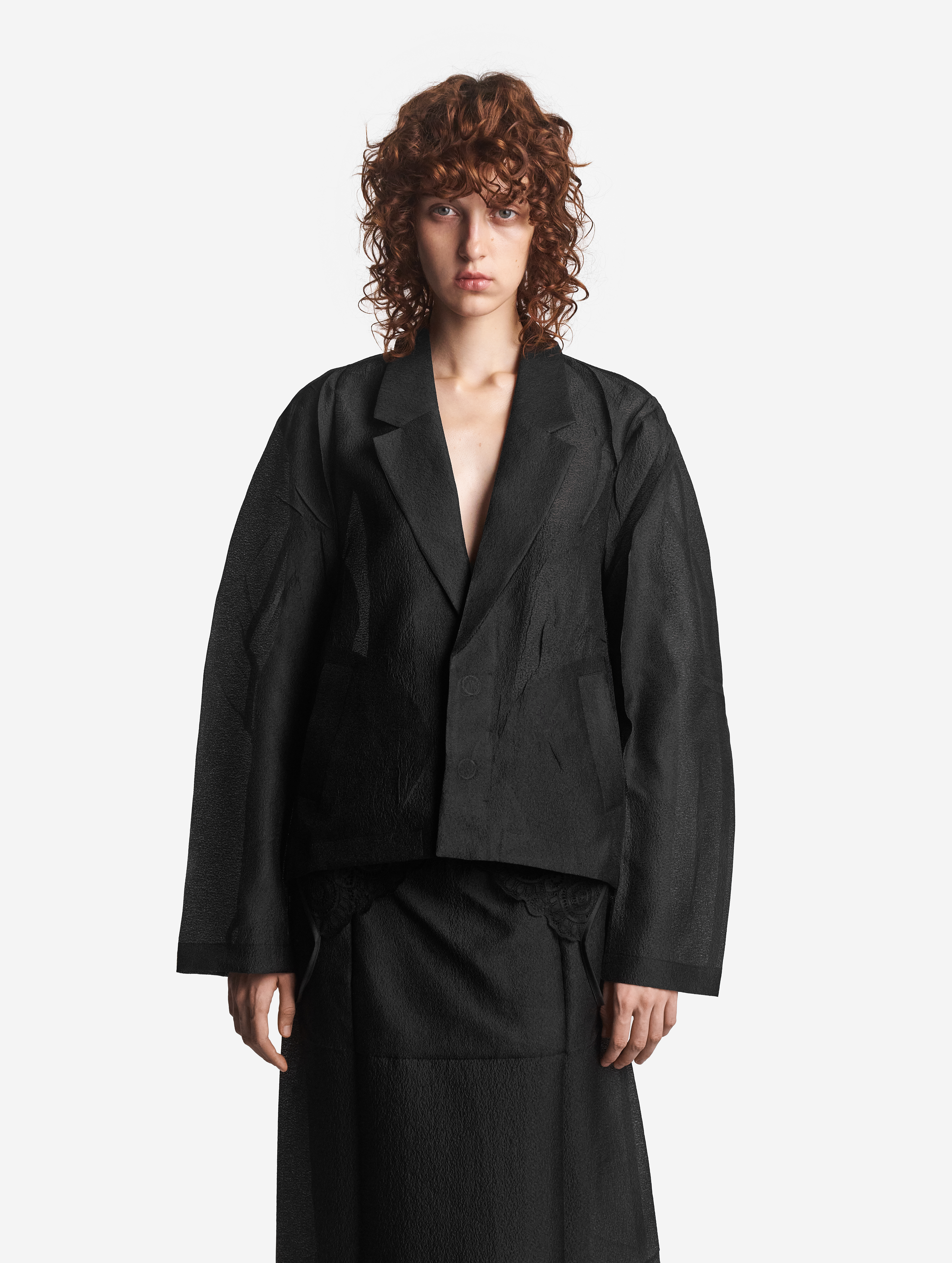 Пиджак выполнен из плотной полупрозрачной органзы. Хаотичные складки, заложенные вручную, напоминают следы времени, которые приобретает праздничная вещь, дожидаясь своего выхода. Изделие застегивается на две пуговицы, обтянутые тканью. У пиджака есть два боковых кармана.