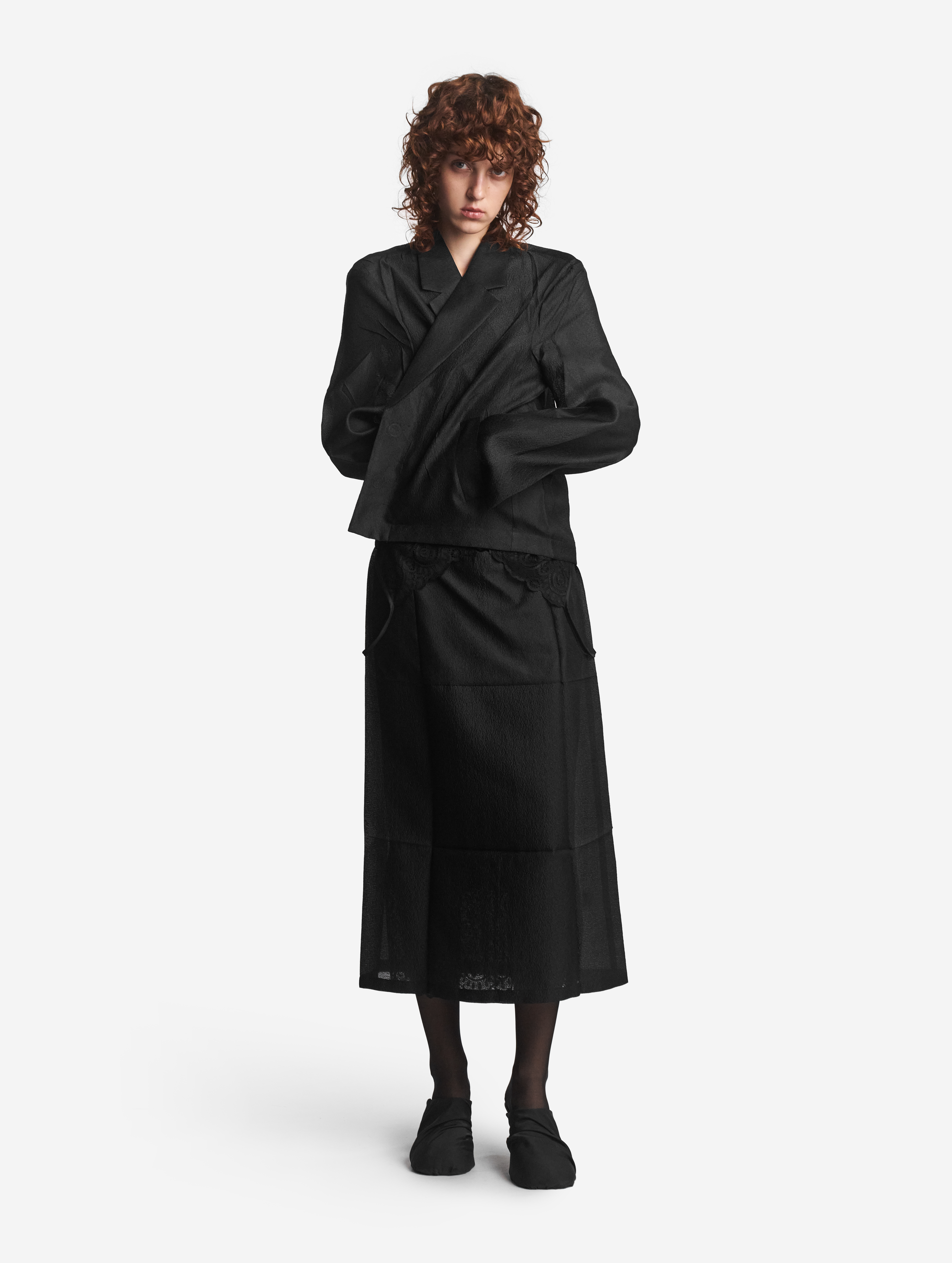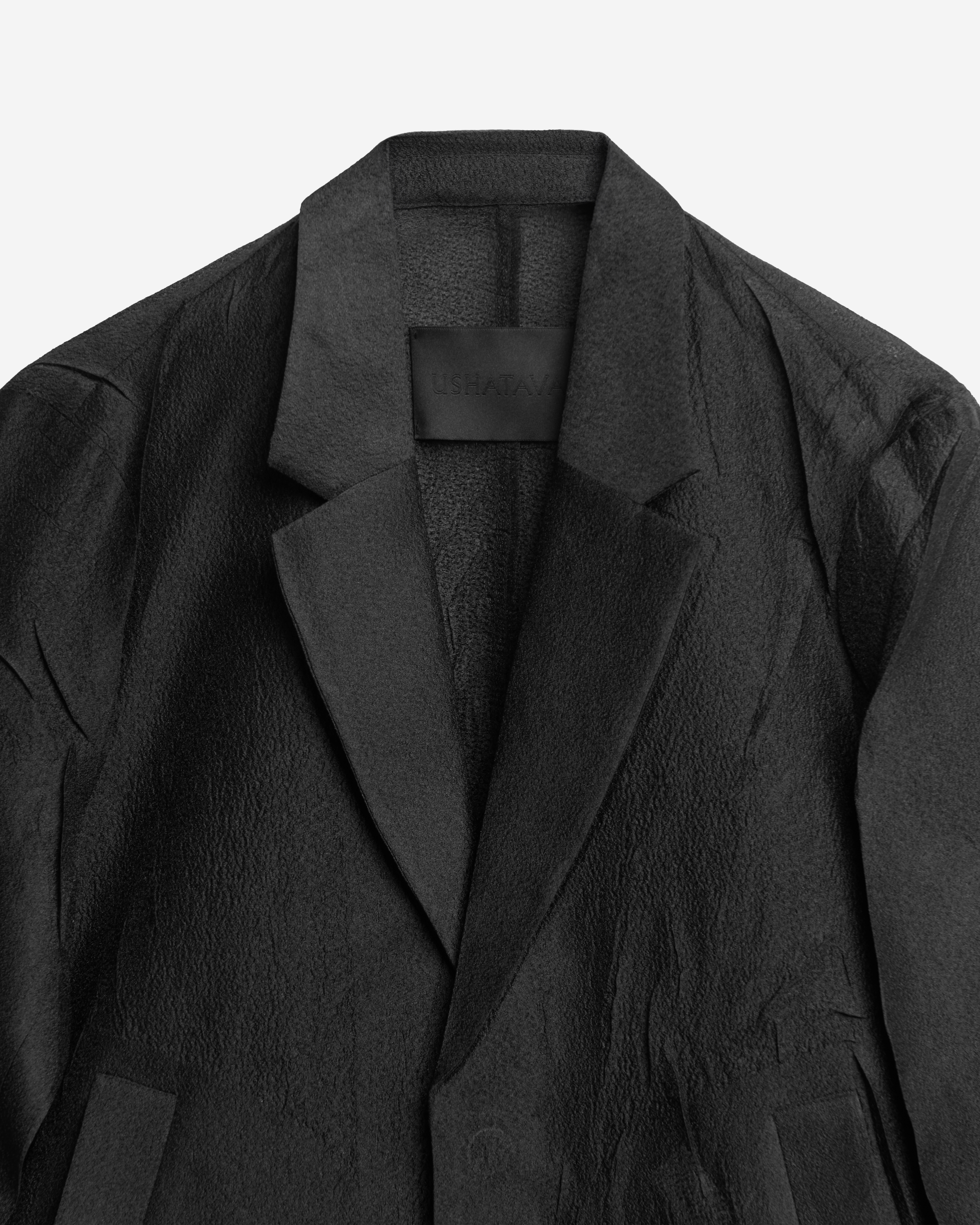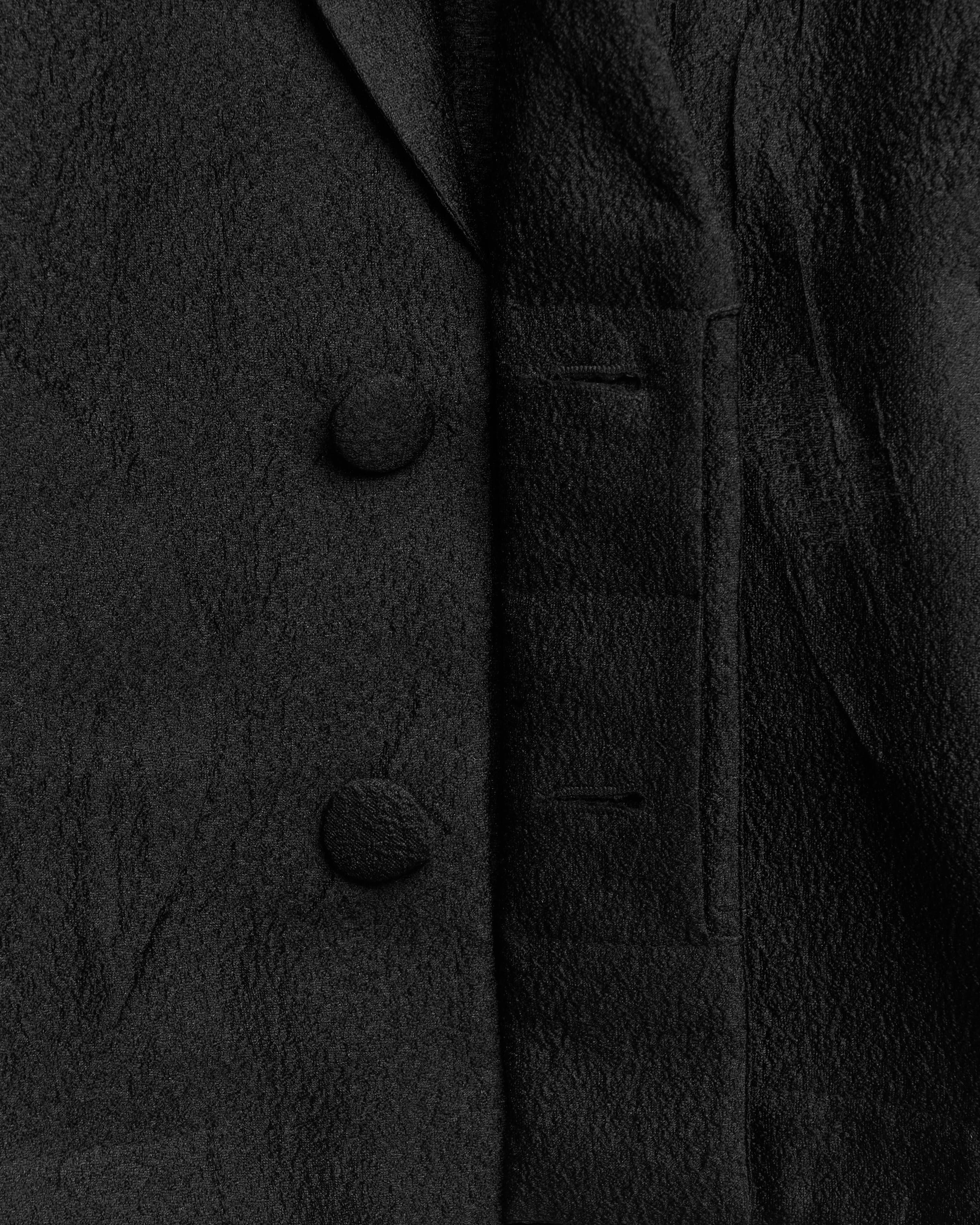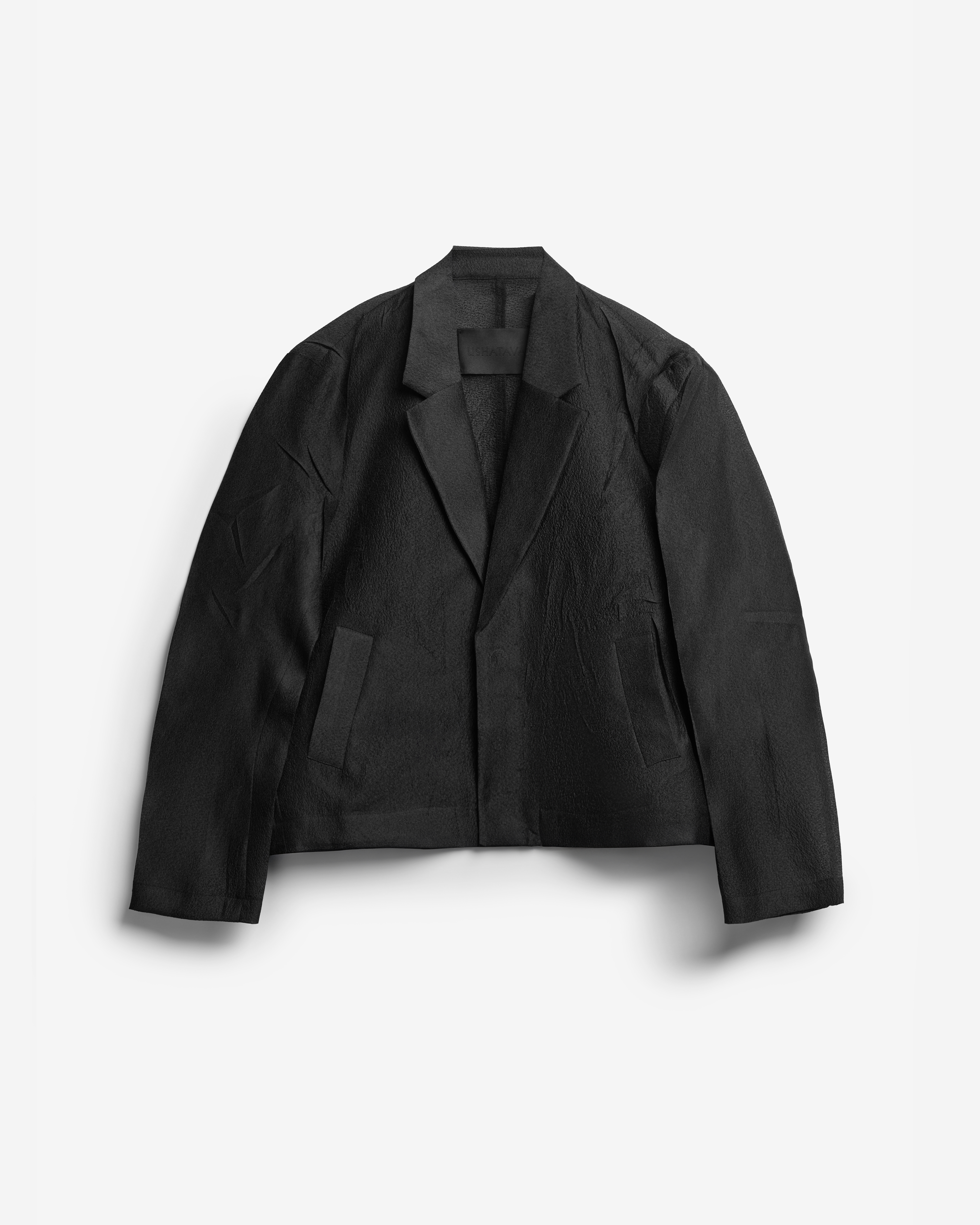 Пиджак выполнен из плотной полупрозрачной органзы. Хаотичные складки, заложенные вручную, напоминают следы времени, которые приобретает праздничная вещь, дожидаясь своего выхода. Изделие застегивается на две пуговицы, обтянутые тканью. У пиджака есть два боковых кармана.