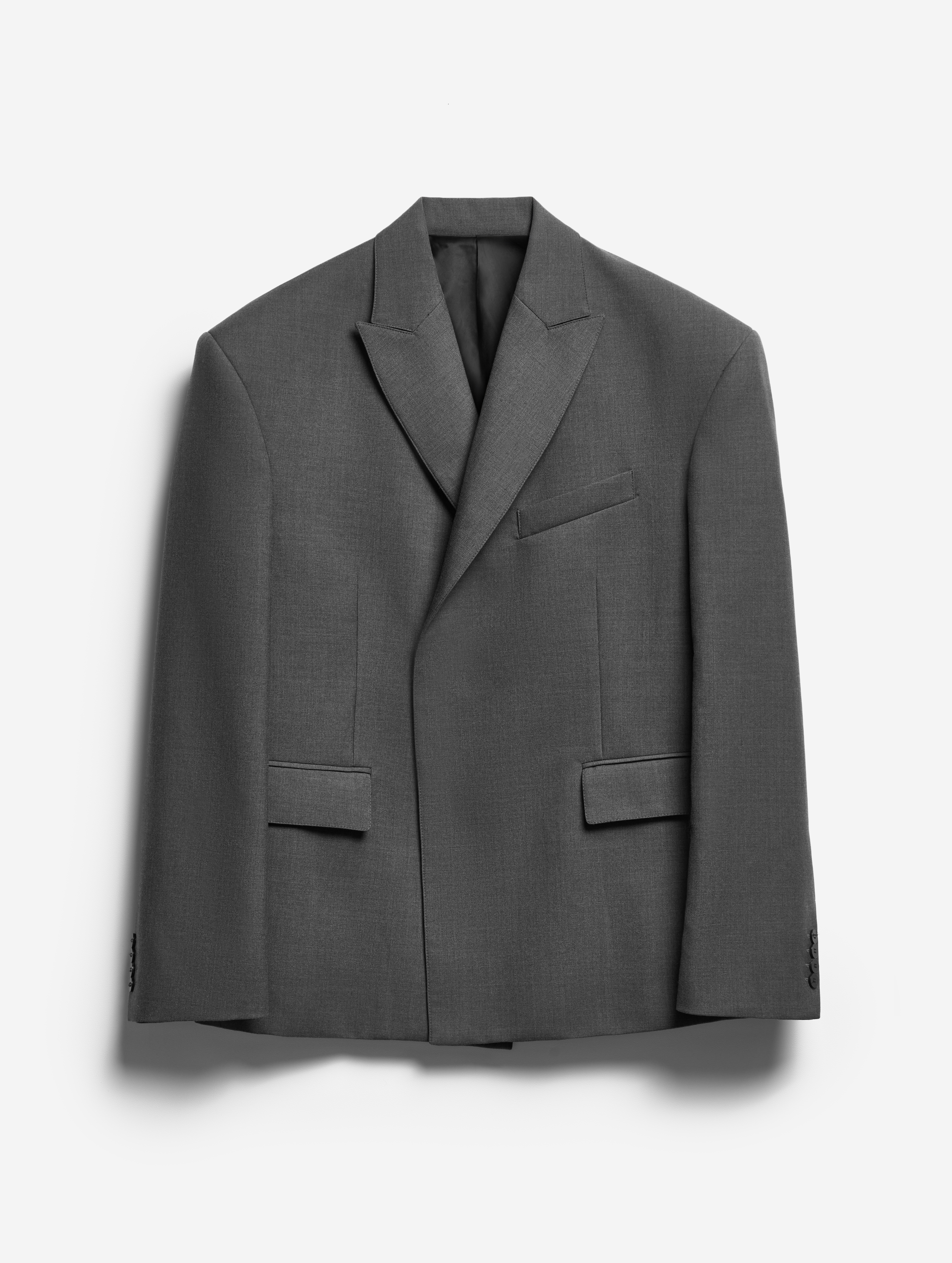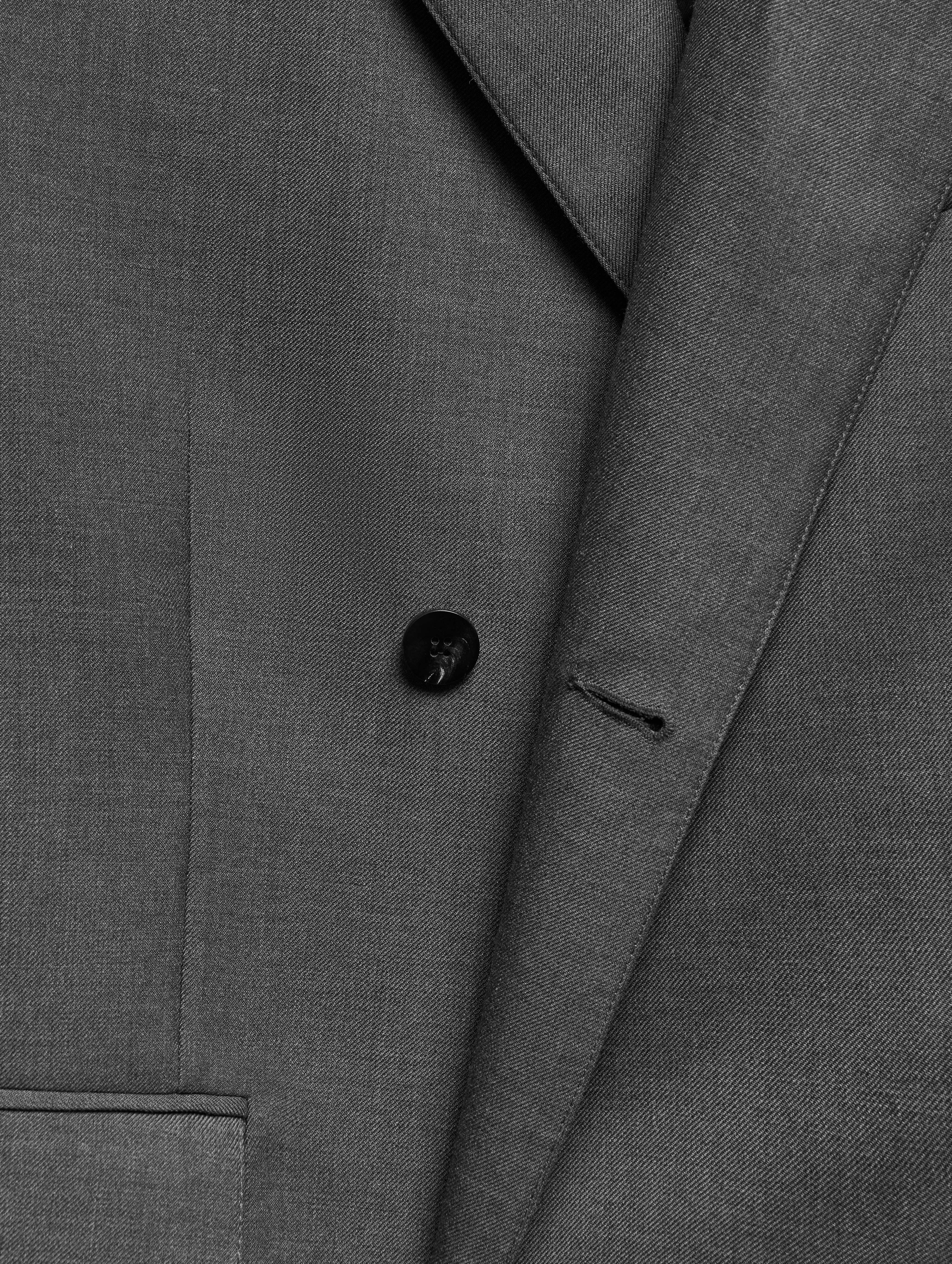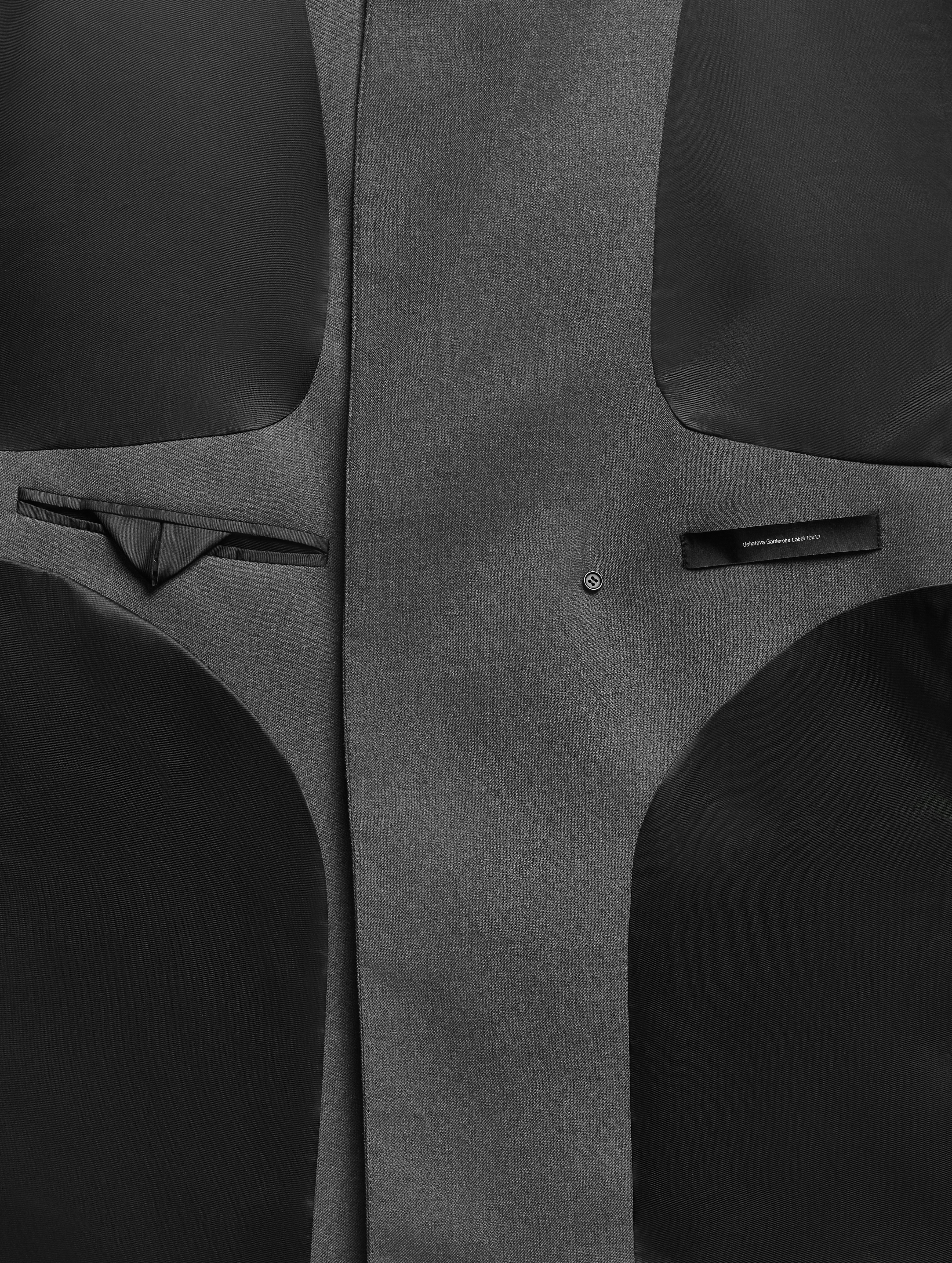 У пиджака объемные, выдающиеся плечи. В области груди изделие продублировано несколькими типами прокладок на основе конского волоса, поэтому пиджак будет долгие годы сохранять свою форму. У модели два боковых кармана и один нагрудный. Внутри тоже есть карман — на петле и пуговице. Пиджак застегивается на обтянутую сатином кнопку, которая намерено смещена от центра для создания эффекта запаха.