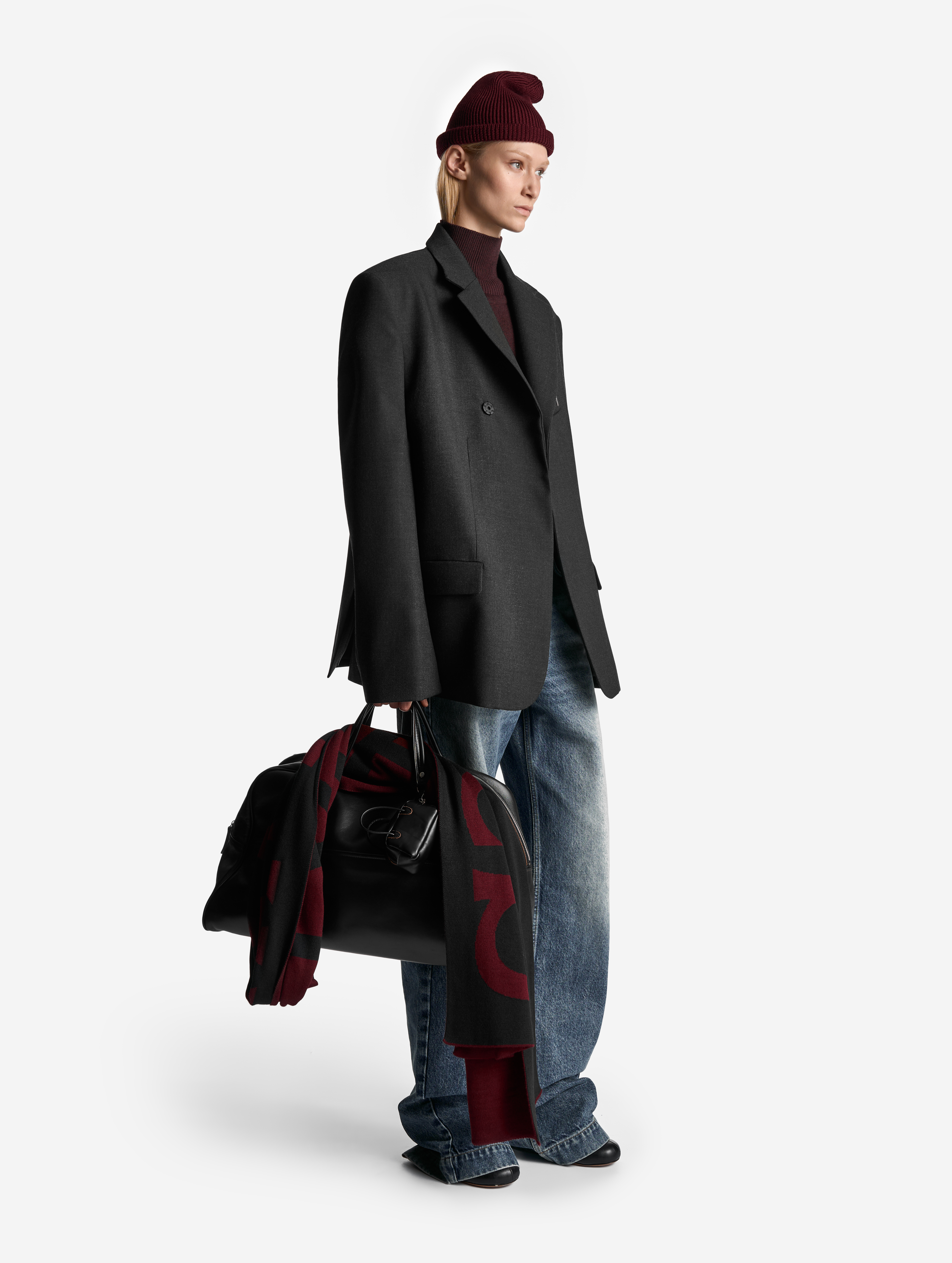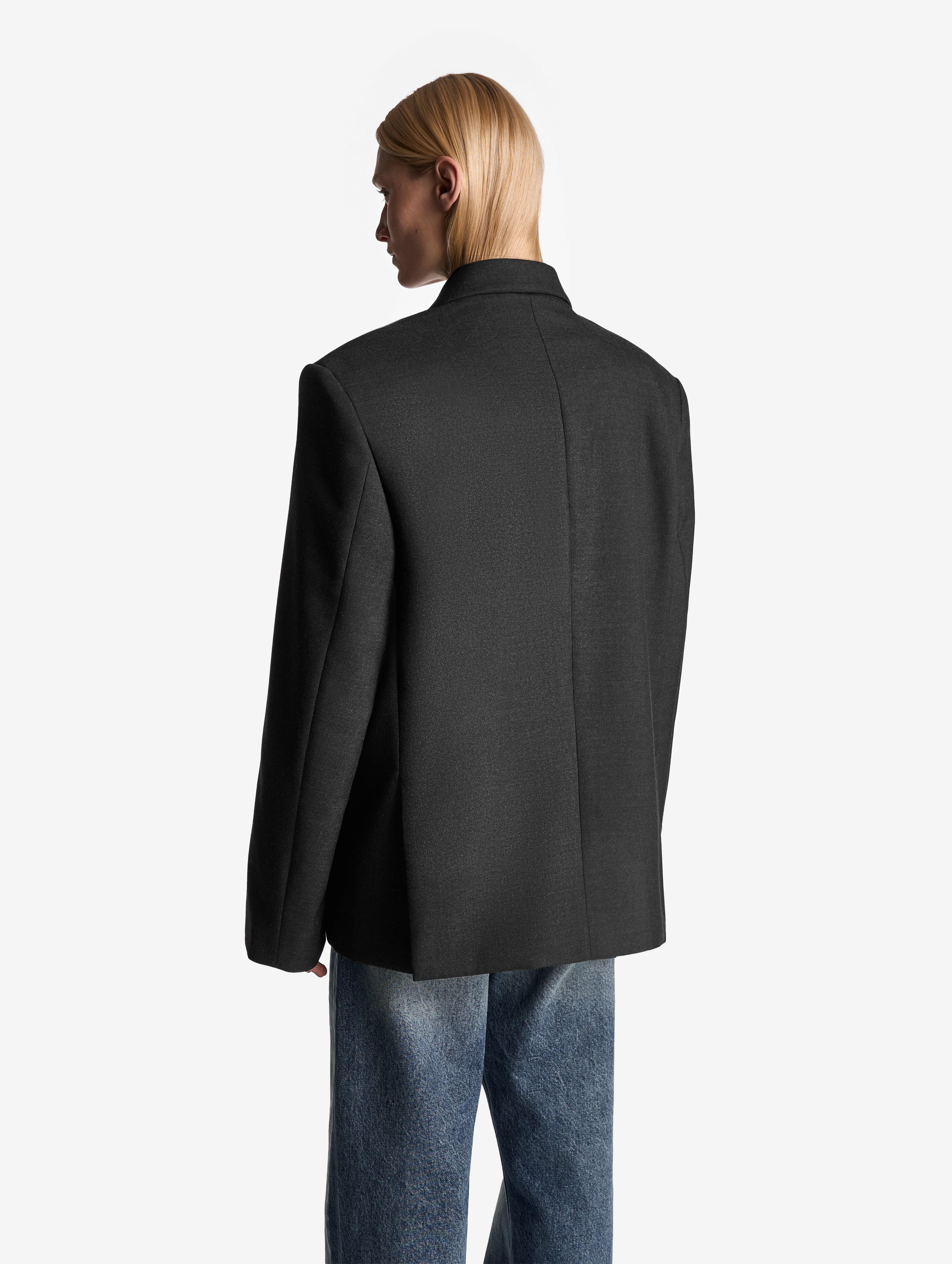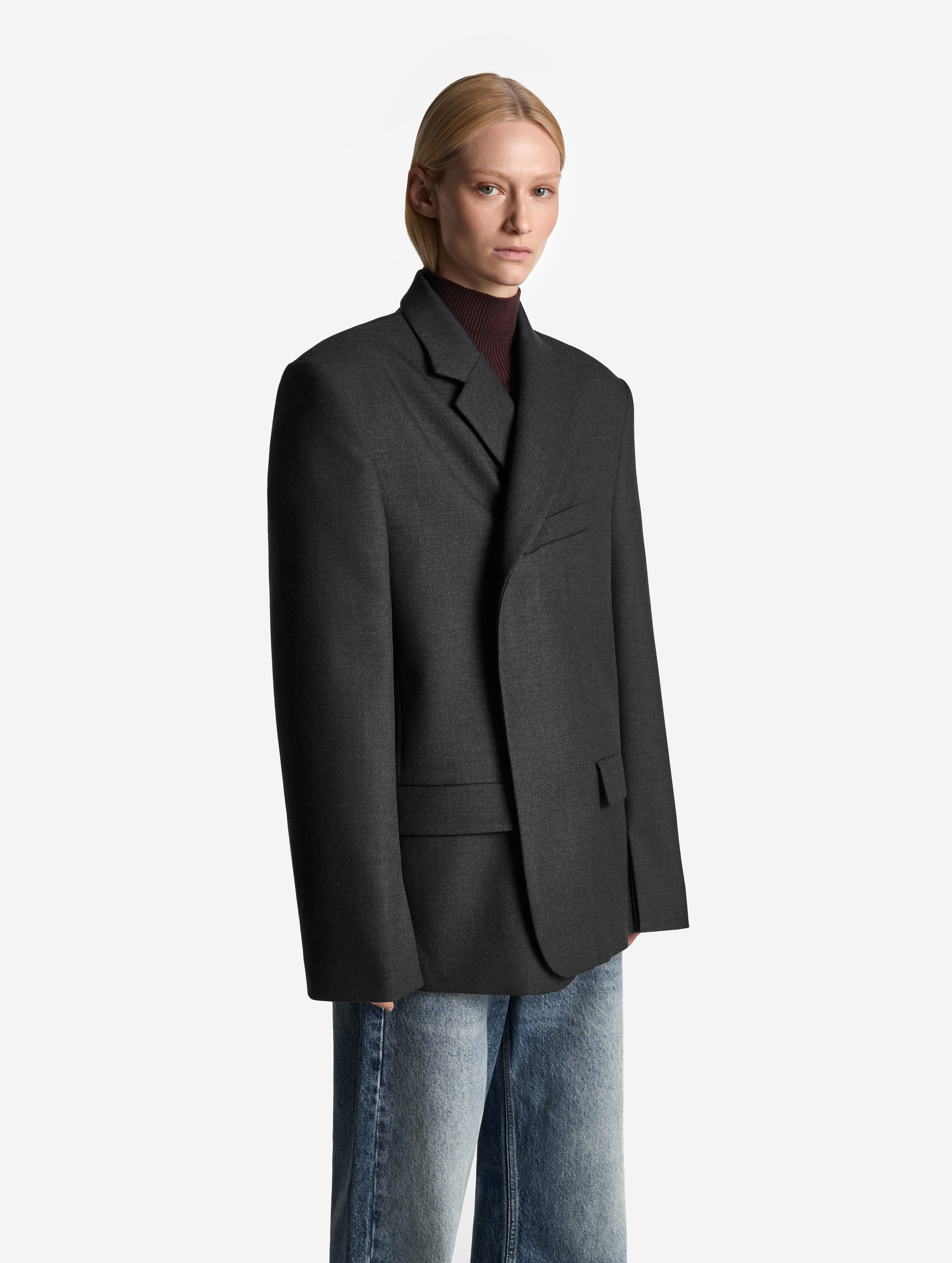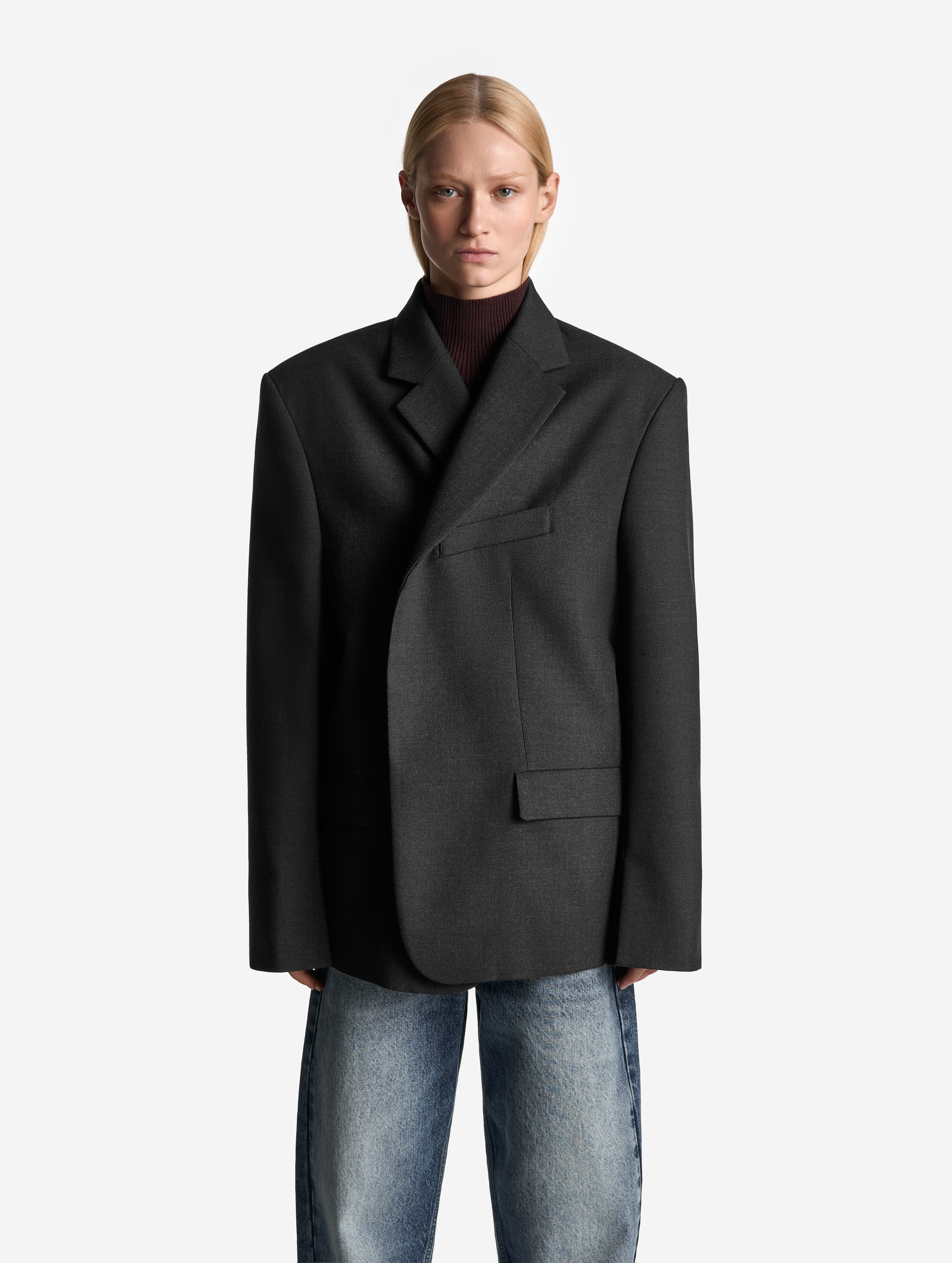 У пиджака объемные, выдающиеся плечи. В области груди изделие продублировано несколькими типами прокладок на основе конского волоса, поэтому пиджак будет долгие годы сохранять свою форму. У модели два боковых кармана и один нагрудный. Внутри тоже есть карман — на петле и пуговице. Пиджак застегивается на обтянутую сатином кнопку, которая намерено смещена от центра для создания эффекта запаха.