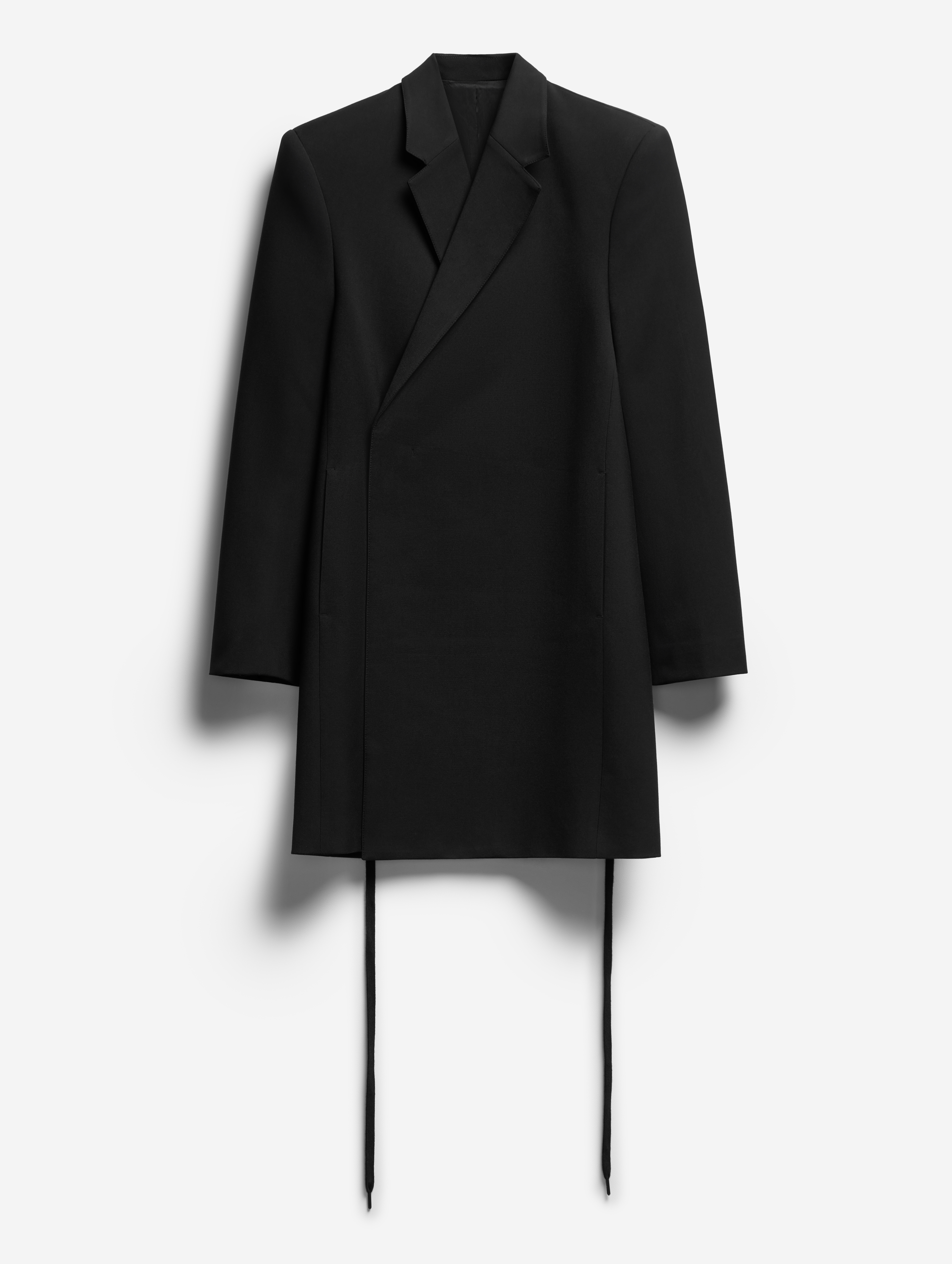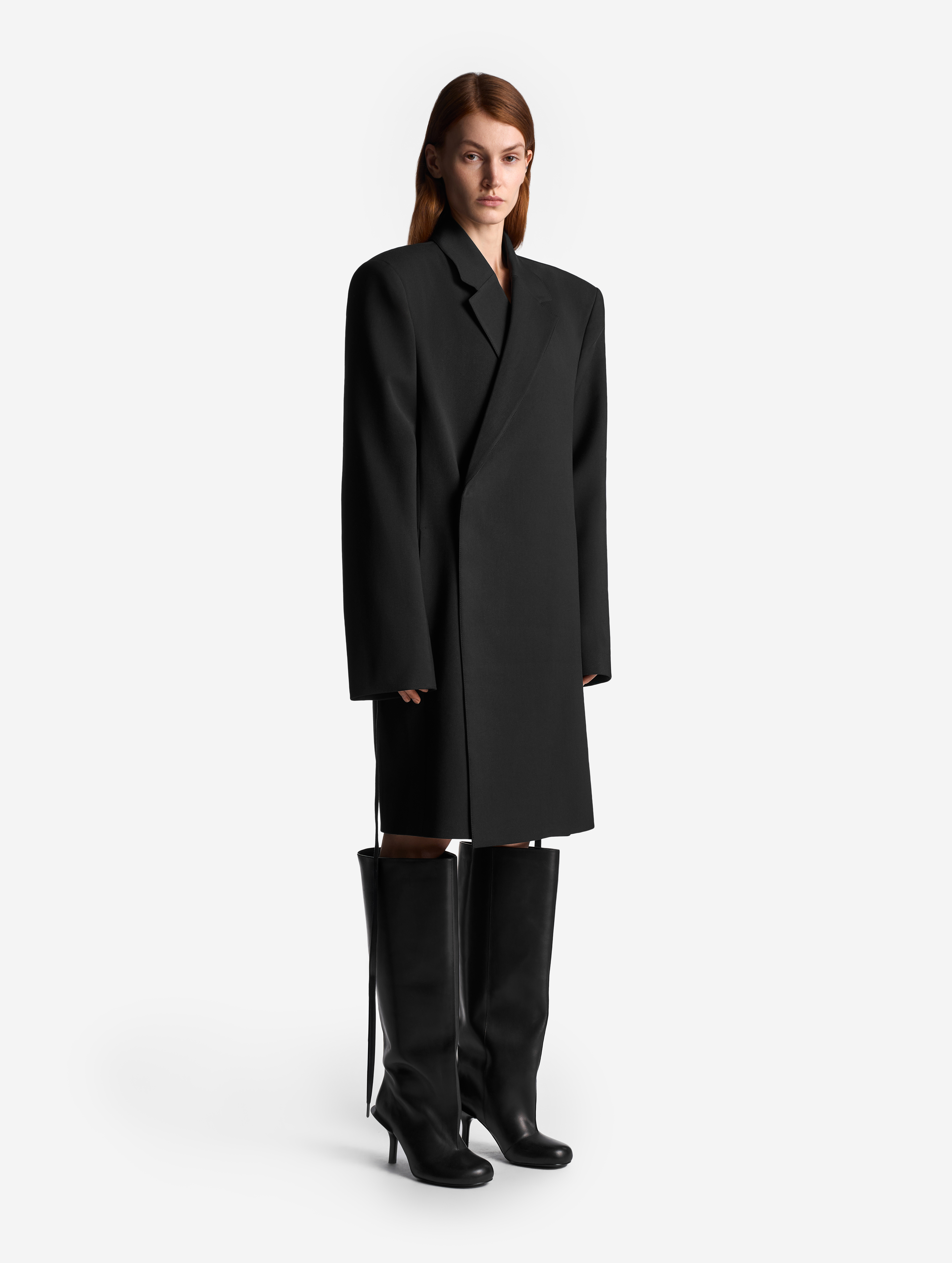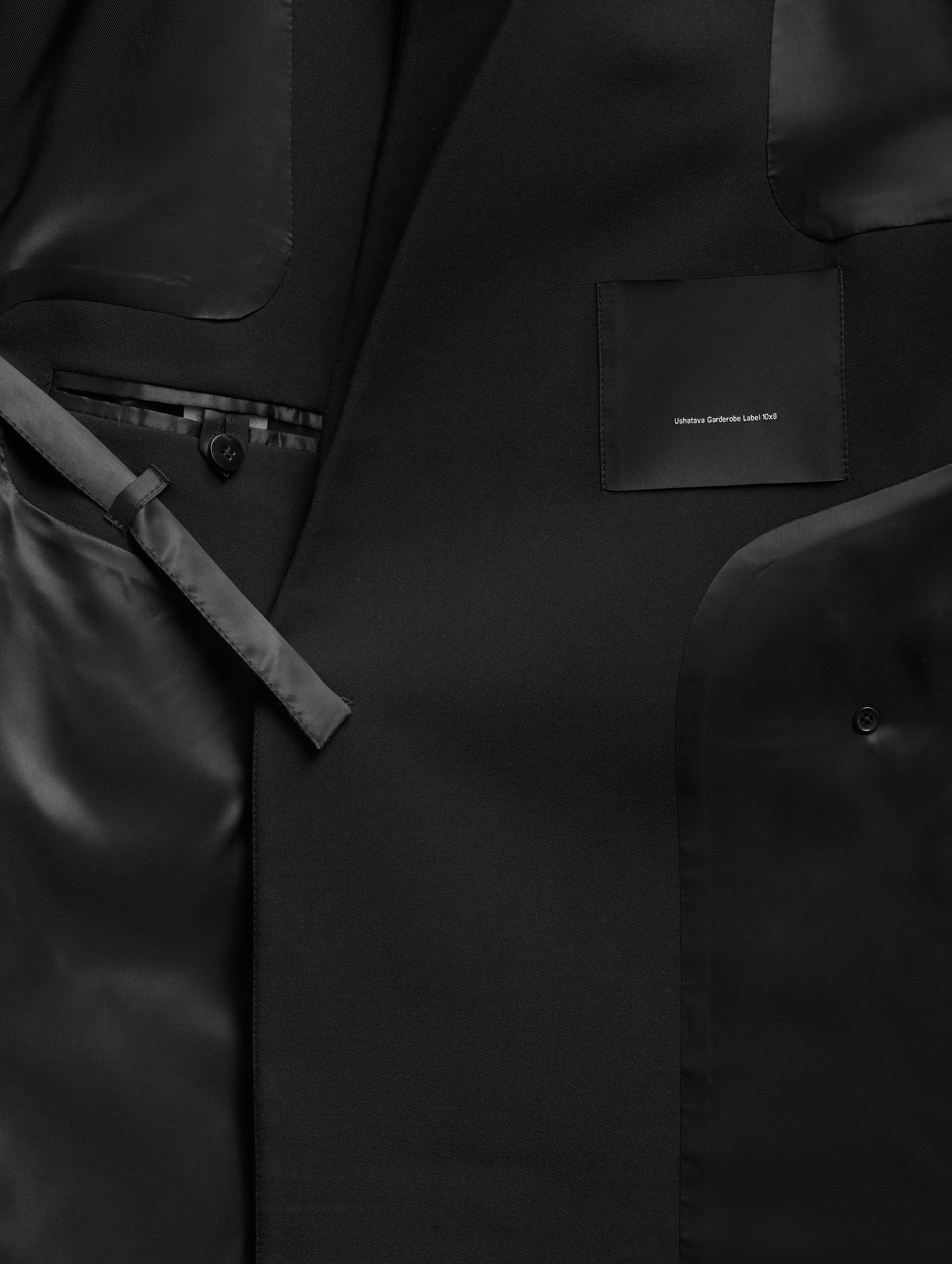 Если посмотреть на пальто в анфас, оно напомнит бумажную одежду для кукол. Мы назвали такой эффект плоским кроем: он достигается посредством оверсайз-посадки, скрывающей изгибы тела, и прямого угла широкого плеча. По бокам изделия вшиты шнурки, которые можно затягивать, чтобы пальто обрело объем, а силуэт перешел в разряд приталенных. Модель выполнена из итальянской костюмной ткани, которая хорошо держит форму и не мнется.