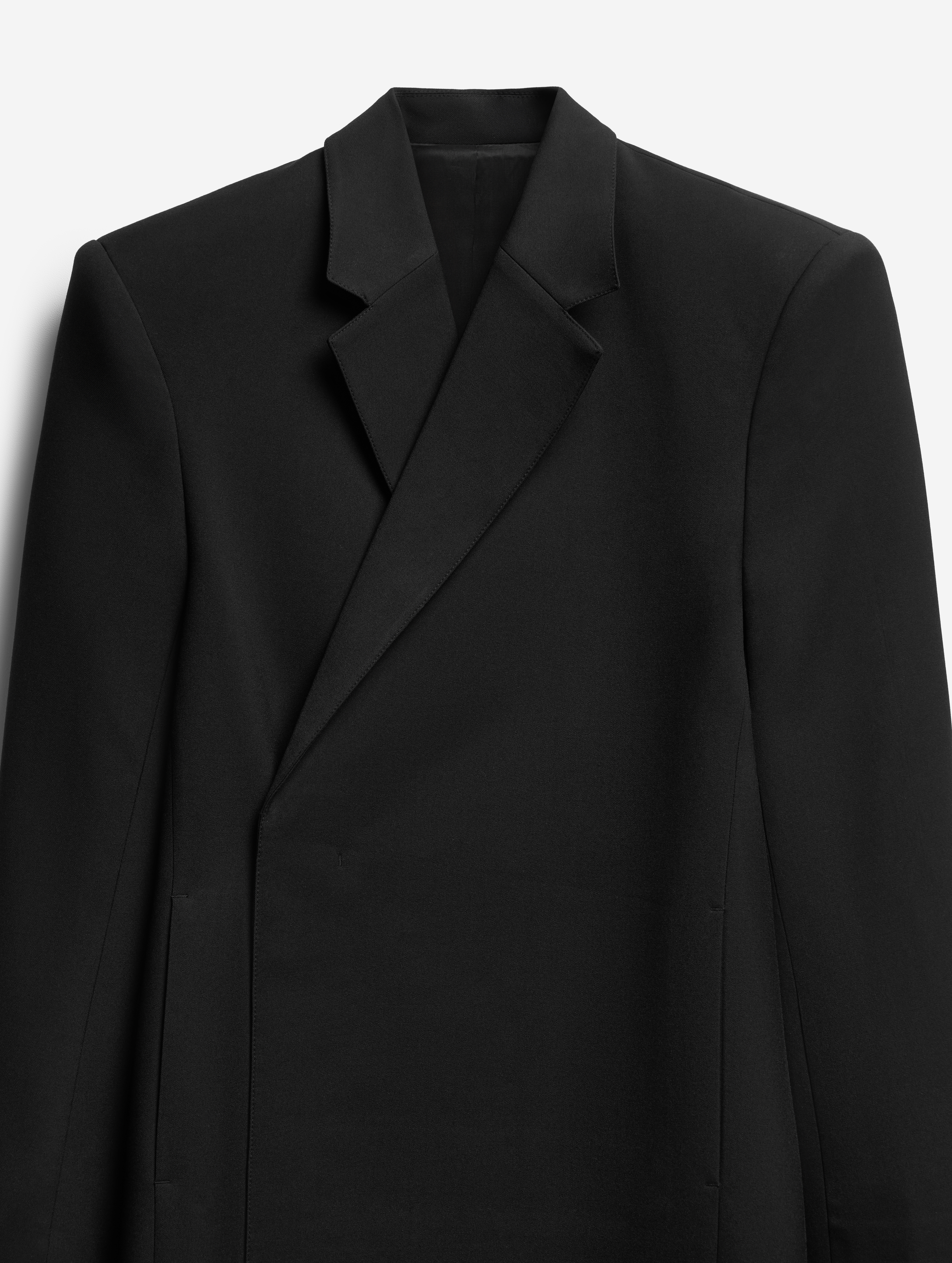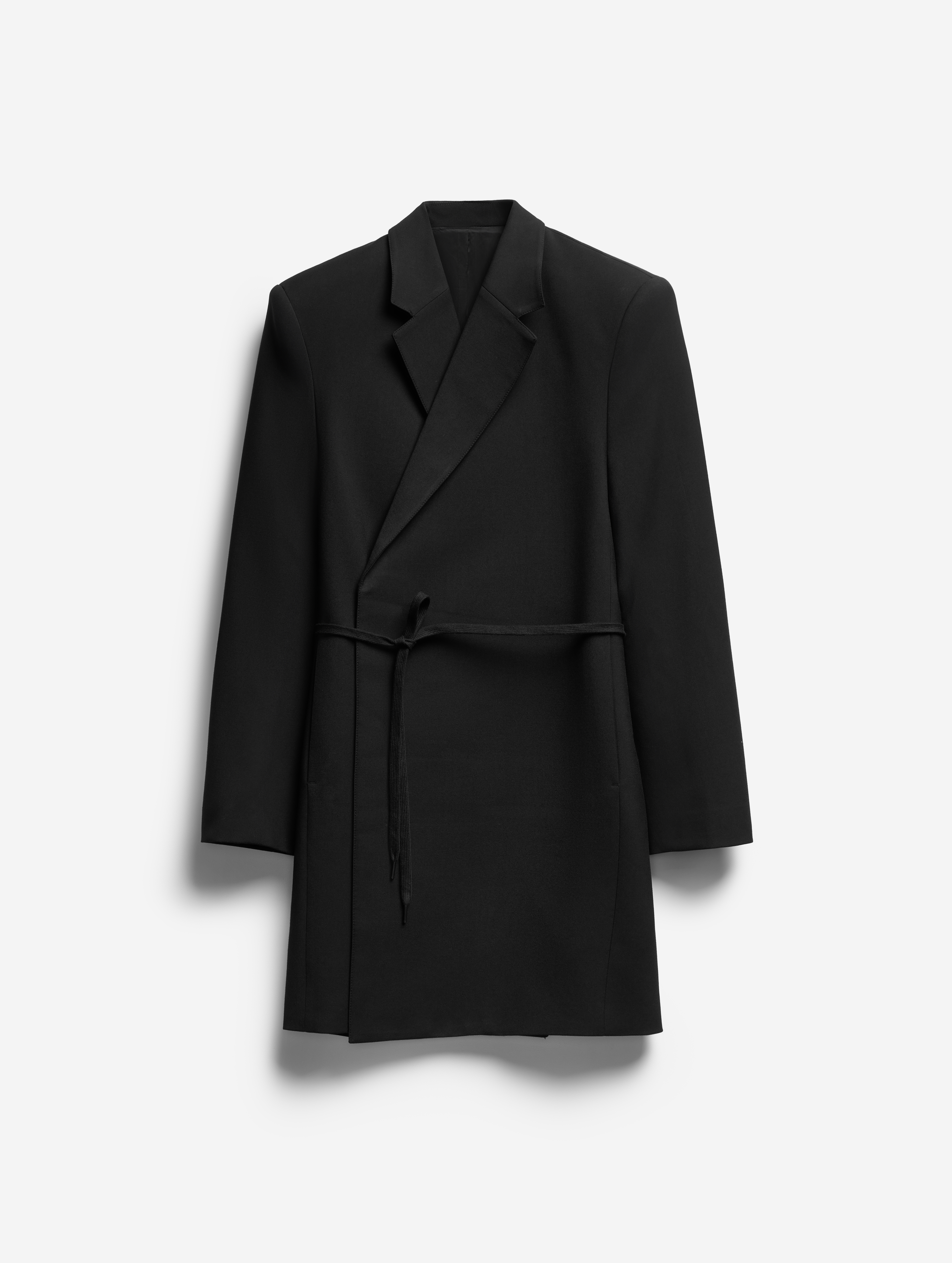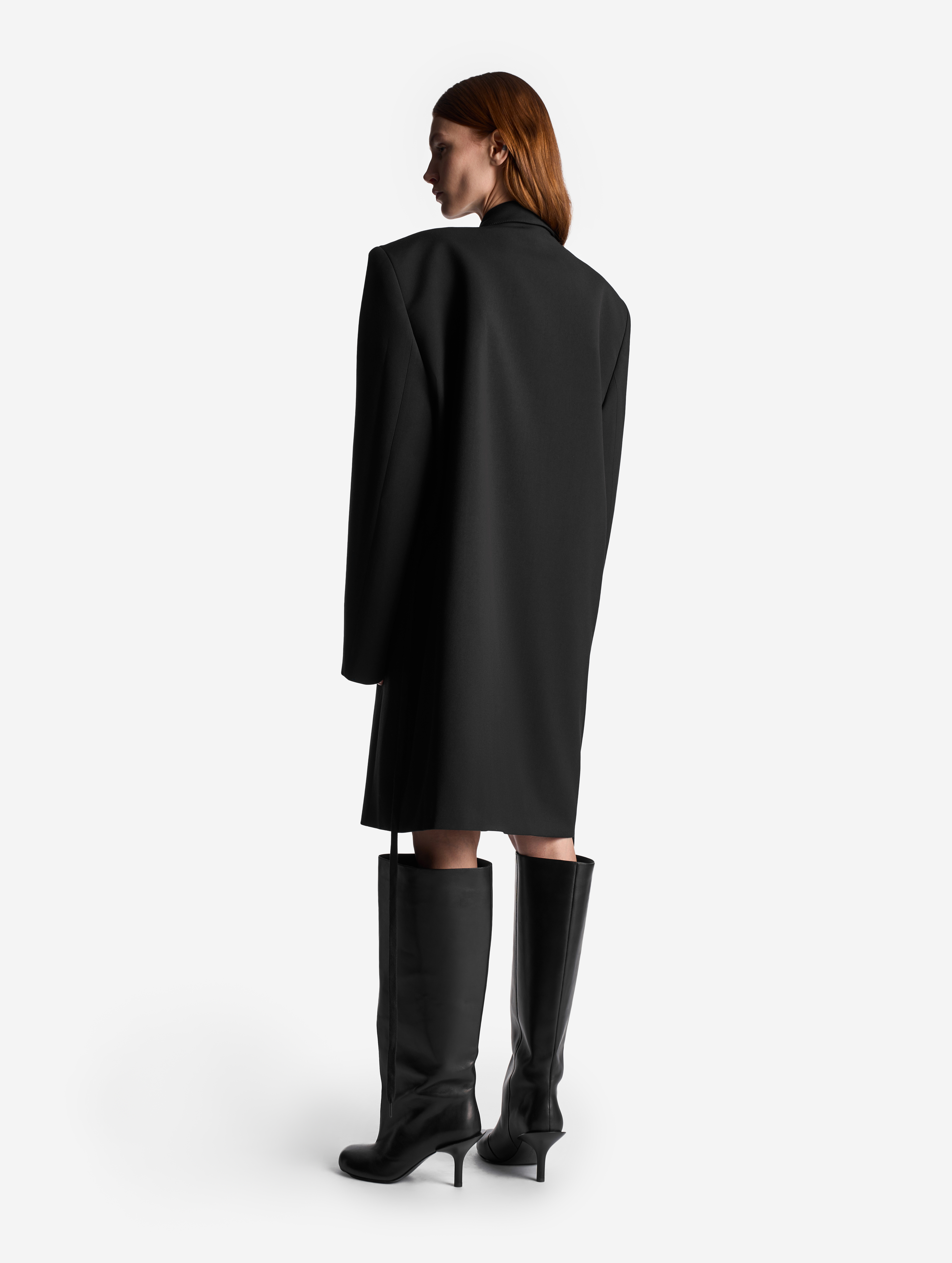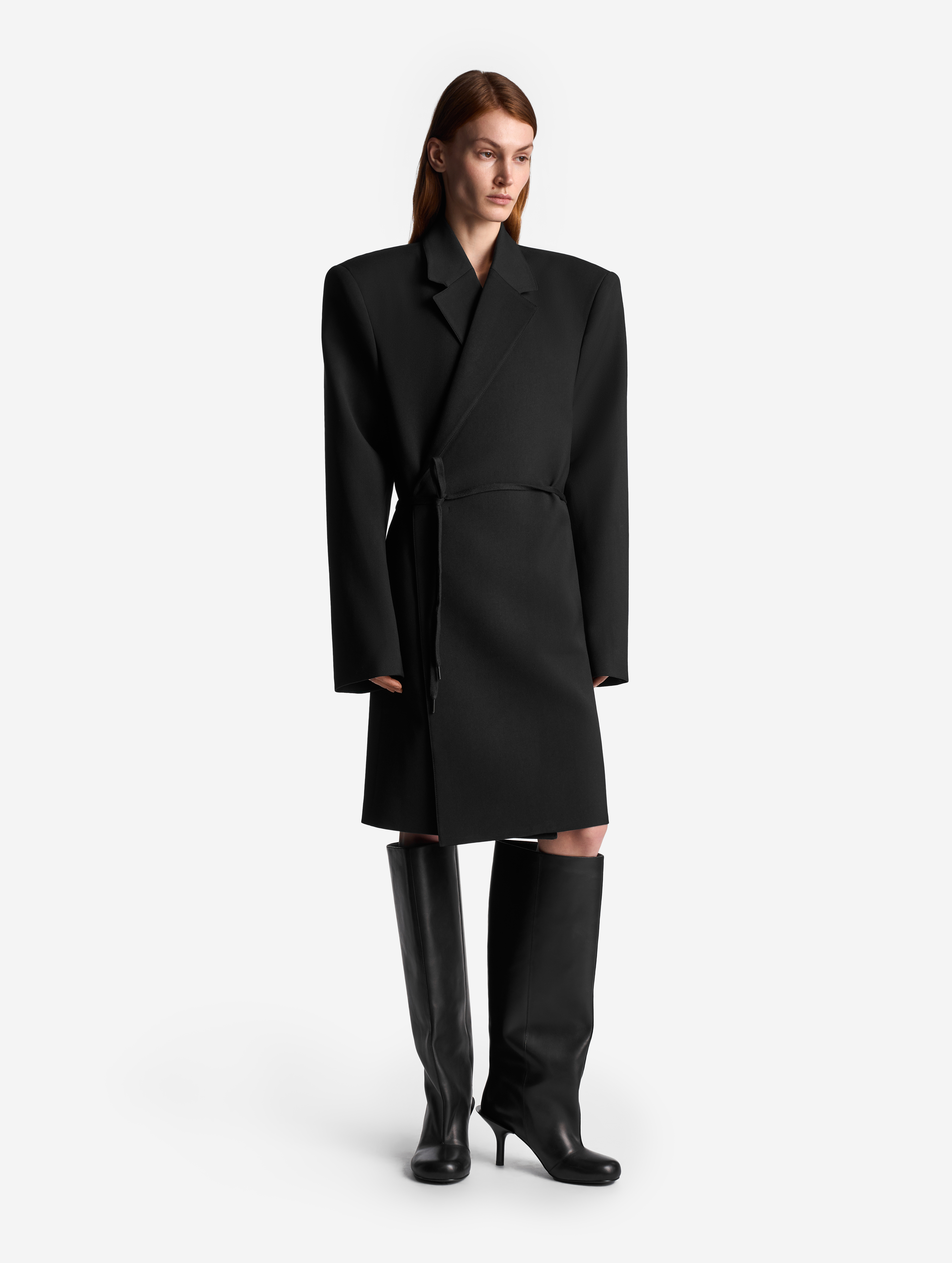 Если посмотреть на пальто в анфас, оно напомнит бумажную одежду для кукол. Мы назвали такой эффект плоским кроем: он достигается посредством оверсайз-посадки, скрывающей изгибы тела, и прямого угла широкого плеча. По бокам изделия вшиты шнурки, которые можно затягивать, чтобы пальто обрело объем, а силуэт перешел в разряд приталенных. Модель выполнена из итальянской костюмной ткани, которая хорошо держит форму и не мнется.