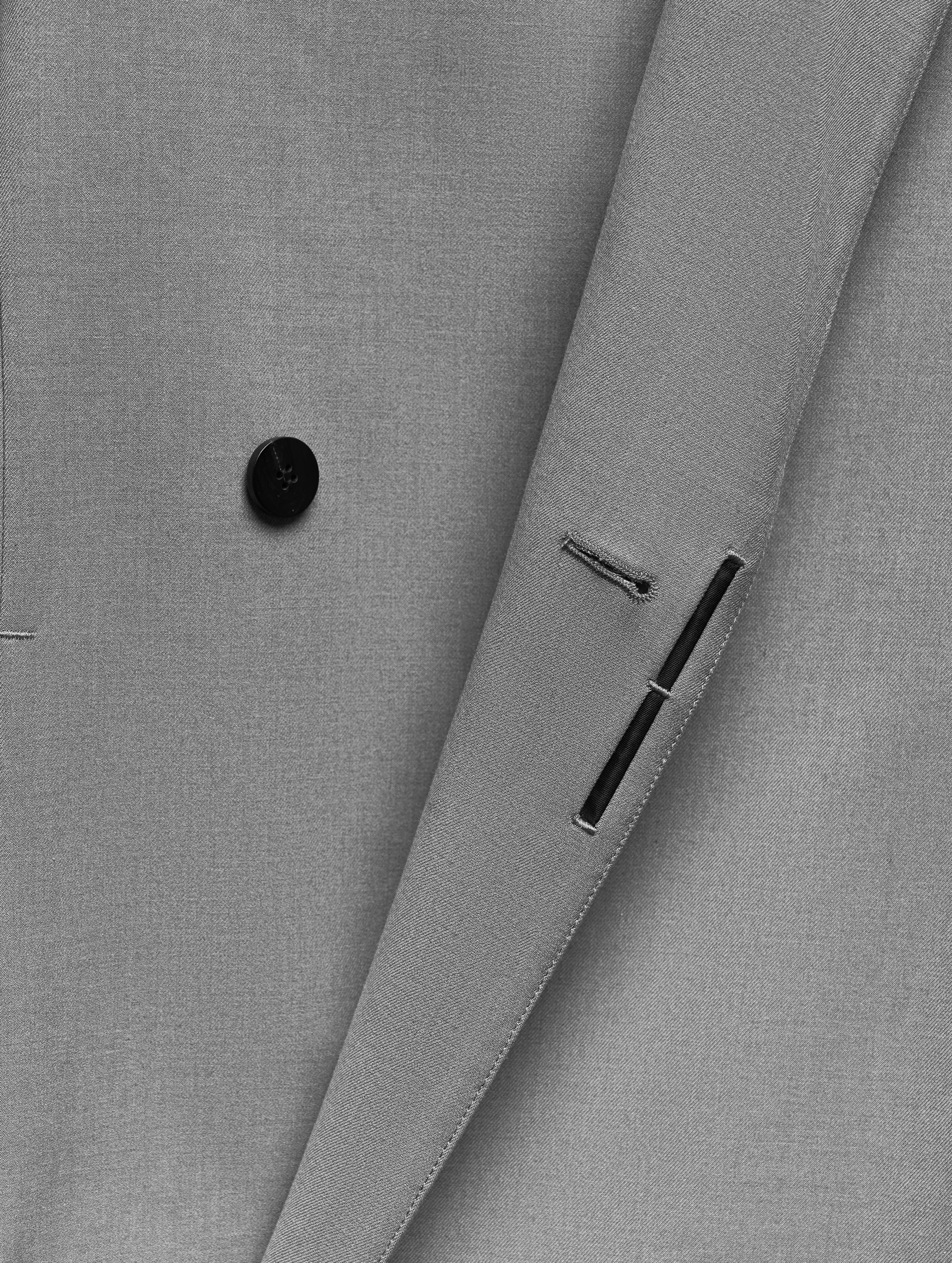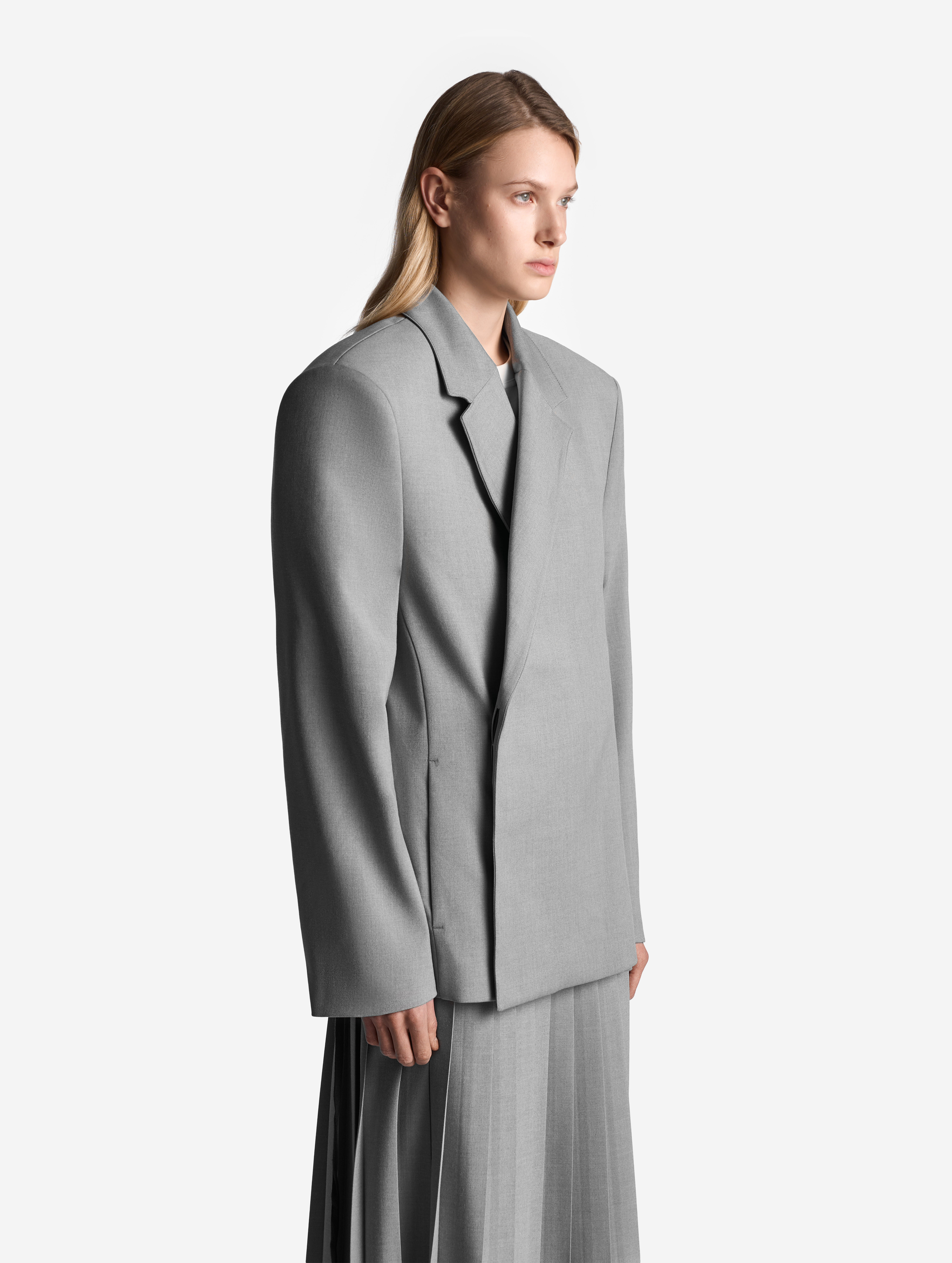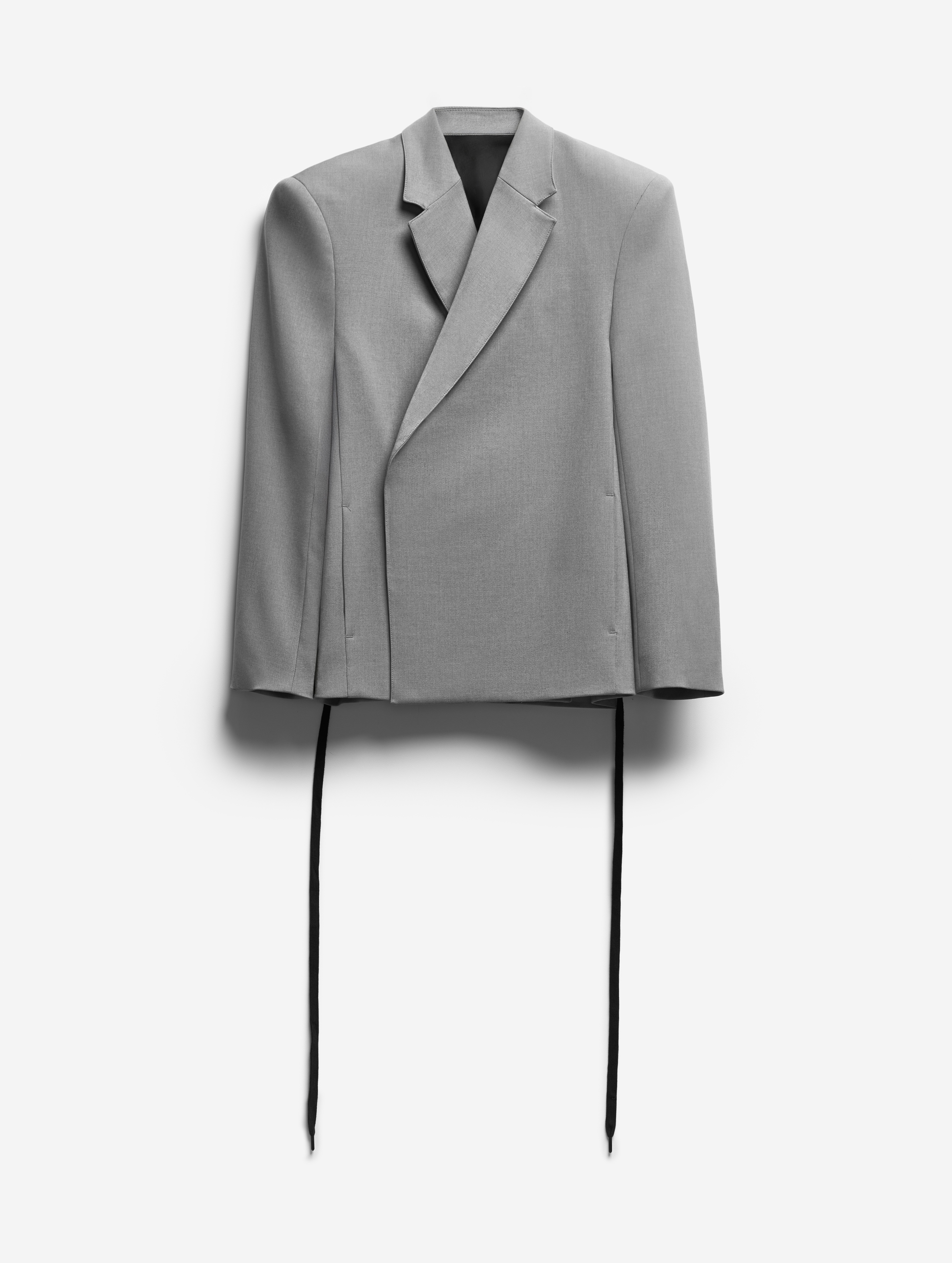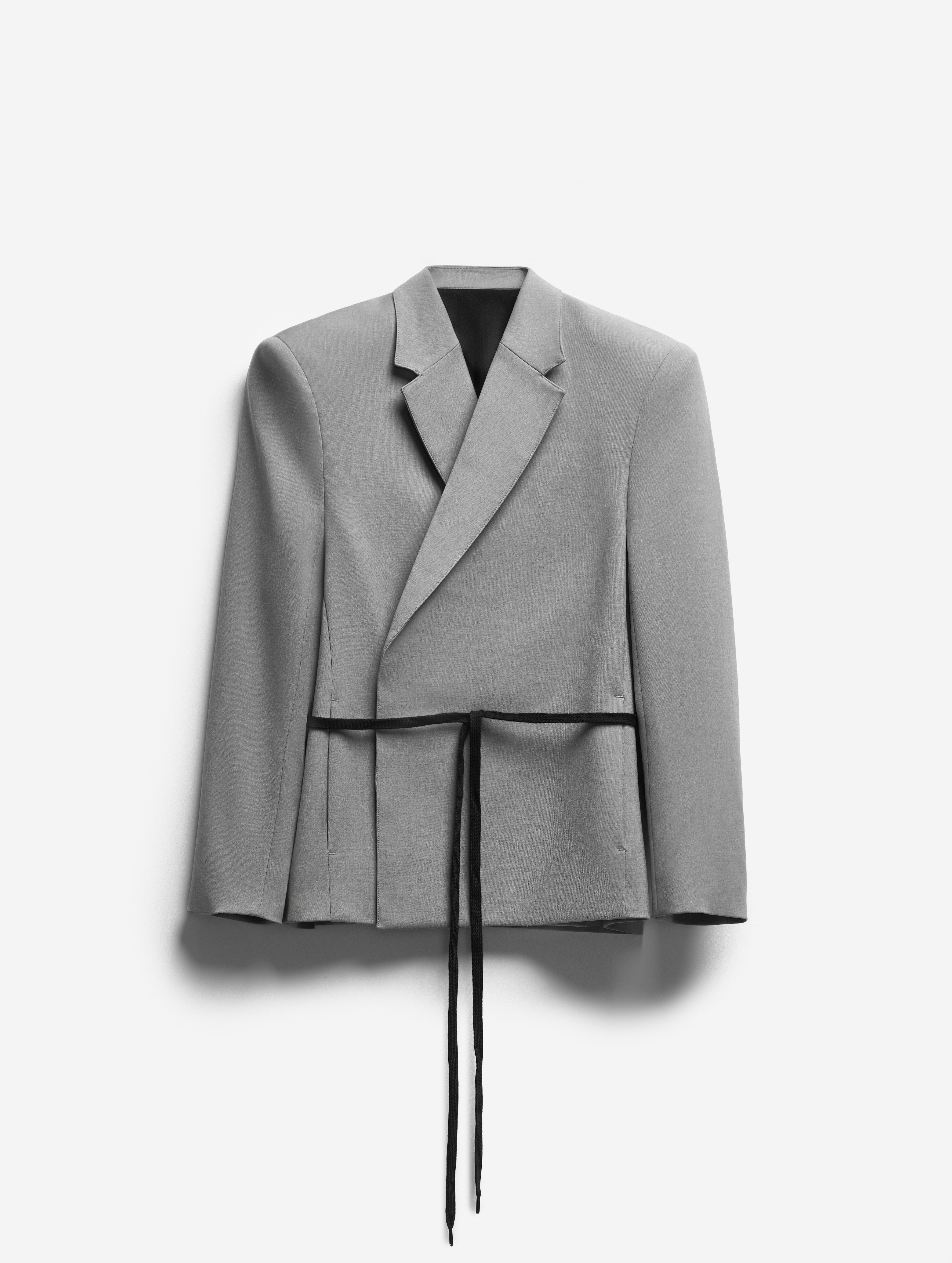 Если посмотреть на пиджак в анфас, он напомнит бумажную одежду для кукол. Мы назвали такой эффект плоским кроем: он достигается посредством оверсайз-посадки, скрывающей изгибы тела, и прямого угла широкого плеча. По бокам изделия вшиты шнурки, которые можно затягивать, чтобы пиджак обрел объем, а силуэт перешел в разряд приталенных. Модель выполнена из итальянской костюмной ткани, которая хорошо держит форму и не мнется.