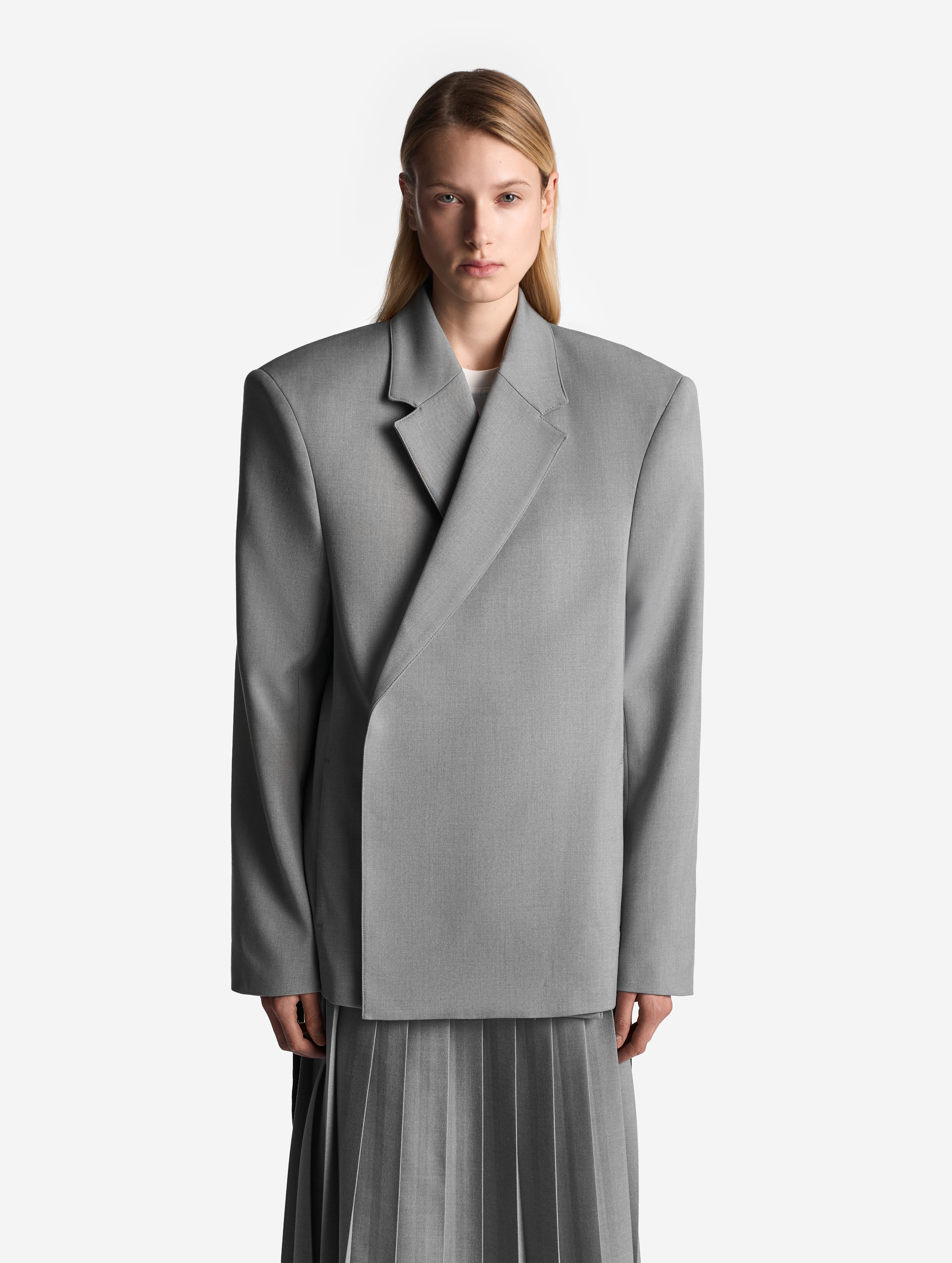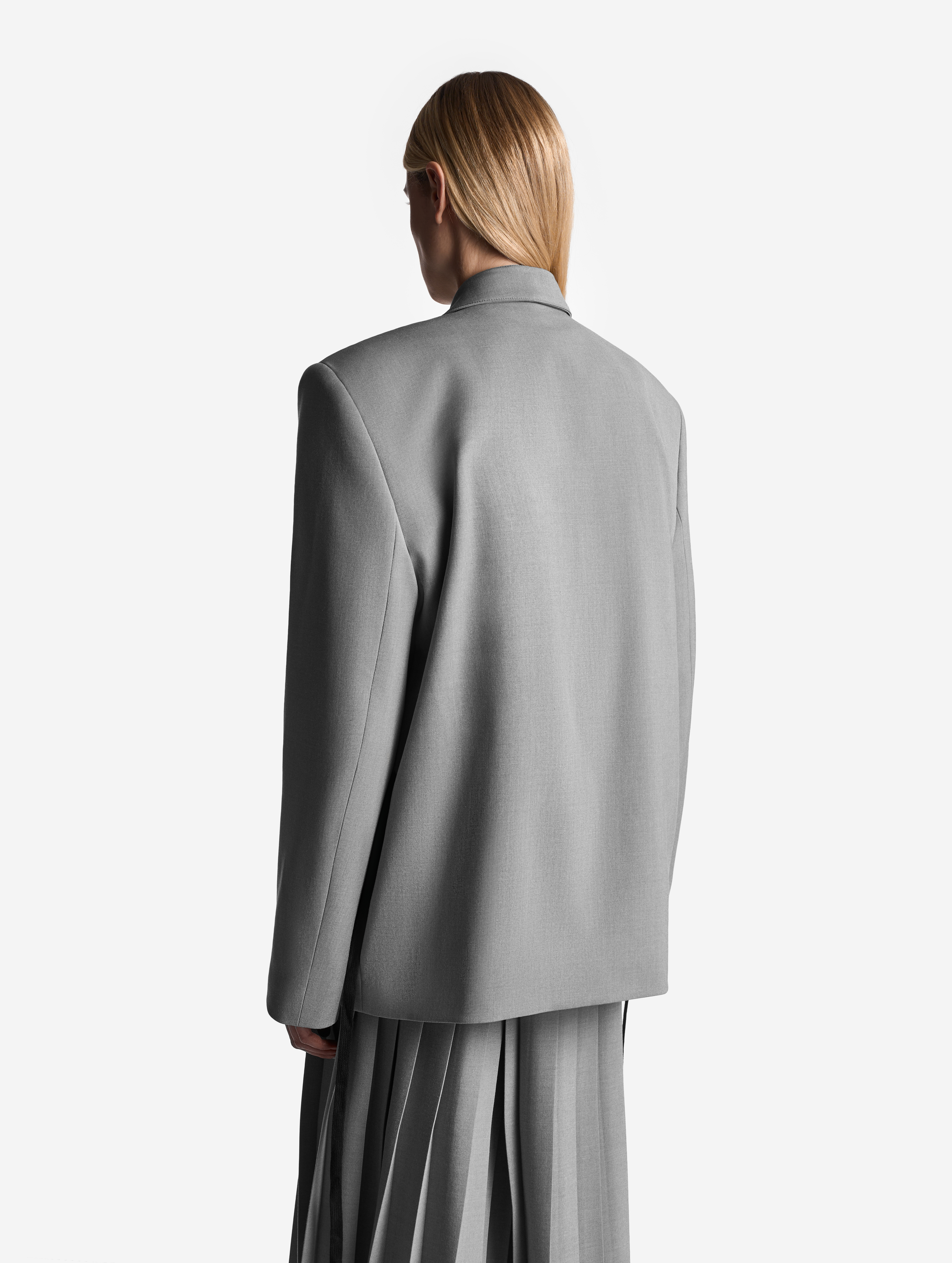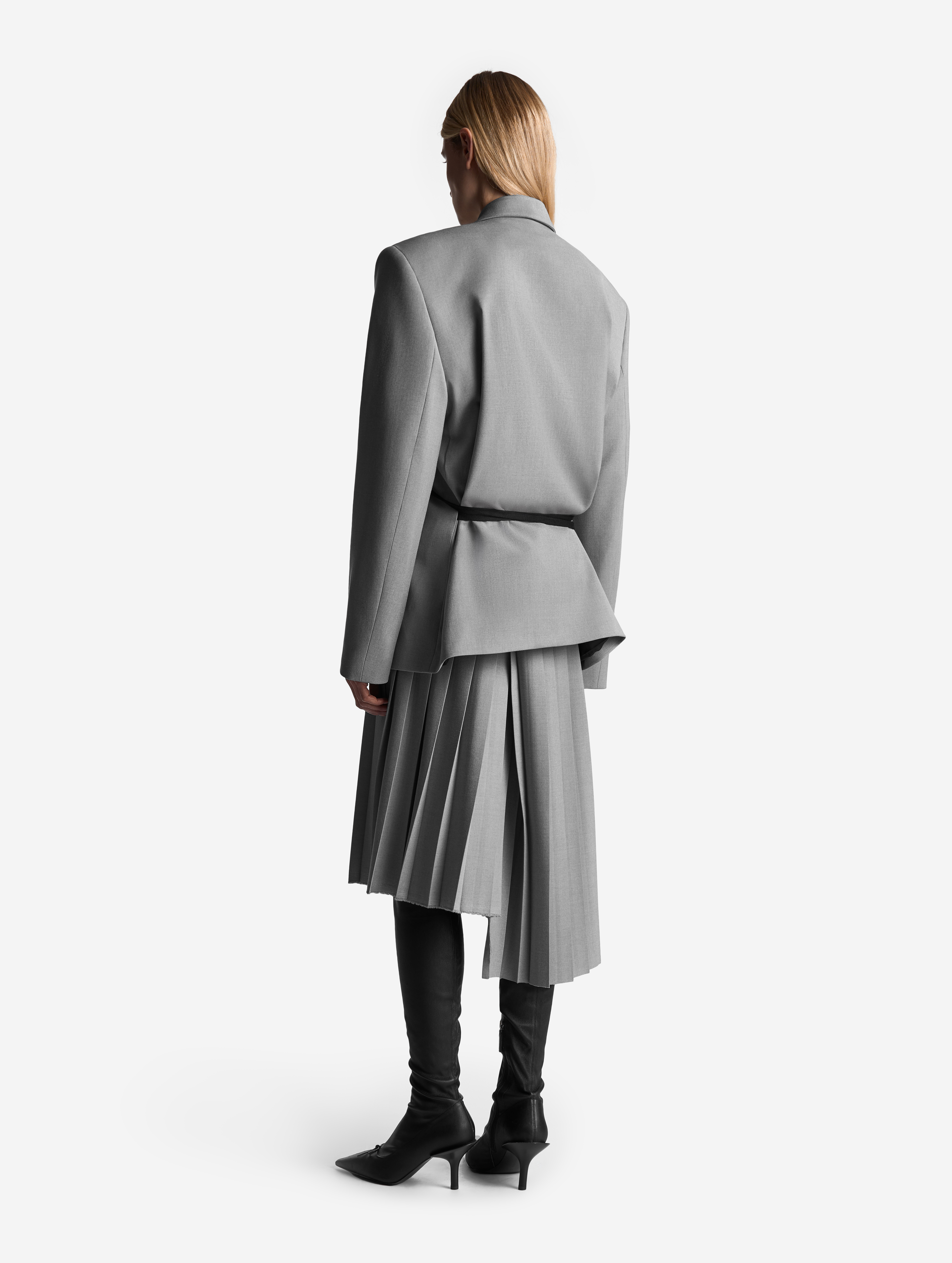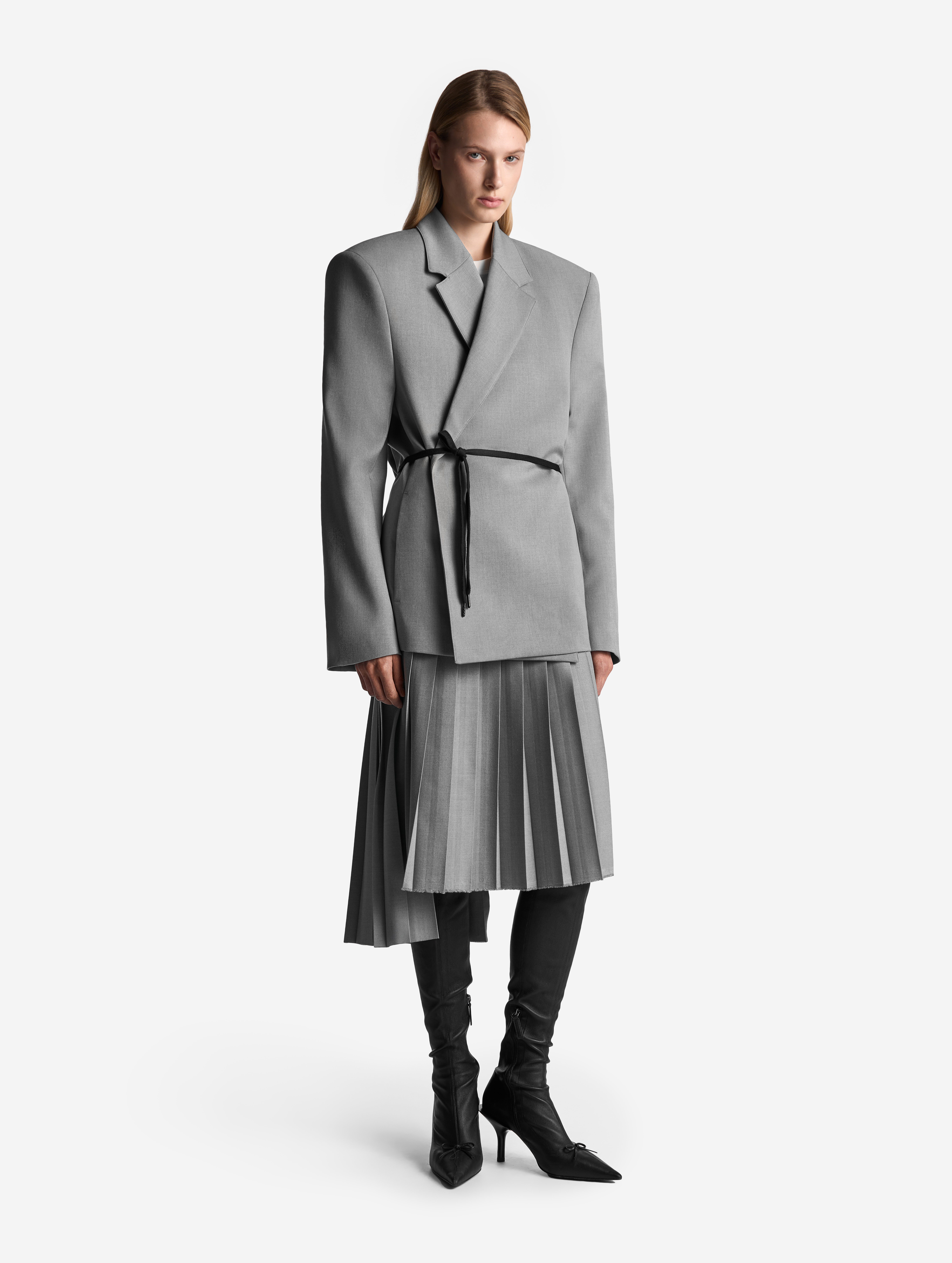 Если посмотреть на пиджак в анфас, он напомнит бумажную одежду для кукол. Мы назвали такой эффект плоским кроем: он достигается посредством оверсайз-посадки, скрывающей изгибы тела, и прямого угла широкого плеча. По бокам изделия вшиты шнурки, которые можно затягивать, чтобы пиджак обрел объем, а силуэт перешел в разряд приталенных. Модель выполнена из итальянской костюмной ткани, которая хорошо держит форму и не мнется.