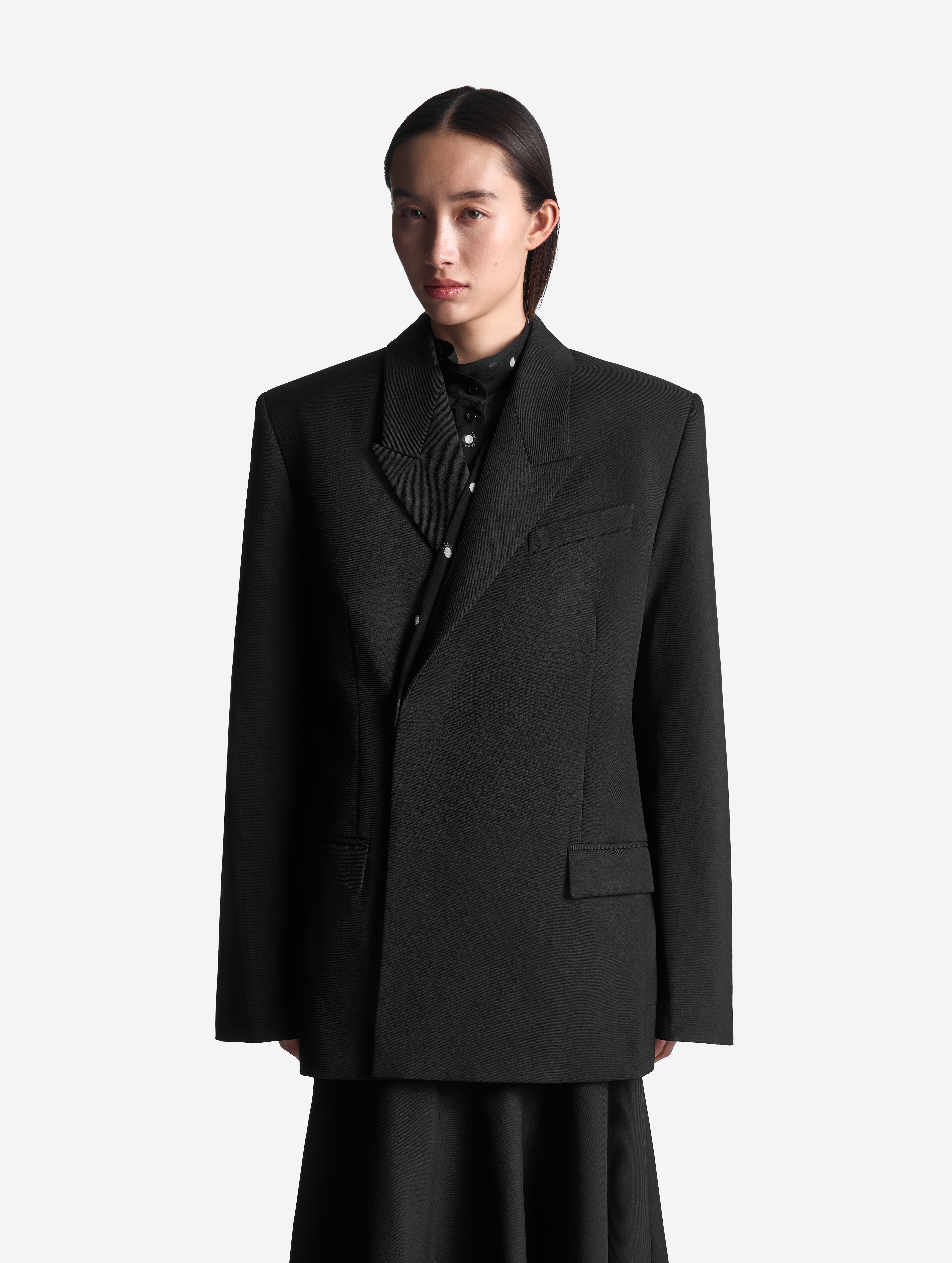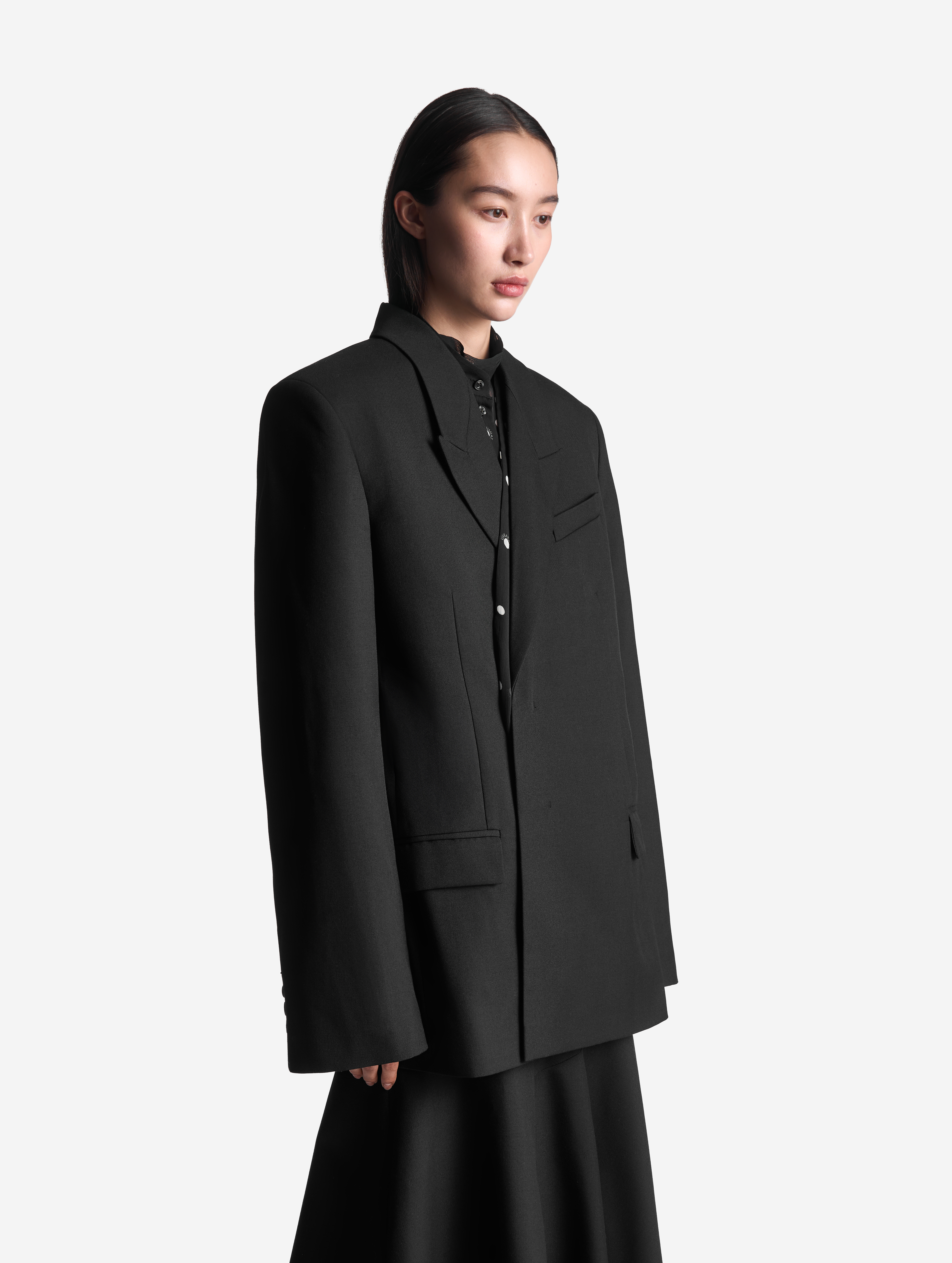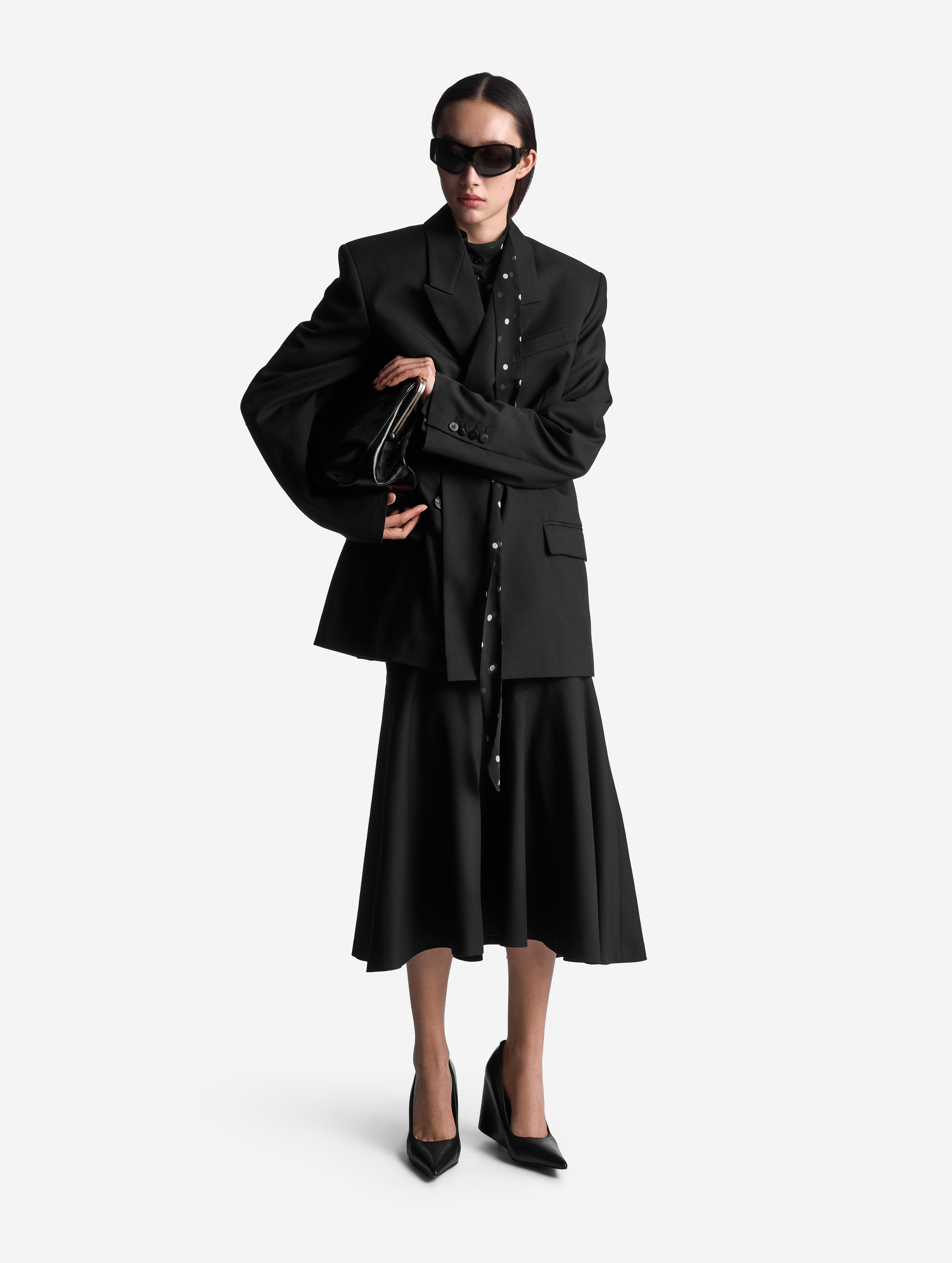 Приталенный удлиненный пиджак — новый силуэт в линии Garderobe. Его конструкцию формируют вытачки, сделанные по всему объему, и две неглубокие шлицы на спинке. У него расширенный плечевой пояс и полуприлегающий крой. Конструкция воротника заслуживает особого внимания: уголки заостренных лацканов подшиты к уголками самого воротника ручными стежками.