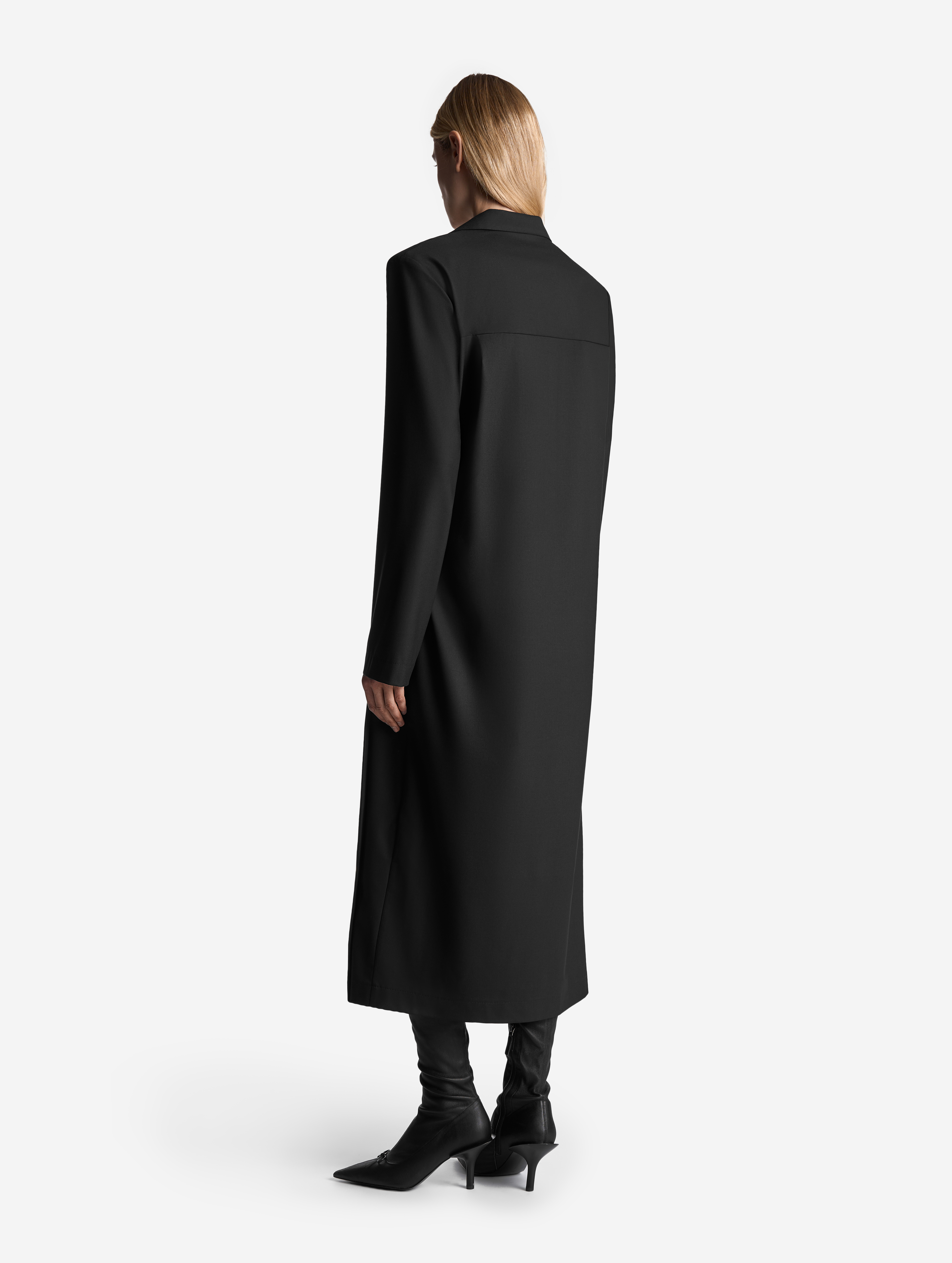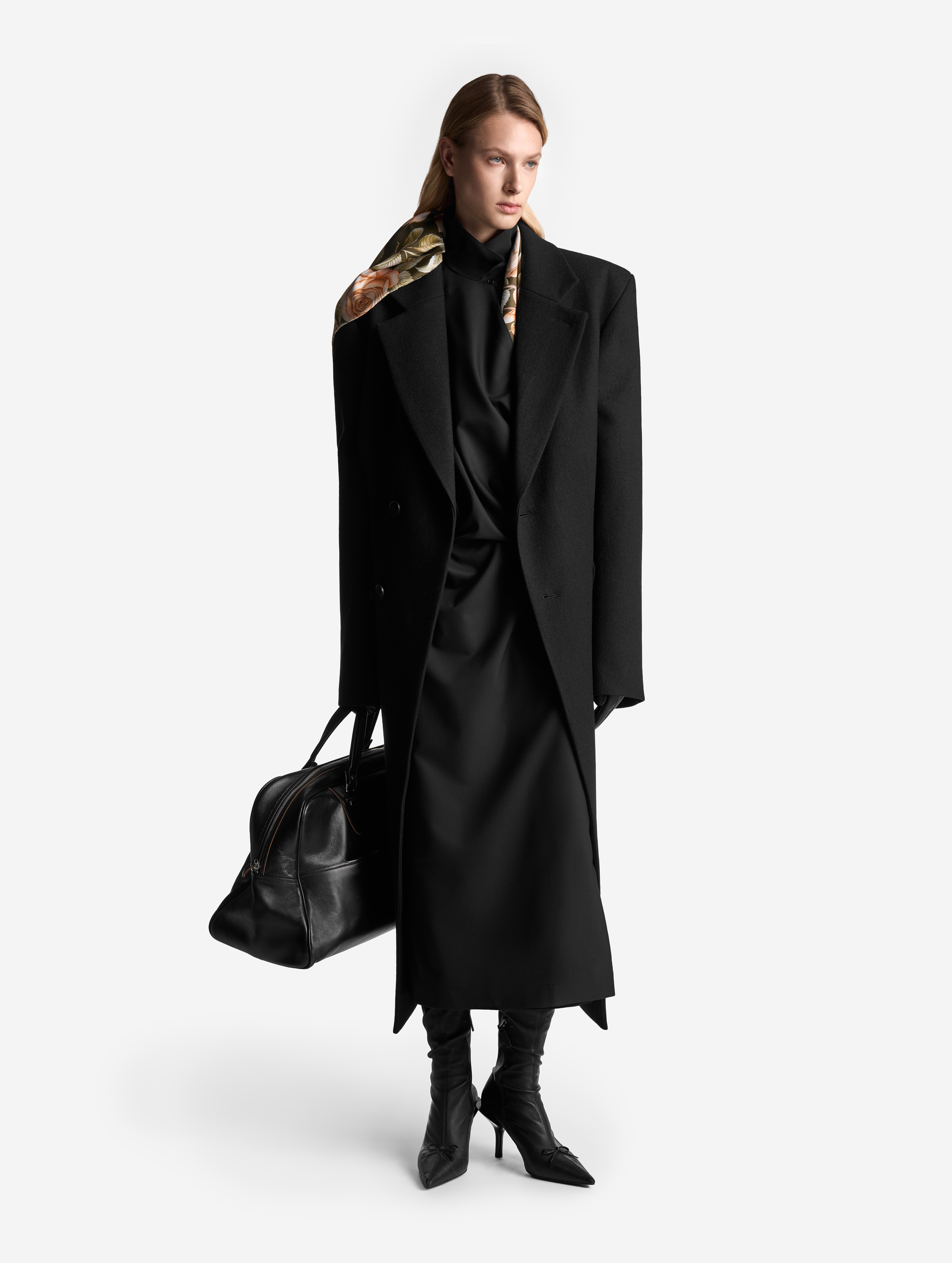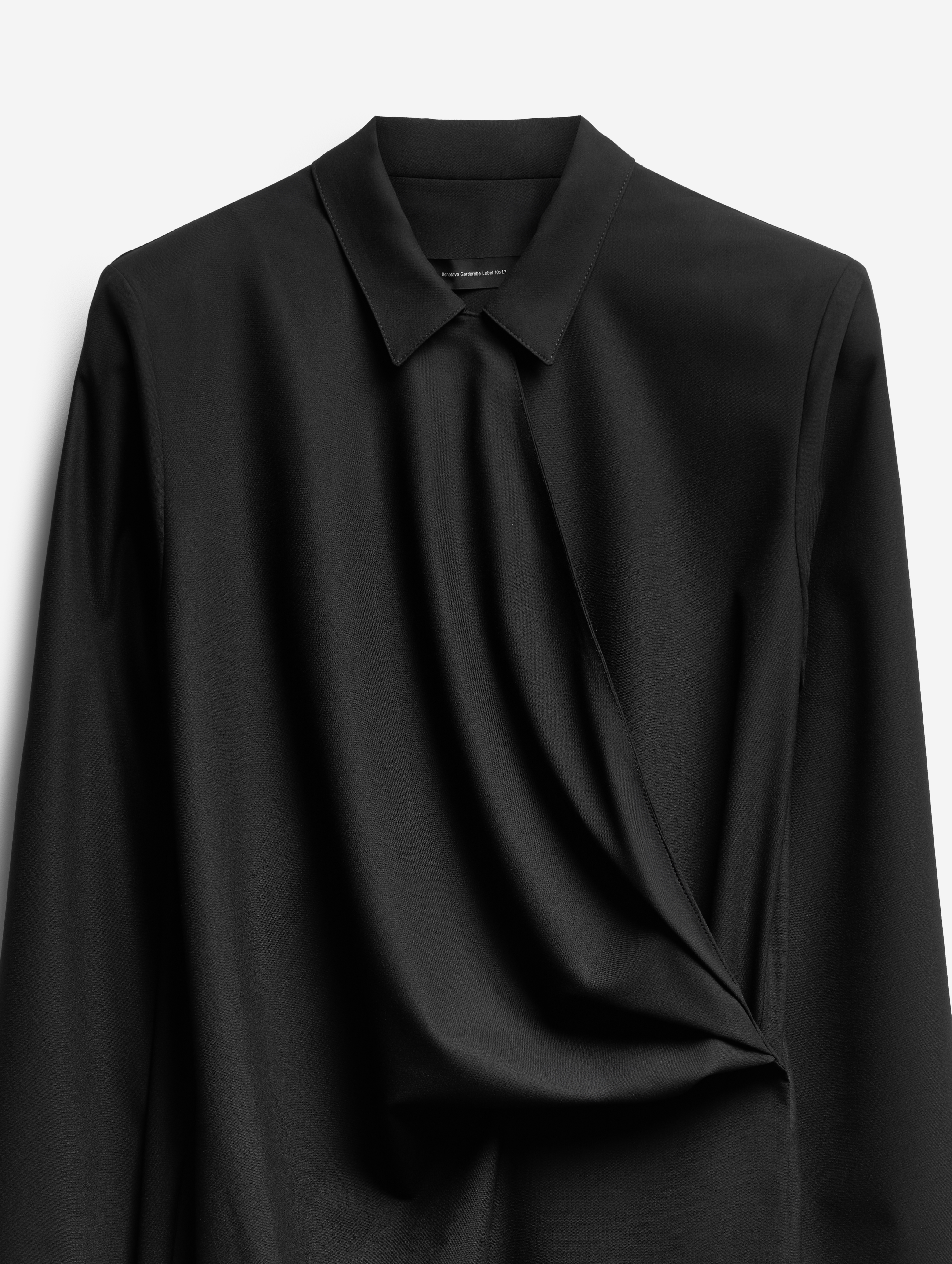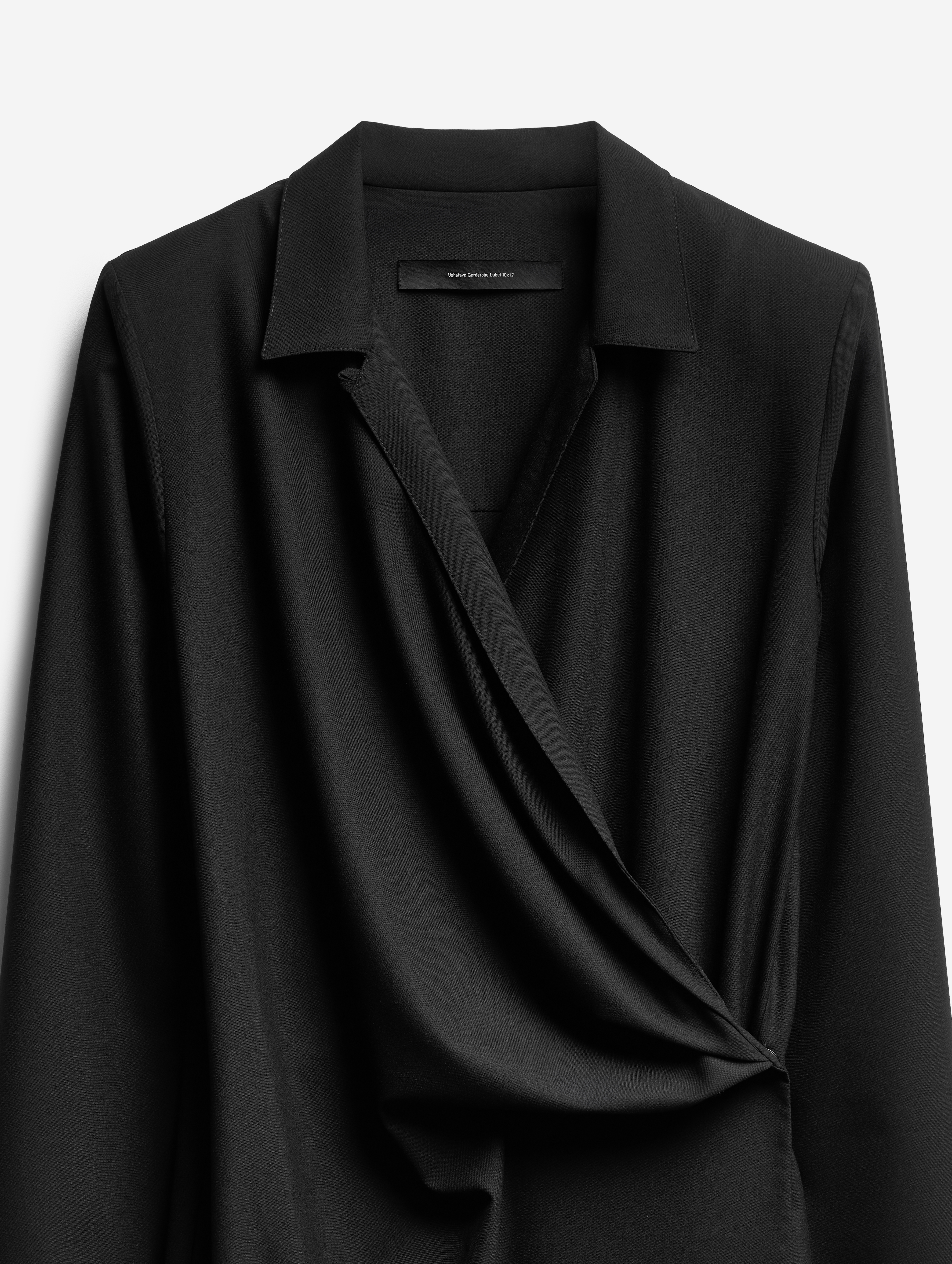 Новое прочтение иконического изделия Ushatava. По легенде, на одной из примерок коллекций модного Дома модель решила спустить на плечи легкое двубортное пальто. Спонтанный стайлинг-трюк подарил идею для бестселлера — с 2017 года платье-антиблейзер и Ushatava на несколько лет стали синонимами. Секрет его популярности в многофункциональности. В распахнутом виде платье превращалось в накидку, а со спущенными плечами — в коктейльный наряд. Долгое время без него не обходилась ни одна коллекция.