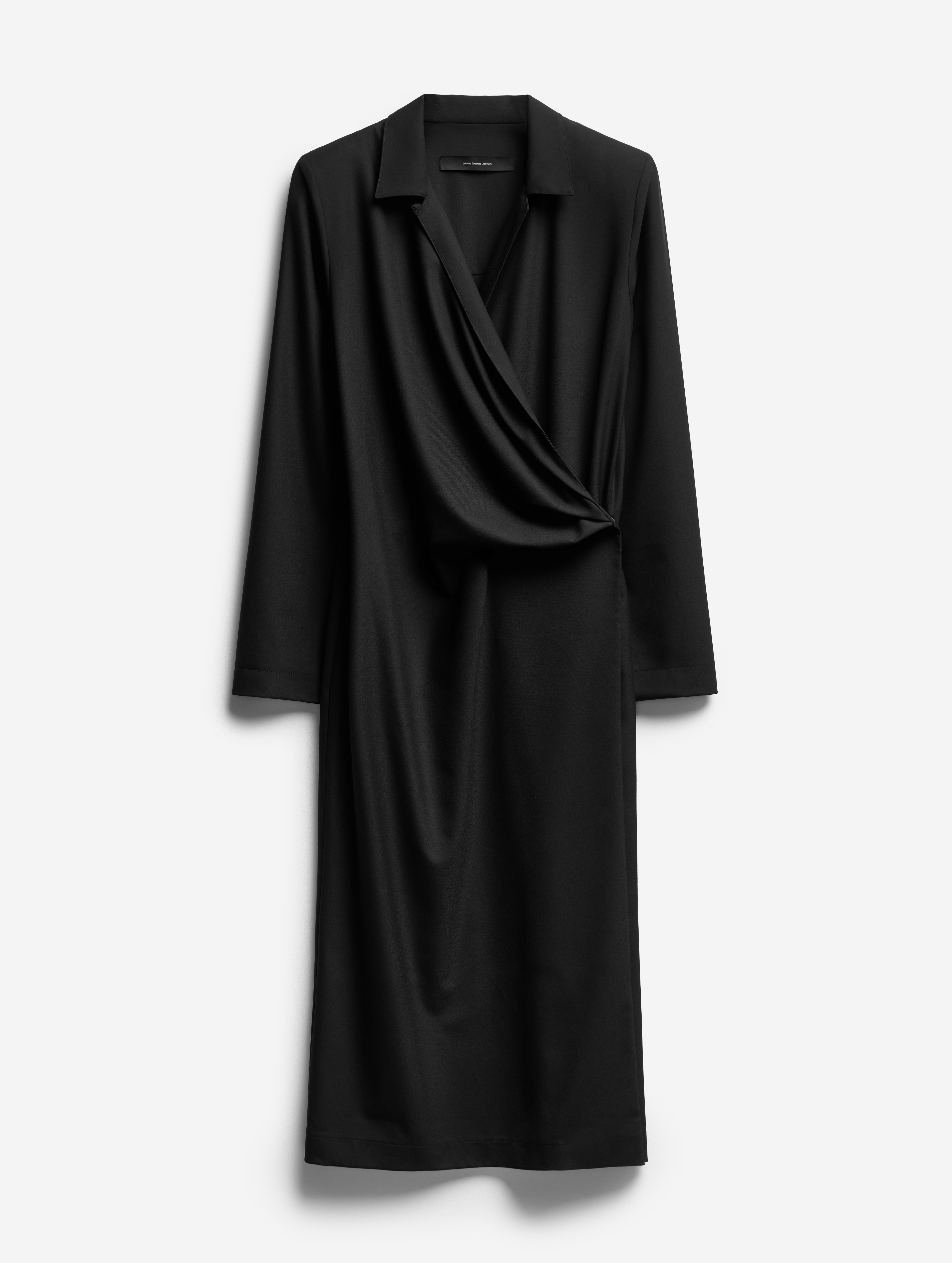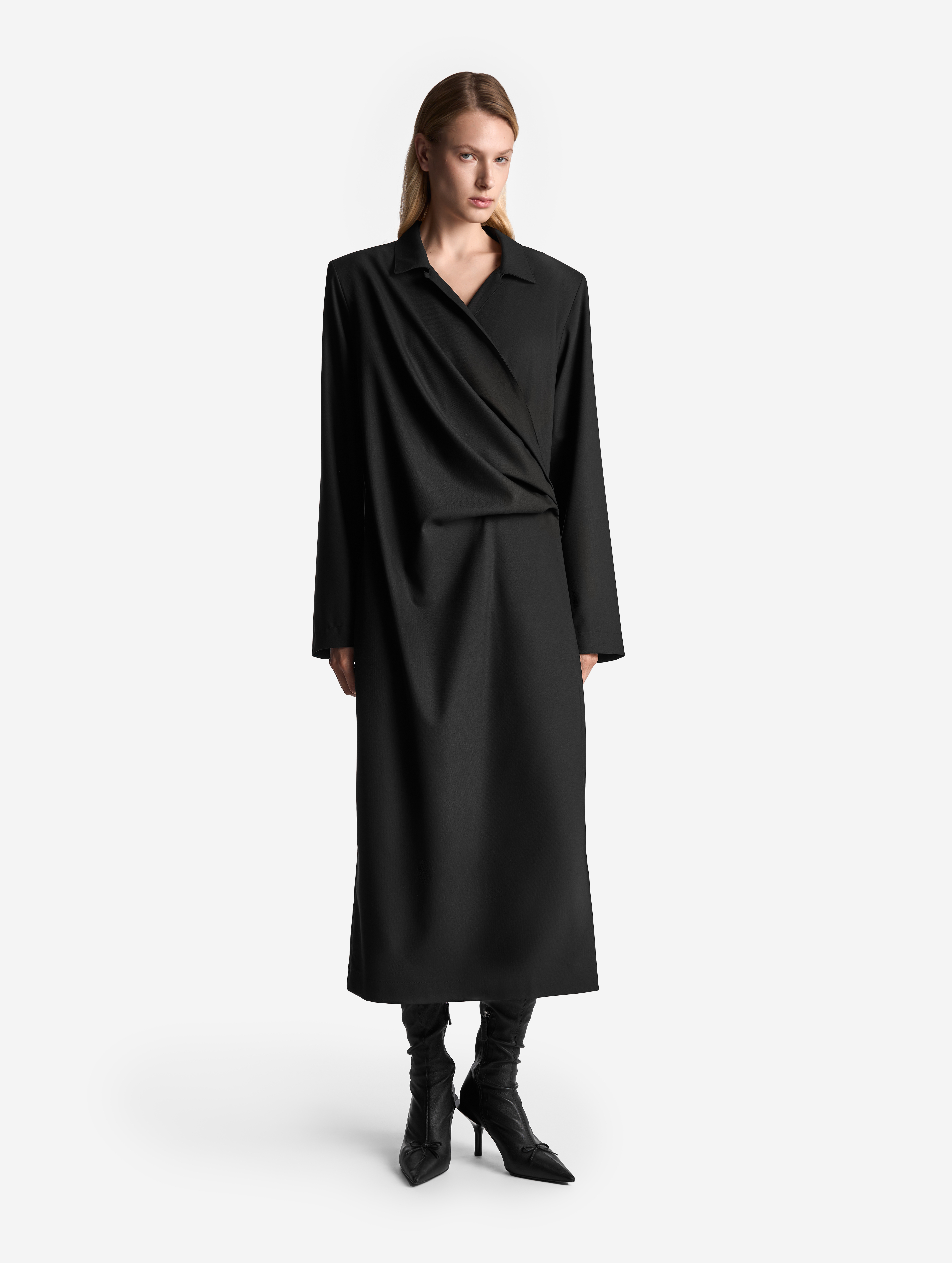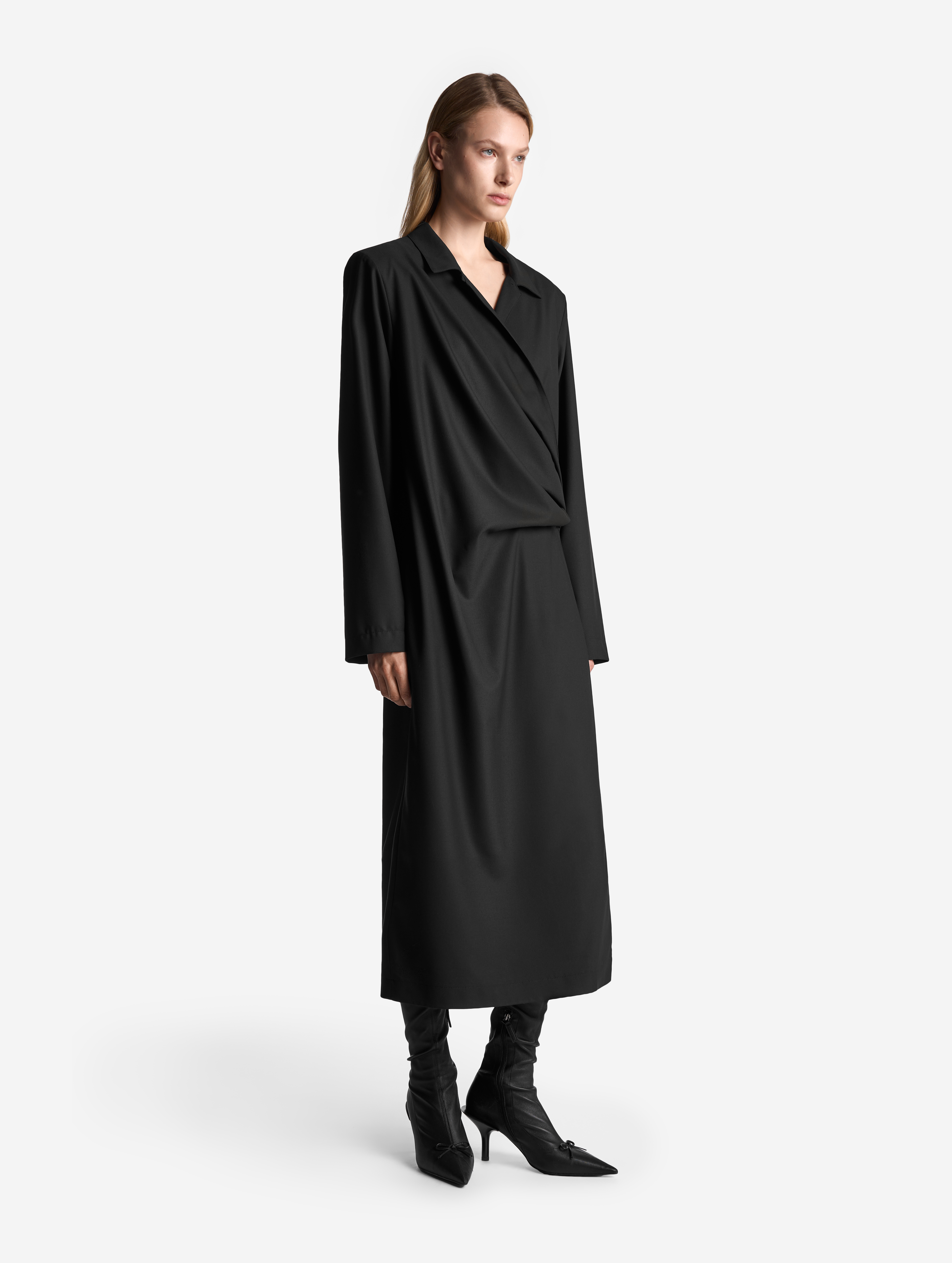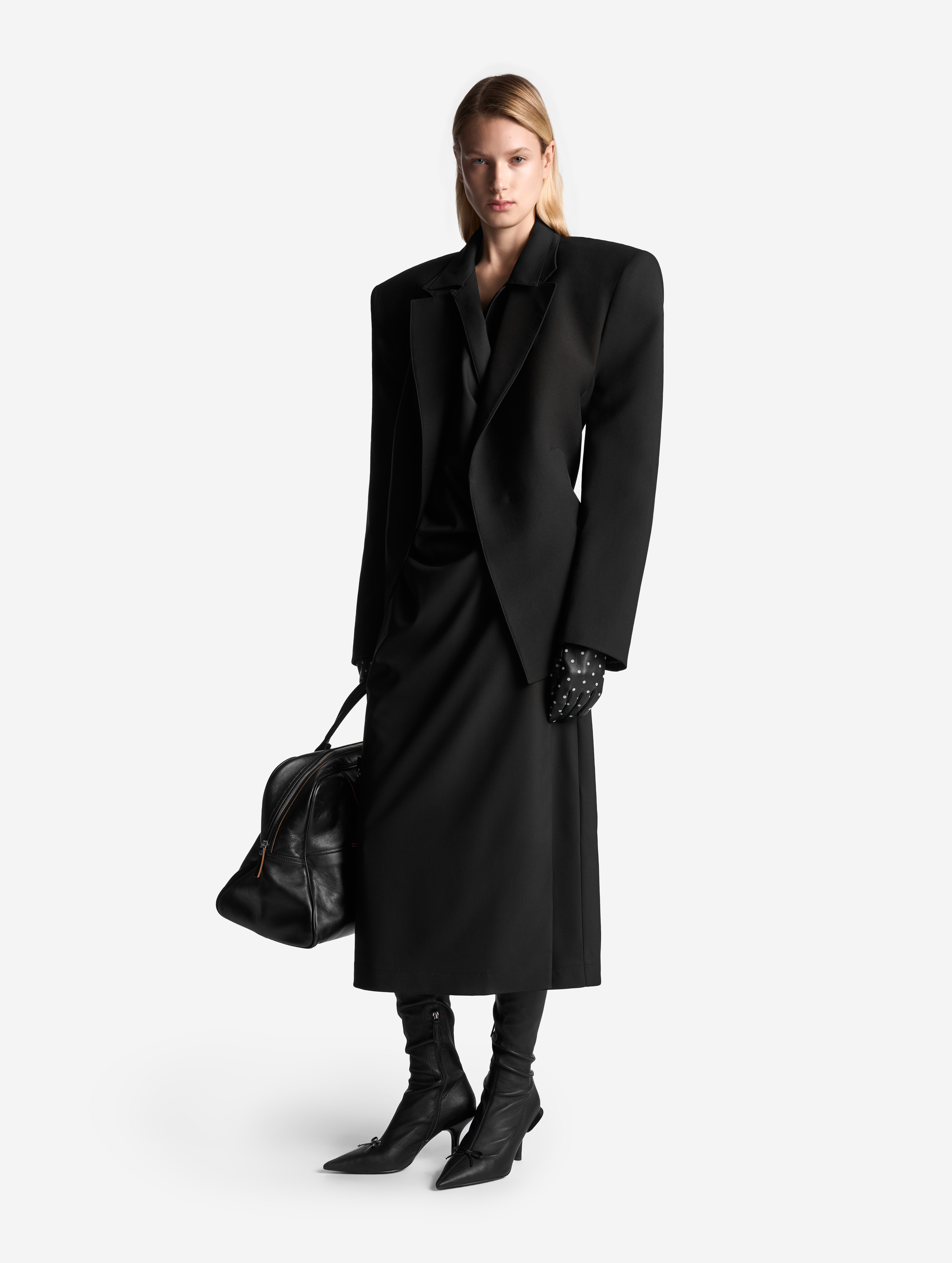 Новое прочтение иконического изделия Ushatava. По легенде, на одной из примерок коллекций модного Дома модель решила спустить на плечи легкое двубортное пальто. Спонтанный стайлинг-трюк подарил идею для бестселлера — с 2017 года платье-антиблейзер и Ushatava на несколько лет стали синонимами. Секрет его популярности в многофункциональности. В распахнутом виде платье превращалось в накидку, а со спущенными плечами — в коктейльный наряд. Долгое время без него не обходилась ни одна коллекция.