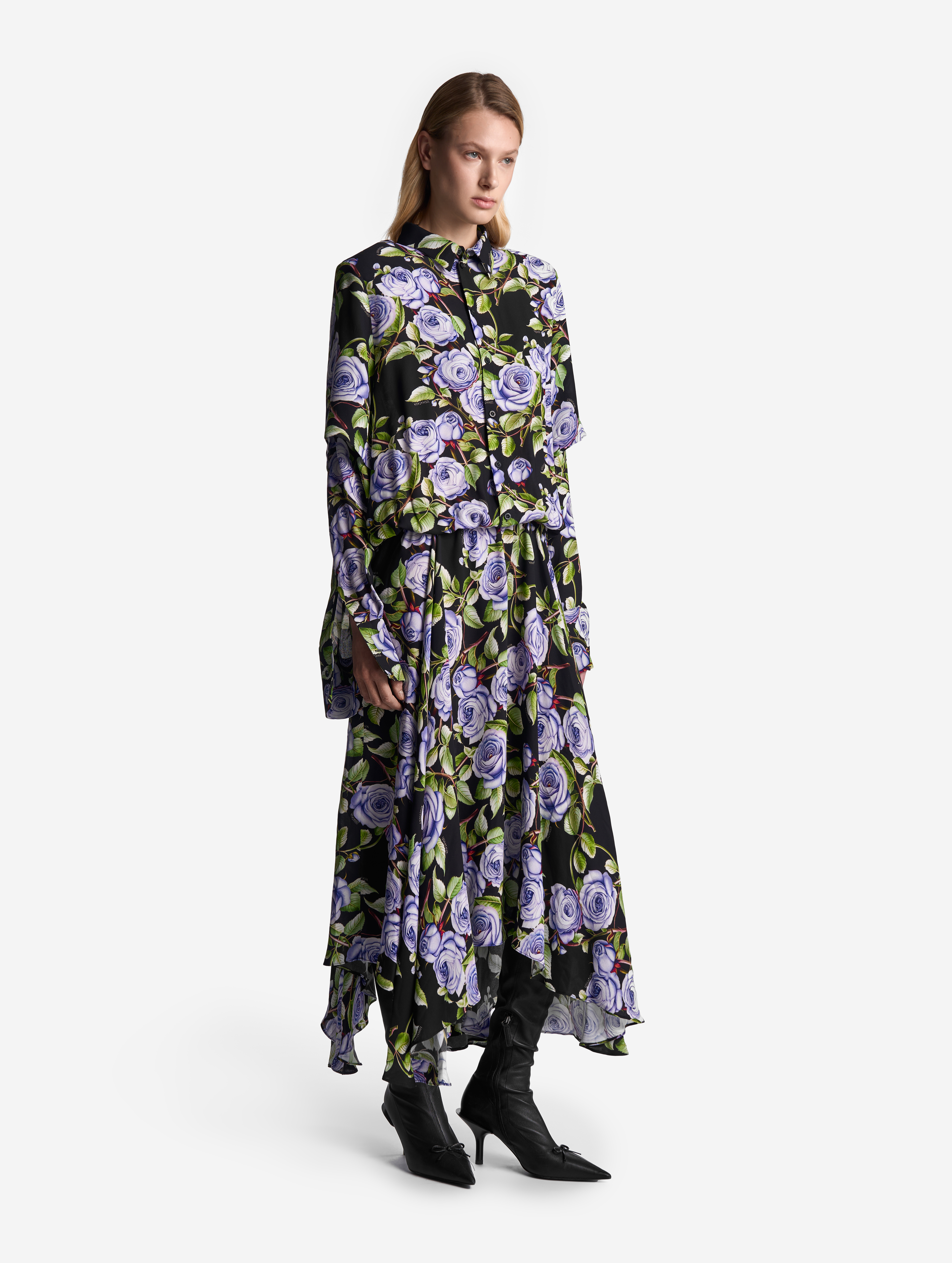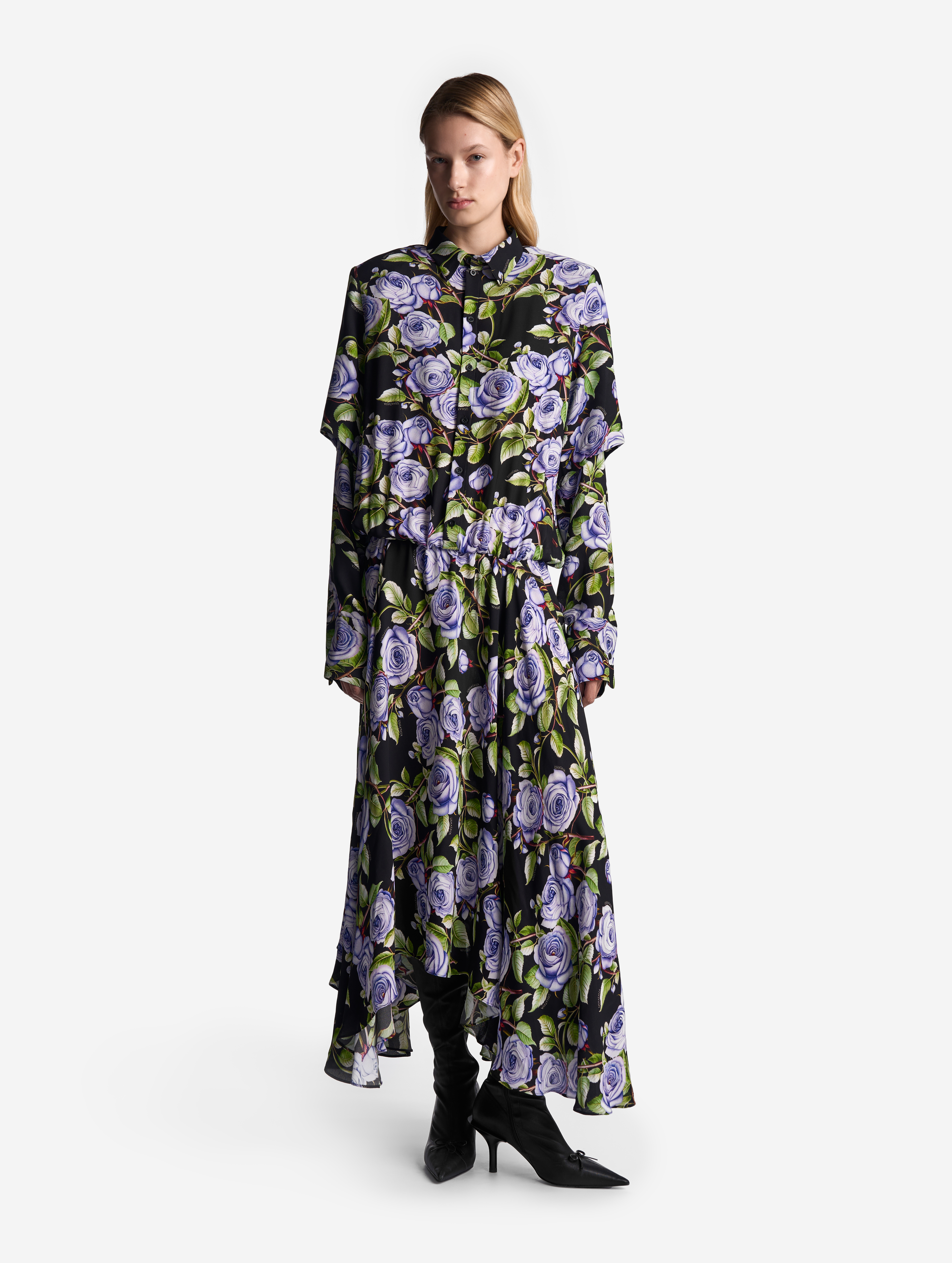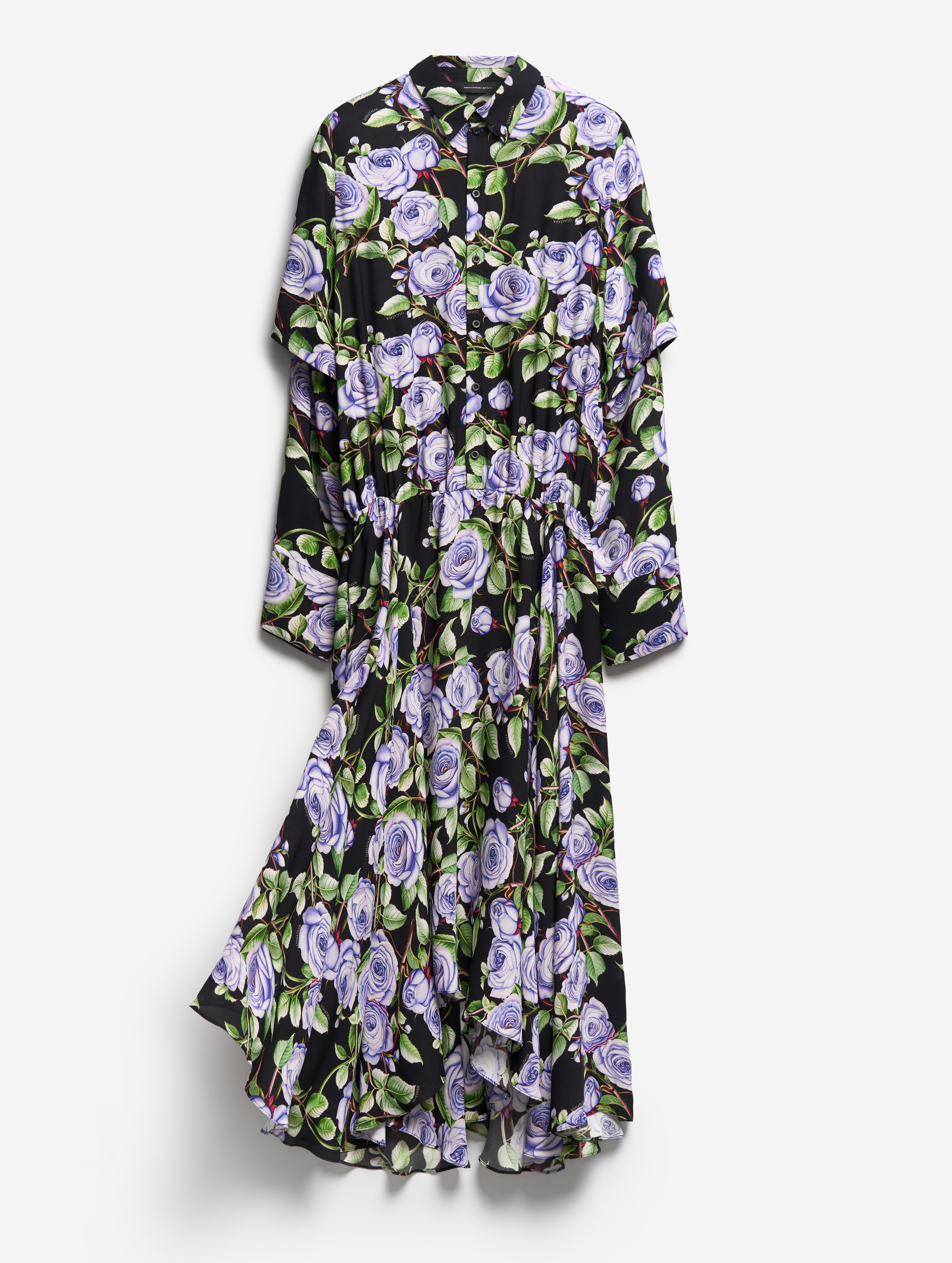 В этом асимметричном платье соединилось несколько идей, к которым мы часто обращаемся на протяжении всего времени существования модного Дома. Во-первых, это вещь-трансформер. Верх платья выполнен в виде рубашки с двумя функциональными рукавами: нижний — классический, с манжетами и двумя пуговицами, а верхний достигает уровня сгиба локтя. Во-вторых, платье продолжает идею кейпа — одного из ключевых силуэтов Ushatava. Отверстия в пройме позволяют нижнему рукаву свободно свисать, оставляя руки открытыми. Еще одна особенность этой модели — высокие мягкие подплечники на кнопках, которые при желании можно снять. У платья есть два боковых кармана.