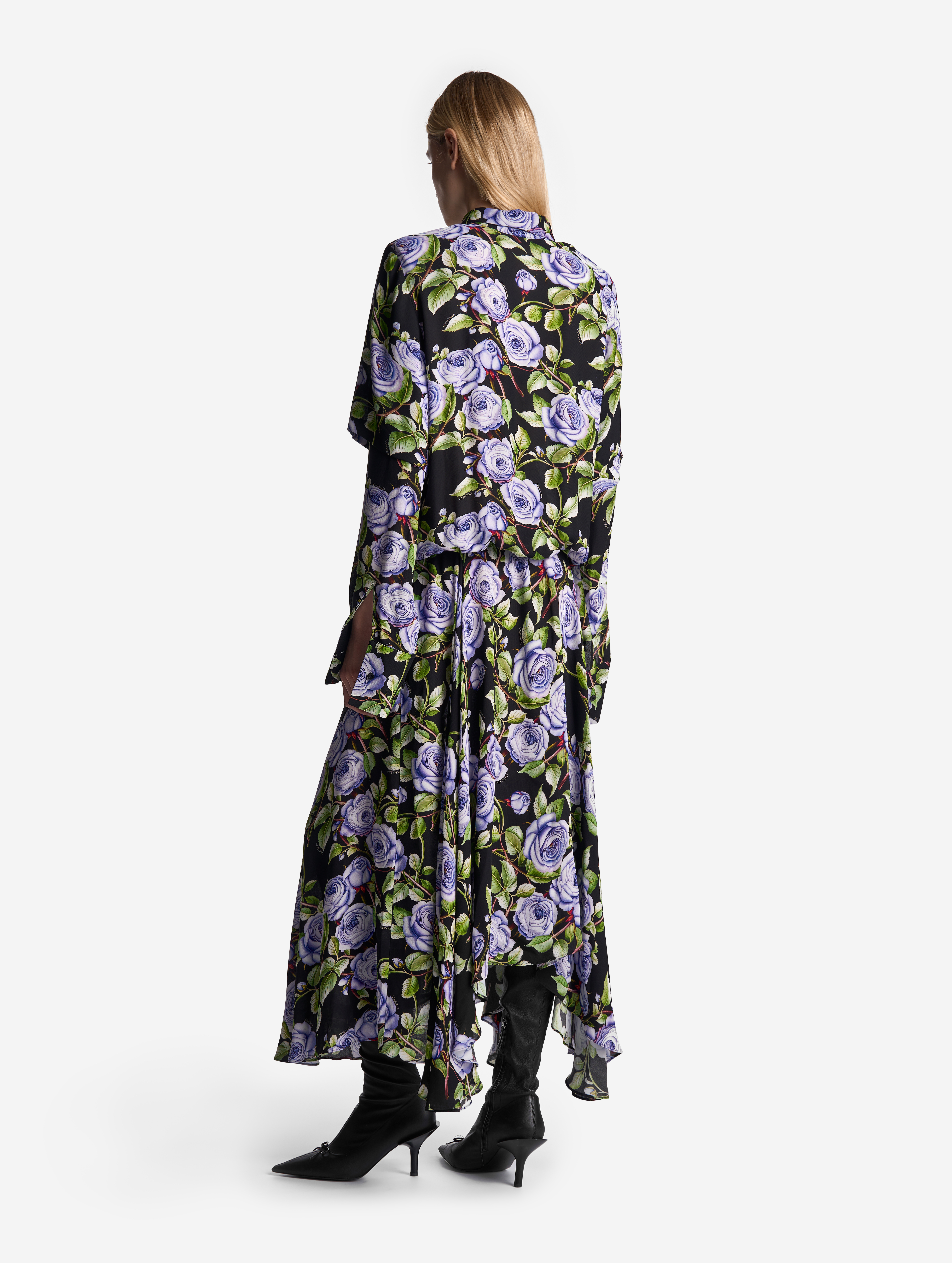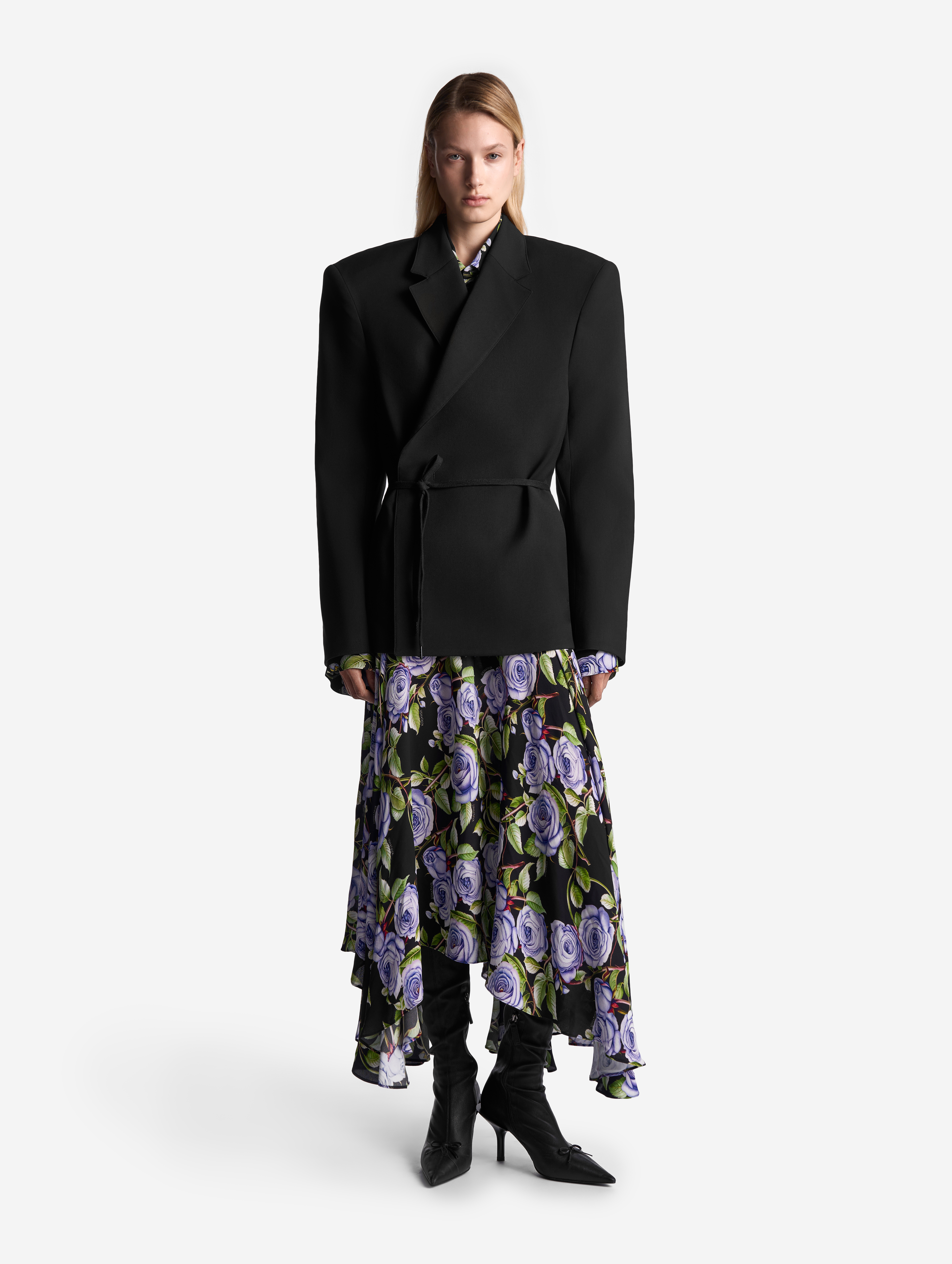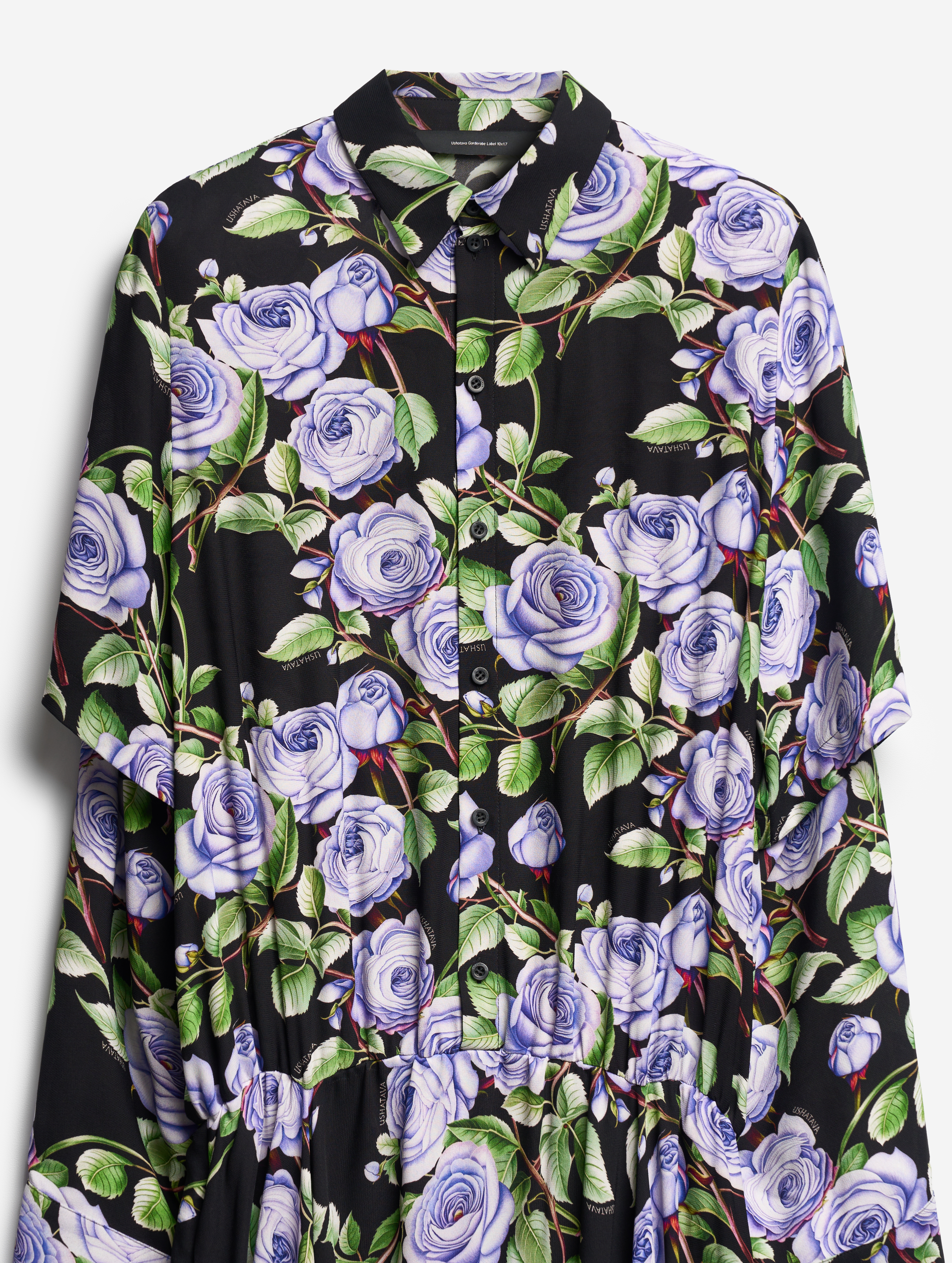 В этом асимметричном платье соединилось несколько идей, к которым мы часто обращаемся на протяжении всего времени существования модного Дома. Во-первых, это вещь-трансформер. Верх платья выполнен в виде рубашки с двумя функциональными рукавами: нижний — классический, с манжетами и двумя пуговицами, а верхний достигает уровня сгиба локтя. Во-вторых, платье продолжает идею кейпа — одного из ключевых силуэтов Ushatava. Отверстия в пройме позволяют нижнему рукаву свободно свисать, оставляя руки открытыми. Еще одна особенность этой модели — высокие мягкие подплечники на кнопках, которые при желании можно снять. У платья есть два боковых кармана.