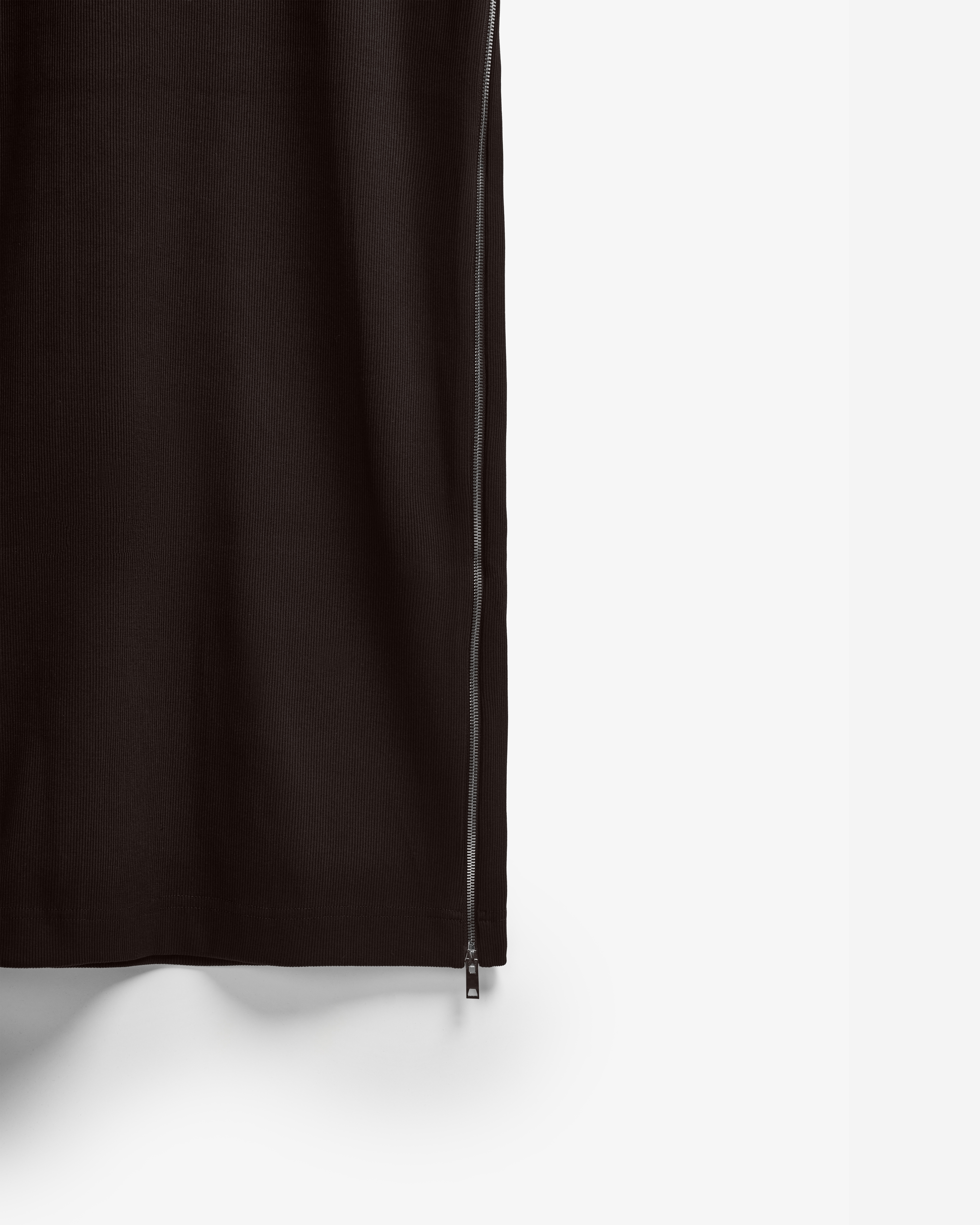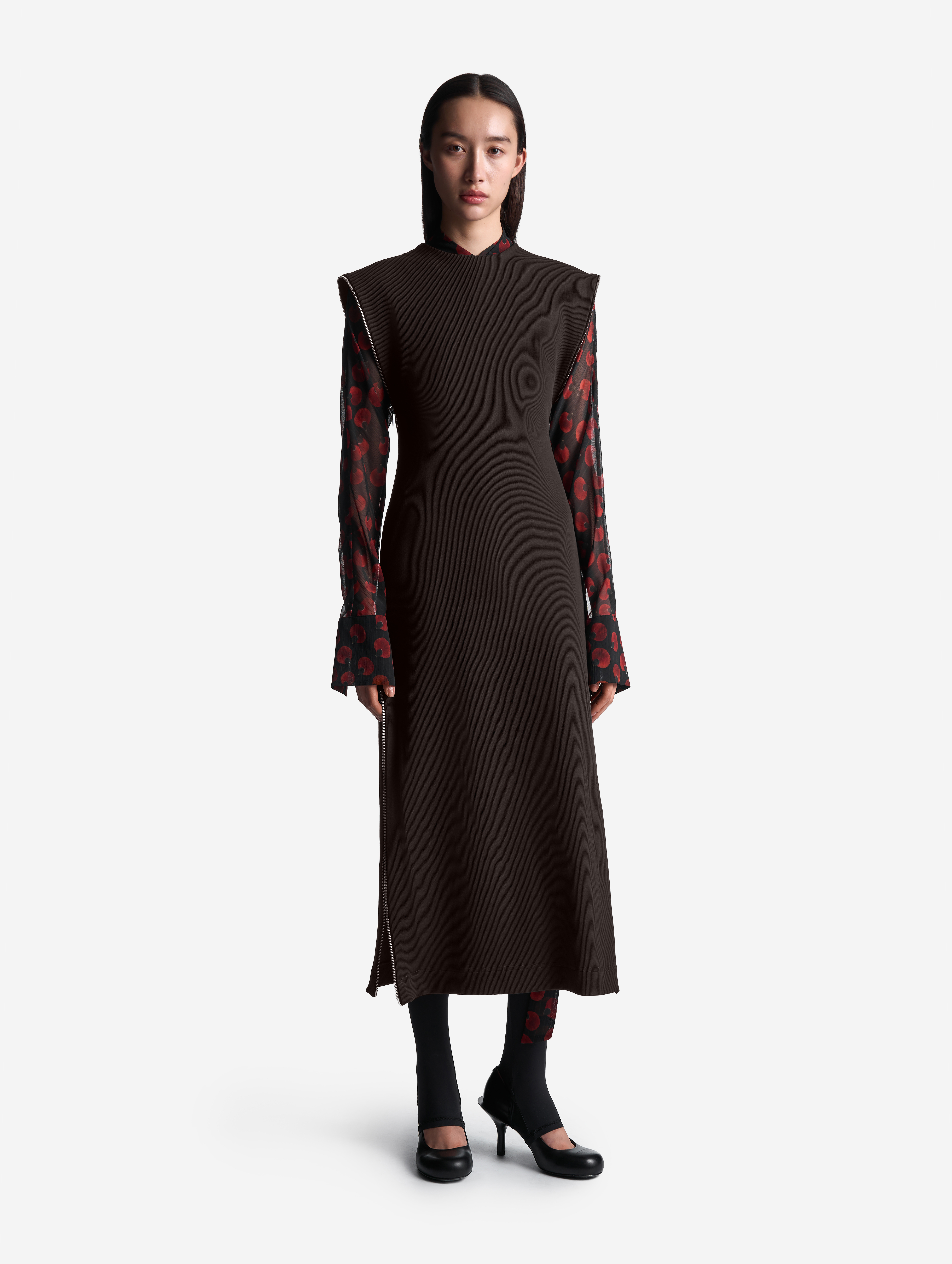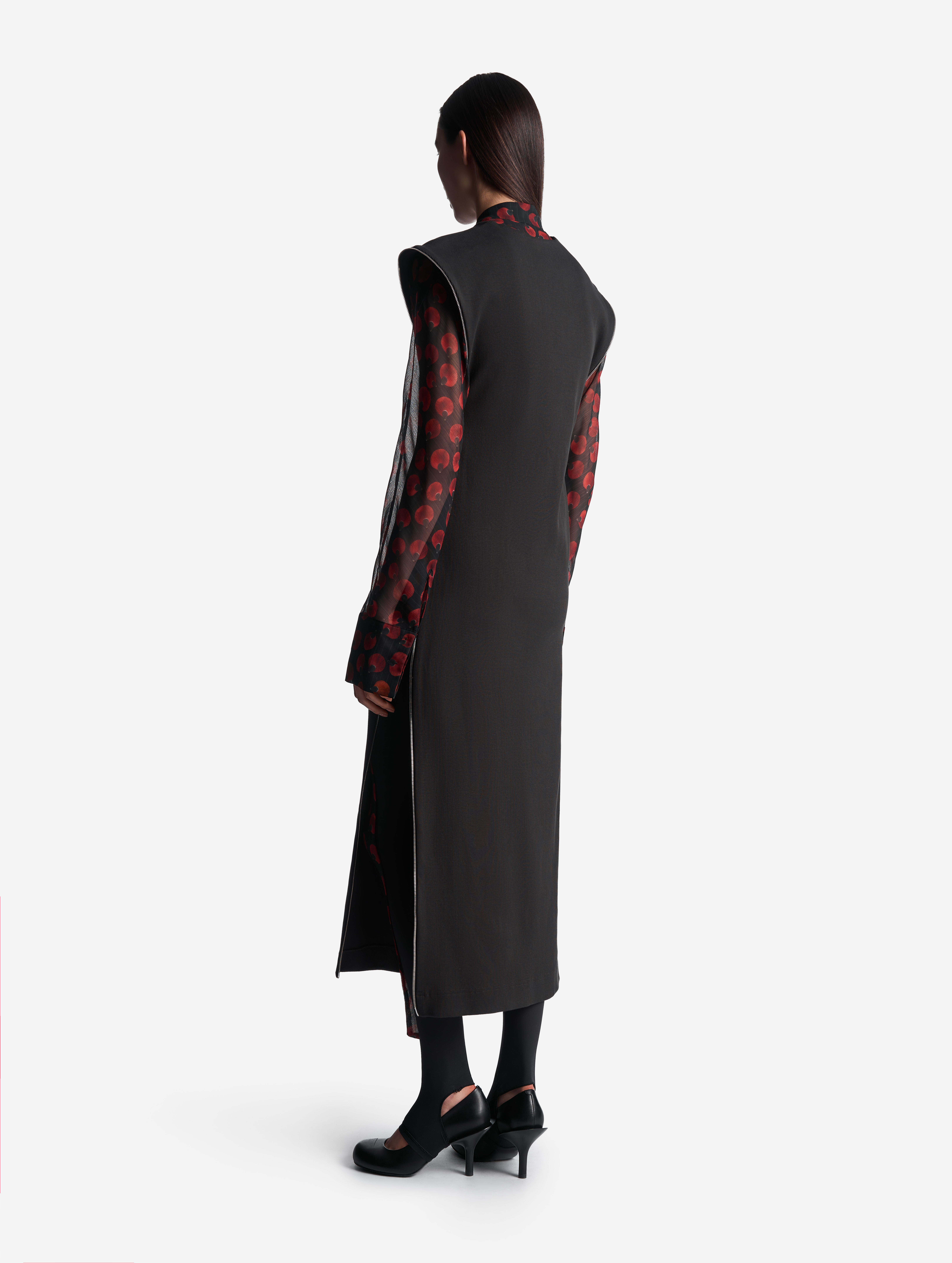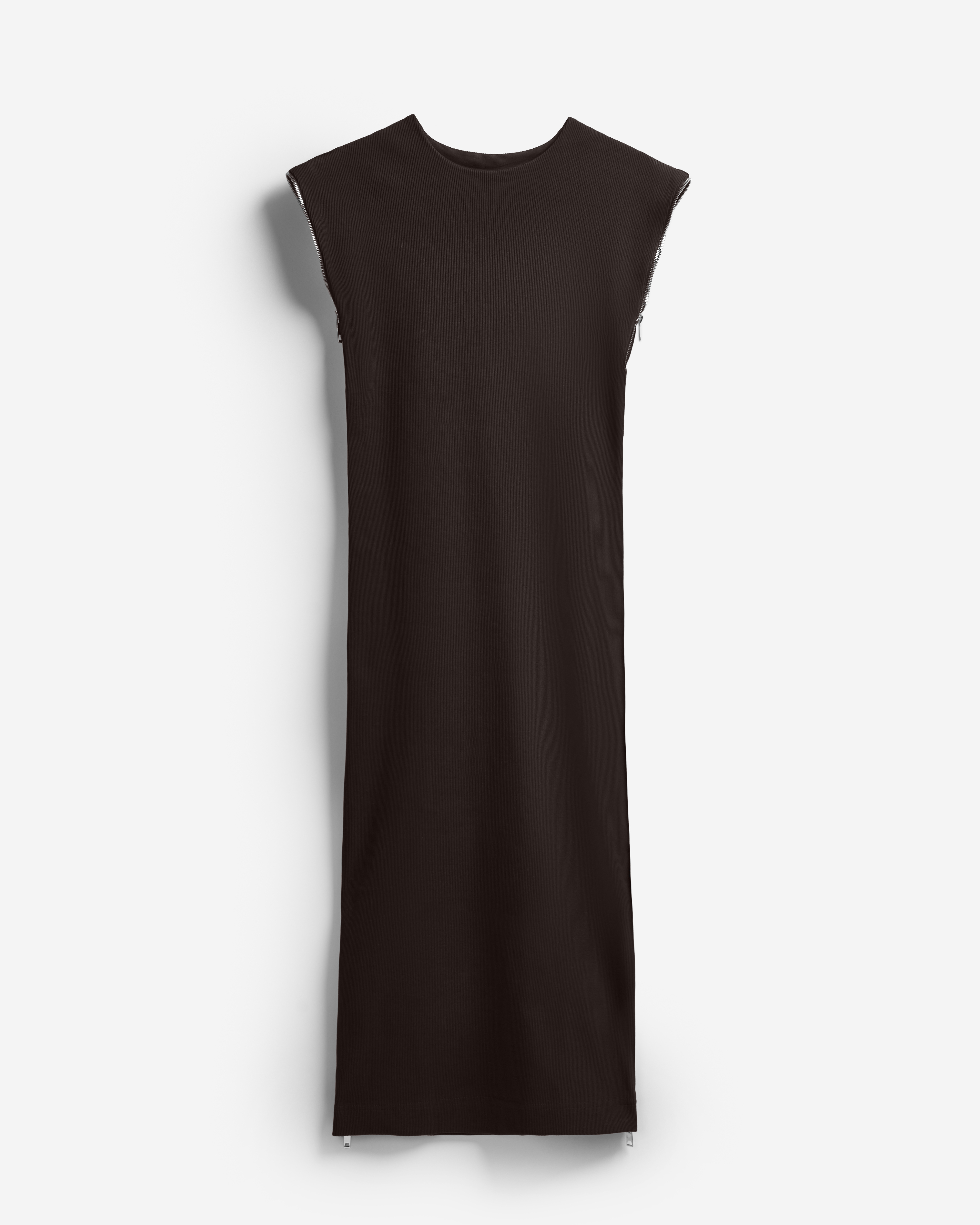 У этого минималистичного платья полуприталенный силуэт и длина в пол. Ключевым элементом дизайна здесь становятся цельные молнии, которые заменяют боковые швы. Молния-петля огибает каждое плечо — за счет двух бегунков платье можно носить как кейп, накидку или кофр, если застегнуть боковые разрезы полностью.