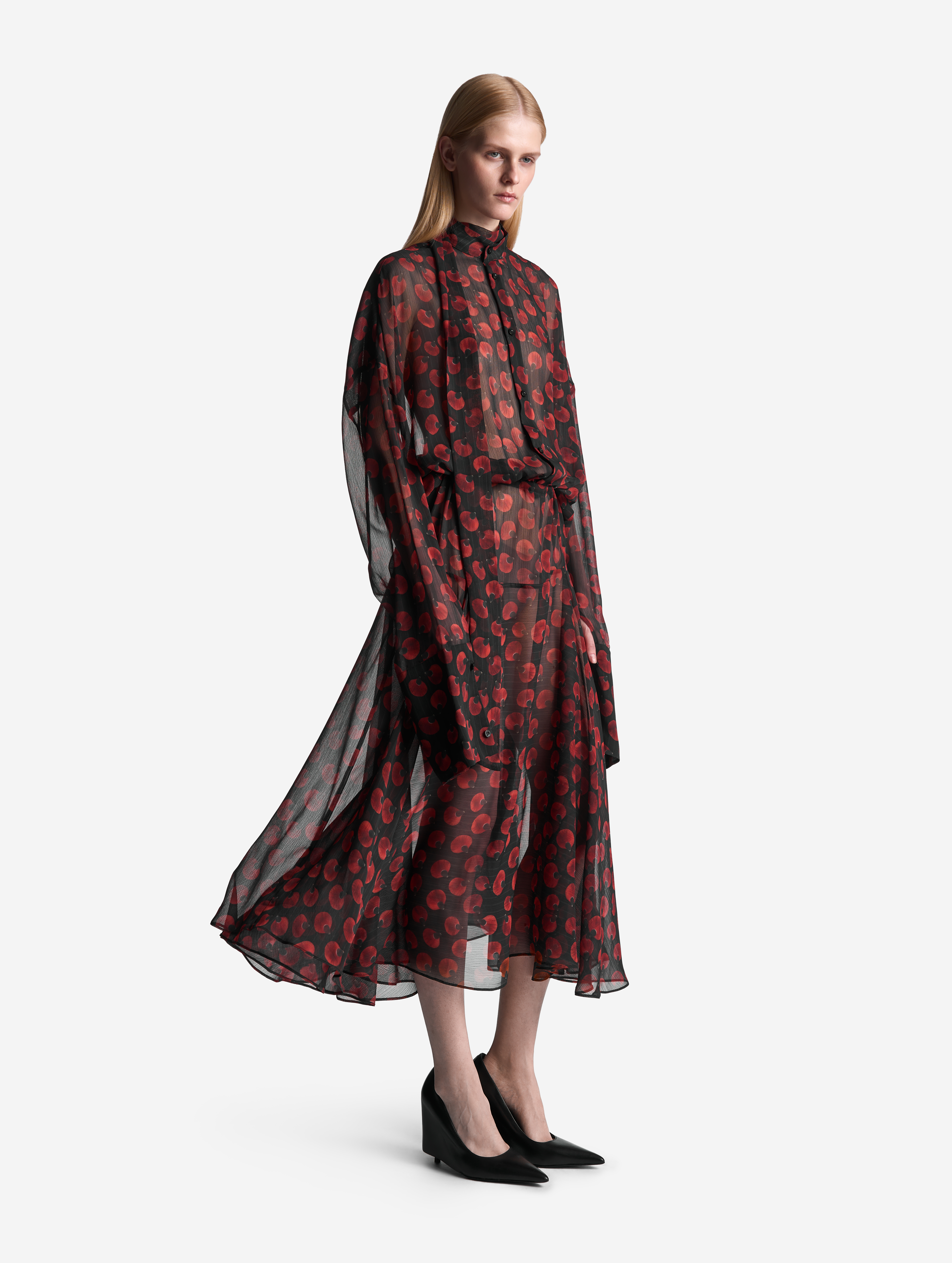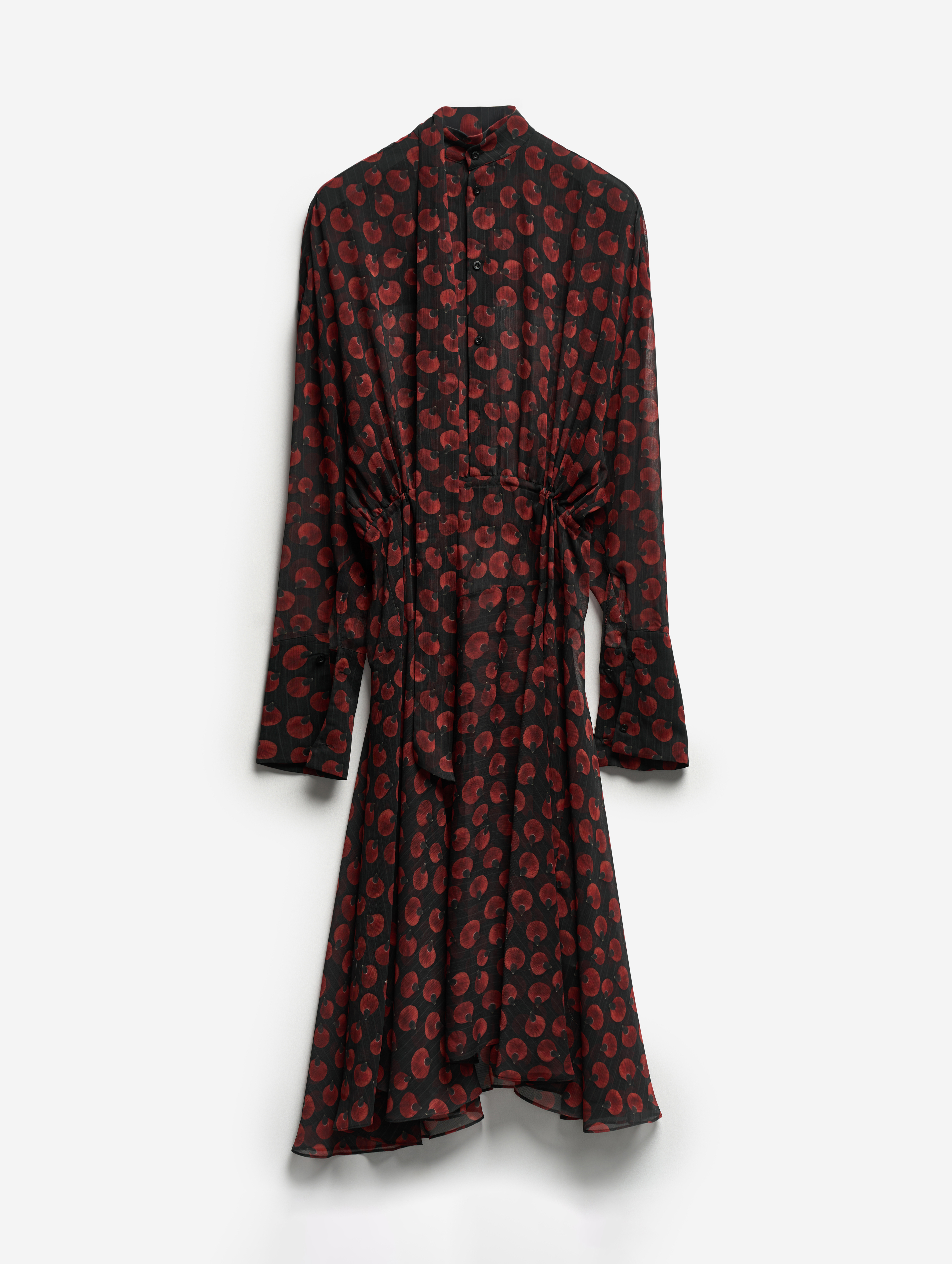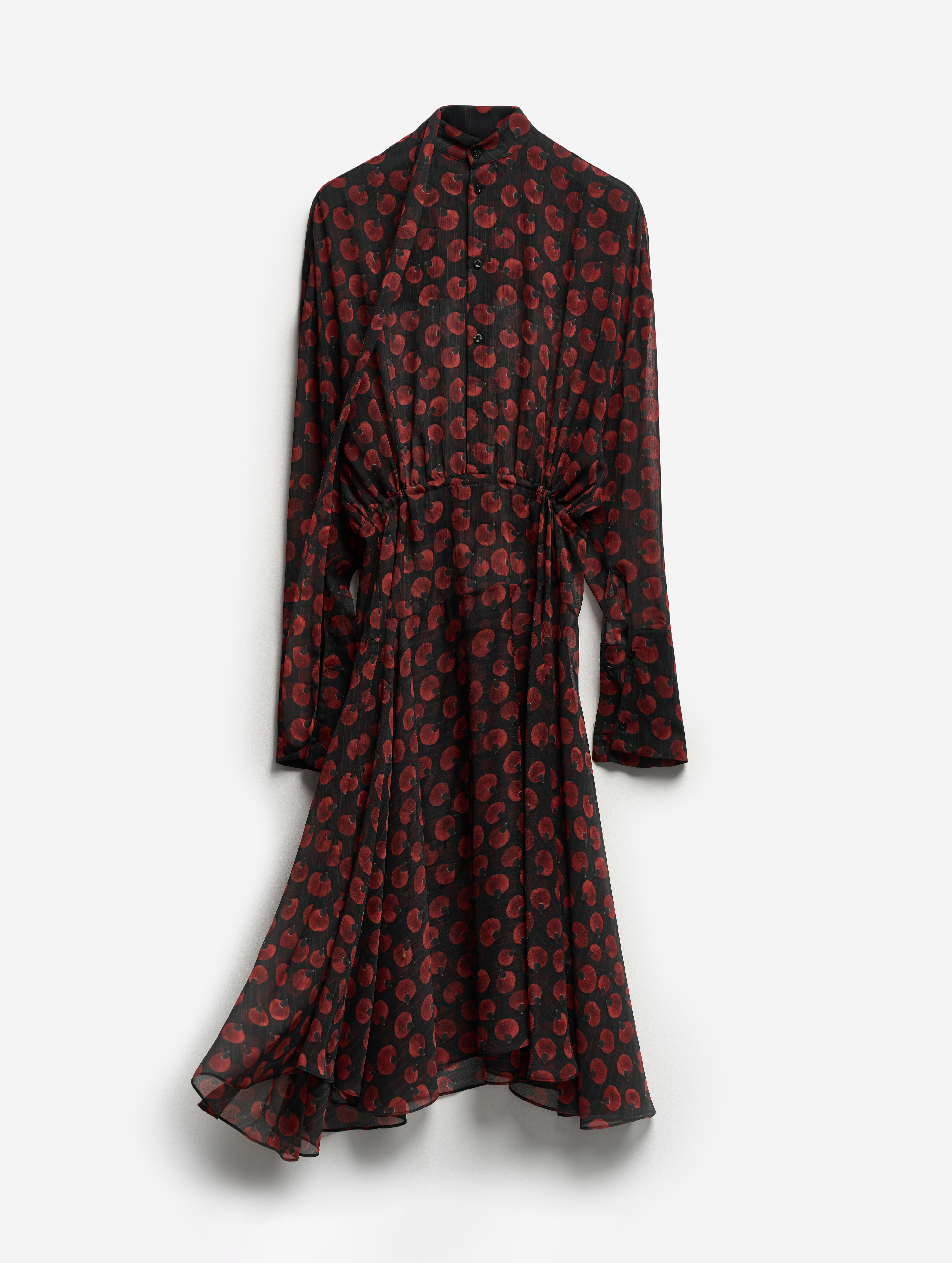 Свободное и струящееся, с воротником-стойкой, длинными широкими рукавами и асимметричной юбкой — это платье сядет на любую фигуру. Мы презентуем эту модель как трансформер: если завязать внутреннюю кулиску на талии или бедрах и скинуть верх платья, оно превратится в сложную юбку. Одна сторона воротника переходит в длинную ленту — ее можно оставить свободно развеваться или продеть сквозь незаметную прорезь, перекинув через плечо (на манер легкого шарфа). Изделие, как и манжеты, застегивается на пуговицы.