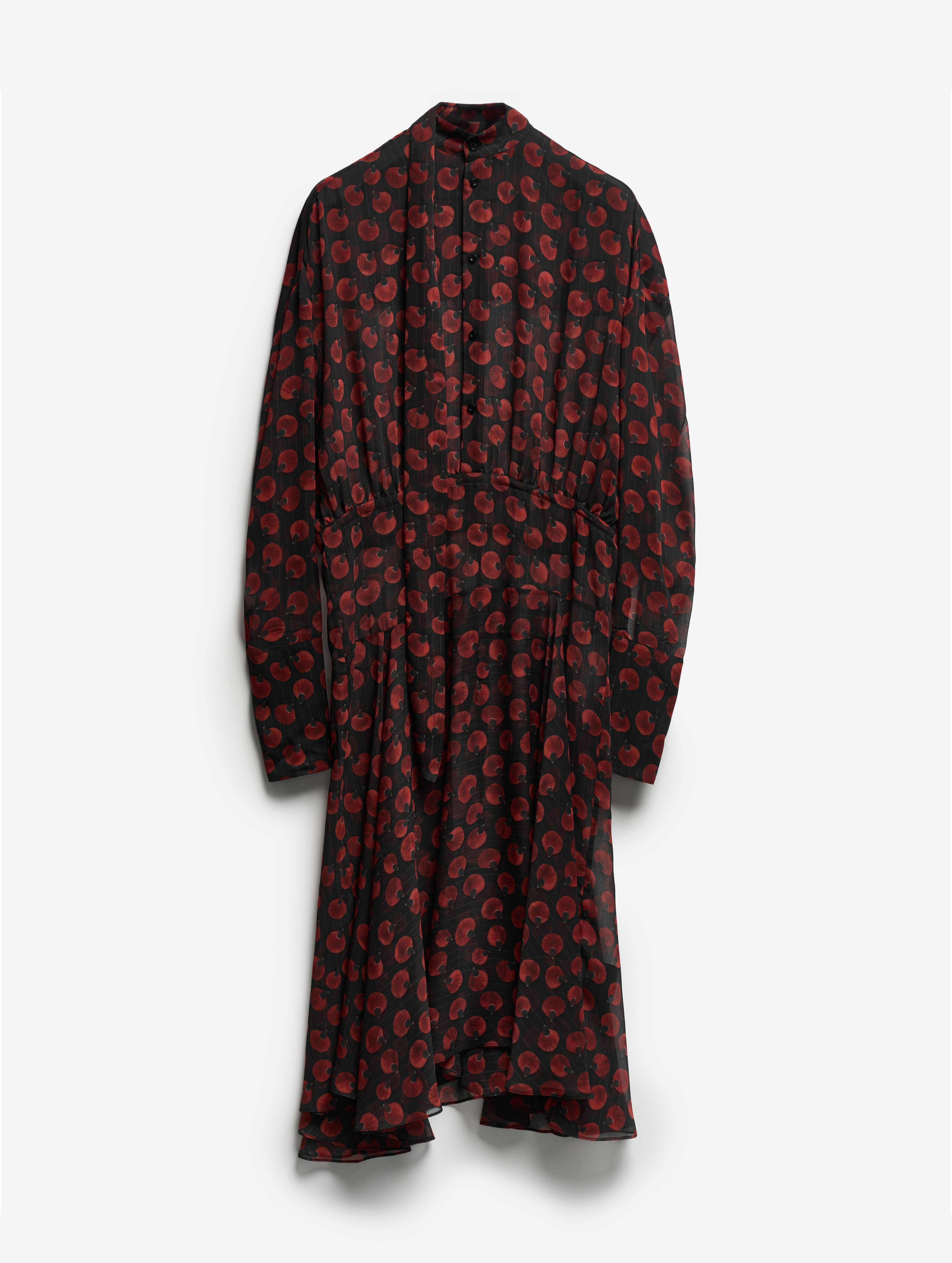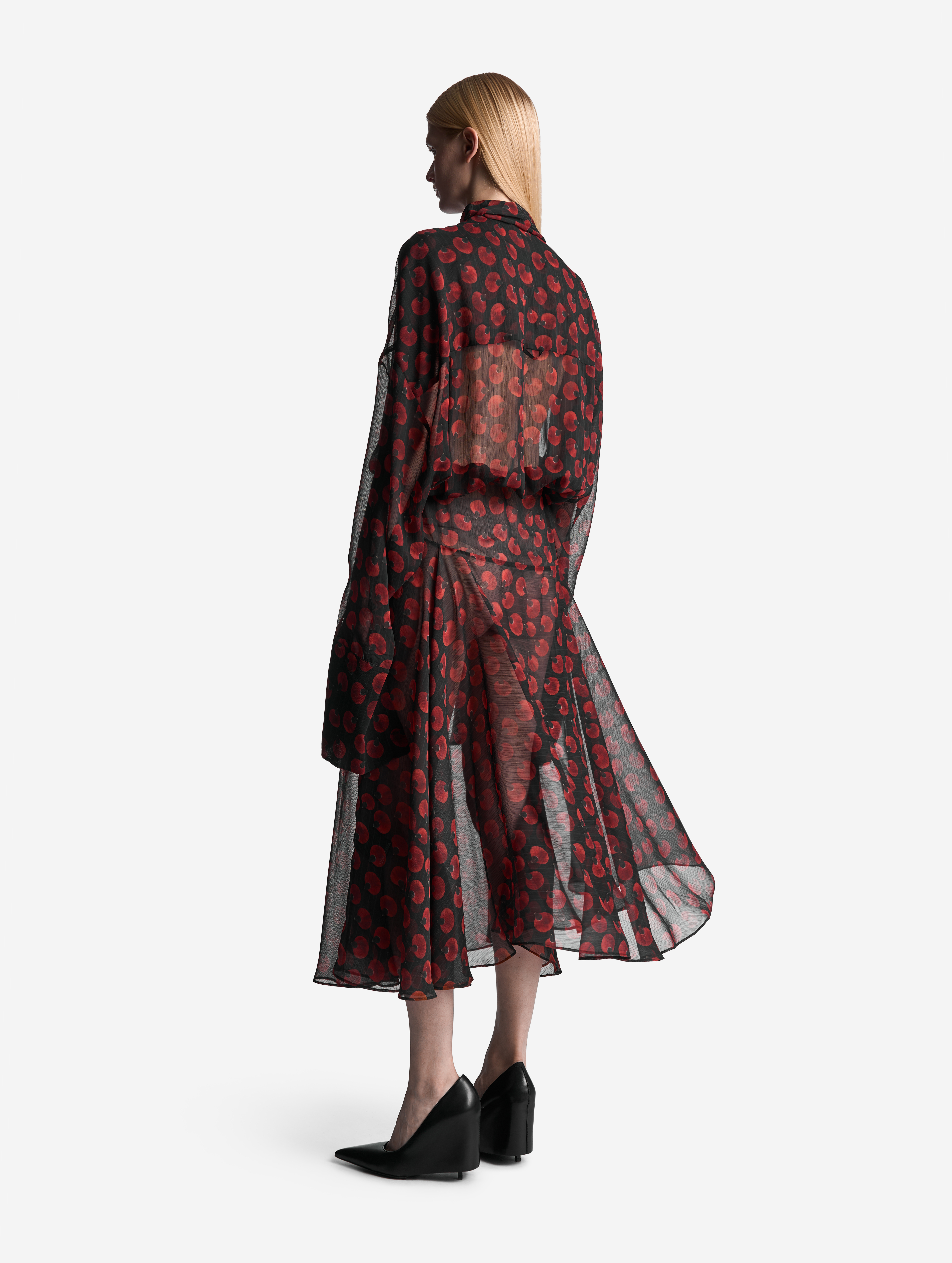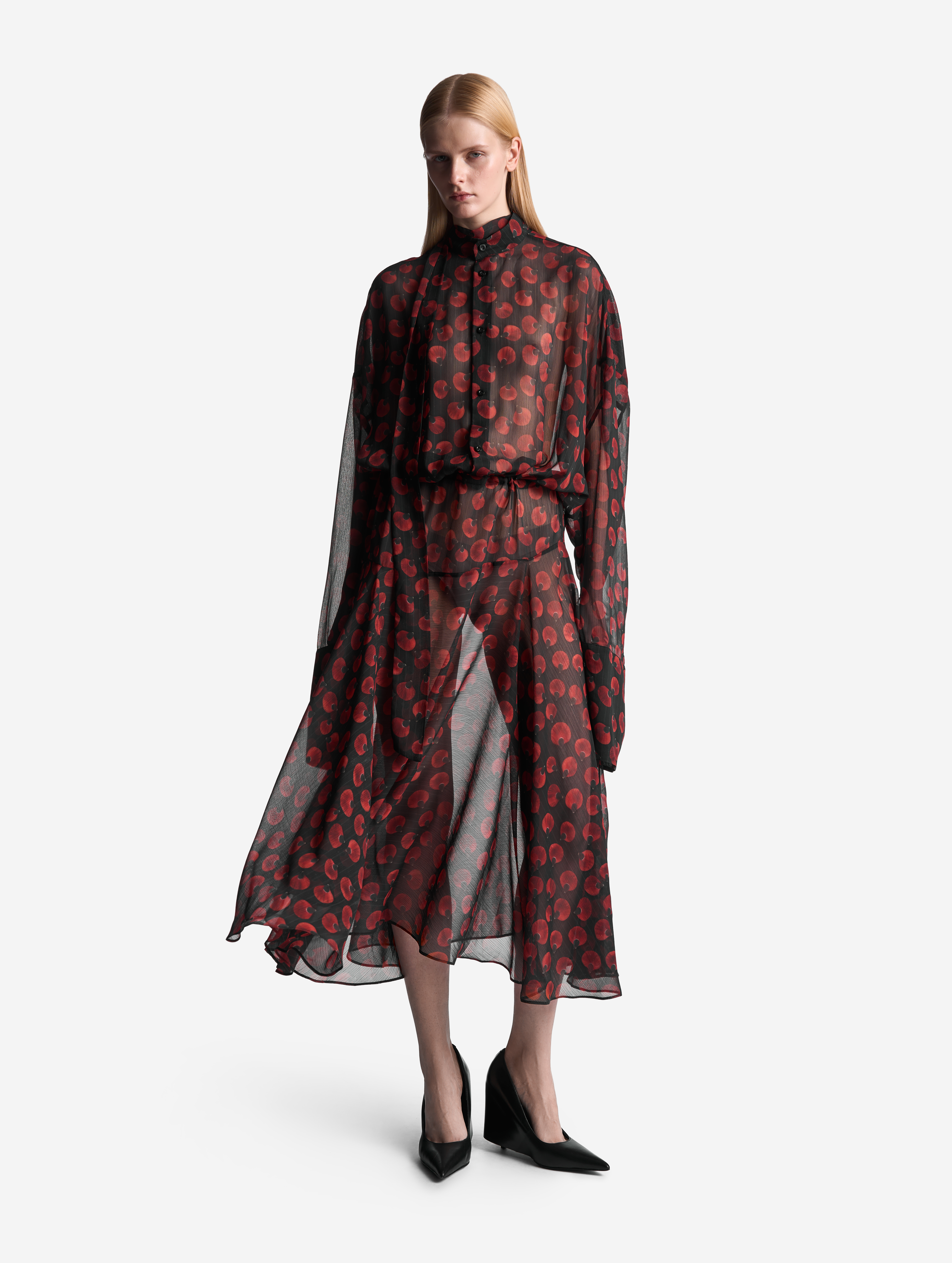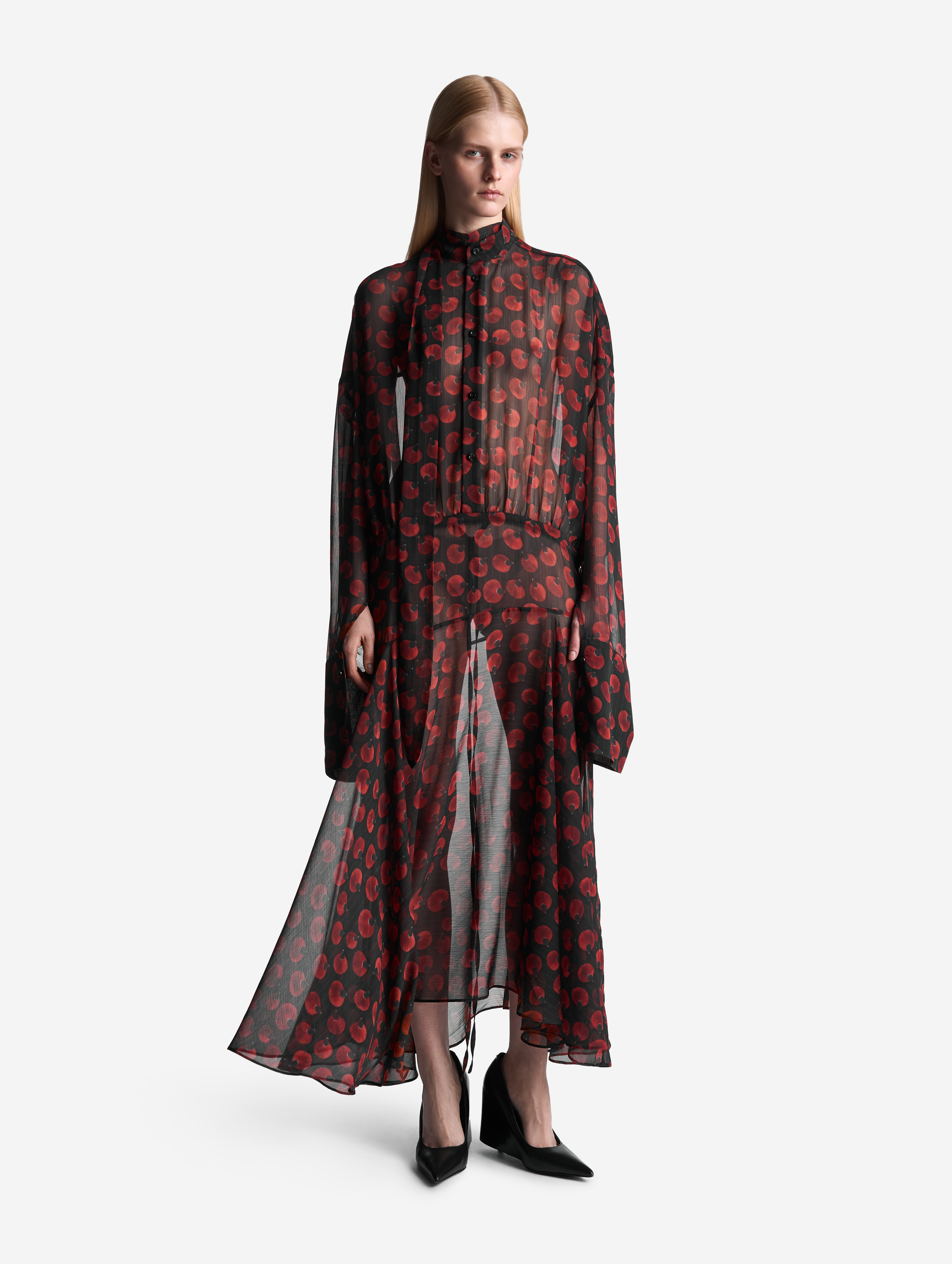 Свободное и струящееся, с воротником-стойкой, длинными широкими рукавами и асимметричной юбкой — это платье сядет на любую фигуру. Мы презентуем эту модель как трансформер: если завязать внутреннюю кулиску на талии или бедрах и скинуть верх платья, оно превратится в сложную юбку. Одна сторона воротника переходит в длинную ленту — ее можно оставить свободно развеваться или продеть сквозь незаметную прорезь, перекинув через плечо (на манер легкого шарфа). Изделие, как и манжеты, застегивается на пуговицы.
