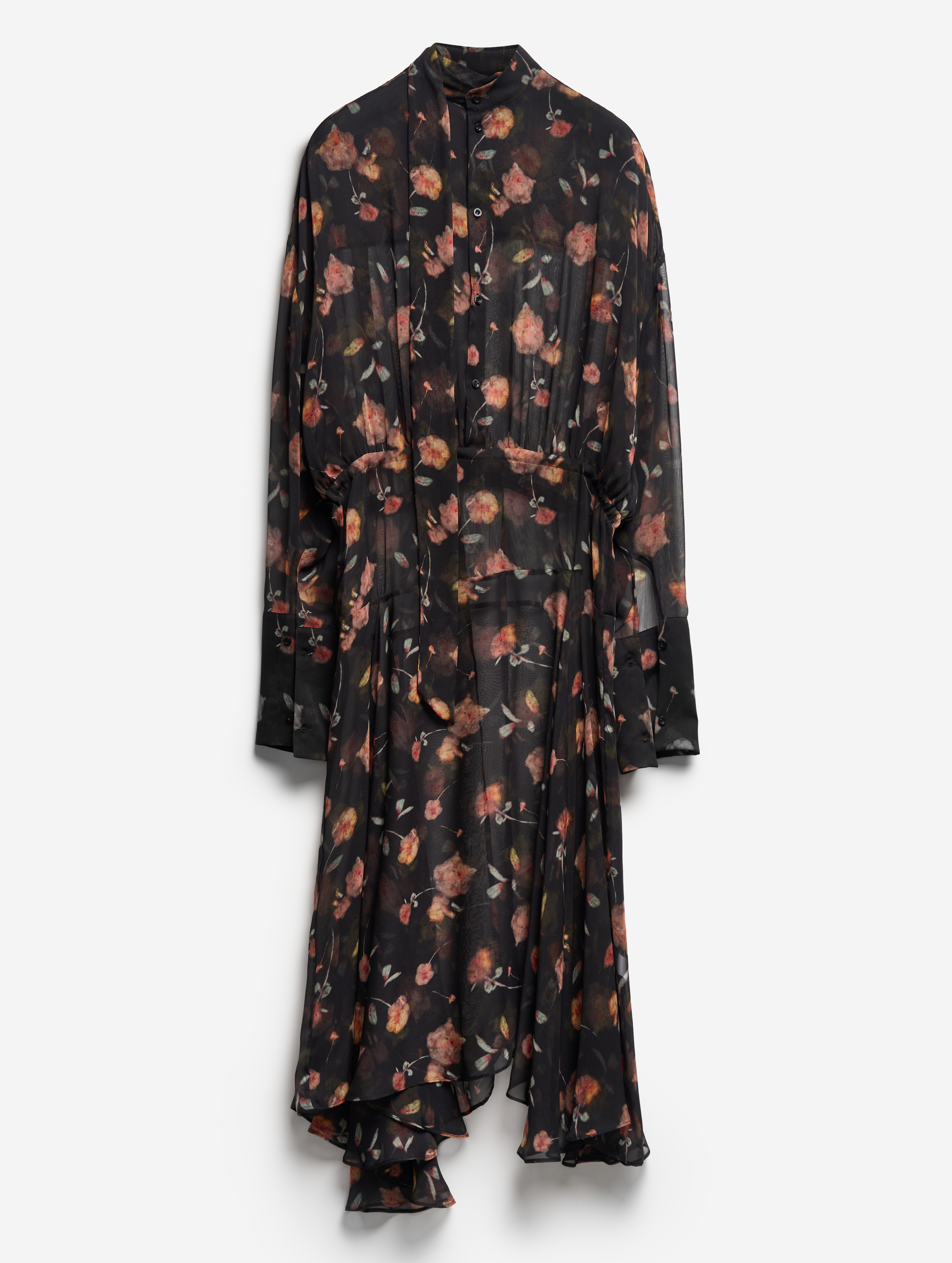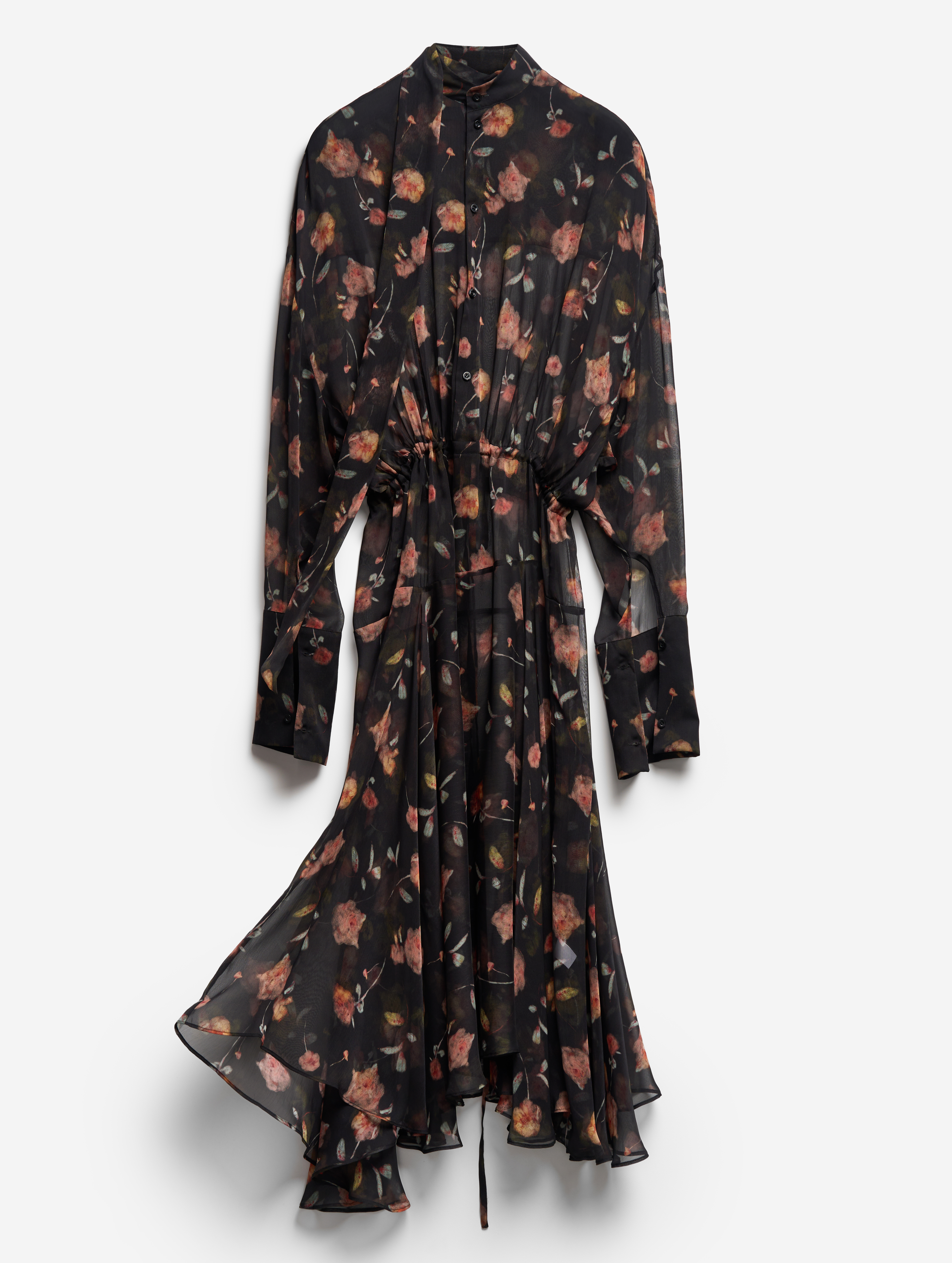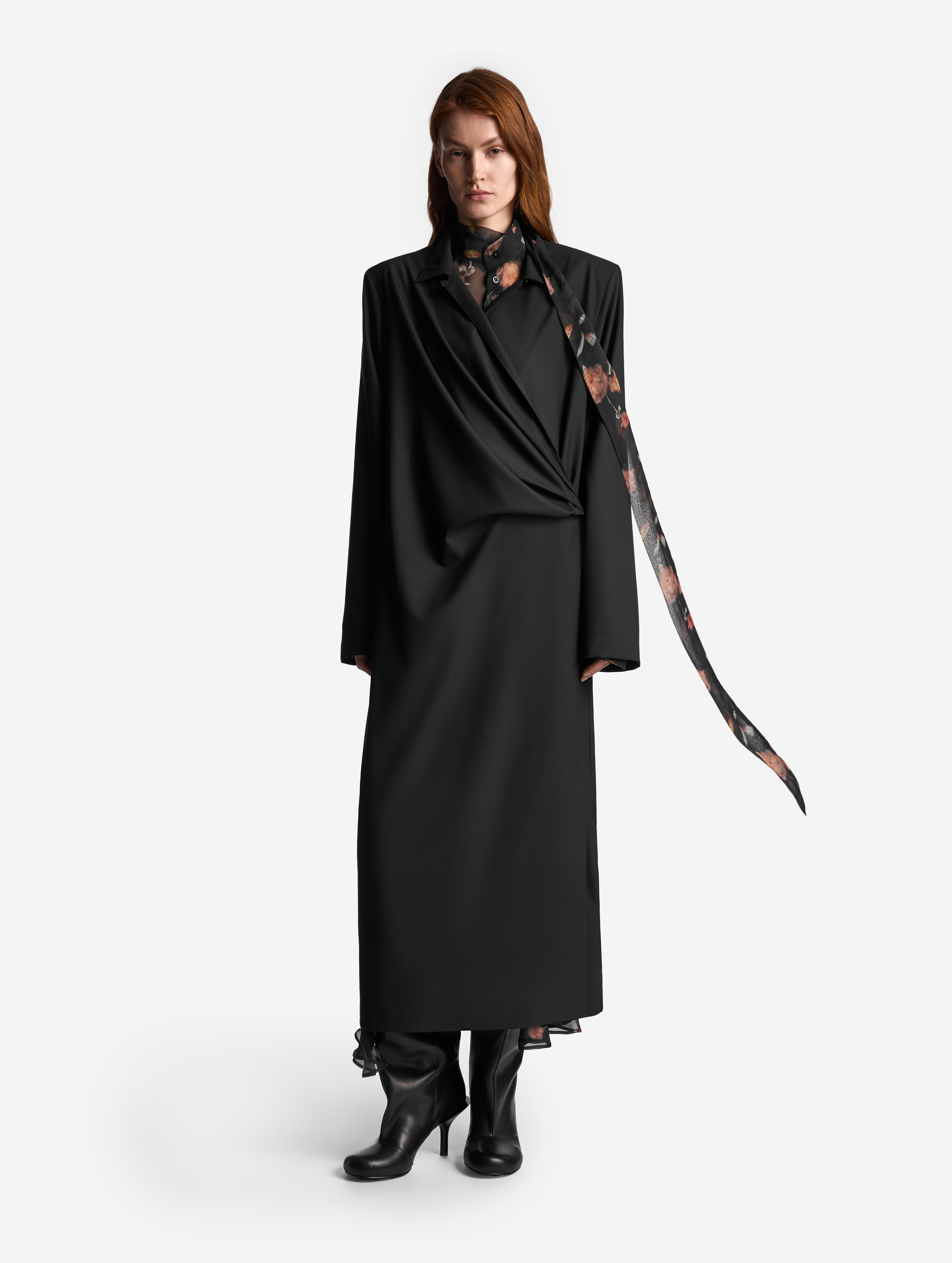 Свободное и струящееся, с воротником-стойкой, длинными широкими рукавами и асимметричной юбкой — это платье сядет на любую фигуру. Мы презентуем эту модель как трансформер: если завязать внутреннюю кулиску на талии или бедрах и скинуть верх платья, оно превратится в сложную юбку. Одна сторона воротника переходит в длинную ленту — ее можно оставить свободно развеваться или продеть сквозь незаметную прорезь, перекинув через плечо (на манер легкого шарфа). Изделие, как и манжеты, застегивается на пуговицы.