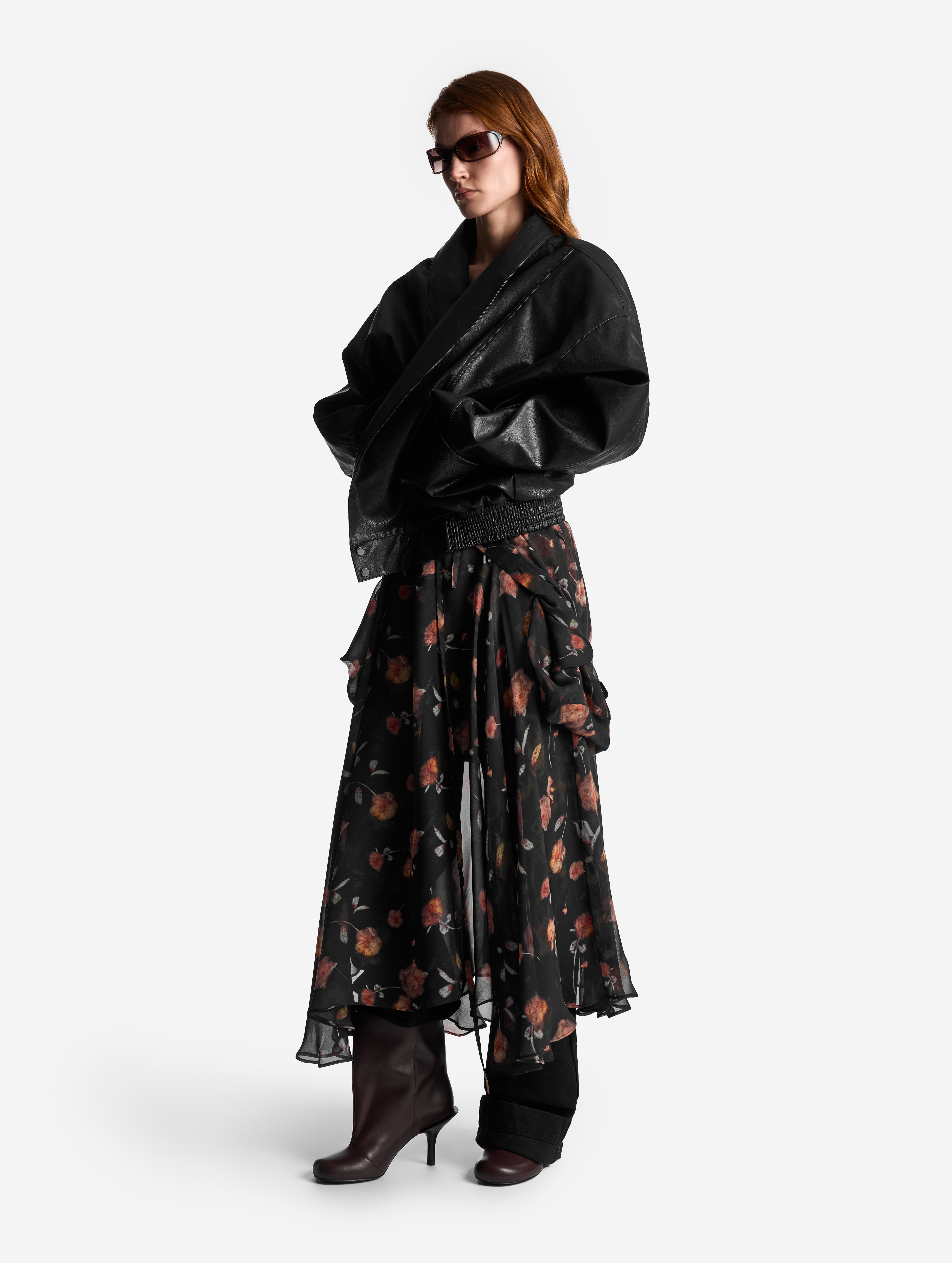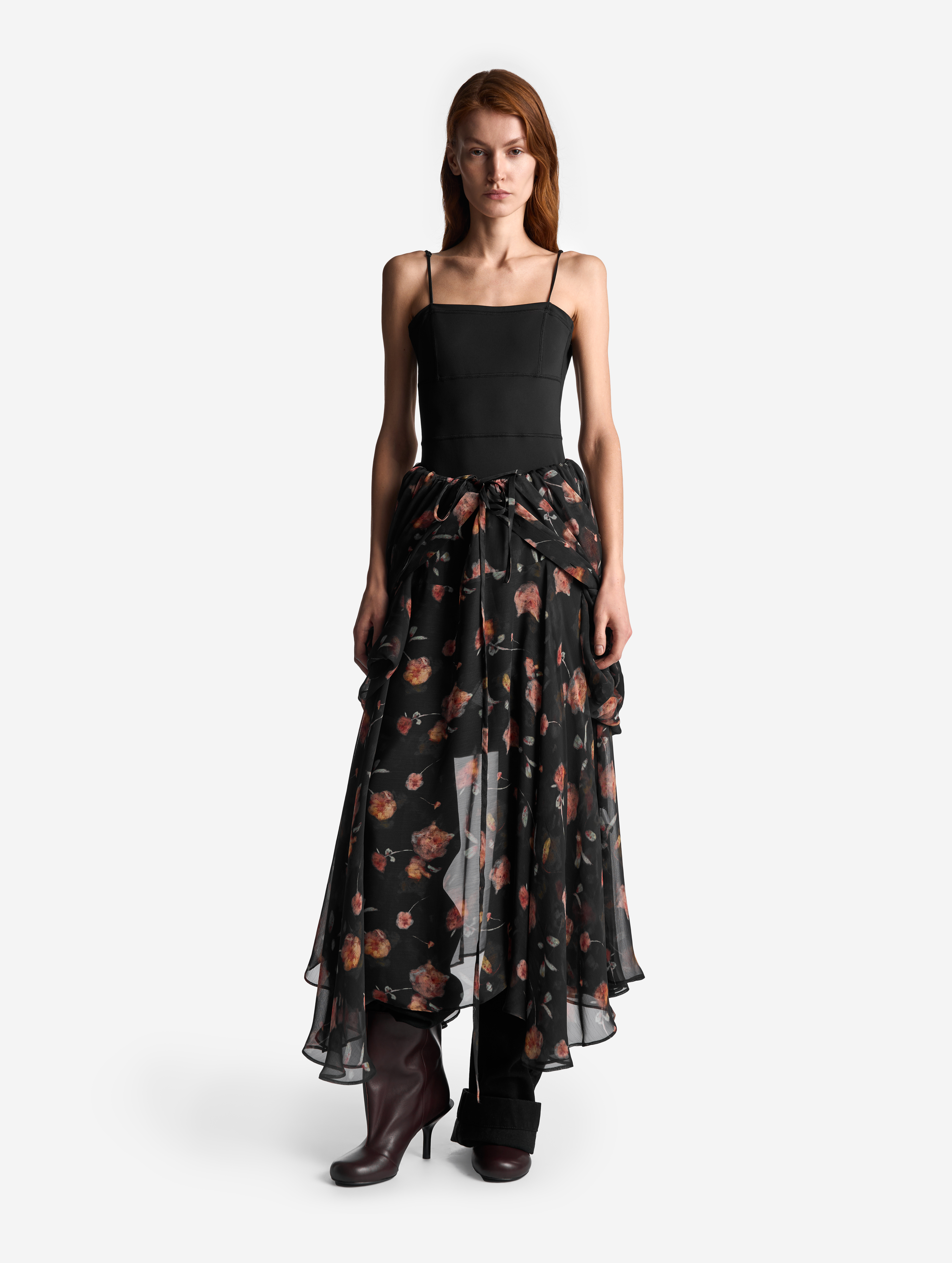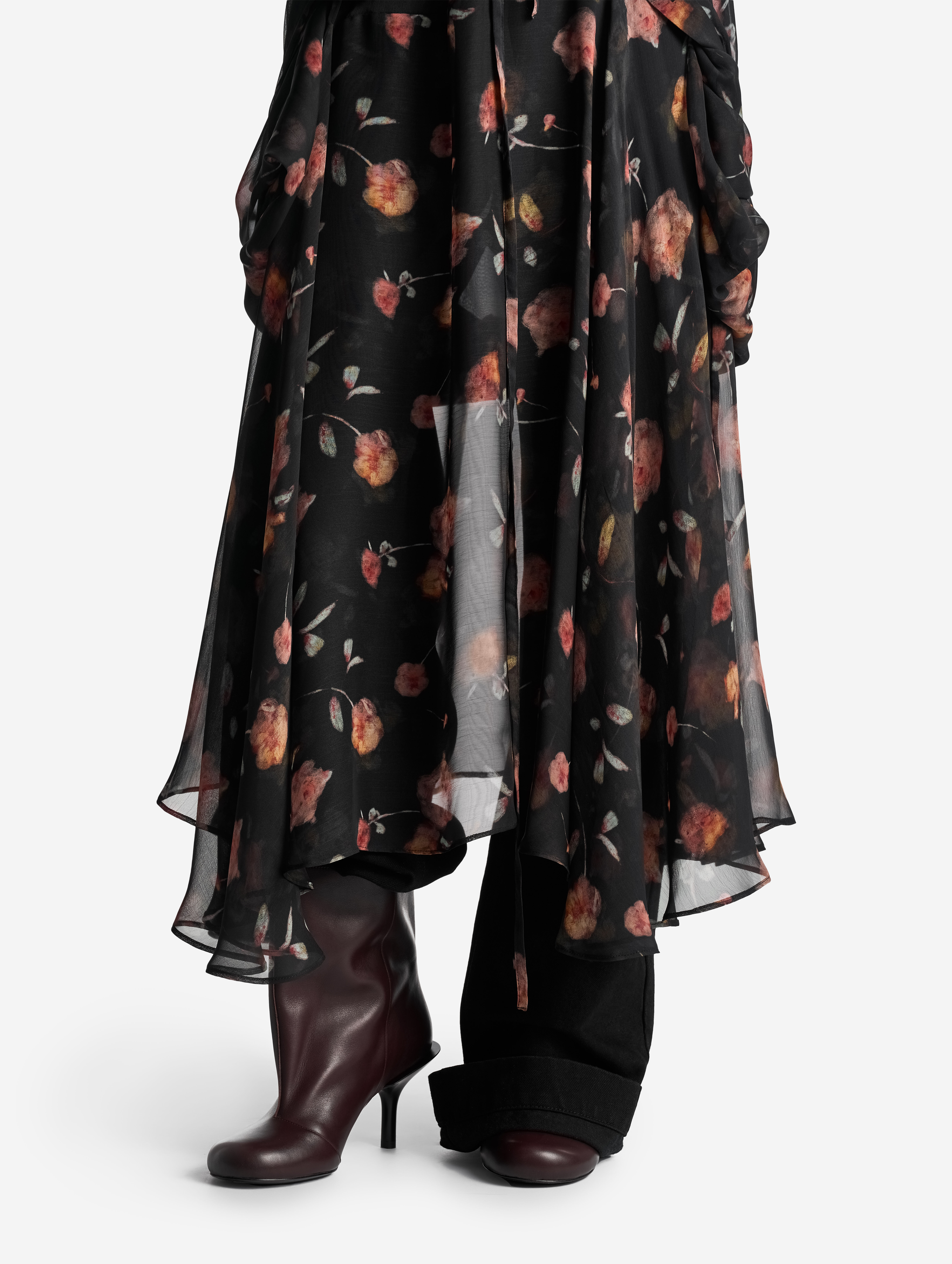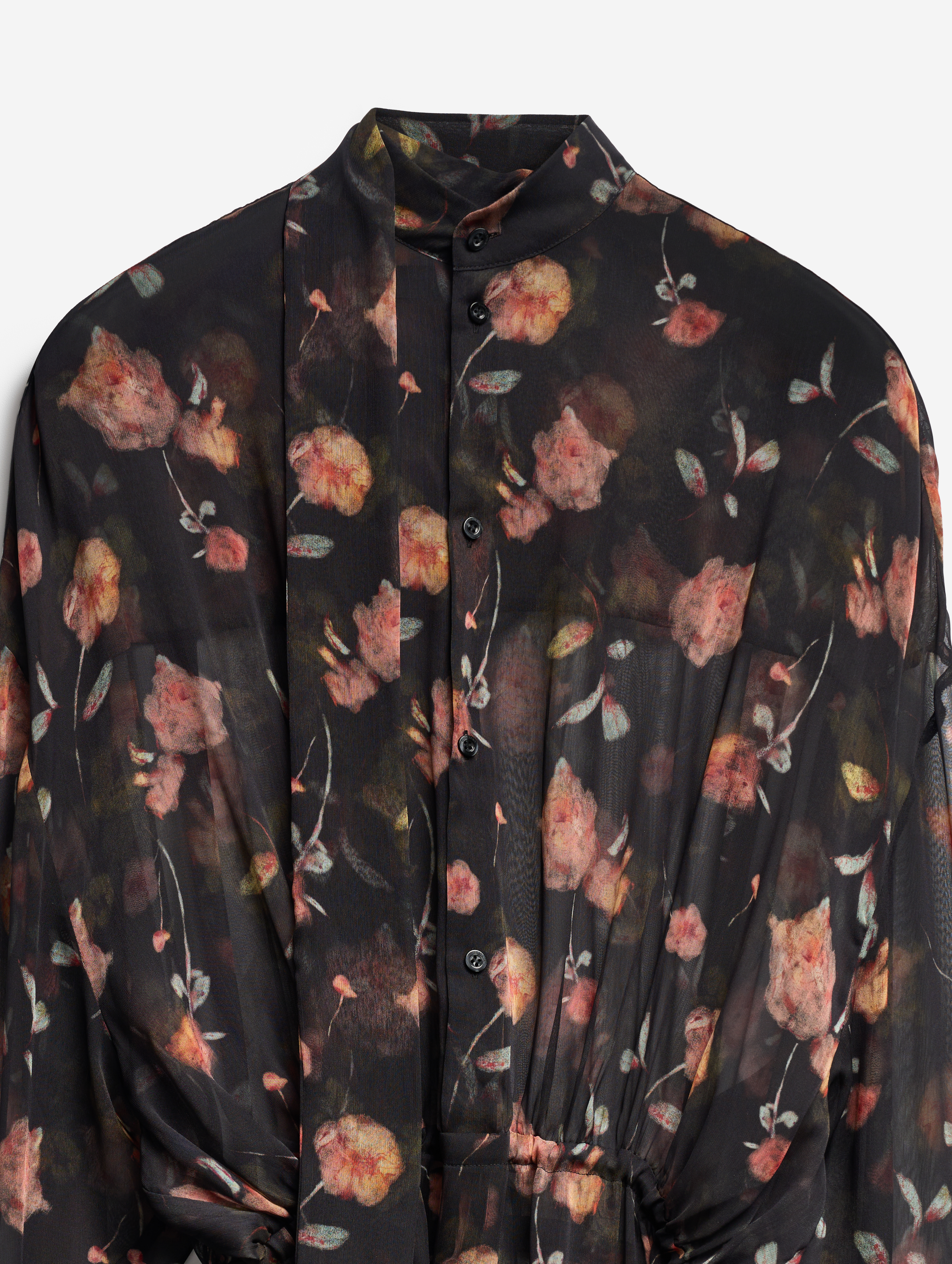 Свободное и струящееся, с воротником-стойкой, длинными широкими рукавами и асимметричной юбкой — это платье сядет на любую фигуру. Мы презентуем эту модель как трансформер: если завязать внутреннюю кулиску на талии или бедрах и скинуть верх платья, оно превратится в сложную юбку. Одна сторона воротника переходит в длинную ленту — ее можно оставить свободно развеваться или продеть сквозь незаметную прорезь, перекинув через плечо (на манер легкого шарфа). Изделие, как и манжеты, застегивается на пуговицы.