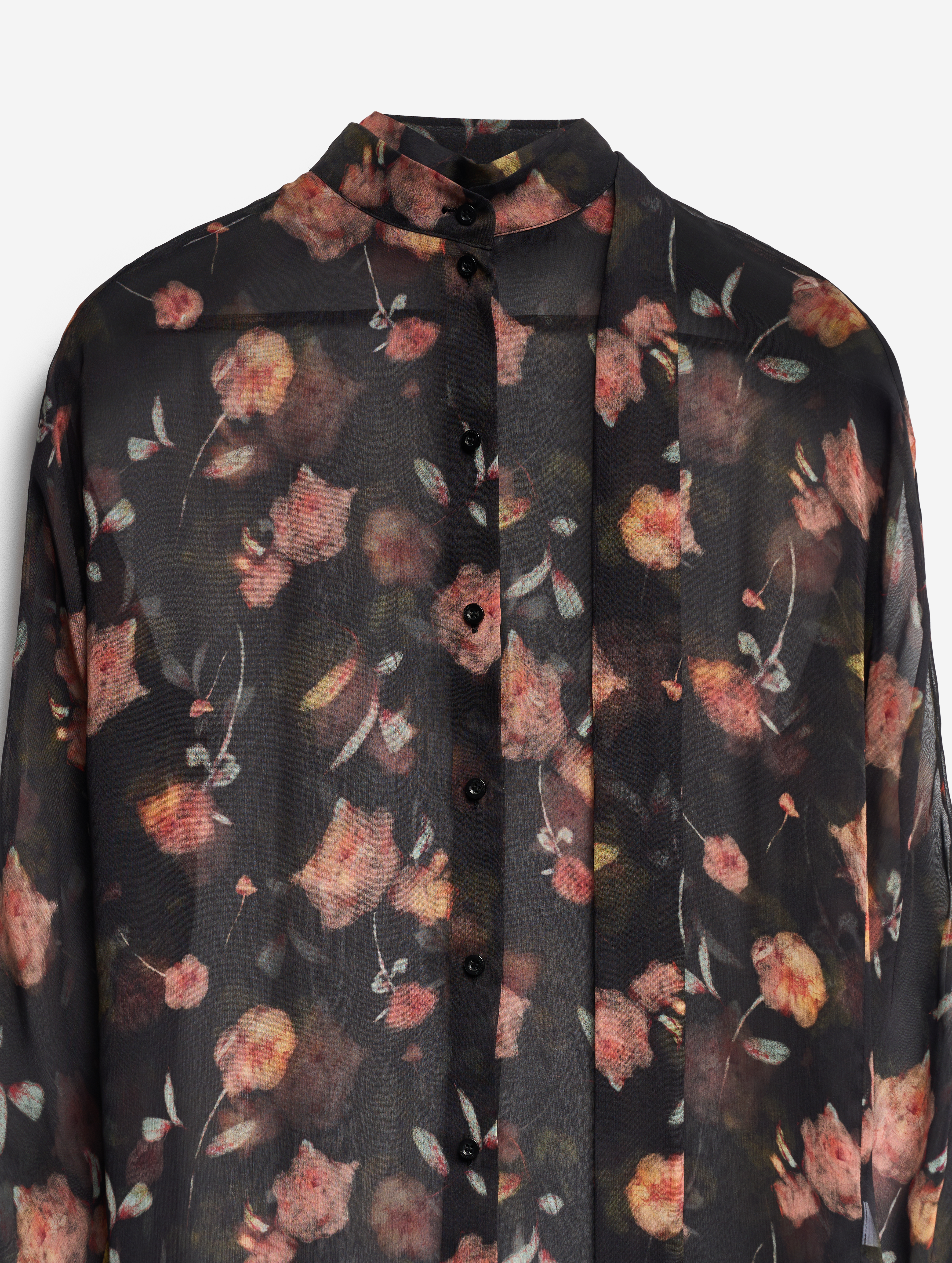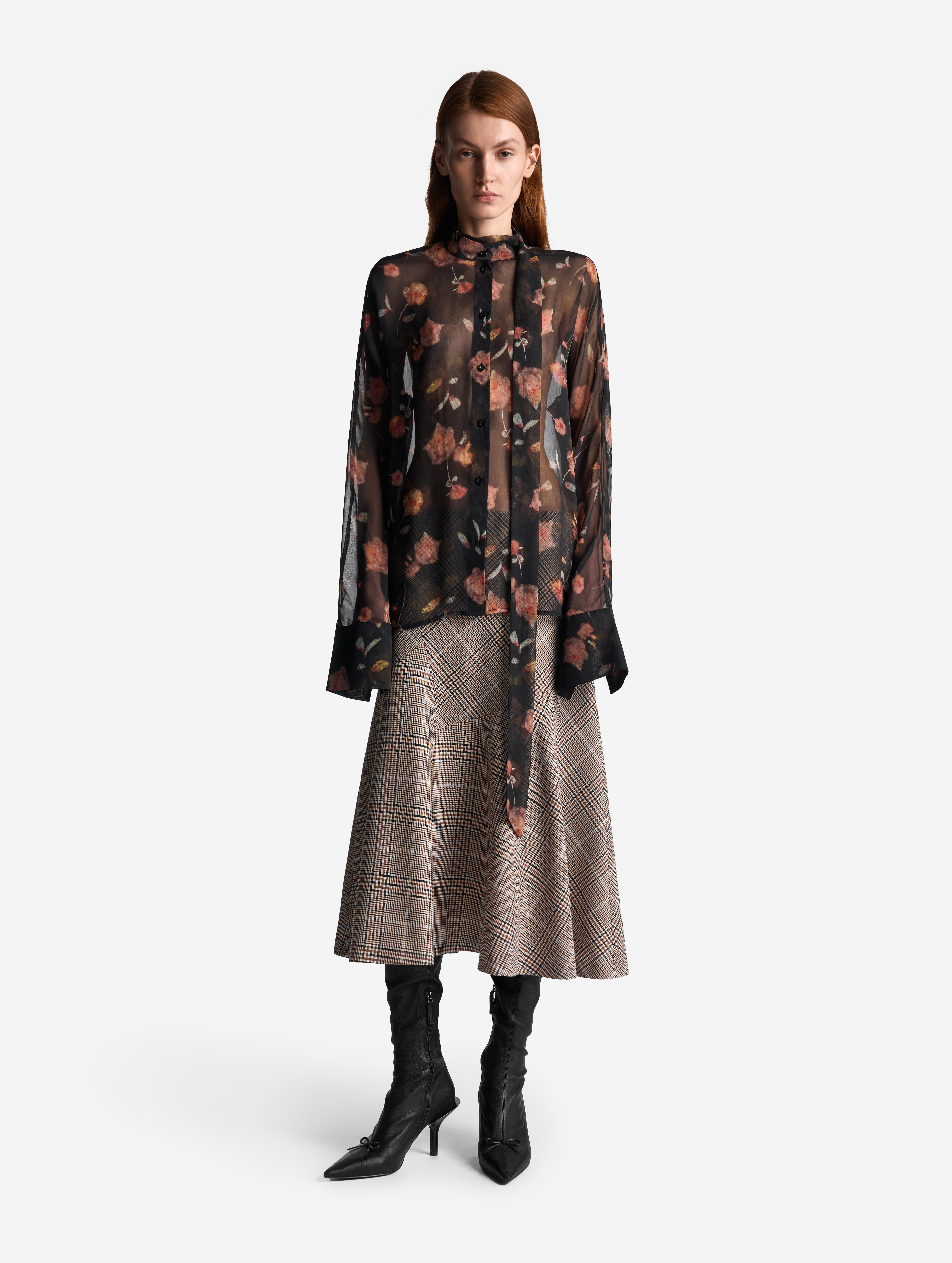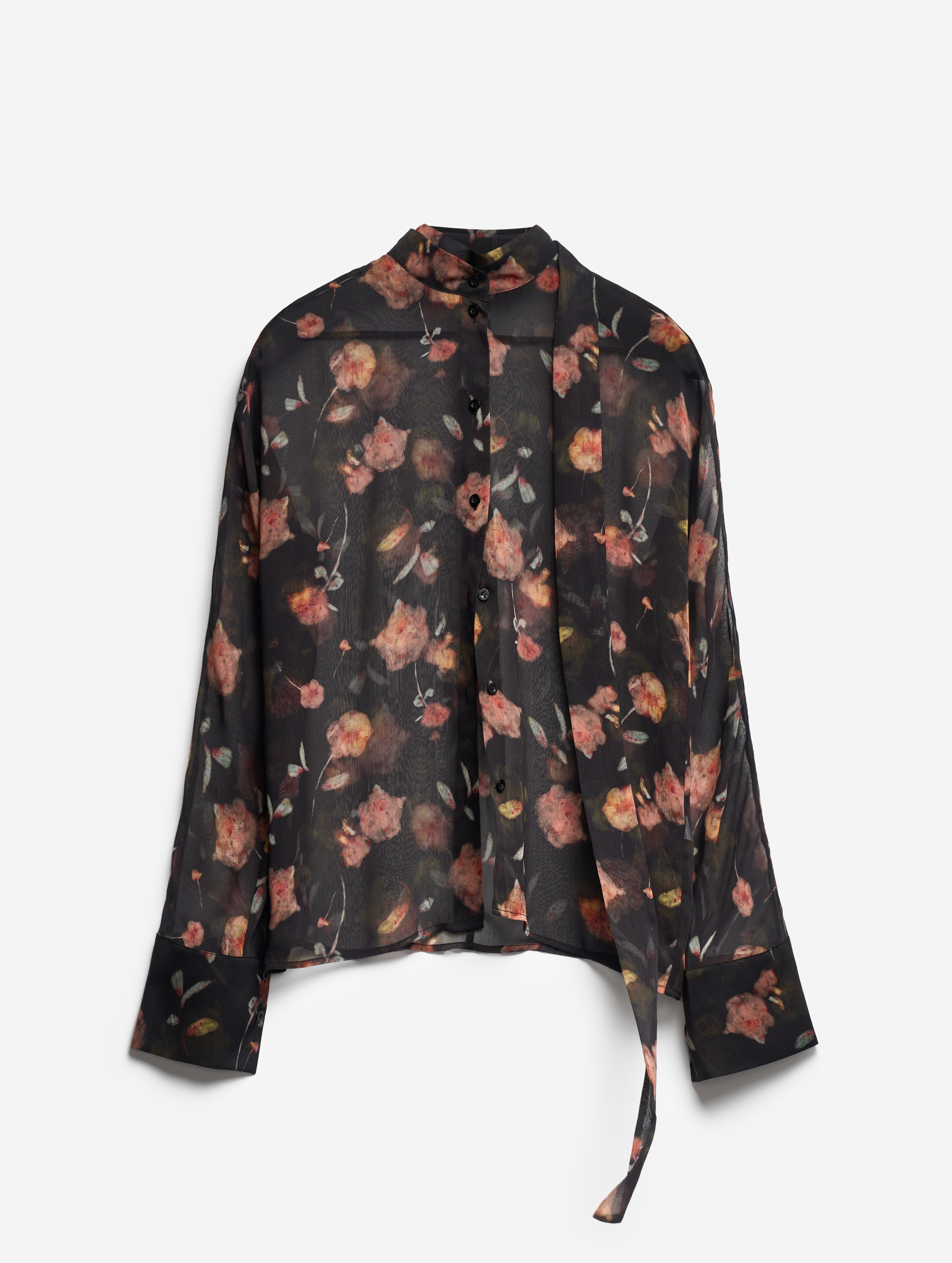 Эта летящая блузка выполнена из фактурного полупрозрачного шифона. У нее прямой силуэт и свободная посадка. Одна сторона воротника переходит в длинную ленту — ее можно оставить свободно развеваться или продеть сквозь незаметную прорезь, перекинув через плечо (на манер легкого шарфа). Изделие, как и экстра-длинными манжеты, застегивается на пуговицы.