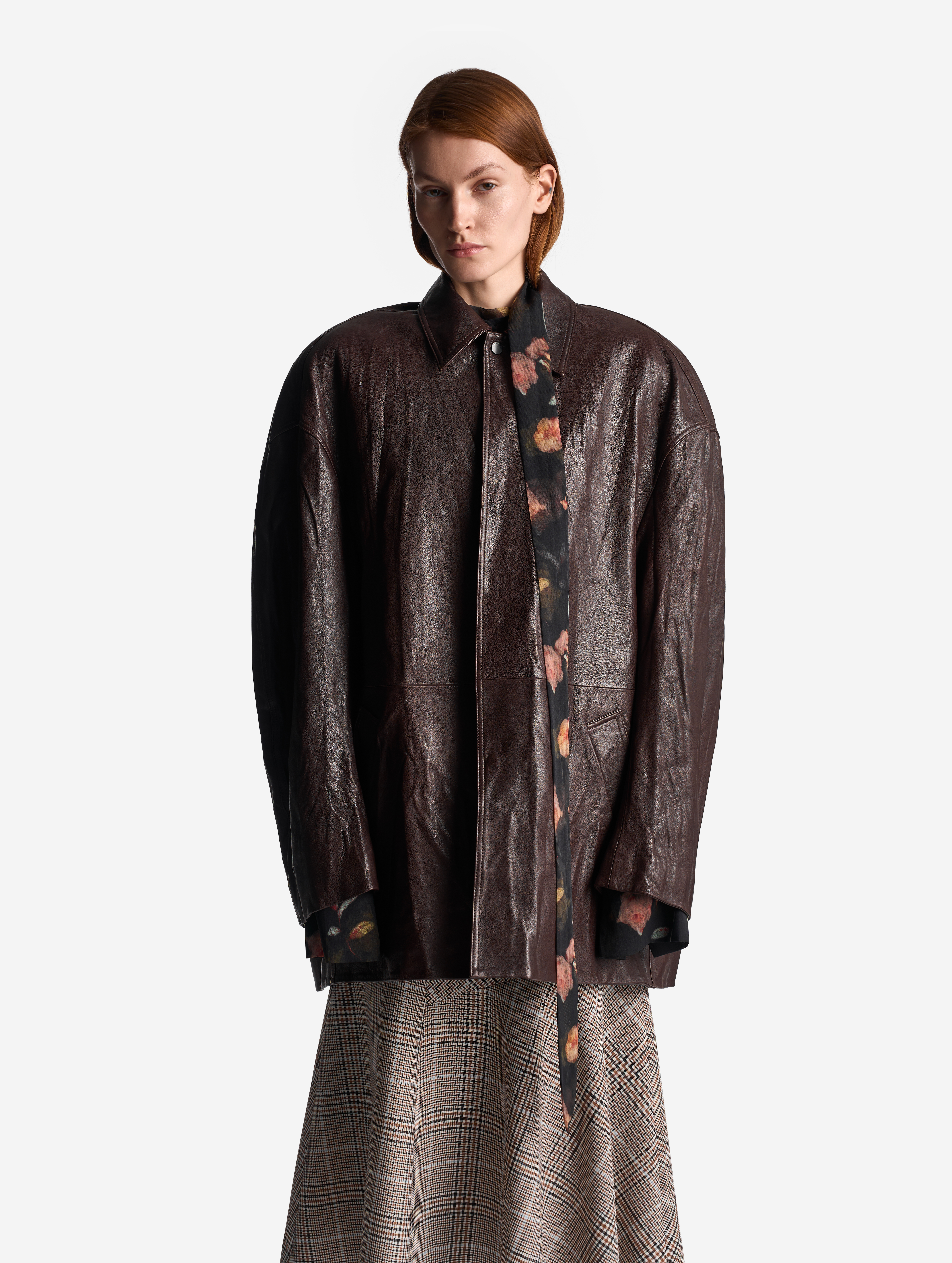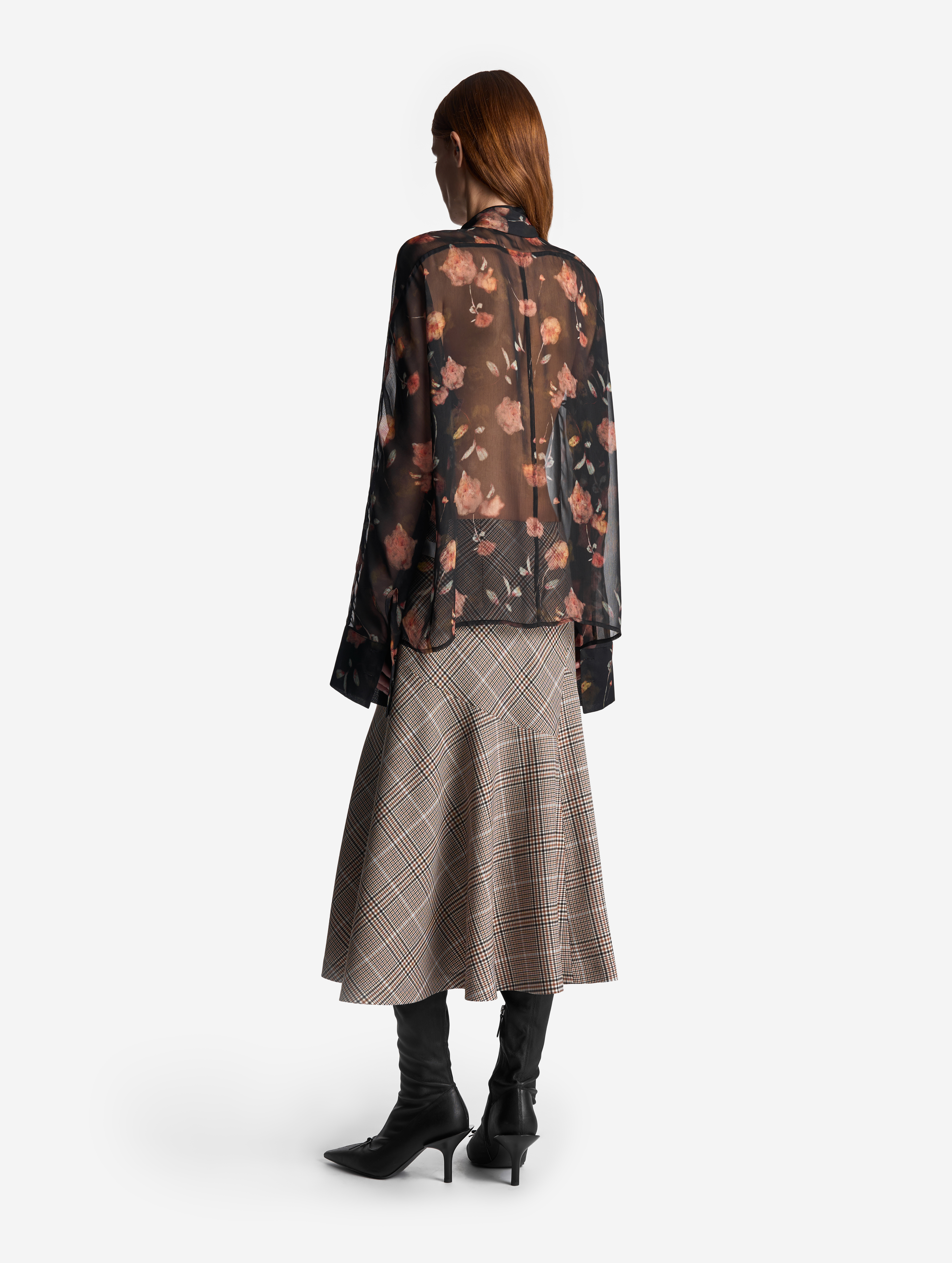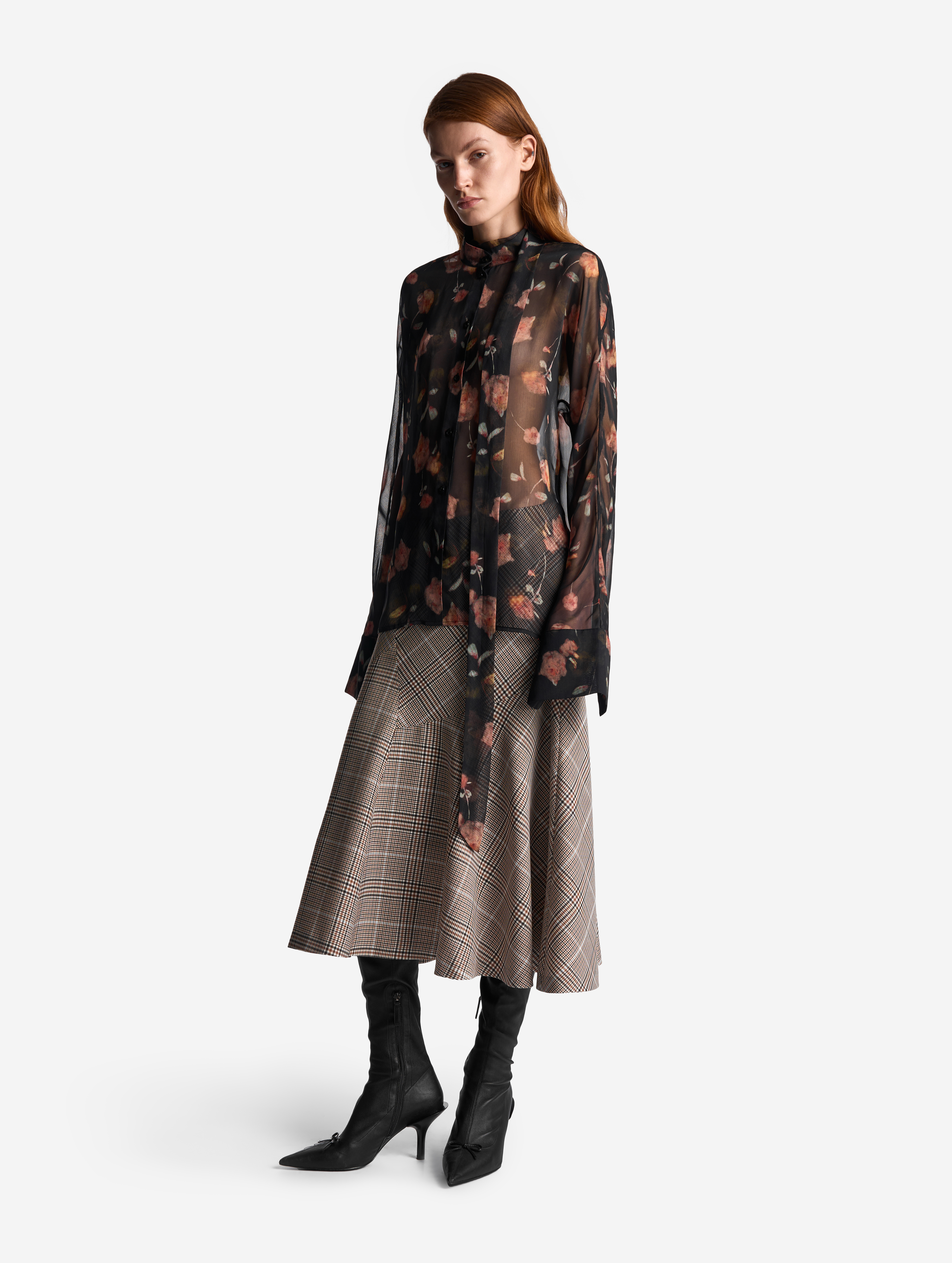 Эта летящая блузка выполнена из фактурного полупрозрачного шифона. У нее прямой силуэт и свободная посадка. Одна сторона воротника переходит в длинную ленту — ее можно оставить свободно развеваться или продеть сквозь незаметную прорезь, перекинув через плечо (на манер легкого шарфа). Изделие, как и экстра-длинными манжеты, застегивается на пуговицы.