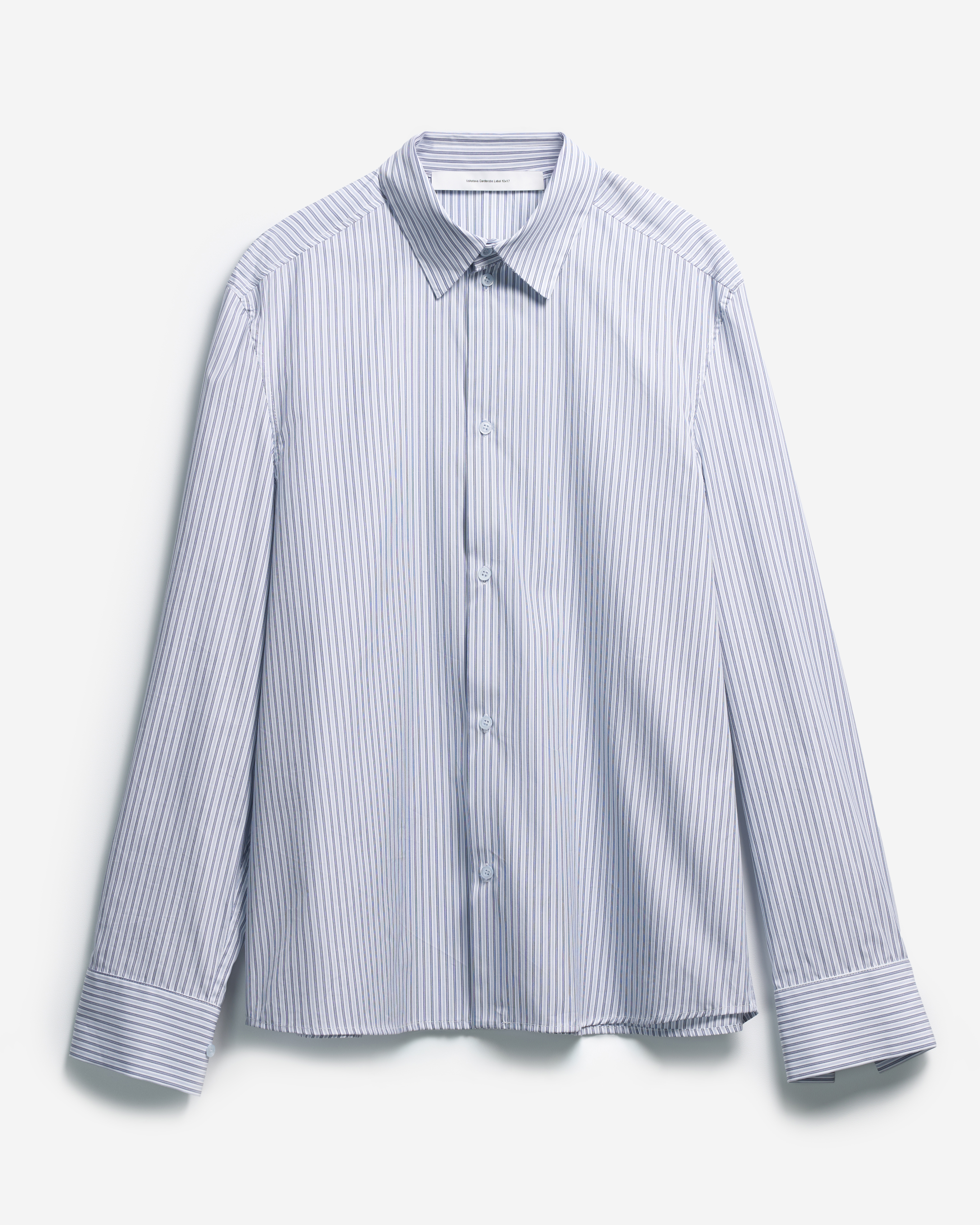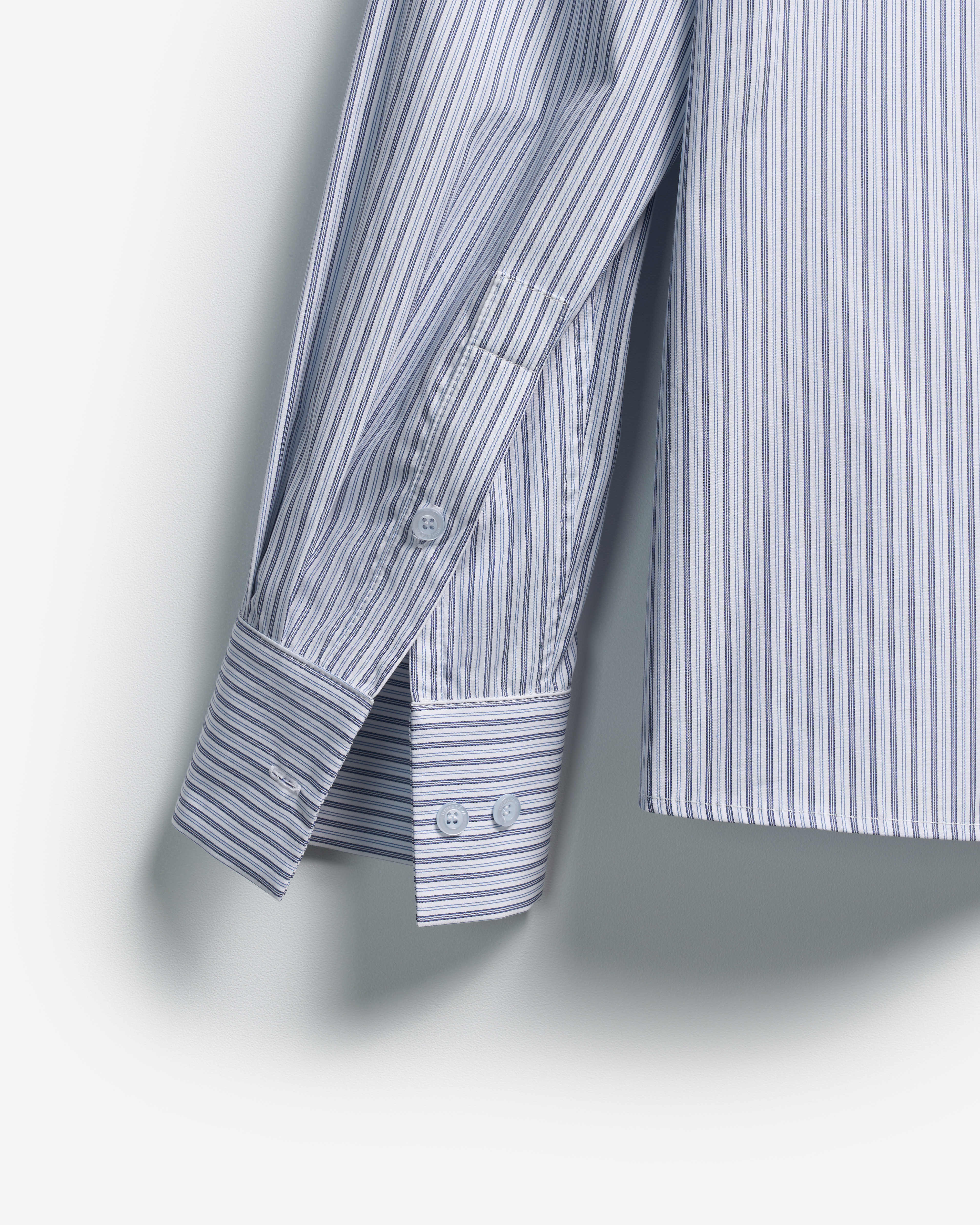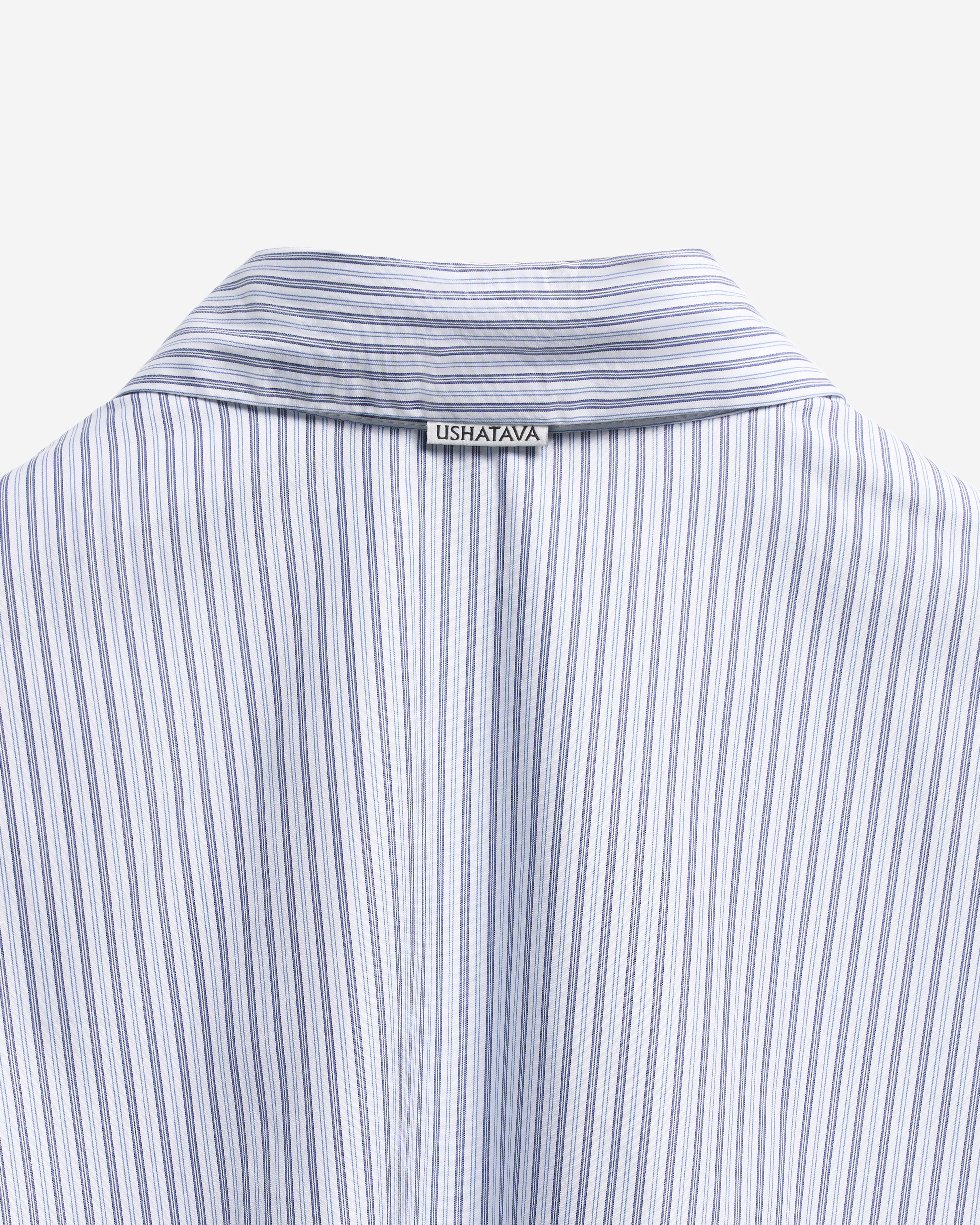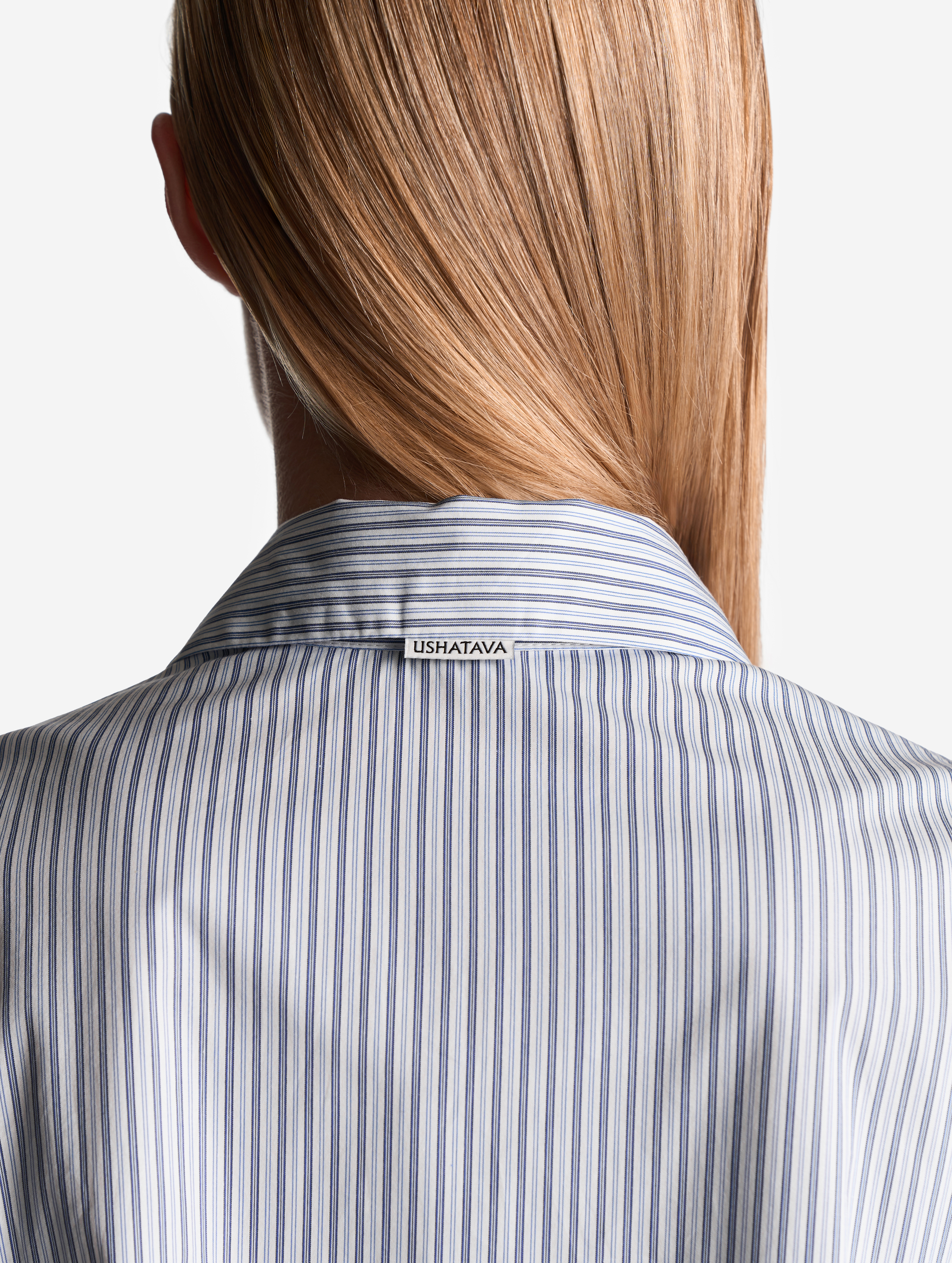 У этой рубашки прямой удлиненный силуэт и широкий рукав со спущенной линией плеча. Умеренная посадка позволяет носить изделие не только женщинам, но и мужчинам. Отдельного внимания заслуживают широкие манжеты. В расстегнутом состоянии они задают расслабленный тон, в застегнутом — дают ощущение сдержанности. Изделие и манжеты застегиваются на перламутровые брендированные пуговицы.