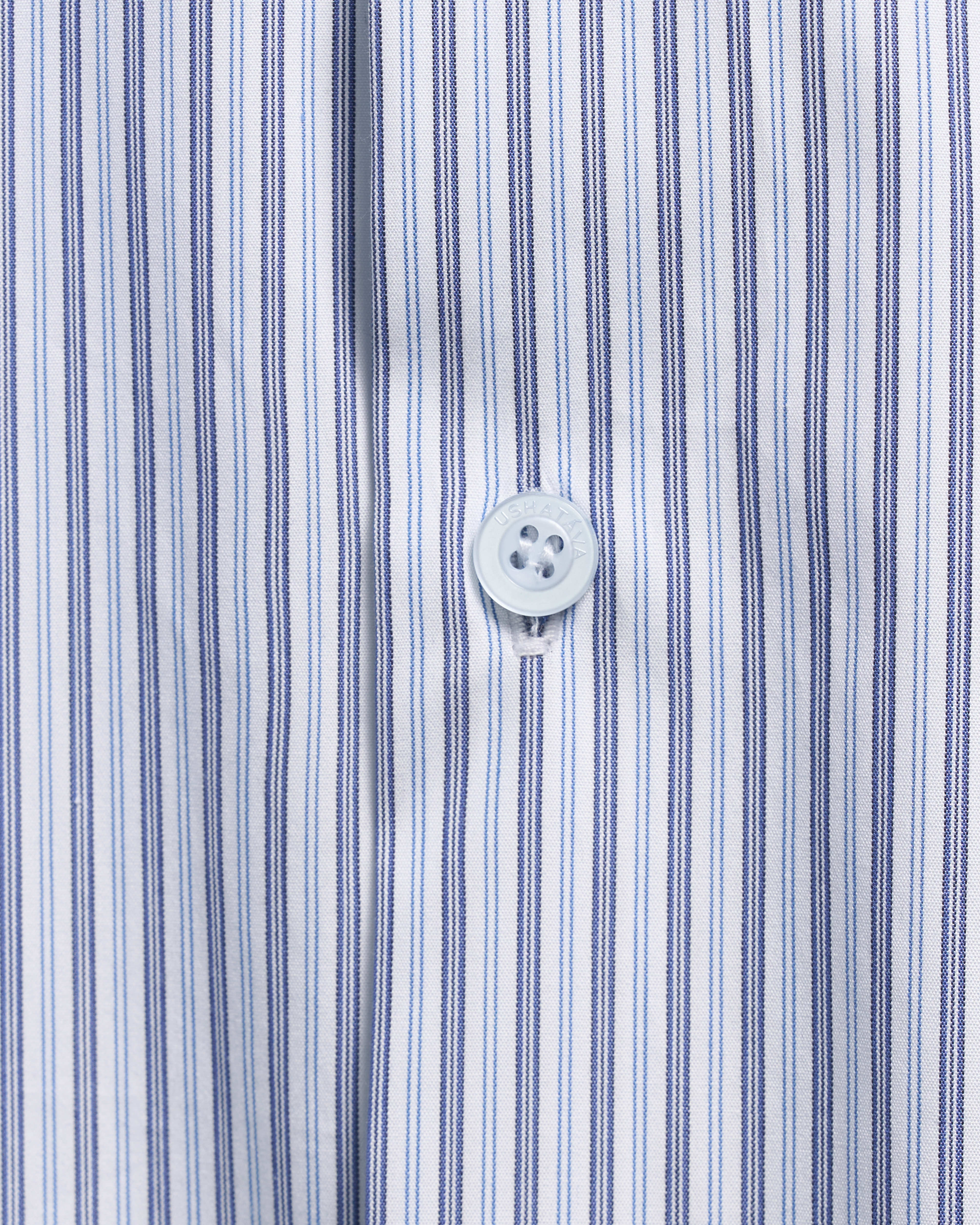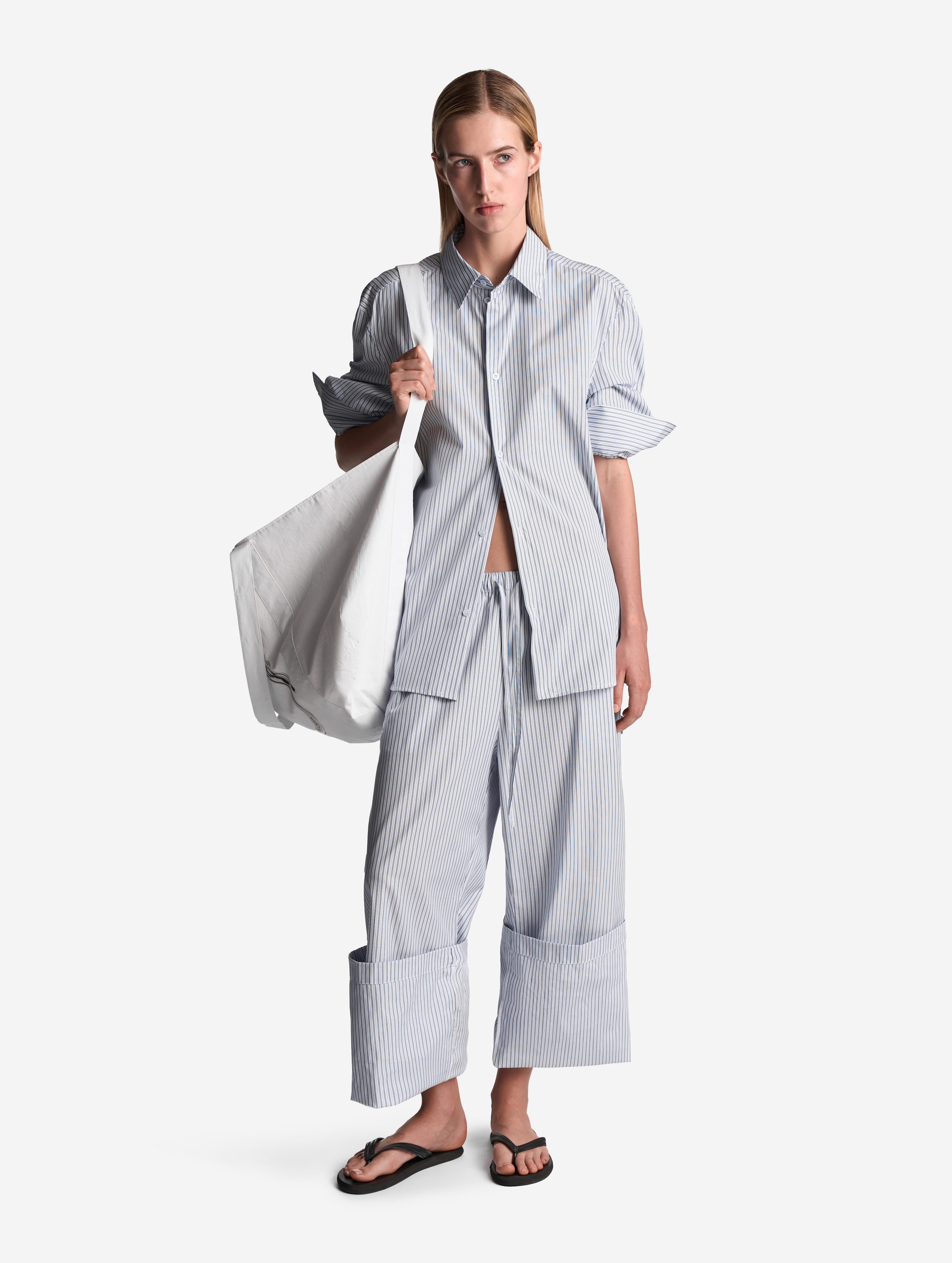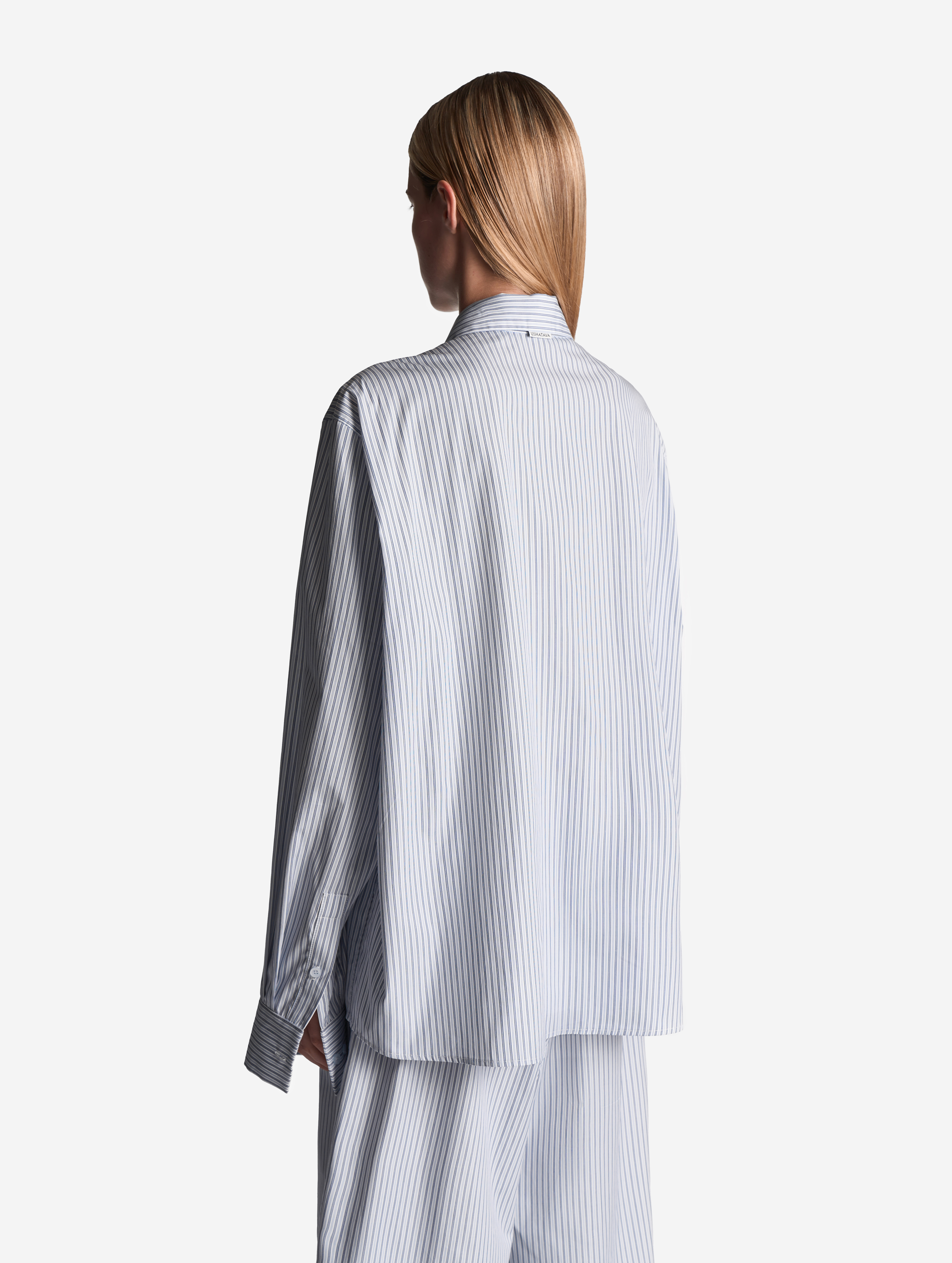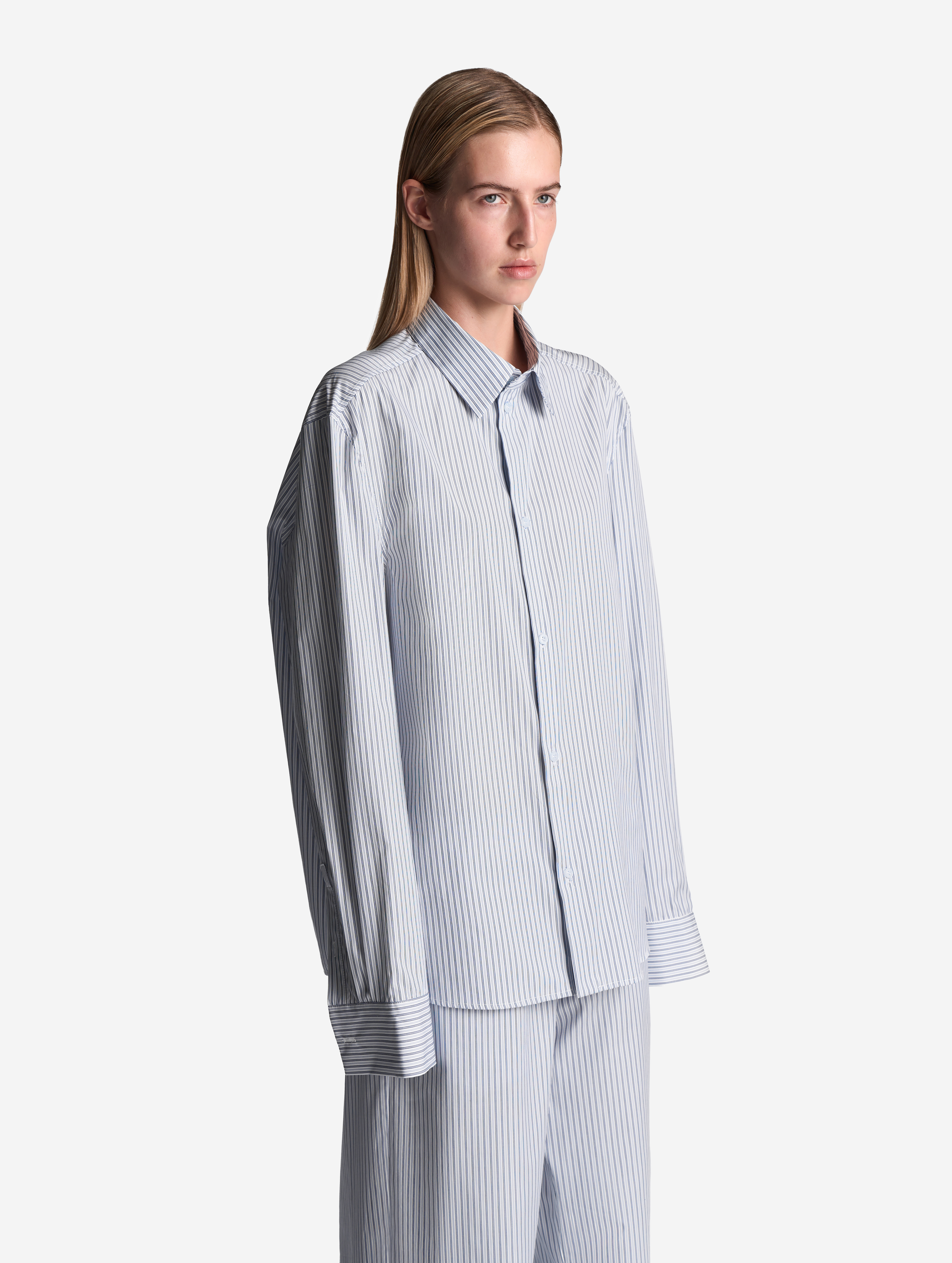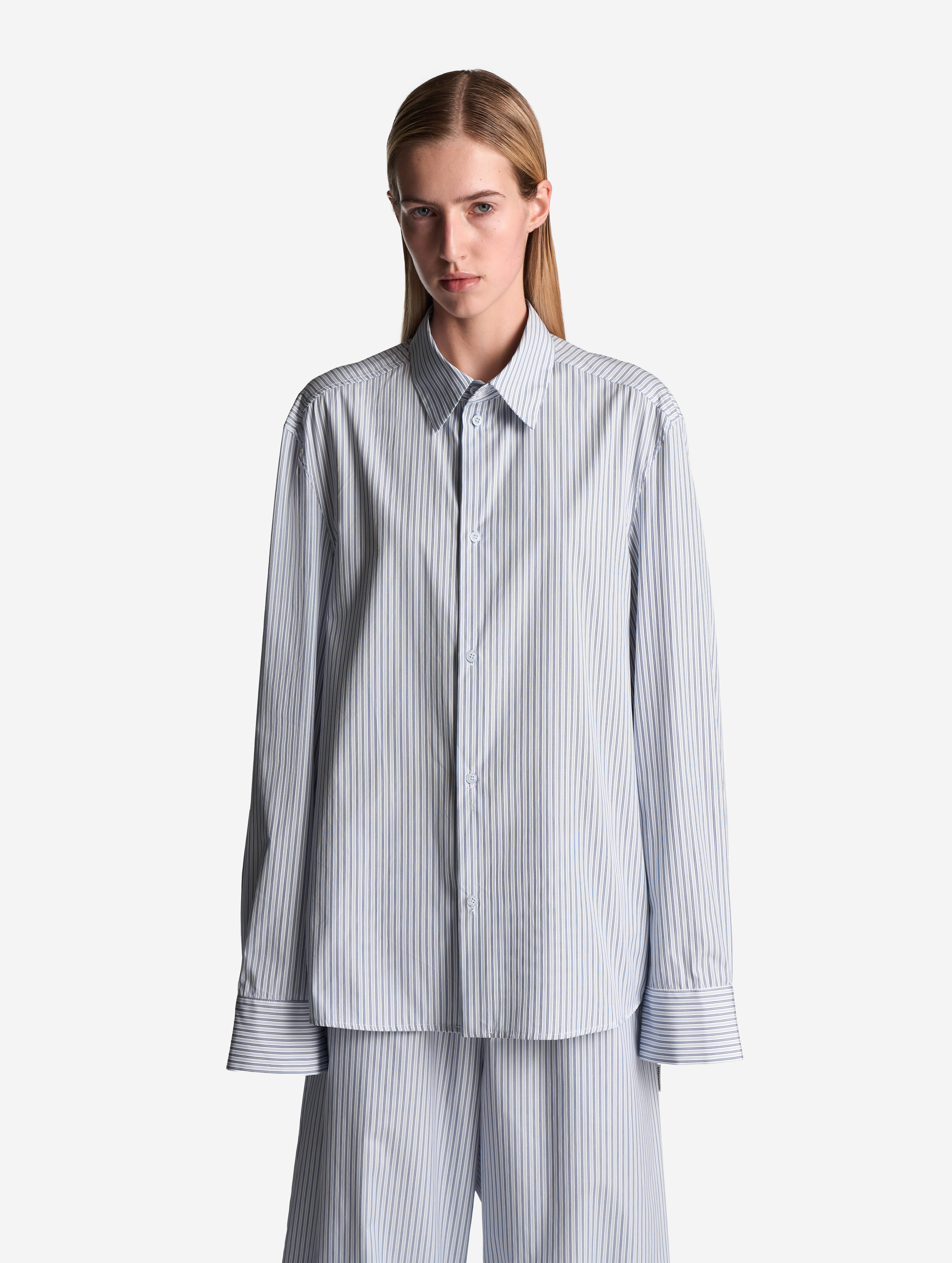 У этой рубашки прямой удлиненный силуэт и широкий рукав со спущенной линией плеча. Умеренная посадка позволяет носить изделие не только женщинам, но и мужчинам. Отдельного внимания заслуживают широкие манжеты. В расстегнутом состоянии они задают расслабленный тон, в застегнутом — дают ощущение сдержанности. Изделие и манжеты застегиваются на перламутровые брендированные пуговицы.
