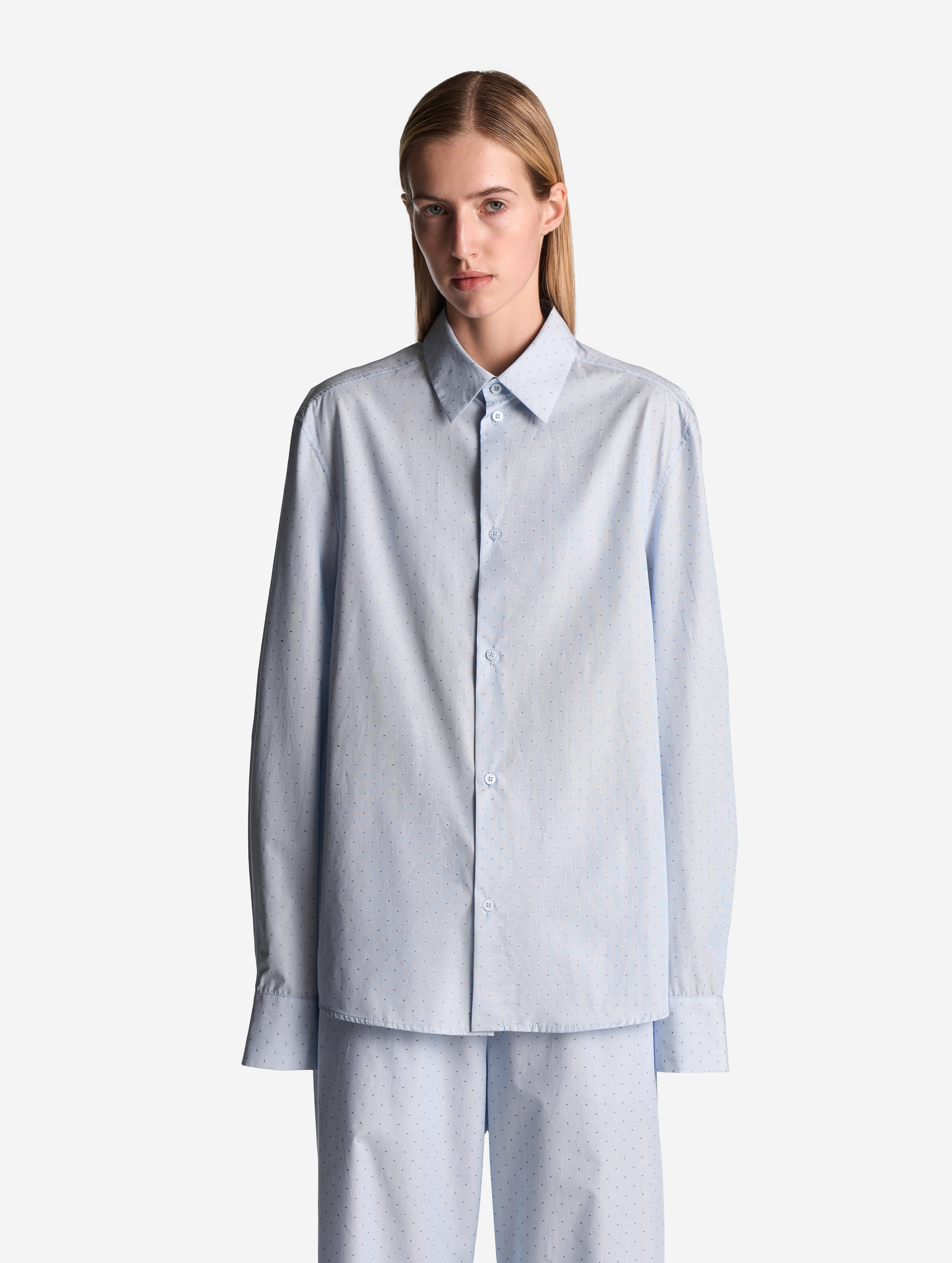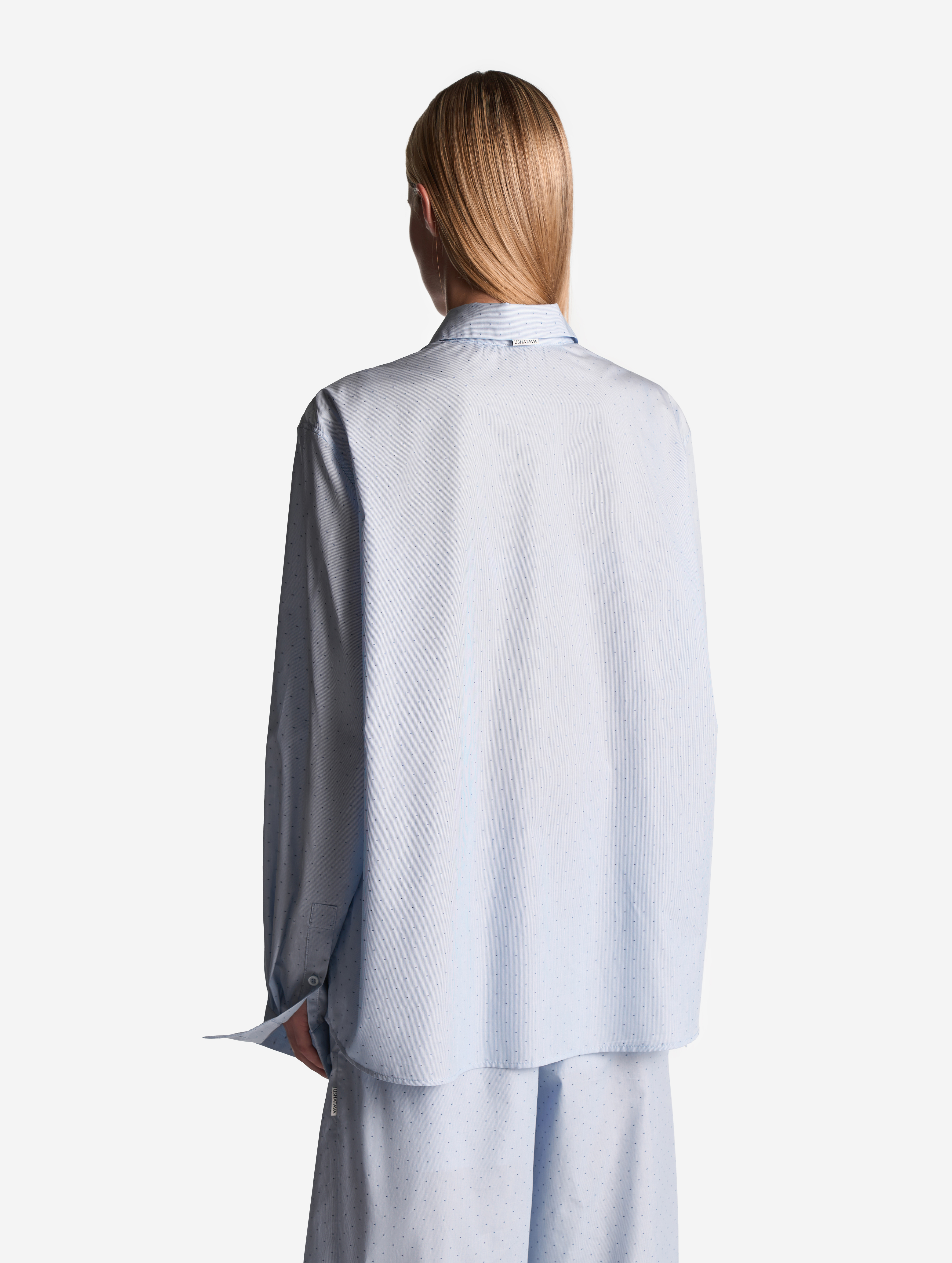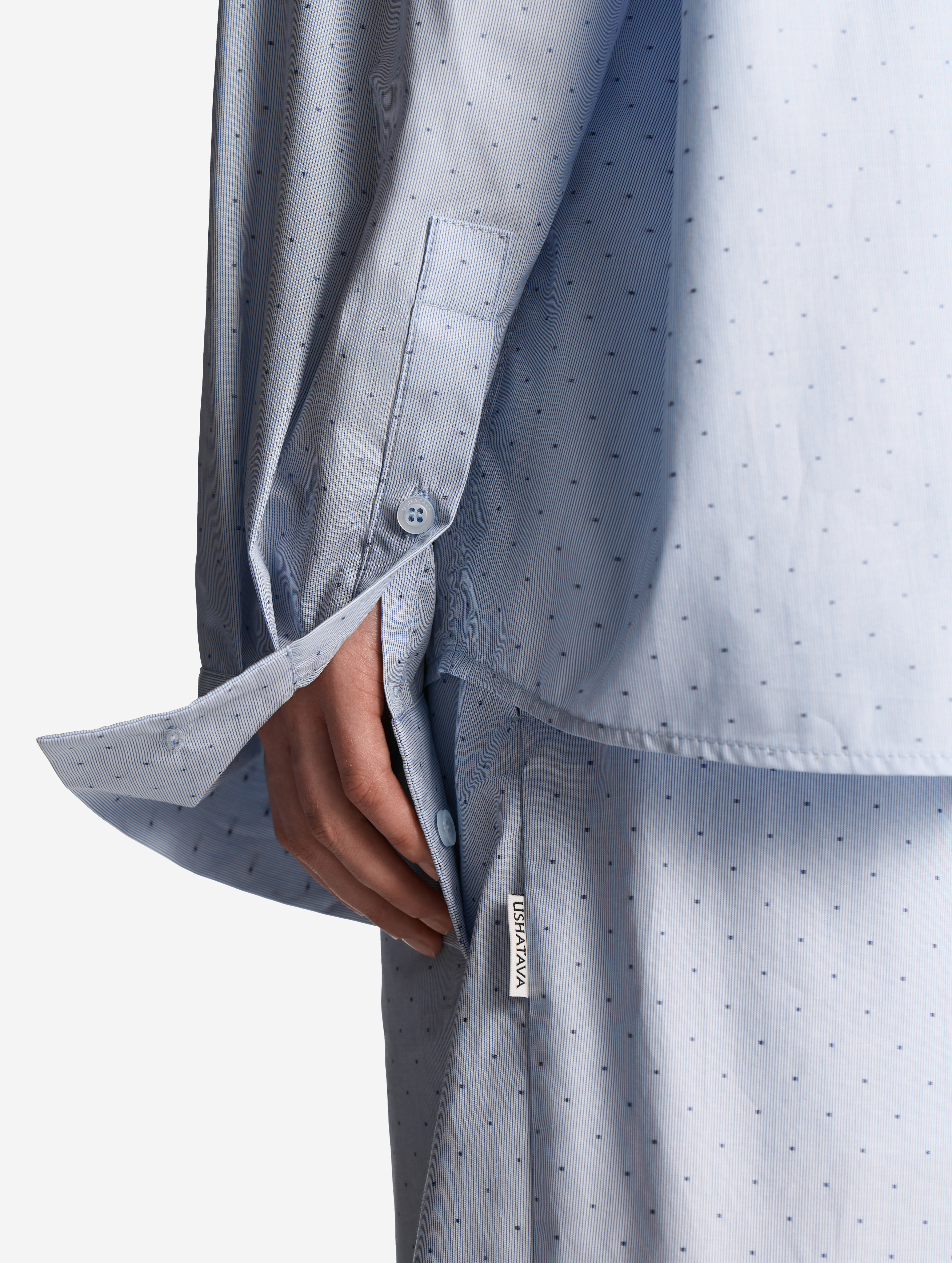 У этой рубашки прямой удлиненный силуэт и широкий рукав со спущенной линией плеча. Умеренная посадка позволяет носить изделие не только женщинам, но и мужчинам. Отдельного внимания заслуживают широкие манжеты. В расстегнутом состоянии они задают расслабленный тон, в застегнутом — дают ощущение сдержанности. Изделие и манжеты застегиваются на перламутровые брендированные пуговицы.